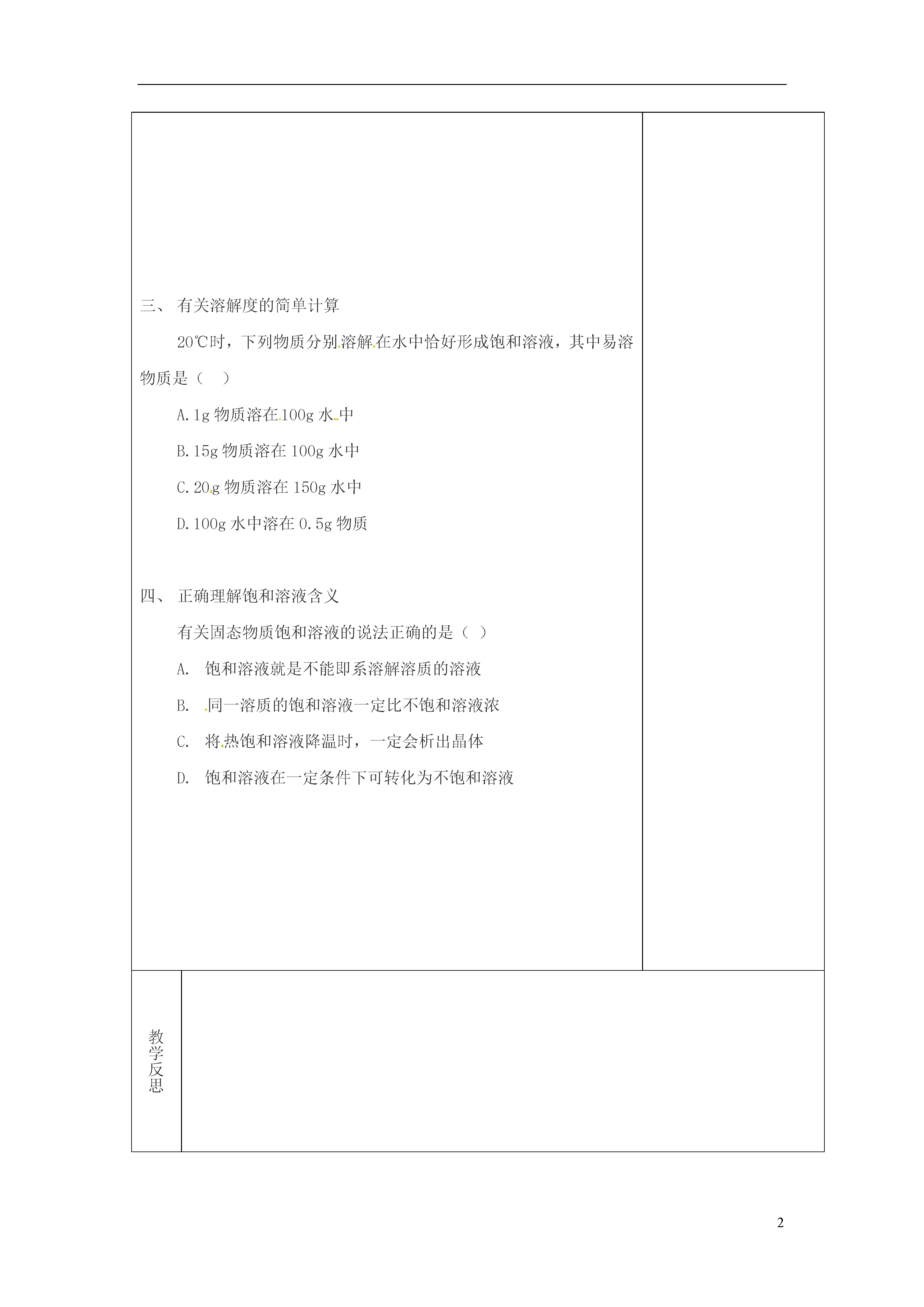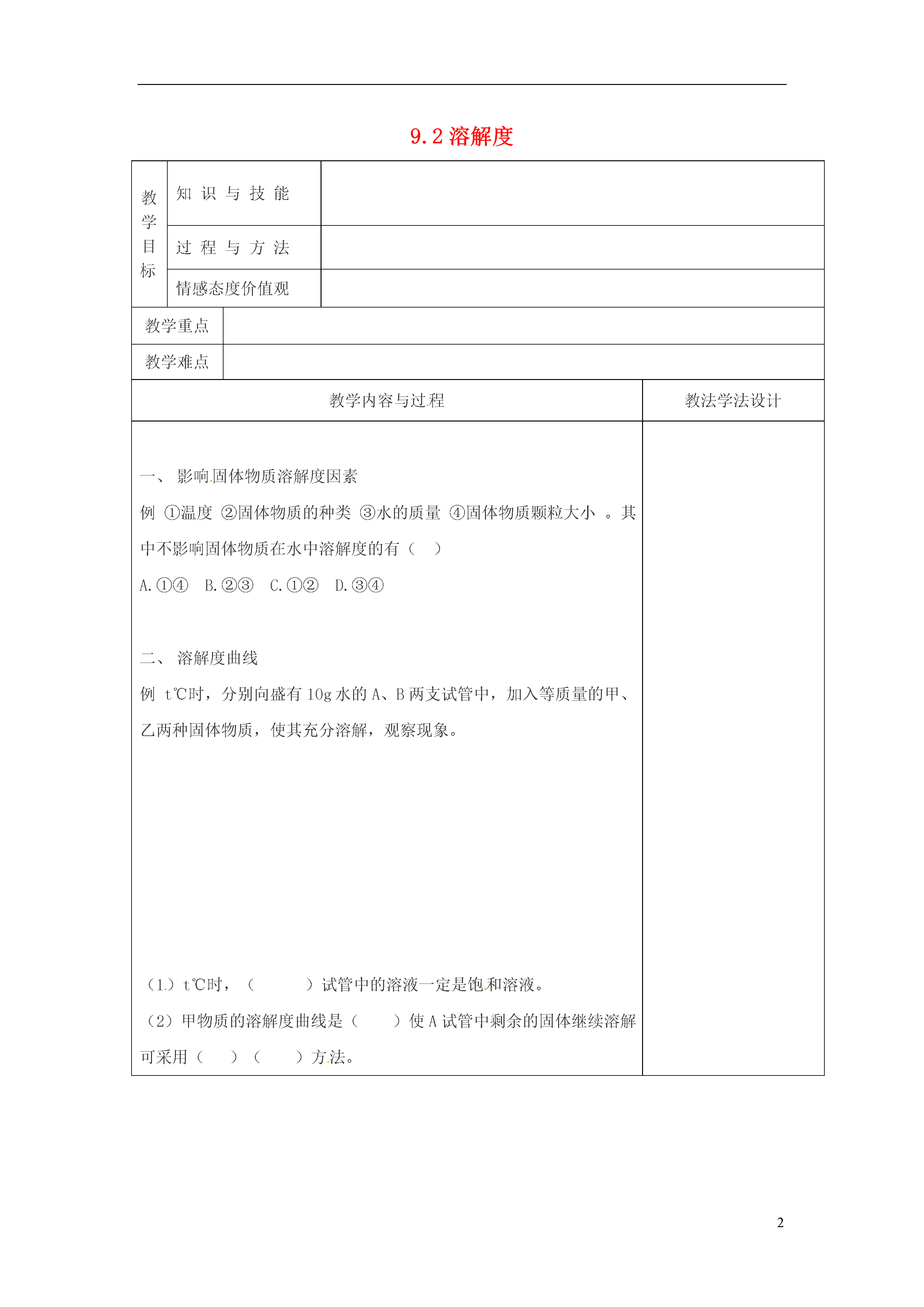 29.2溶解度教学目标知识与技能过程与方法情感态度价值观教学重点教学难点教学内容与过程教法学法设计影响固体物质溶解度因素例①温度②固体物质的种类③水的质量④固体物质颗粒大小。其中不影响固体物质在水中溶解度的有()A.①④B.②③C.①②D.③④溶解度曲线例t℃时,分别向盛有10g水的A、B两支试管中,加入等质量的甲、乙两种固体物质,使其充分溶解,观察现象。(1)t℃时,()试管中的溶液一定是饱和溶液。(2)甲物质的溶解度曲线是()使A试管中剩余的固体继续溶解可采用()()方法。有关溶解度的简单计算20℃时,下列物质分别溶解在水中恰好形成饱和溶液,其中易溶物质是()A.1g物质溶在100g水中B.15g物质溶在100g水中C.20g物质溶在150g水中D.100g水中溶在0.5g物质正确理解饱和溶液含义有关固态物质饱和溶液的说法正确的是()饱和溶液就是不能即系溶解溶质的溶液同一溶质的饱和溶液一定比不饱和溶液浓将热饱和溶液降温时,一定会析出晶体饱和溶液在一定条件下可转化为不饱和溶液教学反思