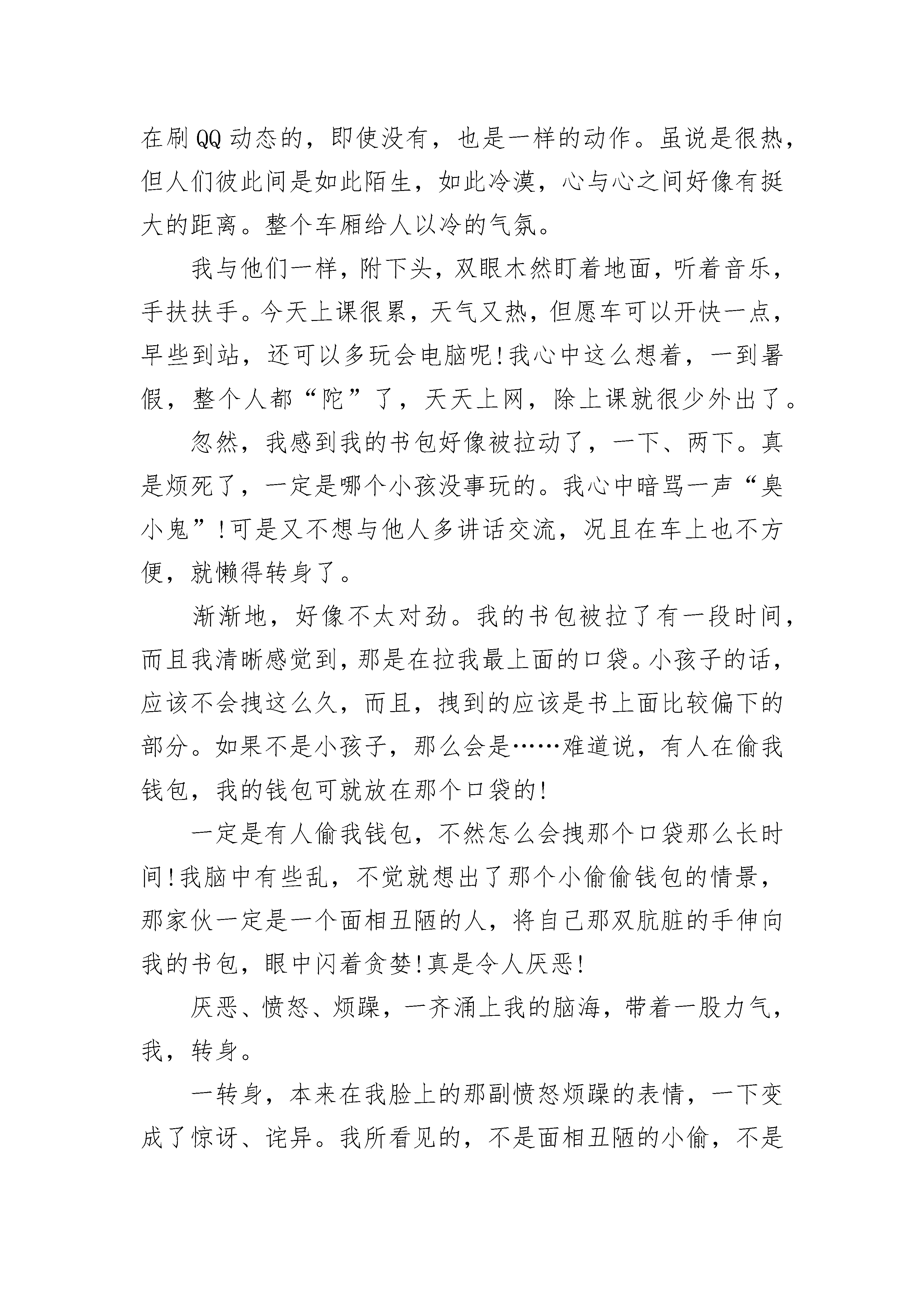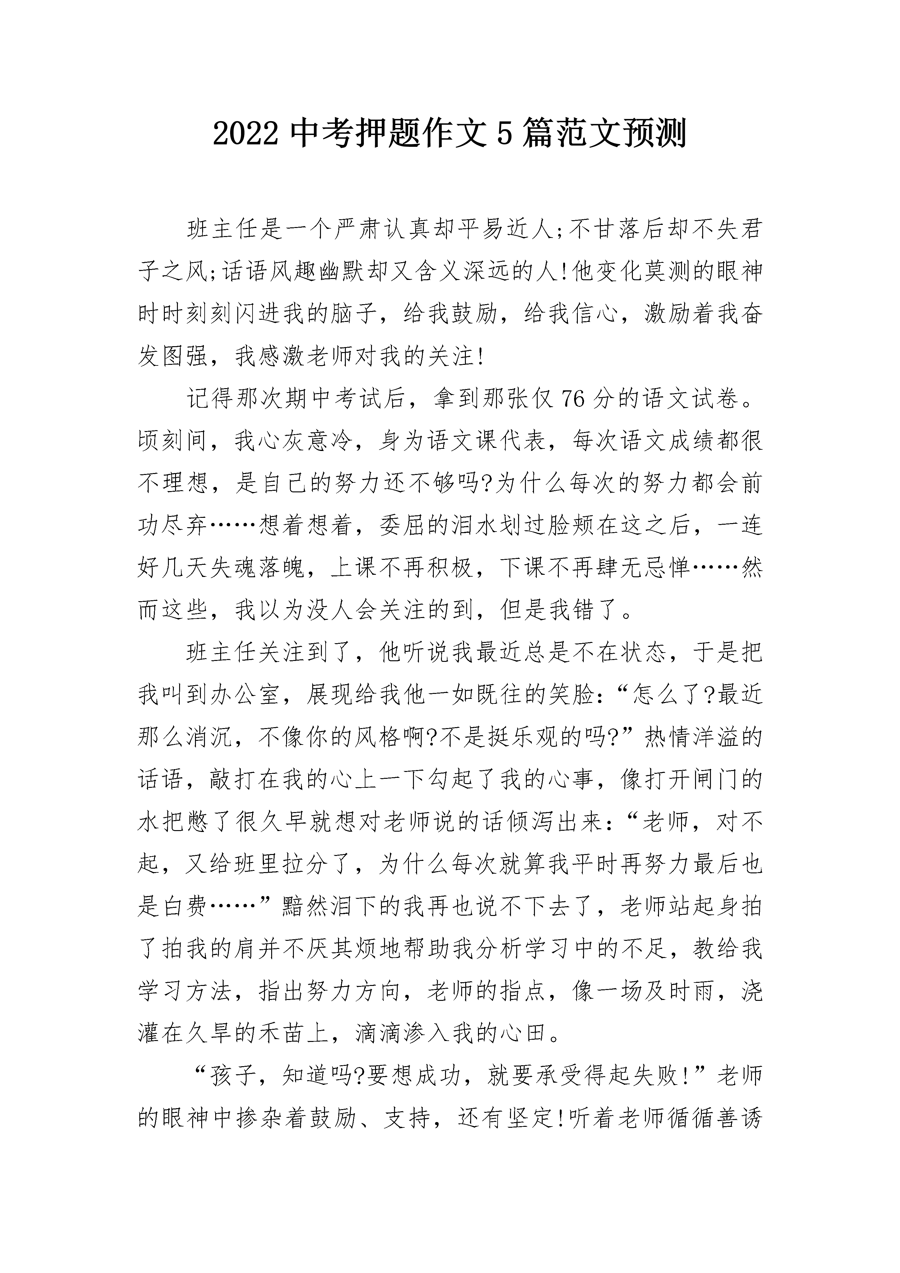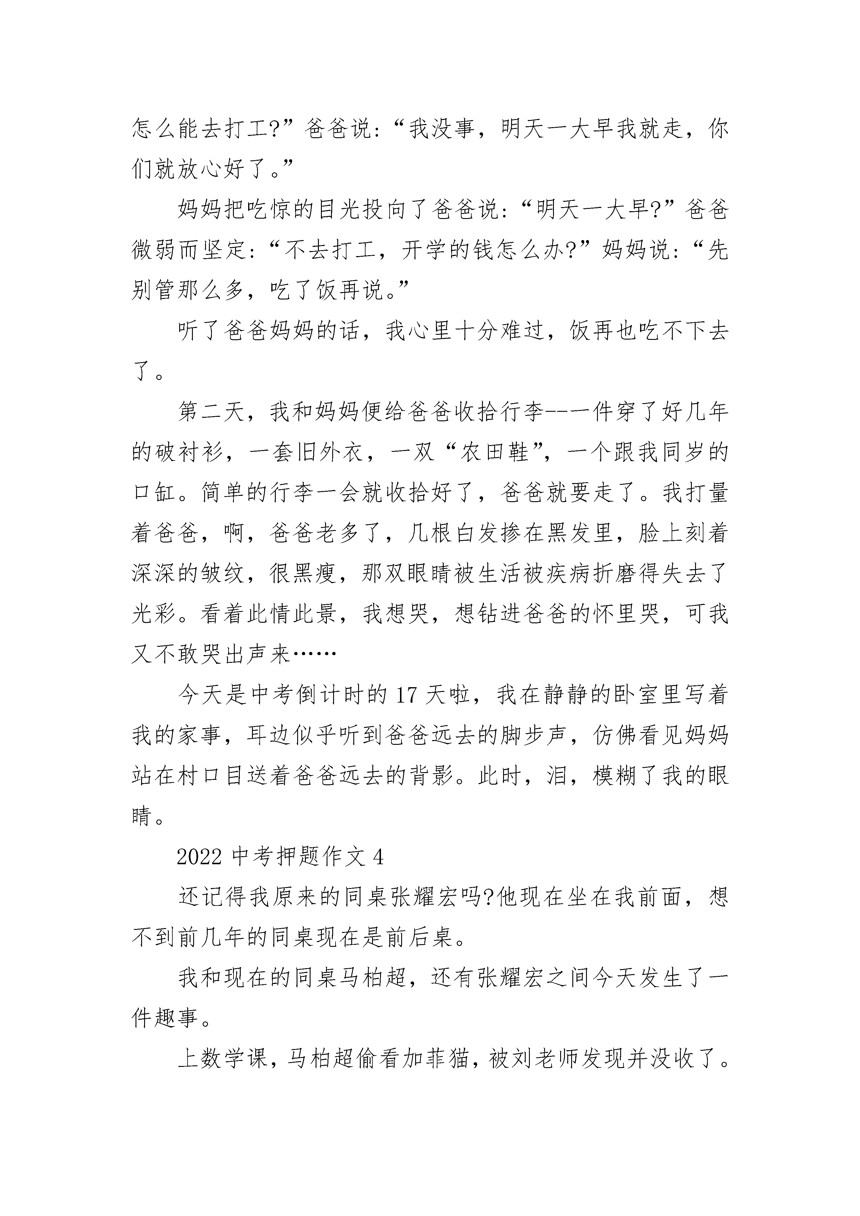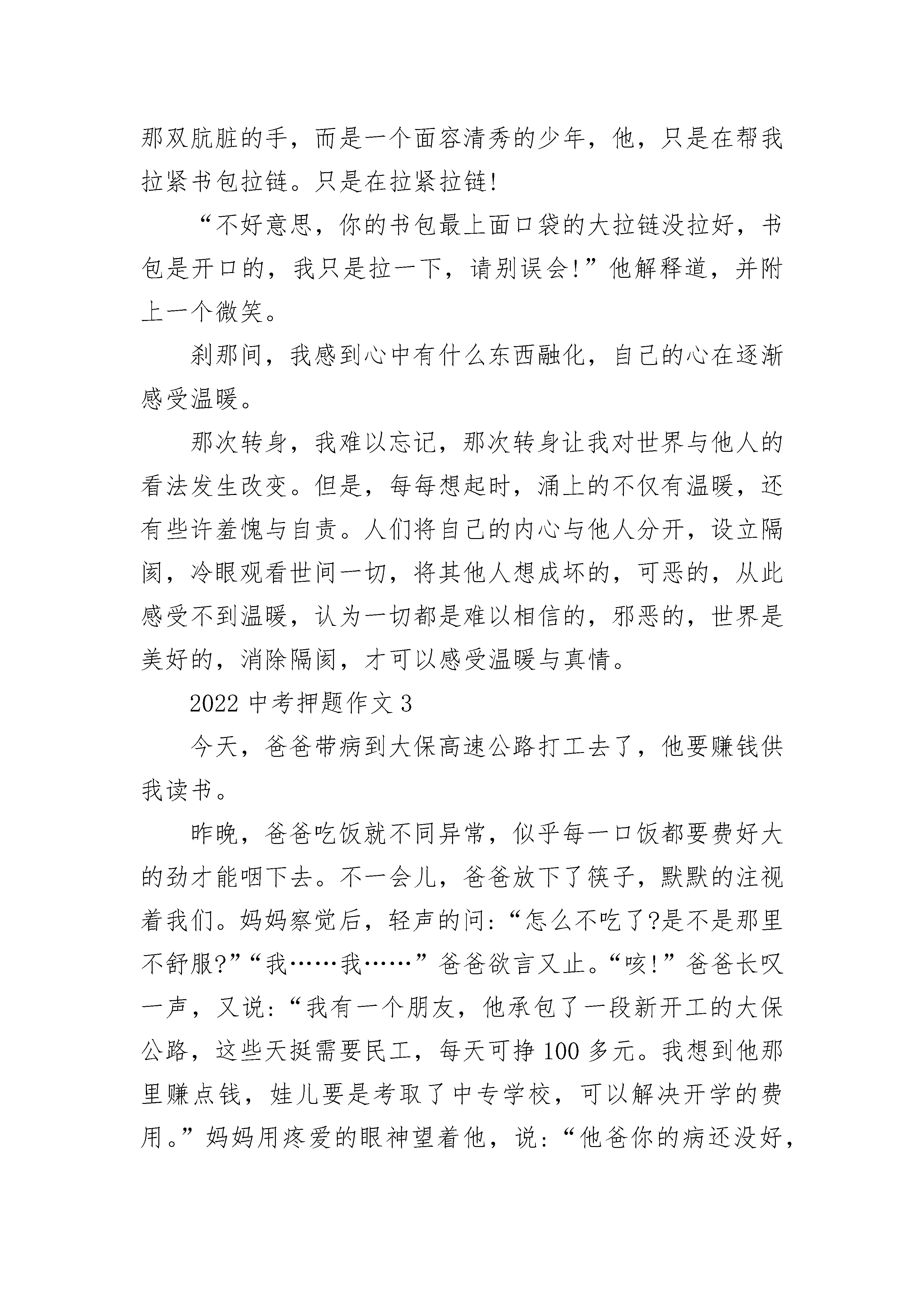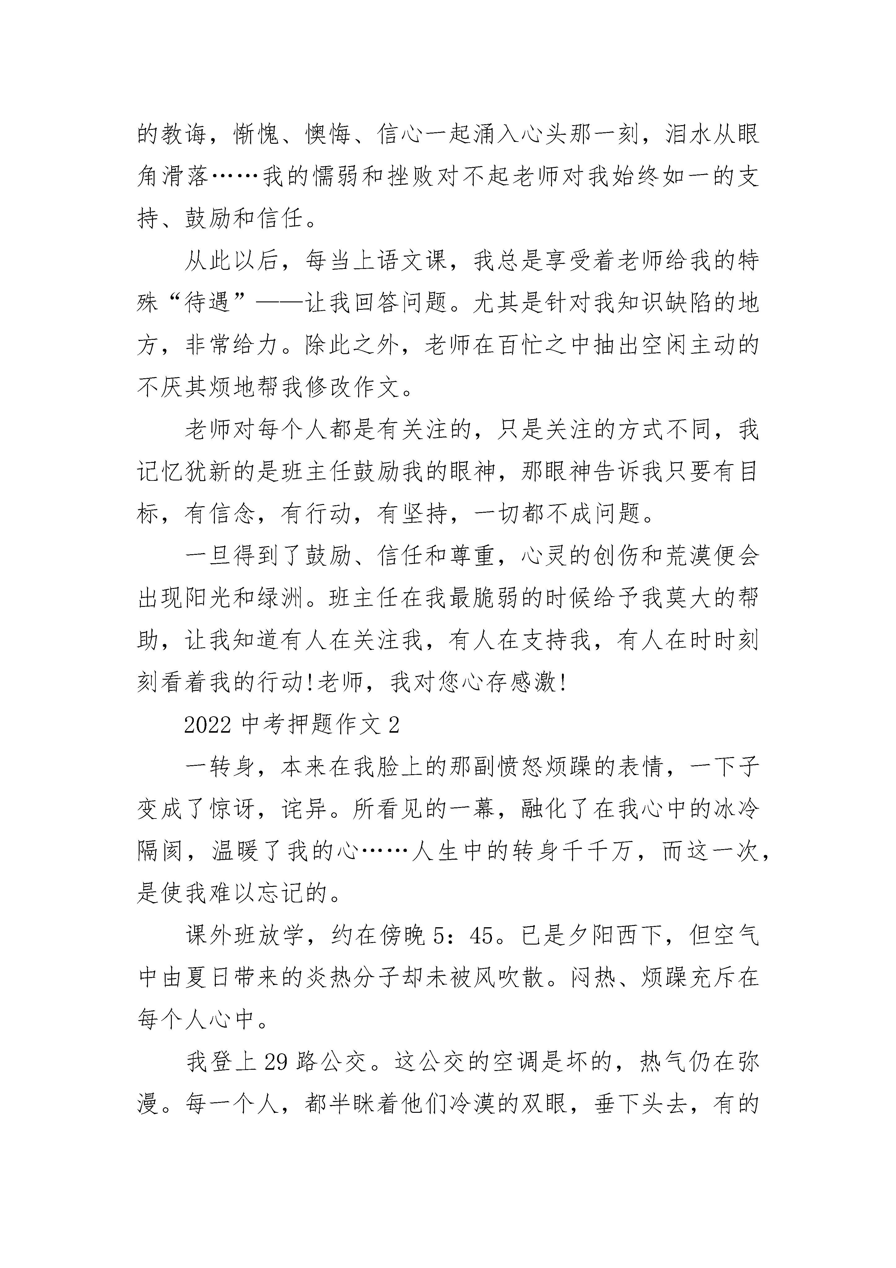 2022中考押题作文5篇范文预测班主任是一个严肃认真却平易近人;不甘落后却不失君子之风;话语风趣幽默却又含义深远的人!他变化莫测的眼神时时刻刻闪进我的脑子,给我鼓励,给我信心,激励着我奋发图强,我感激老师对我的关注!记得那次期中考试后,拿到那张仅76分的语文试卷。顷刻间,我心灰意冷,身为语文课代表,每次语文成绩都很不理想,是自己的努力还不够吗?为什么每次的努力都会前功尽弃……想着想着,委屈的泪水划过脸颊在这之后,一连好几天失魂落魄,上课不再积极,下课不再肆无忌惮……然而这些,我以为没人会关注的到,但是我错了。班主任关注到了,他听说我最近总是不在状态,于是把我叫到办公室,展现给我他一如既往的笑脸:“怎么了?最近那么消沉,不像你的风格啊?不是挺乐观的吗?”热情洋溢的话语,敲打在我的心上一下勾起了我的心事,像打开闸门的水把憋了很久早就想对老师说的话倾泻出来:“老师,对不起,又给班里拉分了,为什么每次就算我平时再努力最后也是白费……”黯然泪下的我再也说不下去了,老师站起身拍了拍我的肩并不厌其烦地帮助我分析学习中的不足,教给我学习方法,指出努力方向,老师的指点,像一场及时雨,浇灌在久旱的禾苗上,滴滴渗入我的心田。“孩子,知道吗?要想成功,就要承受得起失败!”老师的眼神中掺杂着鼓励、支持,还有坚定!听着老师循循善诱的教诲,惭愧、懊悔、信心一起涌入心头那一刻,泪水从眼角滑落……我的懦弱和挫败对不起老师对我始终如一的支持、鼓励和信任。从此以后,每当上语文课,我总是享受着老师给我的特殊“待遇”——让我回答问题。尤其是针对我知识缺陷的地方,非常给力。除此之外,老师在百忙之中抽出空闲主动的不厌其烦地帮我修改作文。老师对每个人都是有关注的,只是关注的方式不同,我记忆犹新的是班主任鼓励我的眼神,那眼神告诉我只要有目标,有信念,有行动,有坚持,一切都不成问题。一旦得到了鼓励、信任和尊重,心灵的创伤和荒漠便会出现阳光和绿洲。班主任在我最脆弱的时候给予我莫大的帮助,让我知道有人在关注我,有人在支持我,有人在时时刻刻看着我的行动!老师,我对您心存感激!2022中考押题作文2一转身,本来在我脸上的那副愤怒烦躁的表情,一下子变成了惊讶,诧异。所看见的一幕,融化了在我心中的冰冷隔阂,温暖了我的心……人生中的转身千千万,而这一次,是使我难以忘记的。课外班放学,约在傍晚5:45。已是夕阳西下,但空气中由夏日带来的炎热分子却未被风吹散。闷热、烦躁充斥在每个人心中。我登上29路公交。这公交的空调是坏的,热气仍在弥漫。每一个人,都半眯着他们冷漠的双眼,垂下头去,有的在刷QQ动态的,即使没有,也是一样的动作。虽说是很热,但人们彼此间是如此陌生,如此冷漠,心与心之间好像有挺大的距离。整个车厢给人以冷的气氛。我与他们一样,附下头,双眼木然盯着地面,听着音乐,手扶扶手。今天上课很累,天气又热,但愿车可以开快一点,早些到站,还可以多玩会电脑呢!我心中这么想着,一到暑假,整个人都“陀”了,天天上网,除上课就很少外出了。忽然,我感到我的书包好像被拉动了,一下、两下。真是烦死了,一定是哪个小孩没事玩的。我心中暗骂一声“臭小鬼”!可是又不想与他人多讲话交流,况且在车上也不方便,就懒得转身了。渐渐地,好像不太对劲。我的书包被拉了有一段时间,而且我清晰感觉到,那是在拉我最上面的口袋。小孩子的话,应该不会拽这么久,而且,拽到的应该是书上面比较偏下的部分。如果不是小孩子,那么会是……难道说,有人在偷我钱包,我的钱包可就放在那个口袋的!一定是有人偷我钱包,不然怎么会拽那个口袋那么长时间!我脑中有些乱,不觉就想出了那个小偷偷钱包的情景,那家伙一定是一个面相丑陋的人,将自己那双肮脏的手伸向我的书包,眼中闪着贪婪!真是令人厌恶!厌恶、愤怒、烦躁,一齐涌上我的脑海,带着一股力气,我,转身。一转身,本来在我脸上的那副愤怒烦躁的表情,一下变成了惊讶、诧异。我所看见的,不是面相丑陋的小偷,不是那双肮脏的手,而是一个面容清秀的少年,他,只是在帮我拉紧书包拉链。只是在拉紧拉链!“不好意思,你的书包最上面口袋的大拉链没拉好,书包是开口的,我只是拉一下,请别误会!”他解释道,并附上一个微笑。刹那间,我感到心中有什么东西融化,自己的心在逐渐感受温暖。那次转身,我难以忘记,那次转身让我对世界与他人的看法发生改变。但是,每每想起时,涌上的不仅有温暖,还有些许羞愧与自责。人们将自己的内心与他人分开,设立隔阂,冷眼观看世间一切,将其他人想成坏的,可恶的,从此感受不到温暖,认为一切都是难以相信的,邪恶的,世界是美好的,消除隔阂,才可以感受温暖与真情。2022中考押题作文3今天,爸爸带病到大保高速公路打工去了,他要赚钱供我读书。昨晚,爸爸吃饭就不同异常,似乎每一口饭都要费好大的劲才能咽下去。不一会儿,爸爸放下了筷子,默默的注视着我们。
