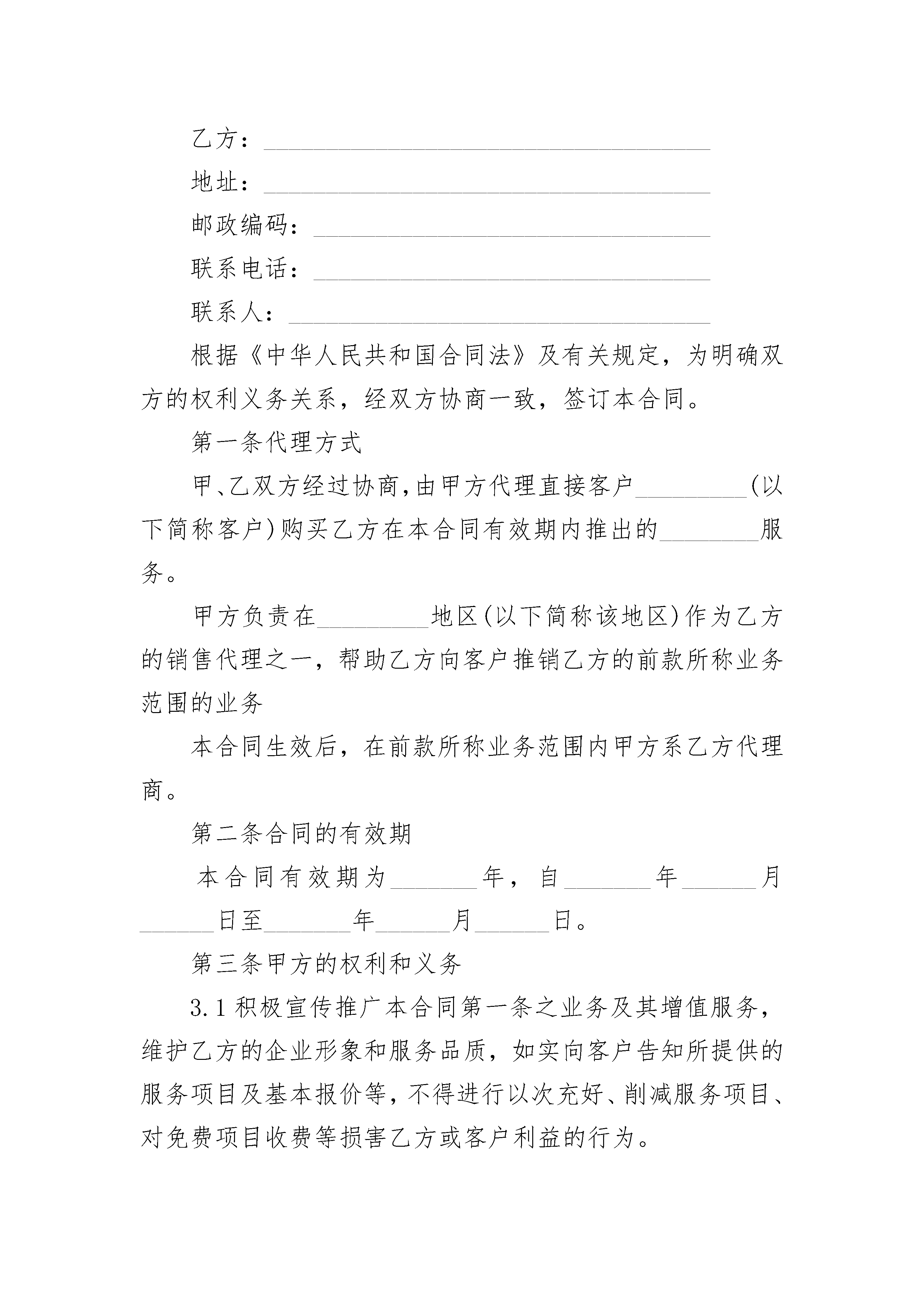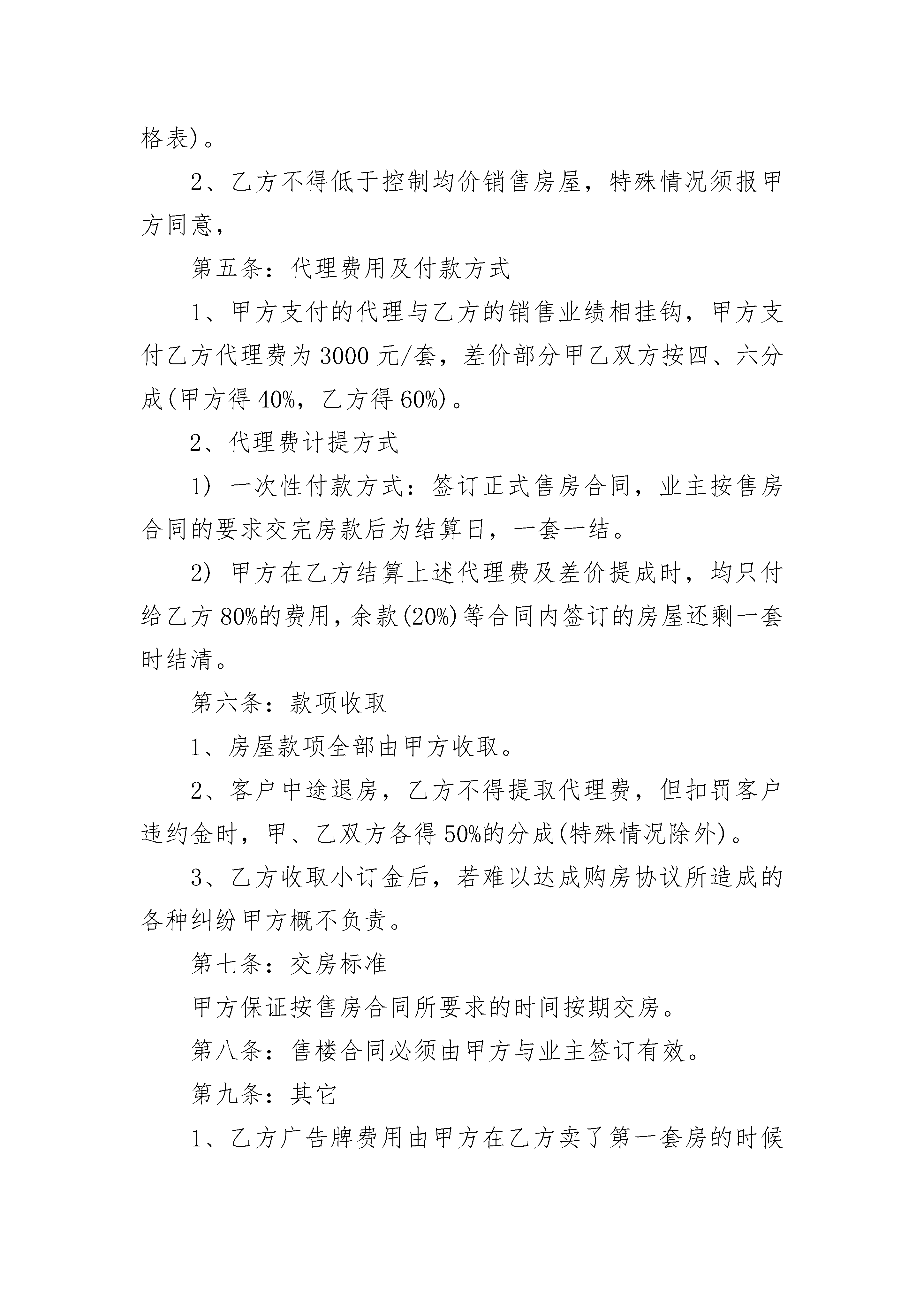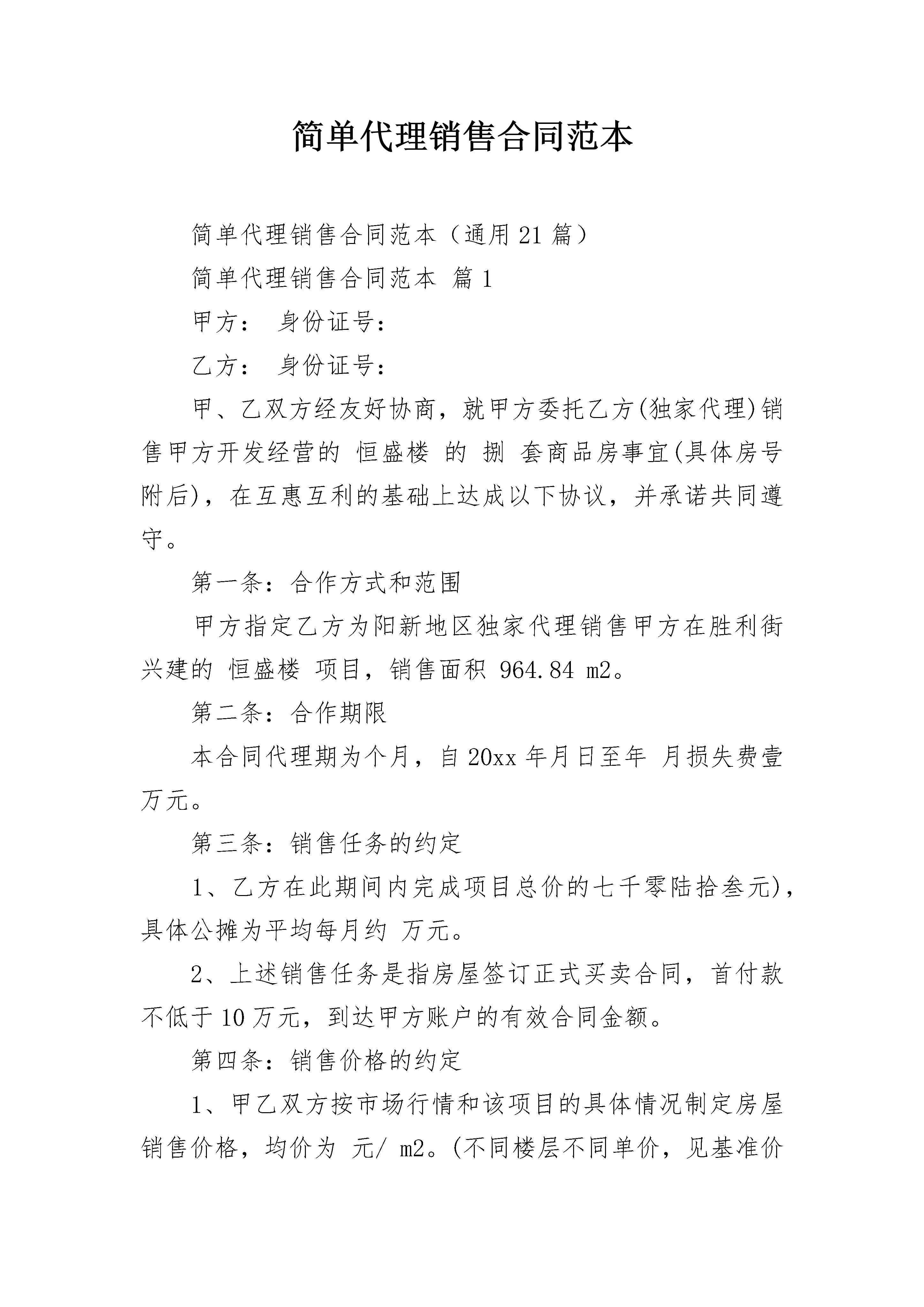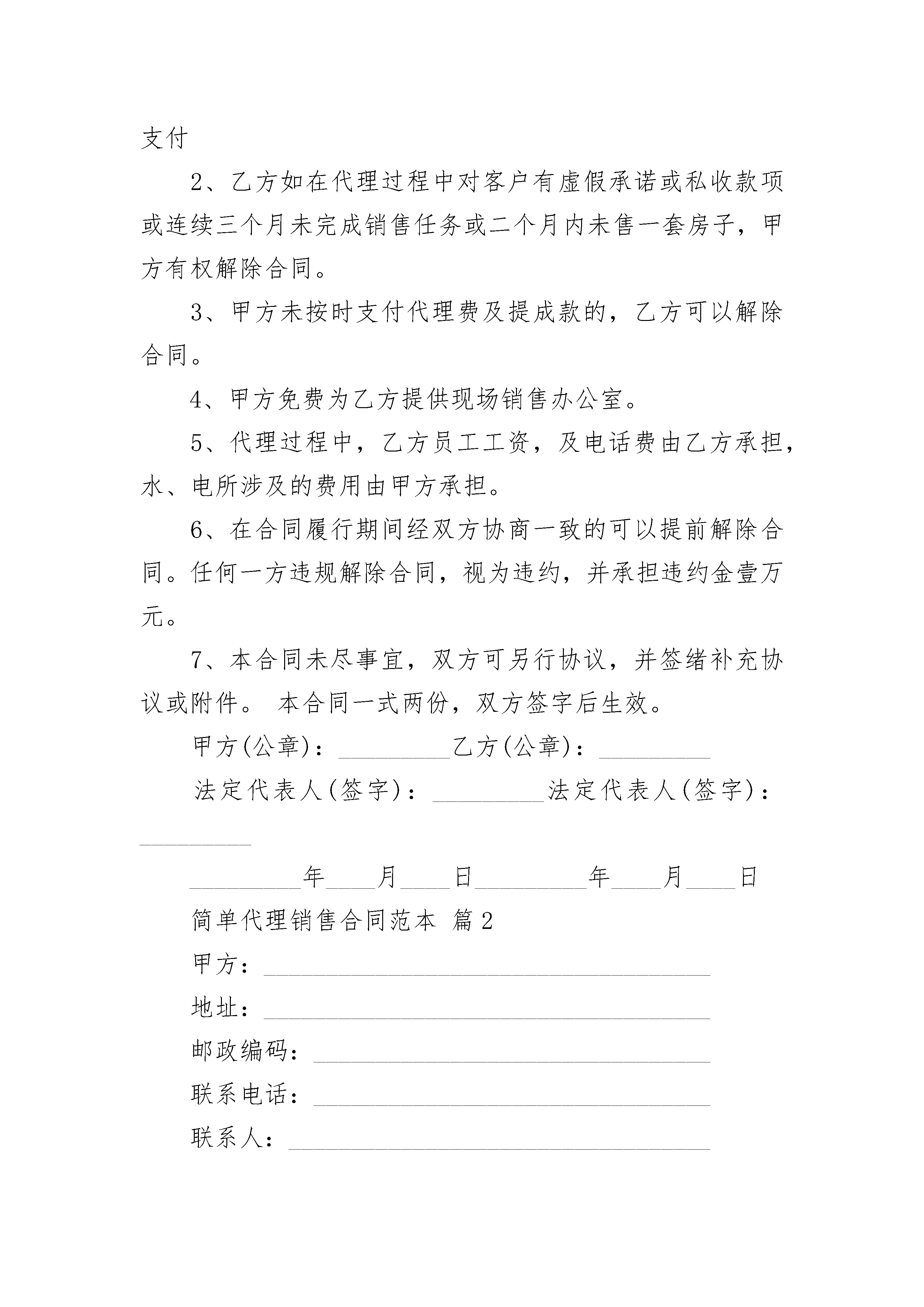 简单代理销售合同范本简单代理销售合同范本(通用21篇)简单代理销售合同范本篇1甲方:身份证号:乙方:身份证号:甲、乙双方经友好协商,就甲方委托乙方(独家代理)销售甲方开发经营的恒盛楼的捌套商品房事宜(具体房号附后),在互惠互利的基础上达成以下协议,并承诺共同遵守。第一条:合作方式和范围甲方指定乙方为阳新地区独家代理销售甲方在胜利街兴建的恒盛楼项目,销售面积964.84m2。第二条:合作期限本合同代理期为个月,自20xx年月日至年月损失费壹万元。第三条:销售任务的约定1、乙方在此期间内完成项目总价的七千零陆拾叁元),具体公摊为平均每月约万元。2、上述销售任务是指房屋签订正式买卖合同,首付款不低于10万元,到达甲方账户的有效合同金额。第四条:销售价格的约定1、甲乙双方按市场行情和该项目的具体情况制定房屋销售价格,均价为元/m2。(不同楼层不同单价,见基准价格表)。2、乙方不得低于控制均价销售房屋,特殊情况须报甲方同意,第五条:代理费用及付款方式1、甲方支付的代理与乙方的销售业绩相挂钩,甲方支付乙方代理费为3000元/套,差价部分甲乙双方按四、六分成(甲方得40%,乙方得60%)。2、代理费计提方式1)一次性付款方式:签订正式售房合同,业主按售房合同的要求交完房款后为结算日,一套一结。2)甲方在乙方结算上述代理费及差价提成时,均只付给乙方80%的费用,余款(20%)等合同内签订的房屋还剩一套时结清。第六条:款项收取1、房屋款项全部由甲方收取。2、客户中途退房,乙方不得提取代理费,但扣罚客户违约金时,甲、乙双方各得50%的分成(特殊情况除外)。3、乙方收取小订金后,若难以达成购房协议所造成的各种纠纷甲方概不负责。第七条:交房标准甲方保证按售房合同所要求的时间按期交房。第八条:售楼合同必须由甲方与业主签订有效。第九条:其它1、乙方广告牌费用由甲方在乙方卖了第一套房的时候支付2、乙方如在代理过程中对客户有虚假承诺或私收款项或连续三个月未完成销售任务或二个月内未售一套房子,甲方有权解除合同。3、甲方未按时支付代理费及提成款的,乙方可以解除合同。4、甲方免费为乙方提供现场销售办公室。5、代理过程中,乙方员工工资,及电话费由乙方承担,水、电所涉及的费用由甲方承担。6、在合同履行期间经双方协商一致的可以提前解除合同。任何一方违规解除合同,视为违约,并承担违约金壹万元。7、本合同未尽事宜,双方可另行协议,并签绪补充协议或附件。本合同一式两份,双方签字后生效。甲方(公章):_________乙方(公章):_________法定代表人(签字):_________法定代表人(签字):__________________年____月____日_________年____月____日简单代理销售合同范本篇2甲方:____________________________________地址:____________________________________邮政编码:________________________________联系电话:________________________________联系人:__________________________________乙方:____________________________________地址:____________________________________邮政编码:________________________________联系电话:________________________________联系人:__________________________________根据《中华人民共和国合同法》及有关规定,为明确双方的权利义务关系,经双方协商一致,签订本合同。第一条代理方式甲、乙双方经过协商,由甲方代理直接客户_________(以下简称客户)购买乙方在本合同有效期内推出的________服务。甲方负责在_________地区(以下简称该地区)作为乙方的销售代理之一,帮助乙方向客户推销乙方的前款所称业务范围的业务本合同生效后,在前款所称业务范围内甲方系乙方代理商。第二条合同的有效期本合同有效期为_______年,自_______年______月______日至_______年______月______日。第三条甲方的权利和义务3.1积极宣传推广本合同第一条之业务及其增值服务,维护乙方的企业形象和服务品质,如实向客户告知所提供的服务项目及基本报价等,不得进行以次充好、削减服务项目、对免费项目收费等损害乙方或客户利益的行为。3.2甲方办理第一条之业务时可由甲方和客户签订合同再与乙方签订服务合同或乙方直接与客户签订合同,并向客户提供必要的售前技术支持,解答客户提出的各种问题。