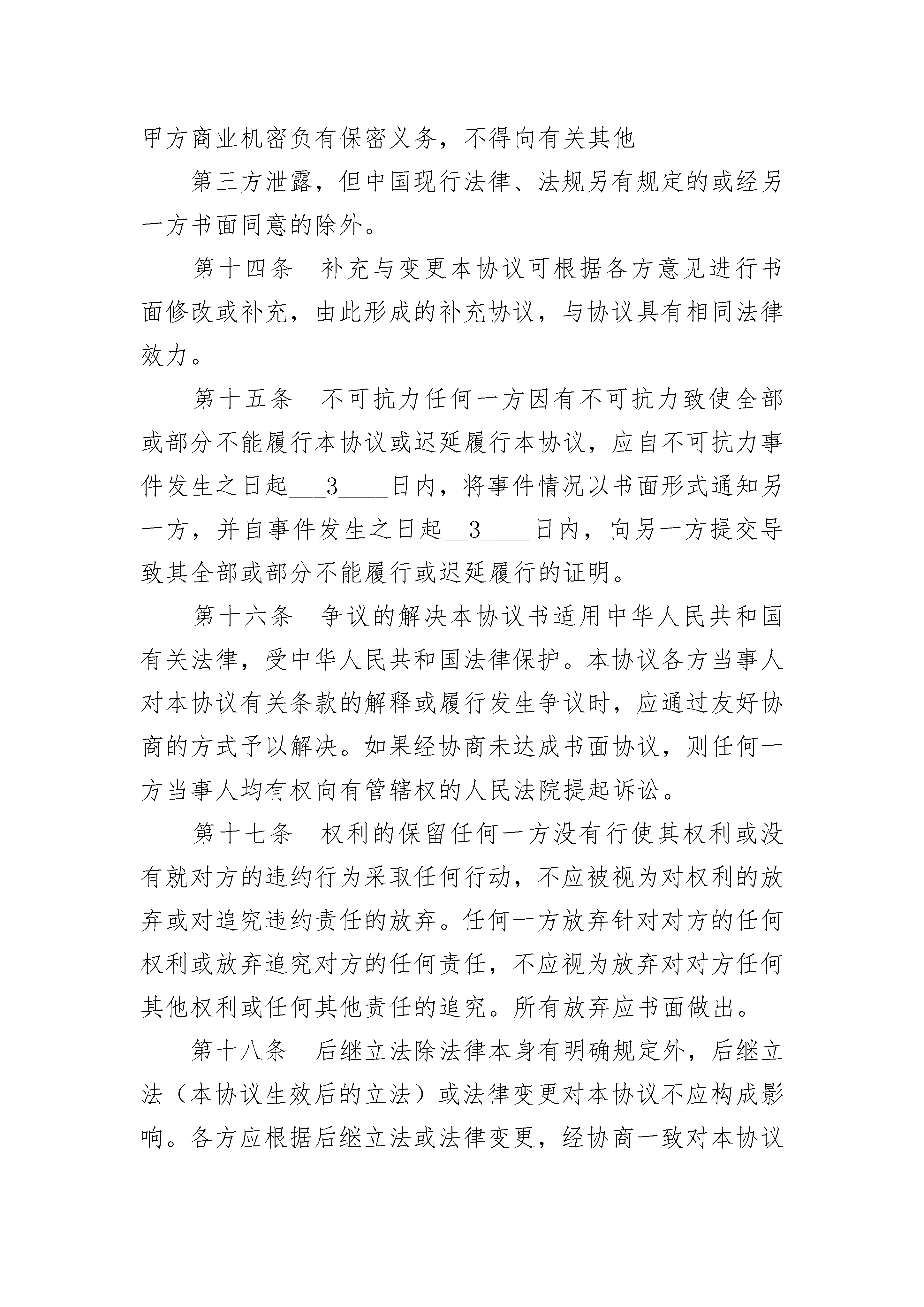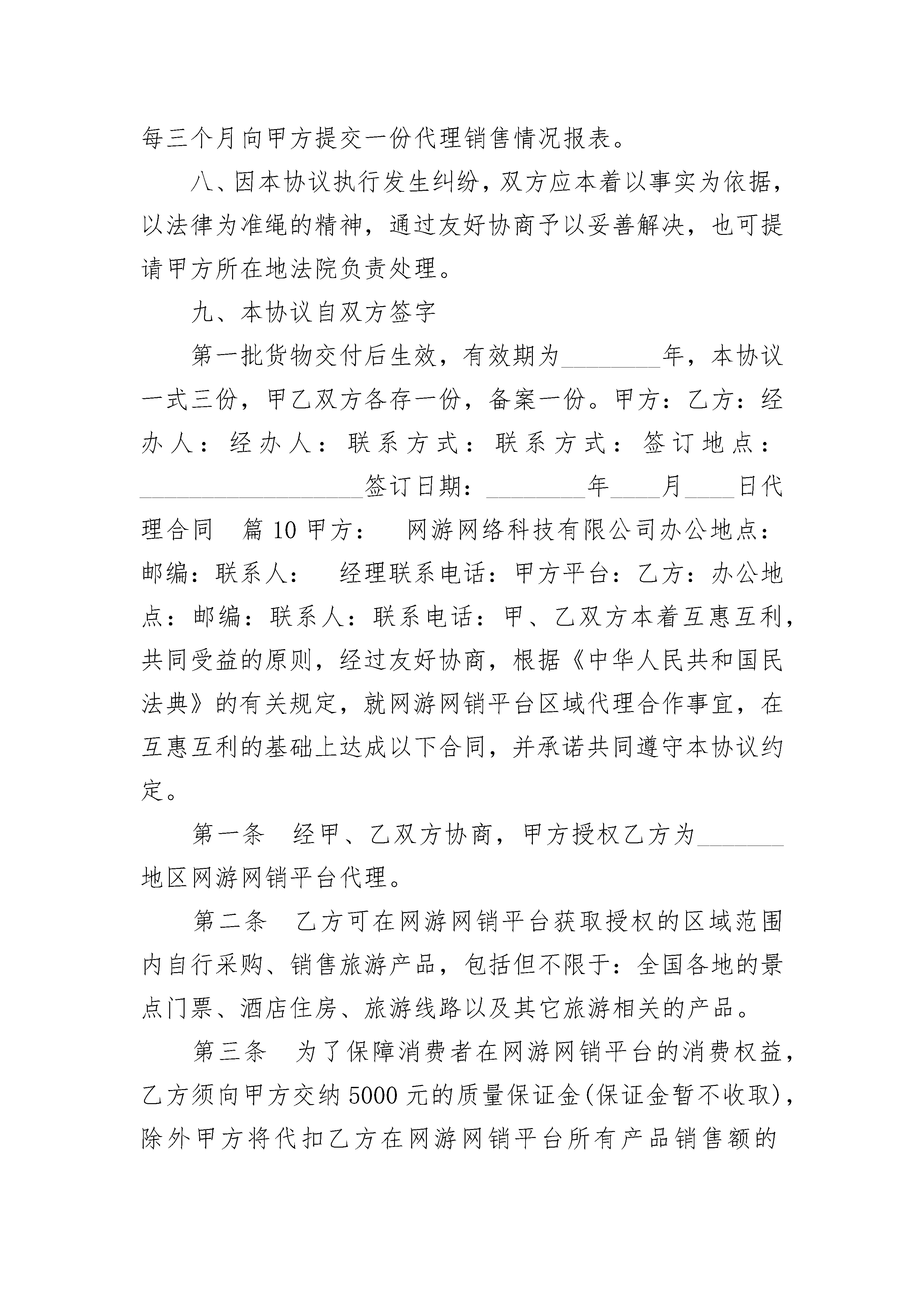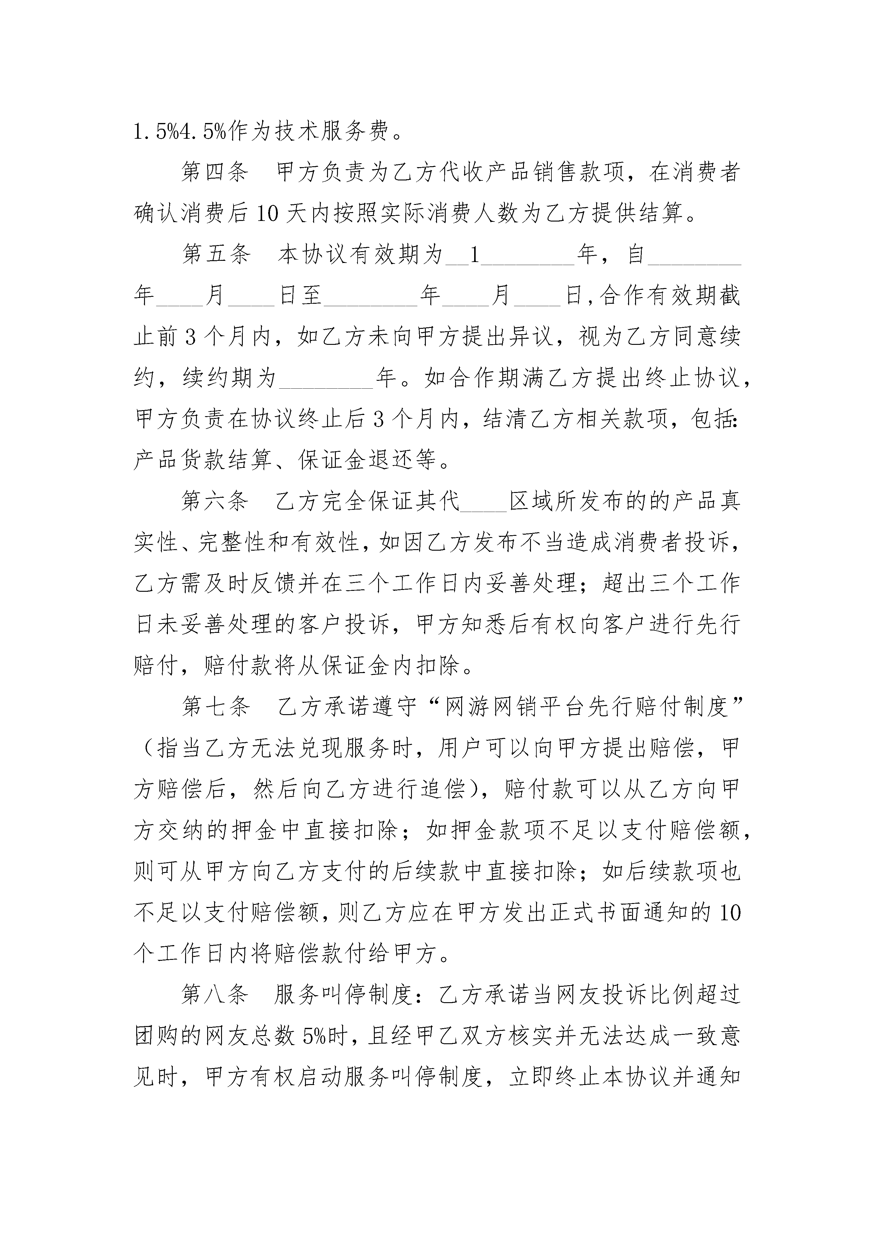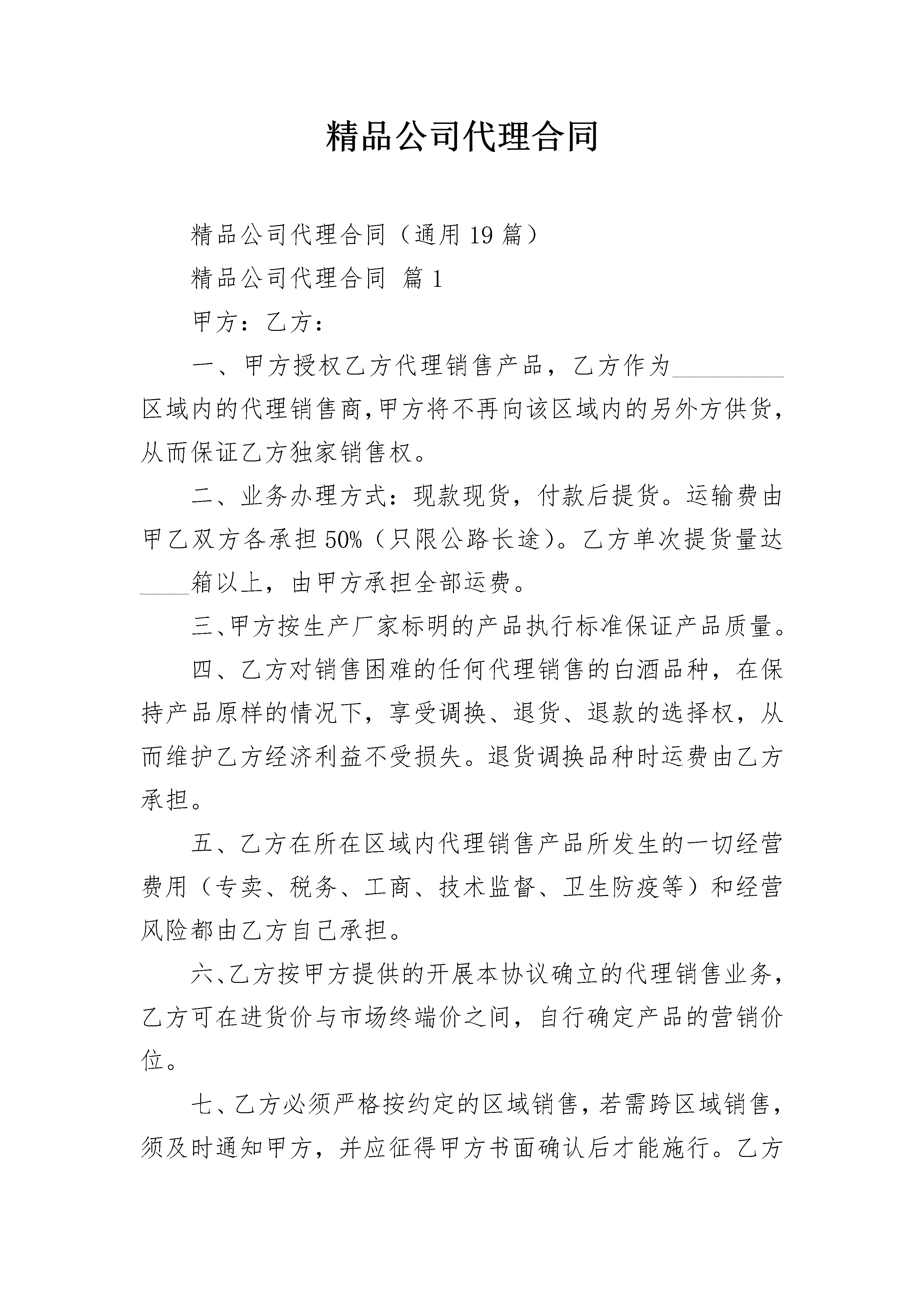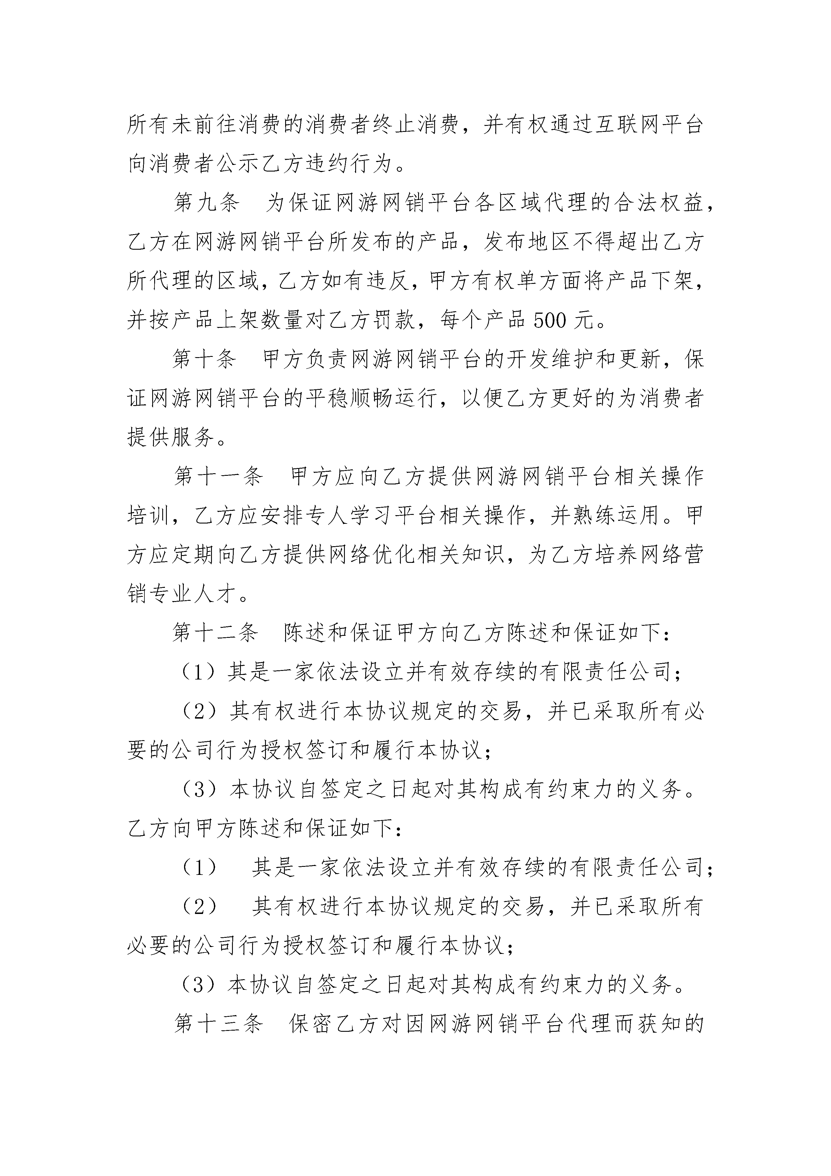 精品公司代理合同精品公司代理合同(通用19篇)精品公司代理合同篇1甲方:乙方:一、甲方授权乙方代理销售产品,乙方作为_________区域内的代理销售商,甲方将不再向该区域内的另外方供货,从而保证乙方独家销售权。二、业务办理方式:现款现货,付款后提货。运输费由甲乙双方各承担50%(只限公路长途)。乙方单次提货量达____箱以上,由甲方承担全部运费。三、甲方按生产厂家标明的产品执行标准保证产品质量。四、乙方对销售困难的任何代理销售的白酒品种,在保持产品原样的情况下,享受调换、退货、退款的选择权,从而维护乙方经济利益不受损失。退货调换品种时运费由乙方承担。五、乙方在所在区域内代理销售产品所发生的一切经营费用(专卖、税务、工商、技术监督、卫生防疫等)和经营风险都由乙方自己承担。六、乙方按甲方提供的开展本协议确立的代理销售业务,乙方可在进货价与市场终端价之间,自行确定产品的营销价位。七、乙方必须严格按约定的区域销售,若需跨区域销售,须及时通知甲方,并应征得甲方书面确认后才能施行。乙方每三个月向甲方提交一份代理销售情况报表。八、因本协议执行发生纠纷,双方应本着以事实为依据,以法律为准绳的精神,通过友好协商予以妥善解决,也可提请甲方所在地法院负责处理。九、本协议自双方签字第一批货物交付后生效,有效期为________年,本协议一式三份,甲乙双方各存一份,备案一份。甲方:乙方:经办人:经办人:联系方式:联系方式:签订地点:__________________签订日期:________年____月____日代理合同篇10甲方:网游网络科技有限公司办公地点:邮编:联系人:经理联系电话:甲方平台:乙方:办公地点:邮编:联系人:联系电话:甲、乙双方本着互惠互利,共同受益的原则,经过友好协商,根据《中华人民共和国民法典》的有关规定,就网游网销平台区域代理合作事宜,在互惠互利的基础上达成以下合同,并承诺共同遵守本协议约定。第一条经甲、乙双方协商,甲方授权乙方为_______地区网游网销平台代理。第二条乙方可在网游网销平台获取授权的区域范围内自行采购、销售旅游产品,包括但不限于:全国各地的景点门票、酒店住房、旅游线路以及其它旅游相关的产品。第三条为了保障消费者在网游网销平台的消费权益,乙方须向甲方交纳5000元的质量保证金(保证金暂不收取),除外甲方将代扣乙方在网游网销平台所有产品销售额的1.5%4.5%作为技术服务费。第四条甲方负责为乙方代收产品销售款项,在消费者确认消费后10天内按照实际消费人数为乙方提供结算。第五条本协议有效期为__1________年,自________年____月____日至________年____月____日,合作有效期截止前3个月内,如乙方未向甲方提出异议,视为乙方同意续约,续约期为________年。如合作期满乙方提出终止协议,甲方负责在协议终止后3个月内,结清乙方相关款项,包括:产品货款结算、保证金退还等。第六条乙方完全保证其代____区域所发布的的产品真实性、完整性和有效性,如因乙方发布不当造成消费者投诉,乙方需及时反馈并在三个工作日内妥善处理;超出三个工作日未妥善处理的客户投诉,甲方知悉后有权向客户进行先行赔付,赔付款将从保证金内扣除。第七条乙方承诺遵守“网游网销平台先行赔付制度”(指当乙方无法兑现服务时,用户可以向甲方提出赔偿,甲方赔偿后,然后向乙方进行追偿),赔付款可以从乙方向甲方交纳的押金中直接扣除;如押金款项不足以支付赔偿额,则可从甲方向乙方支付的后续款中直接扣除;如后续款项也不足以支付赔偿额,则乙方应在甲方发出正式书面通知的10个工作日内将赔偿款付给甲方。第八条服务叫停制度:乙方承诺当网友投诉比例超过团购的网友总数5%时,且经甲乙双方核实并无法达成一致意见时,甲方有权启动服务叫停制度,立即终止本协议并通知所有未前往消费的消费者终止消费,并有权通过互联网平台向消费者公示乙方违约行为。第九条为保证网游网销平台各区域代理的合法权益,乙方在网游网销平台所发布的产品,发布地区不得超出乙方所代理的区域,乙方如有违反,甲方有权单方面将产品下架,并按产品上架数量对乙方罚款,每个产品500元。第十条甲方负责网游网销平台的开发维护和更新,保证网游网销平台的平稳顺畅运行,以便乙方更好的为消费者提供服务。第十一条甲方应向乙方提供网游网销平台相关操作培训,乙方应安排专人学习平台相关操作,并熟练运用。甲方应定期向乙方提供网络优化相关知识,为乙方培养网络营销专业人才。第十二条陈述和保证甲方向乙方陈述和保证如下:(1)其是一家依法设立并有效存续的有限责任公司;(2)其有权进行本协议规定的交易,并已采取所有必要的公司行为授权签订和履行本协议;(3)本协议自签定之日起对其构成有约束力的义务。乙方向甲方陈述和