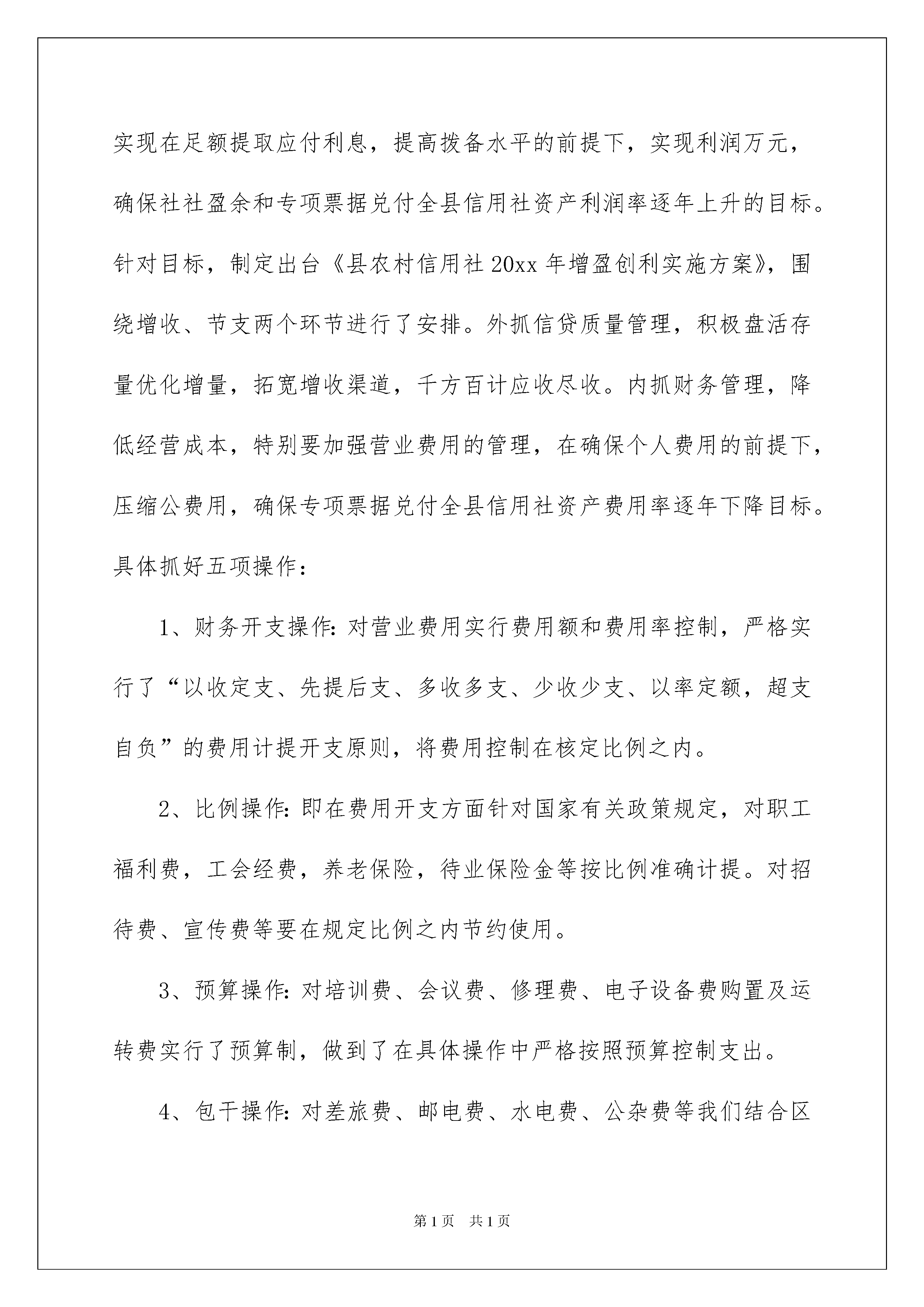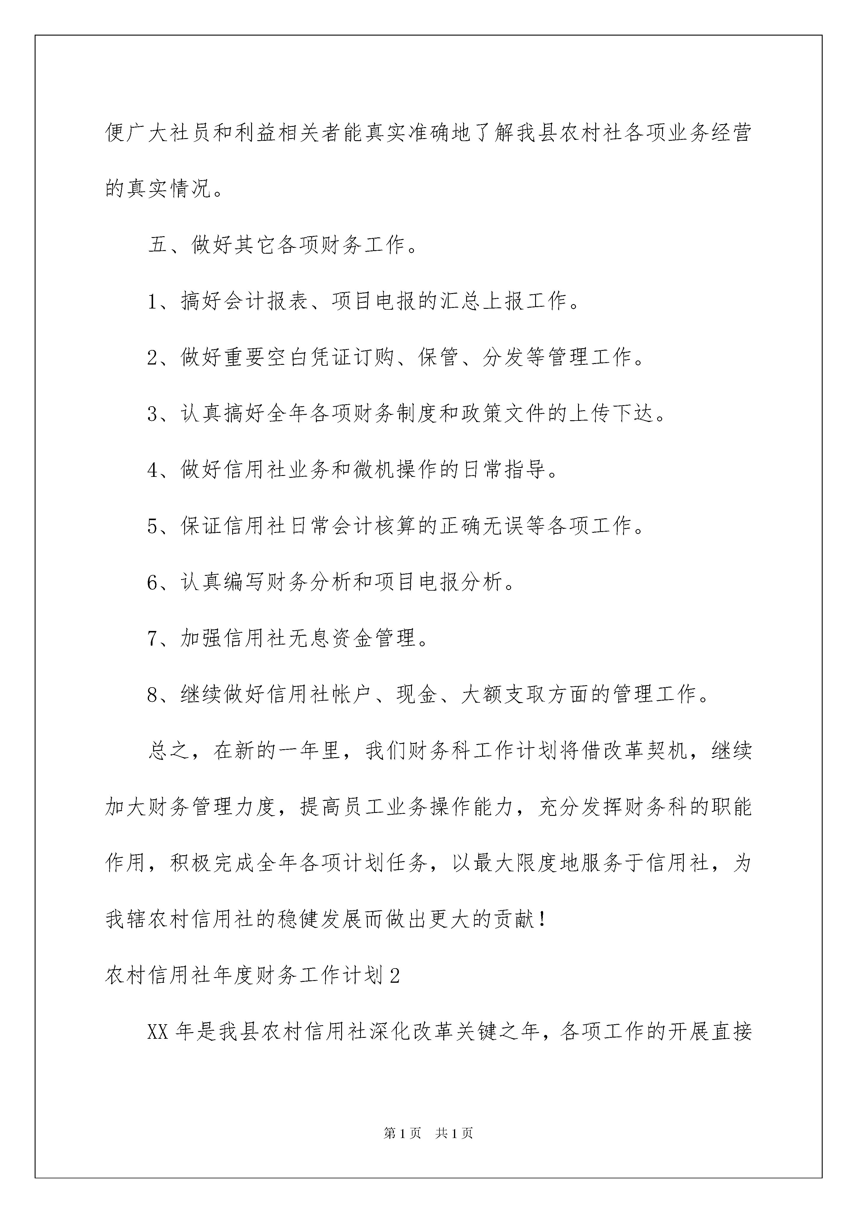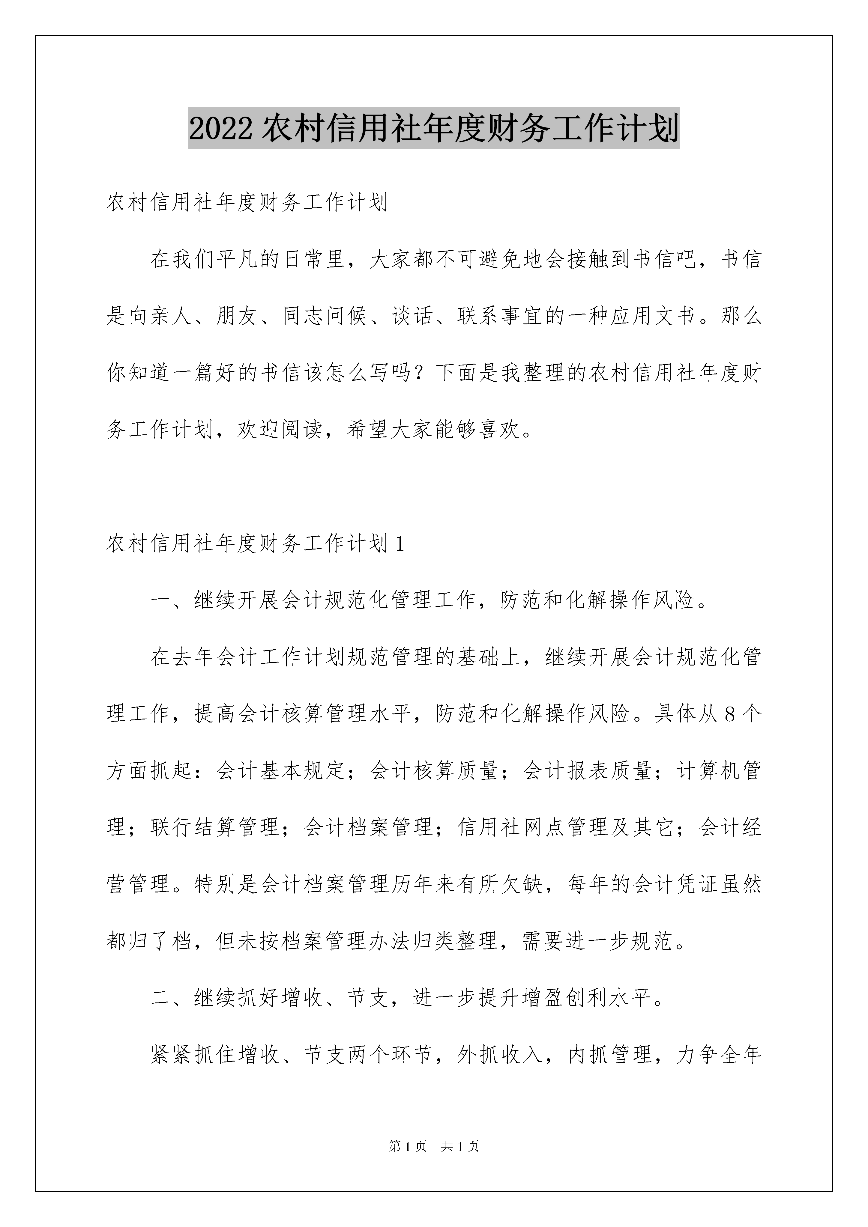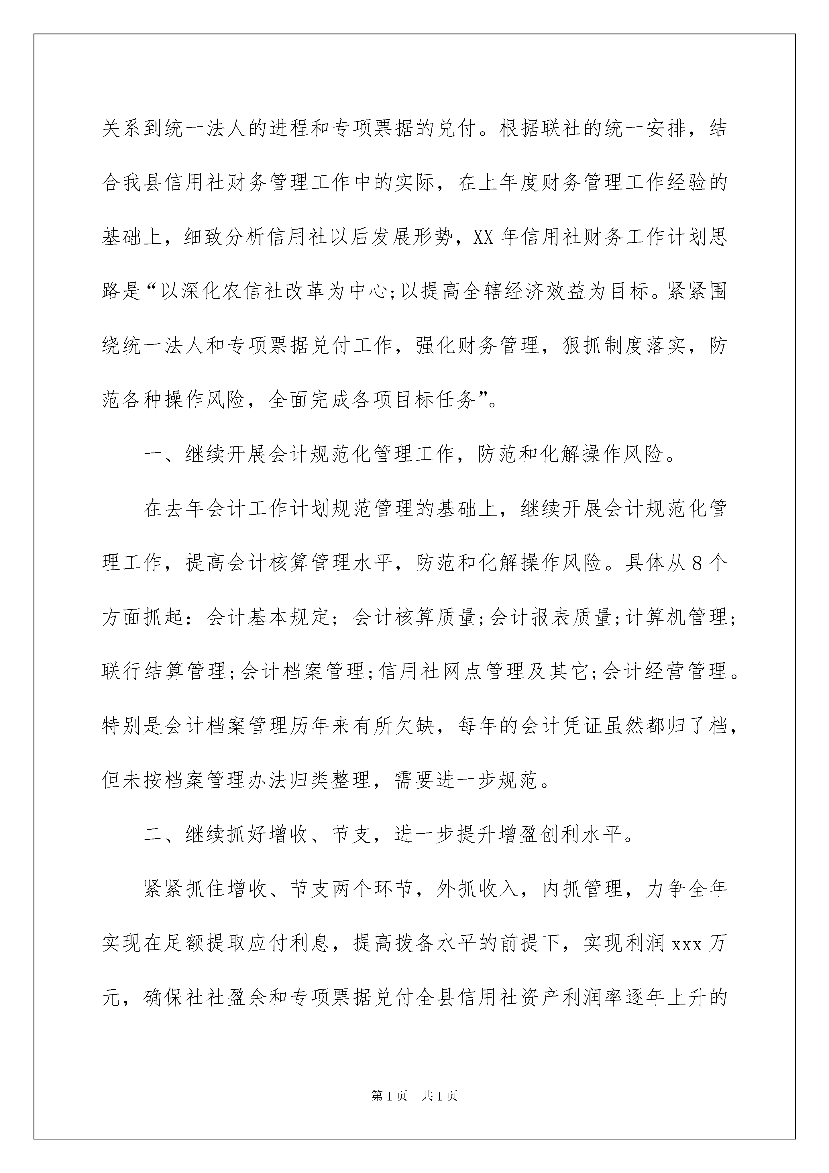 2022农村信用社年度财务工作计划农村信用社年度财务工作计划在我们平凡的日常里,大家都不可避免地会接触到书信吧,书信是向亲人、朋友、同志问候、谈话、联系事宜的一种应用文书。那么你知道一篇好的书信该怎么写吗?下面是我整理的农村信用社年度财务工作计划,欢迎阅读,希望大家能够喜欢。农村信用社年度财务工作计划1一、继续开展会计规范化管理工作,防范和化解操作风险。在去年会计工作计划规范管理的基础上,继续开展会计规范化管理工作,提高会计核算管理水平,防范和化解操作风险。具体从8个方面抓起:会计基本规定;会计核算质量;会计报表质量;计算机管理;联行结算管理;会计档案管理;信用社网点管理及其它;会计经营管理。特别是会计档案管理历年来有所欠缺,每年的会计凭证虽然都归了档,但未按档案管理办法归类整理,需要进一步规范。二、继续抓好增收、节支,进一步提升增盈创利水平。紧紧抓住增收、节支两个环节,外抓收入,内抓管理,力争全年实现在足额提取应付利息,提高拨备水平的前提下,实现利润万元,确保社社盈余和专项票据兑付全县信用社资产利润率逐年上升的目标。针对目标,制定出台《县农村信用社20xx年增盈创利实施方案》,围绕增收、节支两个环节进行了安排。外抓信贷质量管理,积极盘活存量优化增量,拓宽增收渠道,千方百计应收尽收。内抓财务管理,降低经营成本,特别要加强营业费用的管理,在确保个人费用的前提下,压缩公费用,确保专项票据兑付全县信用社资产费用率逐年下降目标。具体抓好五项操作:1、财务开支操作:对营业费用实行费用额和费用率控制,严格实行了“以收定支、先提后支、多收多支、少收少支、以率定额,超支自负”的费用计提开支原则,将费用控制在核定比例之内。2、比例操作:即在费用开支方面针对国家有关政策规定,对职工福利费,工会经费,养老保险,待业保险金等按比例准确计提。对招待费、宣传费等要在规定比例之内节约使用。3、预算操作:对培训费、会议费、修理费、电子设备费购置及运转费实行了预算制,做到了在具体操作中严格按照预算控制支出。4、包干操作:对差旅费、邮电费、水电费、公杂费等我们结合区域实际和市场物价情况合理制定包干使用办法,无正当理由超出包干限额的社,其超额部分扣减个人费用。5、成本操作:严格加强了其他成本项目和营业外支出的管理,坚持按月监控,防止以其他名义列支。三、继续做好信用社重要空白凭证管理工作,确保安全无事故。在重要空白凭证管理上,今年我们还将继续加大检查力度,近年来,通过每年的序时检查,使得各营业网点对重要凭证使用,管理达到了加强,但此项工作不敢懈怠,计划在20xx年月份,我社要组织工作人员对年5月以来的重要空白凭证领用进行了专项序时检查。从联社领回开始一直查到各社使用,逐项逐类凭证跟踪进行检查。同时要求信用社主管会计每月对所辖网点的重要空白凭证检查一次,每次检查认真登记《重要空白凭证检查登记簿》,责任明确。四、按标准开展信息披露工作。信息披露工作直接影响到专项票据兑付工作,今年3月份之前,要组织信用社按专项票据兑付标准认真开展信息披露,具体对年度的各项经营指标完成情况、股金分红情况、“三会”召开情况、利润分配情况等进行披露,将信息披露报告和信息披露表放于相关场合,以便广大社员和利益相关者能真实准确地了解我县农村社各项业务经营的真实情况。五、做好其它各项财务工作。1、搞好会计报表、项目电报的汇总上报工作。2、做好重要空白凭证订购、保管、分发等管理工作。3、认真搞好全年各项财务制度和政策文件的上传下达。4、做好信用社业务和微机操作的日常指导。5、保证信用社日常会计核算的正确无误等各项工作。6、认真编写财务分析和项目电报分析。7、加强信用社无息资金管理。8、继续做好信用社帐户、现金、大额支取方面的管理工作。总之,在新的一年里,我们财务科工作计划将借改革契机,继续加大财务管理力度,提高员工业务操作能力,充分发挥财务科的职能作用,积极完成全年各项计划任务,以最大限度地服务于信用社,为我辖农村信用社的稳健发展而做出更大的贡献!农村信用社年度财务工作计划2XX年是我县农村信用社深化改革关键之年,各项工作的开展直接关系到统一法人的进程和专项票据的兑付。根据联社的统一安排,结合我县信用社财务管理工作中的实际,在上年度财务管理工作经验的基础上,细致分析信用社以后发展形势,XX年信用社财务工作计划思路是“以深化农信社改革为中心;以提高全辖经济效益为目标。紧紧围绕统一法人和专项票据兑付工作,强化财务管理,狠抓制度落实,防范各种操作风险,全面完成各项目标任务”。一、继续开展会计规范化管理工作,防范和化解操作风险。在去年会计工作计划规范管理