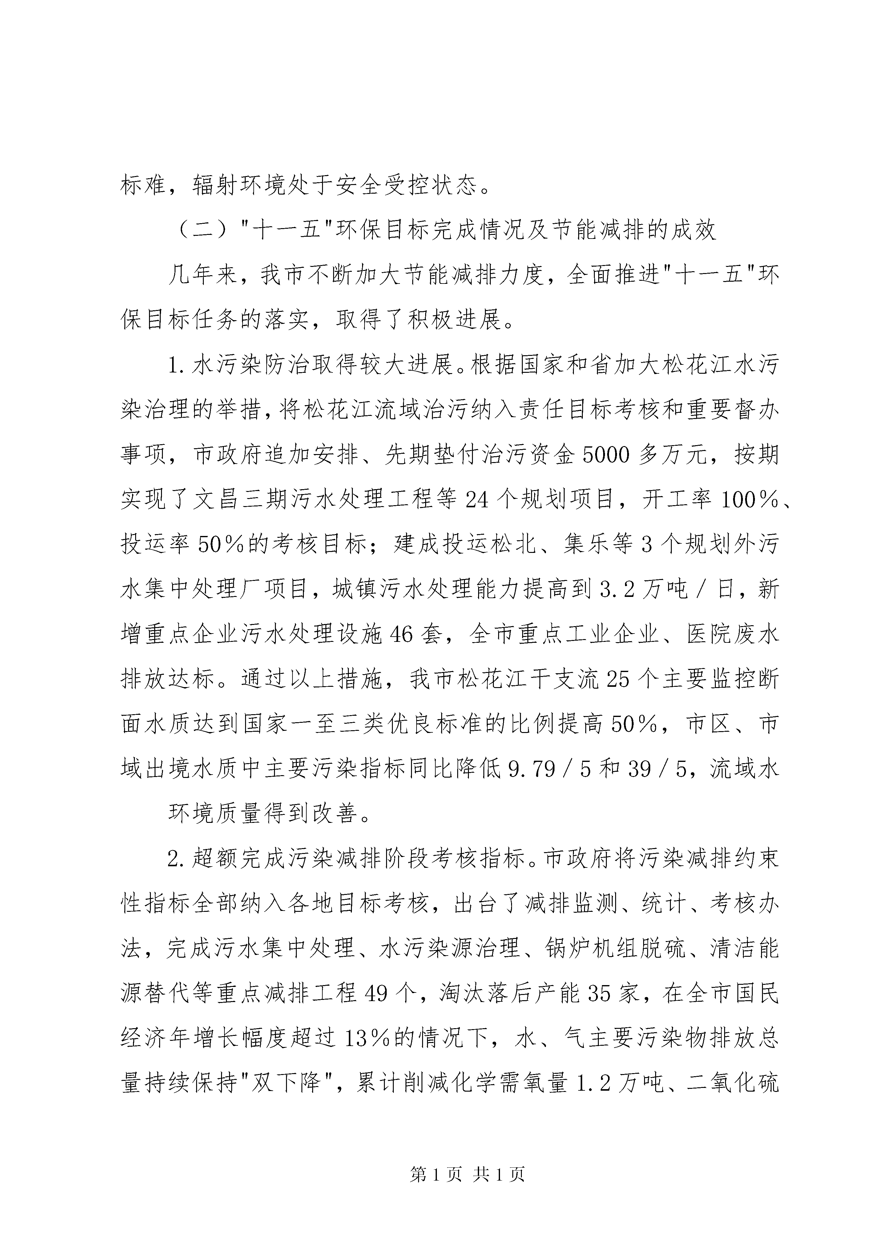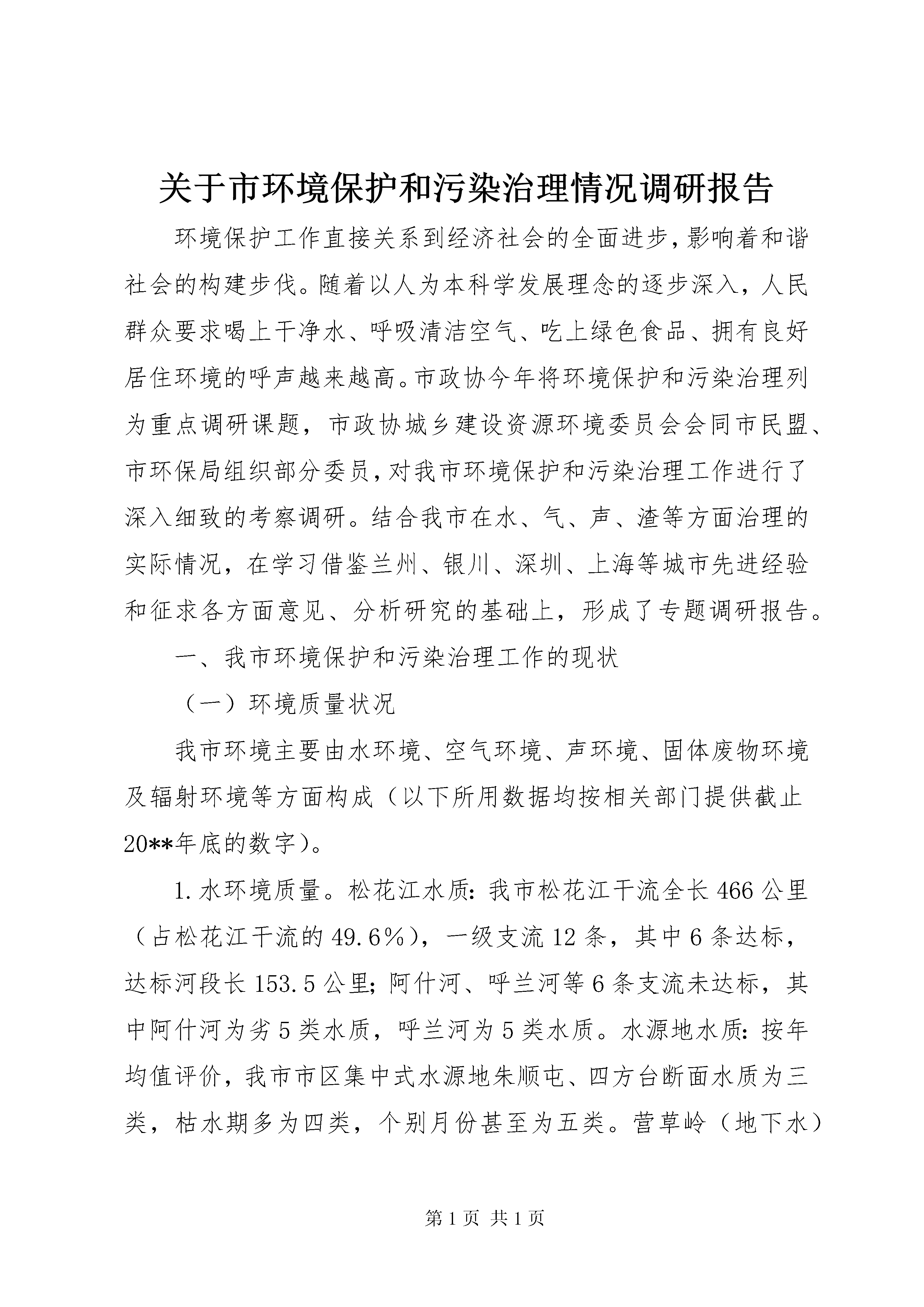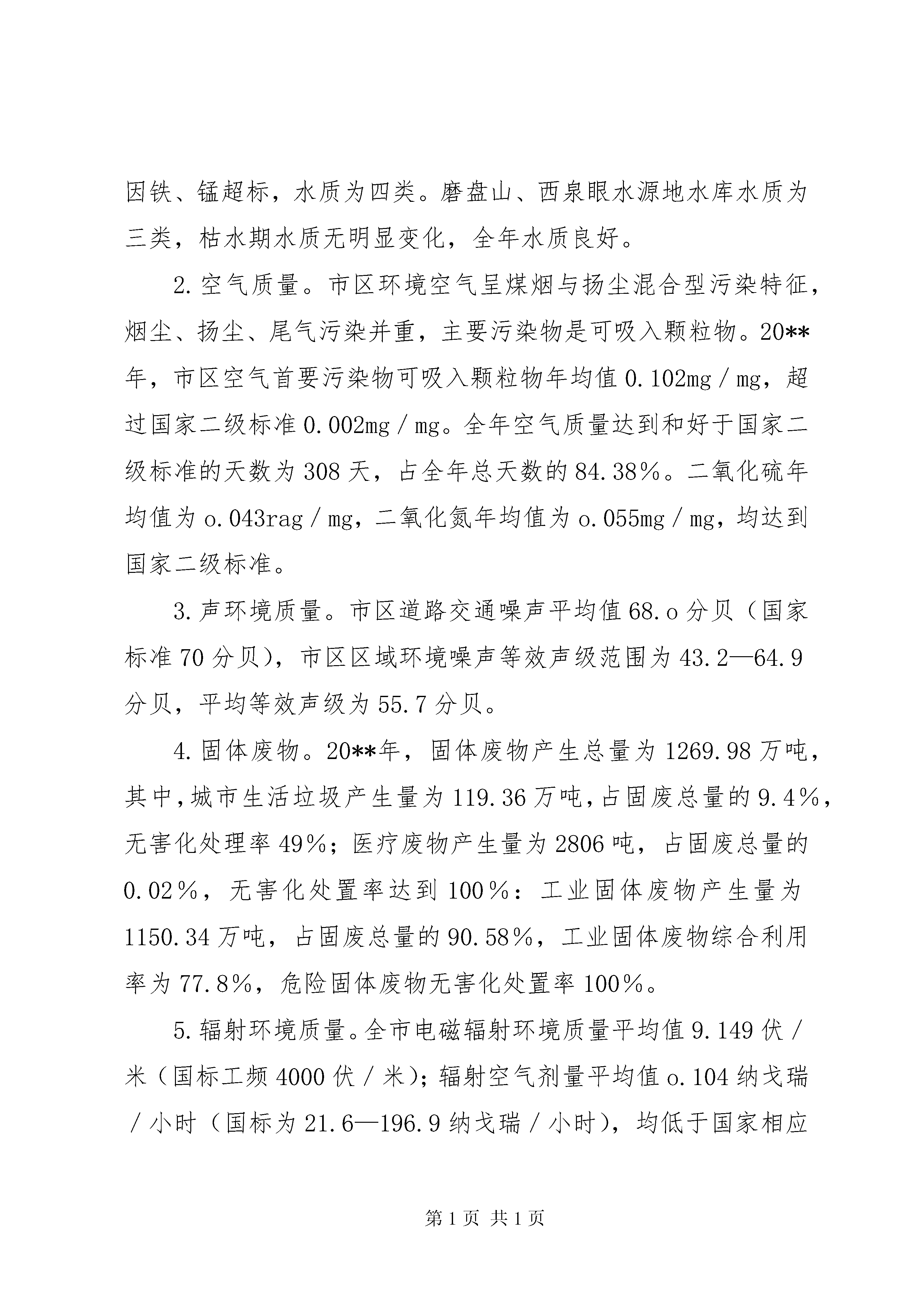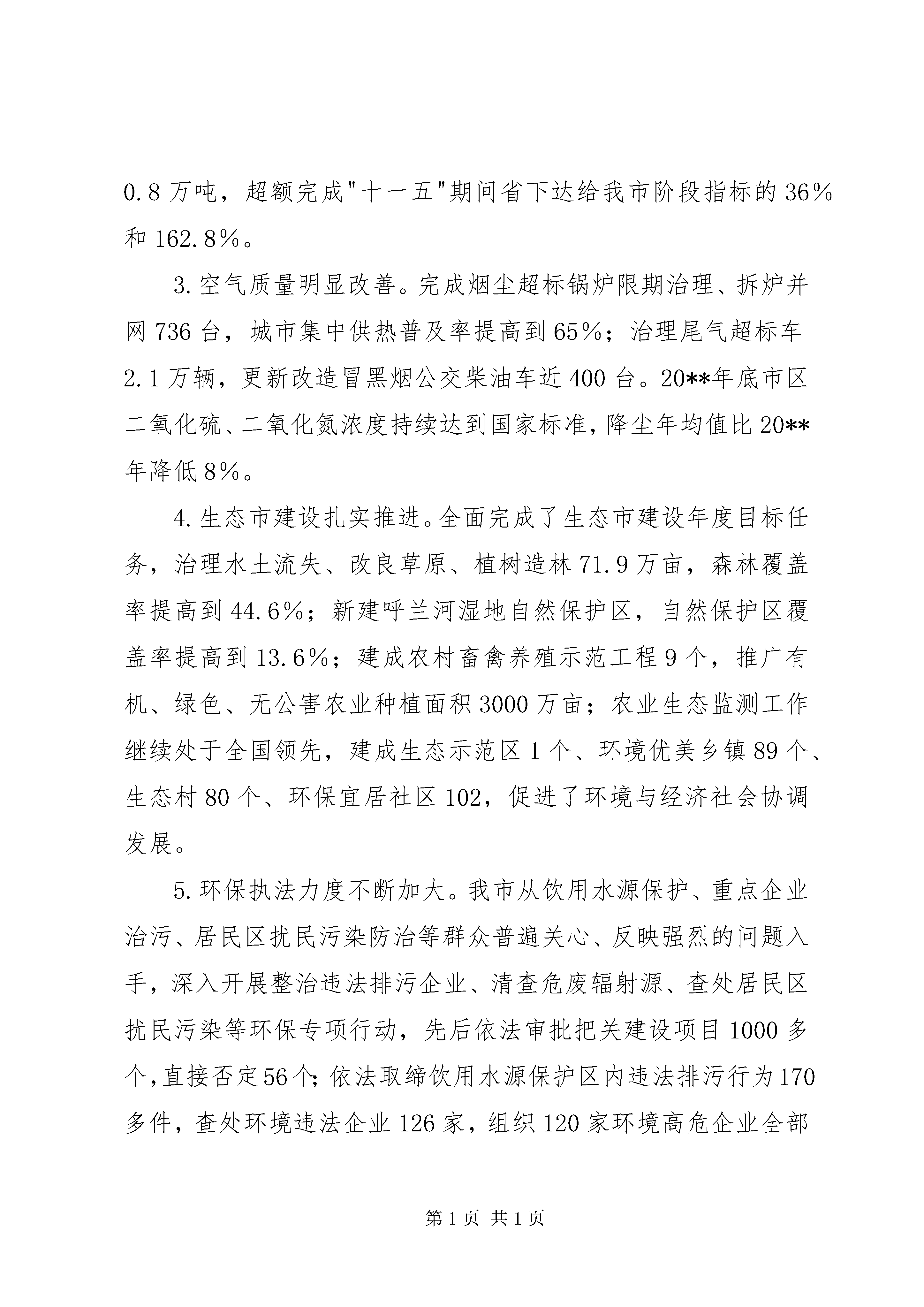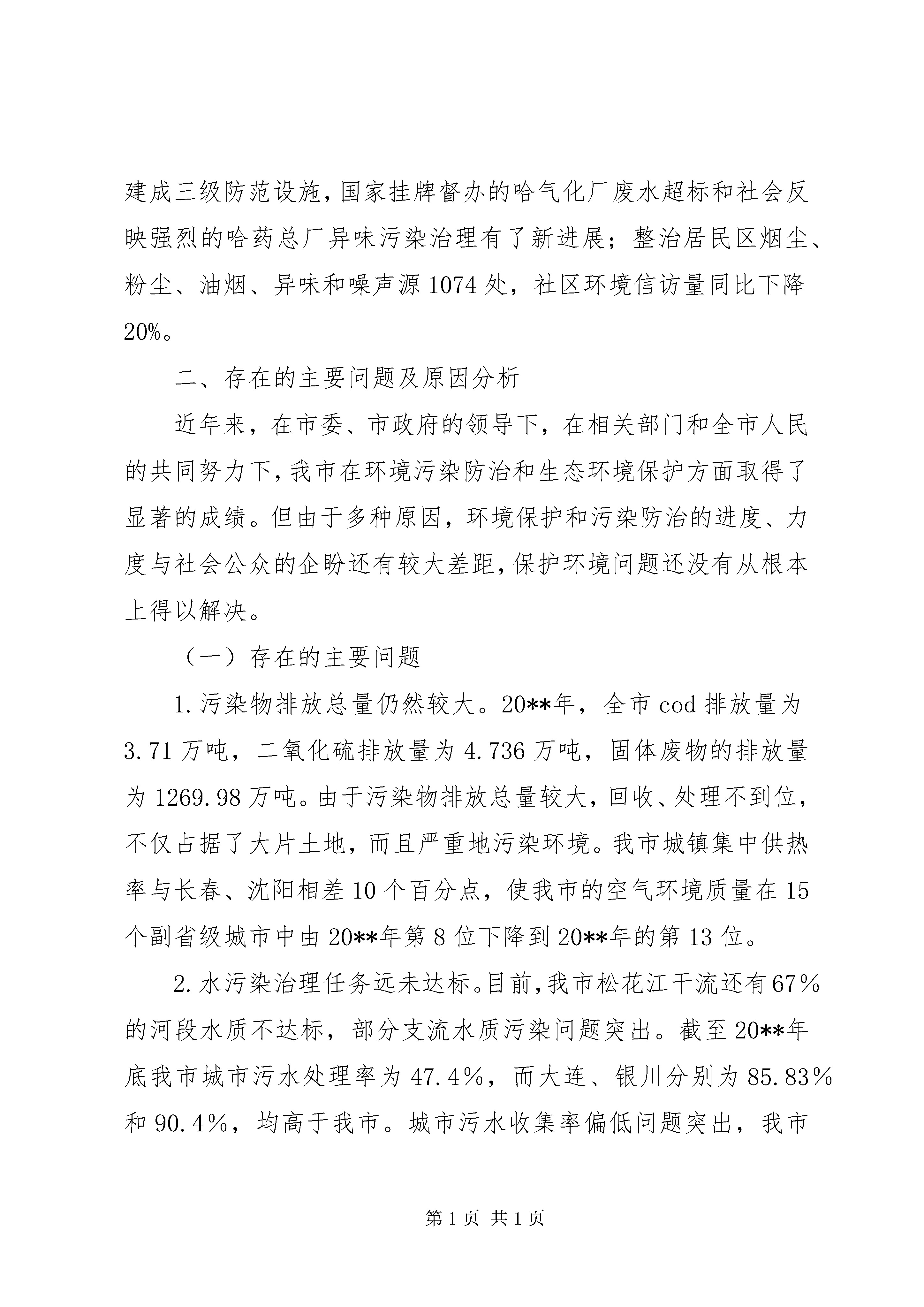 关于市环境保护和污染治理情况调研报告环境保护工作直接关系到经济社会的全面进步,影响着和谐社会的构建步伐。随着以人为本科学发展理念的逐步深入,人民群众要求喝上干净水、呼吸清洁空气、吃上绿色食品、拥有良好居住环境的呼声越来越高。市政协今年将环境保护和污染治理列为重点调研课题,市政协城乡建设资源环境委员会会同市民盟、市环保局组织部分委员,对我市环境保护和污染治理工作进行了深入细致的考察调研。结合我市在水、气、声、渣等方面治理的实际情况,在学习借鉴兰州、银川、深圳、上海等城市先进经验和征求各方面意见、分析研究的基础上,形成了专题调研报告。一、我市环境保护和污染治理工作的现状(一)环境质量状况我市环境主要由水环境、空气环境、声环境、固体废物环境及辐射环境等方面构成(以下所用数据均按相关部门提供截止20**年底的数字)。1.水环境质量。松花江水质:我市松花江干流全长466公里(占松花江干流的49.6%),一级支流12条,其中6条达标,达标河段长153.5公里;阿什河、呼兰河等6条支流未达标,其中阿什河为劣5类水质,呼兰河为5类水质。水源地水质:按年均值评价,我市市区集中式水源地朱顺屯、四方台断面水质为三类,枯水期多为四类,个别月份甚至为五类。营草岭(地下水)因铁、锰超标,水质为四类。磨盘山、西泉眼水源地水库水质为三类,枯水期水质无明显变化,全年水质良好。2.空气质量。市区环境空气呈煤烟与扬尘混合型污染特征,烟尘、扬尘、尾气污染并重,主要污染物是可吸入颗粒物。20**年,市区空气首要污染物可吸入颗粒物年均值0.102mg/mg,超过国家二级标准0.002mg/mg。全年空气质量达到和好于国家二级标准的天数为308天,占全年总天数的84.38%。二氧化硫年均值为o.043rag/mg,二氧化氮年均值为o.055mg/mg,均达到国家二级标准。3.声环境质量。市区道路交通噪声平均值68.o分贝(国家标准70分贝),市区区域环境噪声等效声级范围为43.2—64.9分贝,平均等效声级为55.7分贝。4.固体废物。20**年,固体废物产生总量为1269.98万吨,其中,城市生活垃圾产生量为119.36万吨,占固废总量的9.4%,无害化处理率49%;医疗废物产生量为2806吨,占固废总量的0.02%,无害化处置率达到100%:工业固体废物产生量为1150.34万吨,占固废总量的90.58%,工业固体废物综合利用率为77.8%,危险固体废物无害化处置率100%。5.辐射环境质量。全市电磁辐射环境质量平均值9.149伏/米(国标工频4000伏/米);辐射空气剂量平均值o.104纳戈瑞/小时(国标为21.6—196.9纳戈瑞/小时),均低于国家相应标难,辐射环境处于安全受控状态。(二)"十一五"环保目标完成情况及节能减排的成效几年来,我市不断加大节能减排力度,全面推进"十一五"环保目标任务的落实,取得了积极进展。1.水污染防治取得较大进展。根据国家和省加大松花江水污染治理的举措,将松花江流域治污纳入责任目标考核和重要督办事项,市政府追加安排、先期垫付治污资金5000多万元,按期实现了文昌三期污水处理工程等24个规划项目,开工率100%、投运率50%的考核目标;建成投运松北、集乐等3个规划外污水集中处理厂项目,城镇污水处理能力提高到3.2万吨/日,新增重点企业污水处理设施46套,全市重点工业企业、医院废水排放达标。通过以上措施,我市松花江干支流25个主要监控断面水质达到国家一至三类优良标准的比例提高50%,市区、市域出境水质中主要污染指标同比降低9.79/5和39/5,流域水环境质量得到改善。2.超额完成污染减排阶段考核指标。市政府将污染减排约束性指标全部纳入各地目标考核,出台了减排监测、统计、考核办法,完成污水集中处理、水污染源治理、锅炉机组脱硫、清洁能源替代等重点减排工程49个,淘汰落后产能35家,在全市国民经济年增长幅度超过13%的情况下,水、气主要污染物排放总量持续保持"双下降",累计削减化学需氧量1.2万吨、二氧化硫0.8万吨,超额完成"十一五"期间省下达给我市阶段指标的36%和162.8%。3.空气质量明显改善。完成烟尘超标锅炉限期治理、拆炉并网736台,城市集中供热普及率提高到65%;治理尾气超标车2.1万辆,更新改造冒黑烟公交柴油车近400台。20**年底市区二氧化硫、二氧化氮浓度持续达到国家标准,降尘年均值比20**年降低8%。4.生态市建设扎实推进。全面完成了生态市建设年度目标任务,治理水土流失、改良草原、植树造林71.9万亩,森林覆盖率提高到44.6%;新建呼兰河湿地自然保护区,自然保护区覆盖率提高到13.6%;建成农村畜禽养殖示范工程9个,推广有机、绿色、无公害农业种植面积3000万亩;农业生态监测工作继续处于