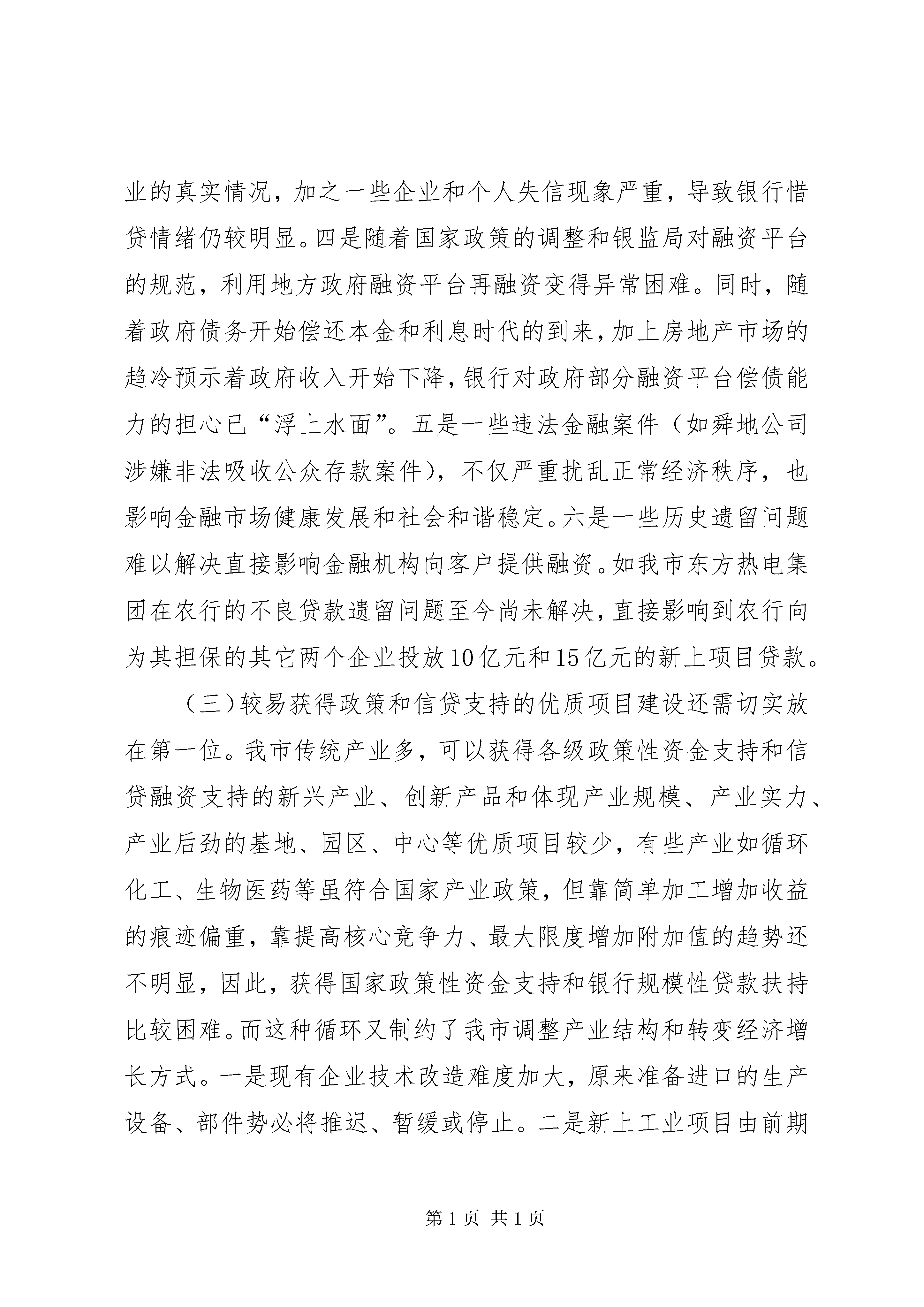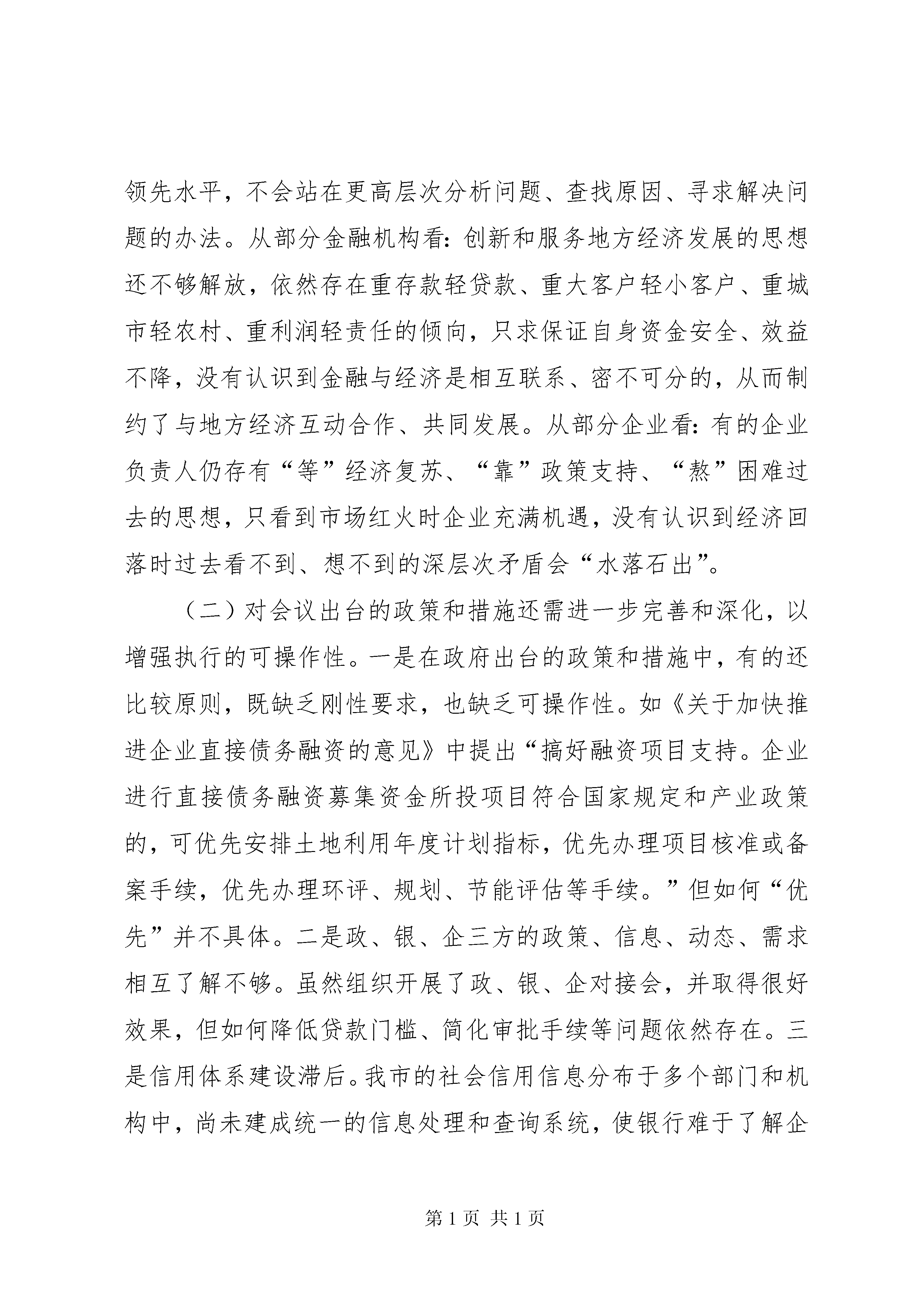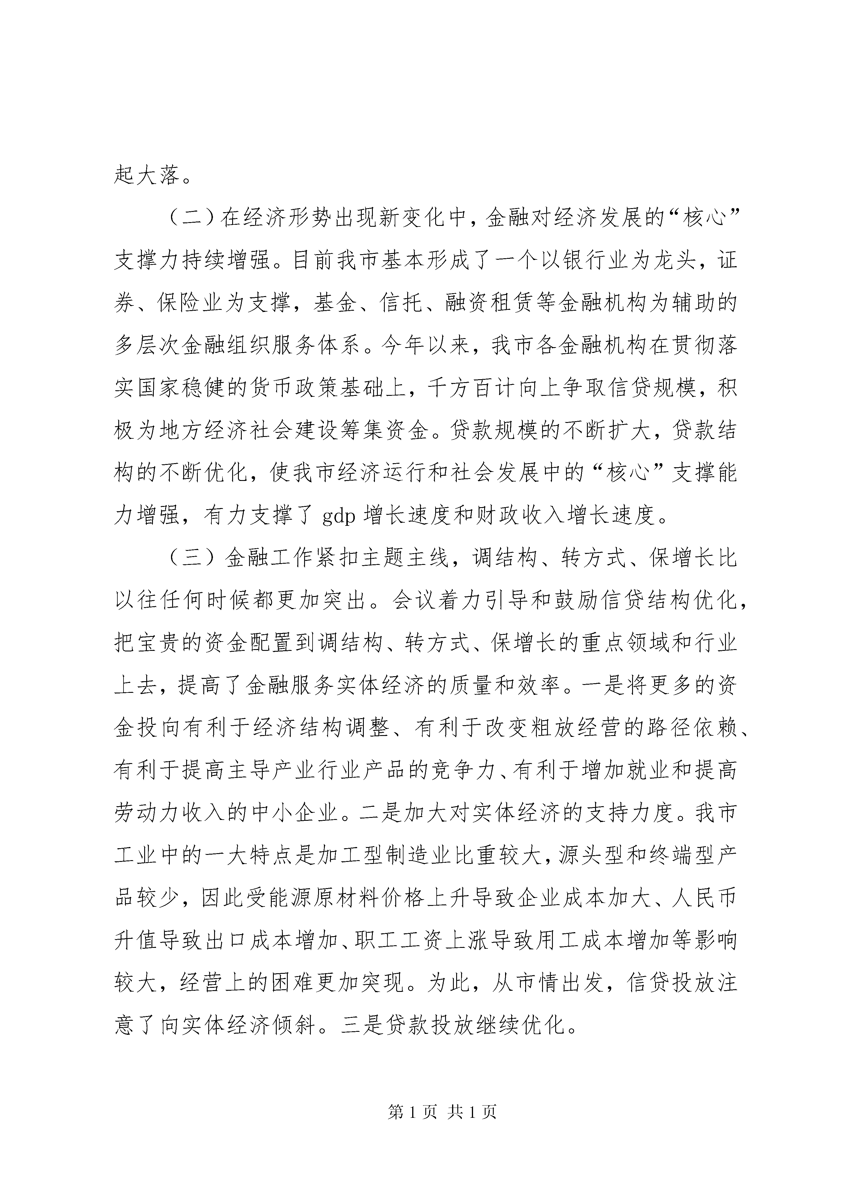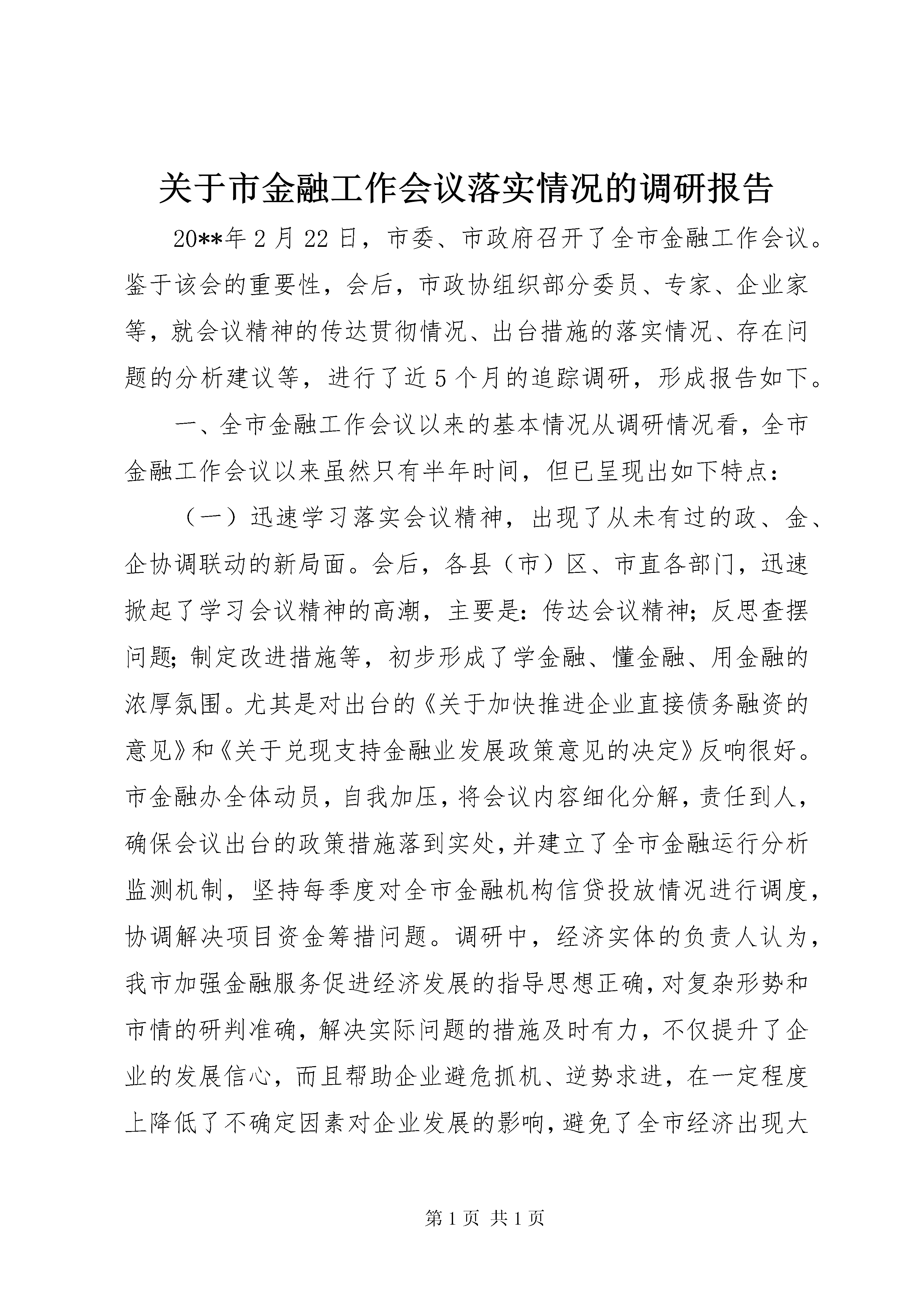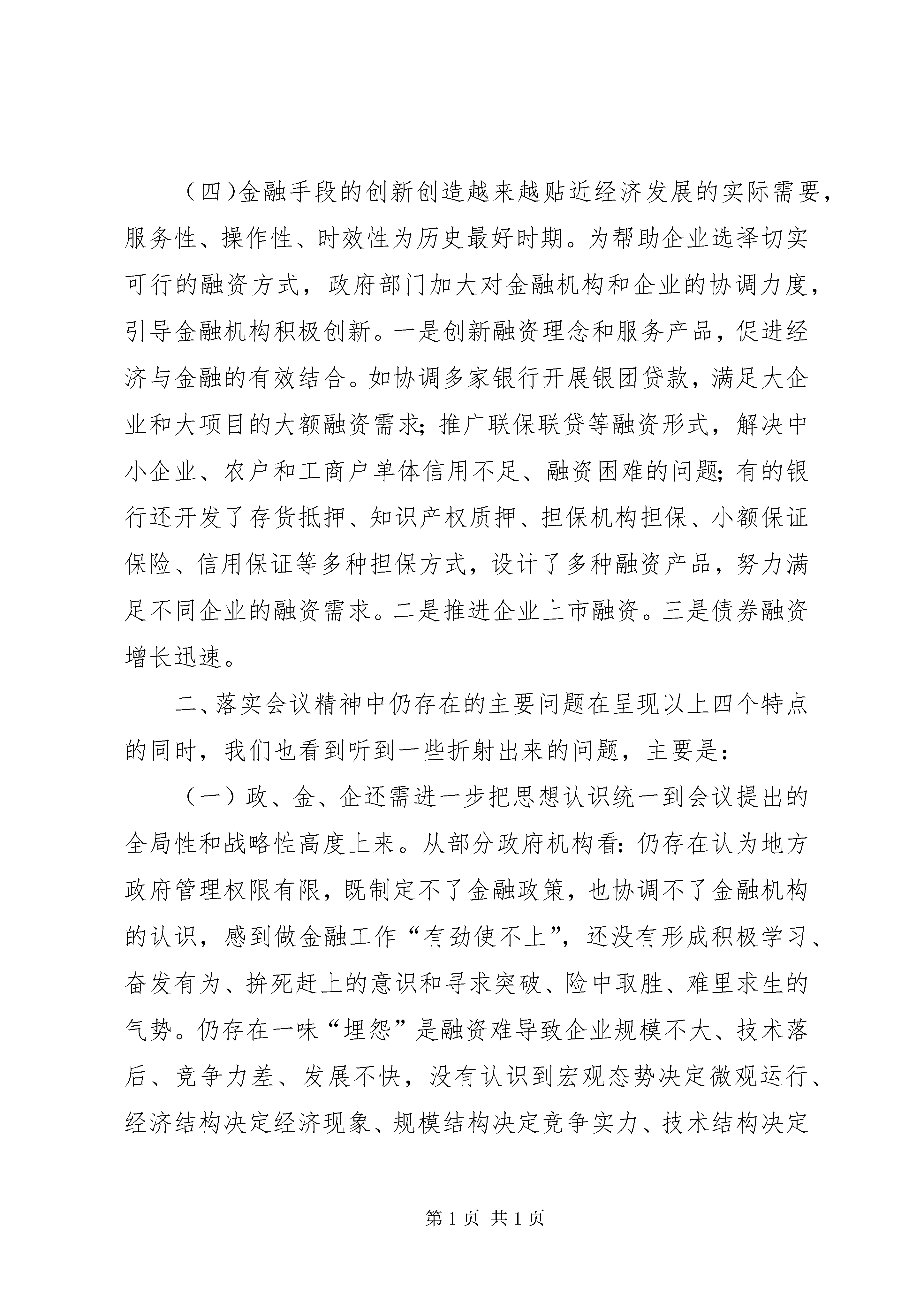 关于市金融工作会议落实情况的调研报告20**年2月22日,市委、市政府召开了全市金融工作会议。鉴于该会的重要性,会后,市政协组织部分委员、专家、企业家等,就会议精神的传达贯彻情况、出台措施的落实情况、存在问题的分析建议等,进行了近5个月的追踪调研,形成报告如下。一、全市金融工作会议以来的基本情况从调研情况看,全市金融工作会议以来虽然只有半年时间,但已呈现出如下特点:(一)迅速学习落实会议精神,出现了从未有过的政、金、企协调联动的新局面。会后,各县(市)区、市直各部门,迅速掀起了学习会议精神的高潮,主要是:传达会议精神;反思查摆问题;制定改进措施等,初步形成了学金融、懂金融、用金融的浓厚氛围。尤其是对出台的《关于加快推进企业直接债务融资的意见》和《关于兑现支持金融业发展政策意见的决定》反响很好。市金融办全体动员,自我加压,将会议内容细化分解,责任到人,确保会议出台的政策措施落到实处,并建立了全市金融运行分析监测机制,坚持每季度对全市金融机构信贷投放情况进行调度,协调解决项目资金筹措问题。调研中,经济实体的负责人认为,我市加强金融服务促进经济发展的指导思想正确,对复杂形势和市情的研判准确,解决实际问题的措施及时有力,不仅提升了企业的发展信心,而且帮助企业避危抓机、逆势求进,在一定程度上降低了不确定因素对企业发展的影响,避免了全市经济出现大起大落。(二)在经济形势出现新变化中,金融对经济发展的“核心”支撑力持续增强。目前我市基本形成了一个以银行业为龙头,证券、保险业为支撑,基金、信托、融资租赁等金融机构为辅助的多层次金融组织服务体系。今年以来,我市各金融机构在贯彻落实国家稳健的货币政策基础上,千方百计向上争取信贷规模,积极为地方经济社会建设筹集资金。贷款规模的不断扩大,贷款结构的不断优化,使我市经济运行和社会发展中的“核心”支撑能力增强,有力支撑了gdp增长速度和财政收入增长速度。(三)金融工作紧扣主题主线,调结构、转方式、保增长比以往任何时候都更加突出。会议着力引导和鼓励信贷结构优化,把宝贵的资金配置到调结构、转方式、保增长的重点领域和行业上去,提高了金融服务实体经济的质量和效率。一是将更多的资金投向有利于经济结构调整、有利于改变粗放经营的路径依赖、有利于提高主导产业行业产品的竞争力、有利于增加就业和提高劳动力收入的中小企业。二是加大对实体经济的支持力度。我市工业中的一大特点是加工型制造业比重较大,源头型和终端型产品较少,因此受能源原材料价格上升导致企业成本加大、人民币升值导致出口成本增加、职工工资上涨导致用工成本增加等影响较大,经营上的困难更加突现。为此,从市情出发,信贷投放注意了向实体经济倾斜。三是贷款投放继续优化。(四)金融手段的创新创造越来越贴近经济发展的实际需要,服务性、操作性、时效性为历史最好时期。为帮助企业选择切实可行的融资方式,政府部门加大对金融机构和企业的协调力度,引导金融机构积极创新。一是创新融资理念和服务产品,促进经济与金融的有效结合。如协调多家银行开展银团贷款,满足大企业和大项目的大额融资需求;推广联保联贷等融资形式,解决中小企业、农户和工商户单体信用不足、融资困难的问题;有的银行还开发了存货抵押、知识产权质押、担保机构担保、小额保证保险、信用保证等多种担保方式,设计了多种融资产品,努力满足不同企业的融资需求。二是推进企业上市融资。三是债券融资增长迅速。二、落实会议精神中仍存在的主要问题在呈现以上四个特点的同时,我们也看到听到一些折射出来的问题,主要是:(一)政、金、企还需进一步把思想认识统一到会议提出的全局性和战略性高度上来。从部分政府机构看:仍存在认为地方政府管理权限有限,既制定不了金融政策,也协调不了金融机构的认识,感到做金融工作“有劲使不上”,还没有形成积极学习、奋发有为、拚死赶上的意识和寻求突破、险中取胜、难里求生的气势。仍存在一味“埋怨”是融资难导致企业规模不大、技术落后、竞争力差、发展不快,没有认识到宏观态势决定微观运行、经济结构决定经济现象、规模结构决定竞争实力、技术结构决定领先水平,不会站在更高层次分析问题、查找原因、寻求解决问题的办法。从部分金融机构看:创新和服务地方经济发展的思想还不够解放,依然存在重存款轻贷款、重大客户轻小客户、重城市轻农村、重利润轻责任的倾向,只求保证自身资金安全、效益不降,没有认识到金融与经济是相互联系、密不可分的,从而制约了与地方经济互动合作、共同发展。从部分企业看:有的企业负责人仍存有“等”经济复苏、“靠”政策支持、“熬”困难过去的思想,只看到市场红火时企业充满机遇,没有认识到经济回落时过去看不到、想不到的深层次矛盾会“水落石出”。(二)对会议出台的政策和措施还需进一步完善和深化,以增强执行的可操作性。一是在政府出台的政策和措施中,有
