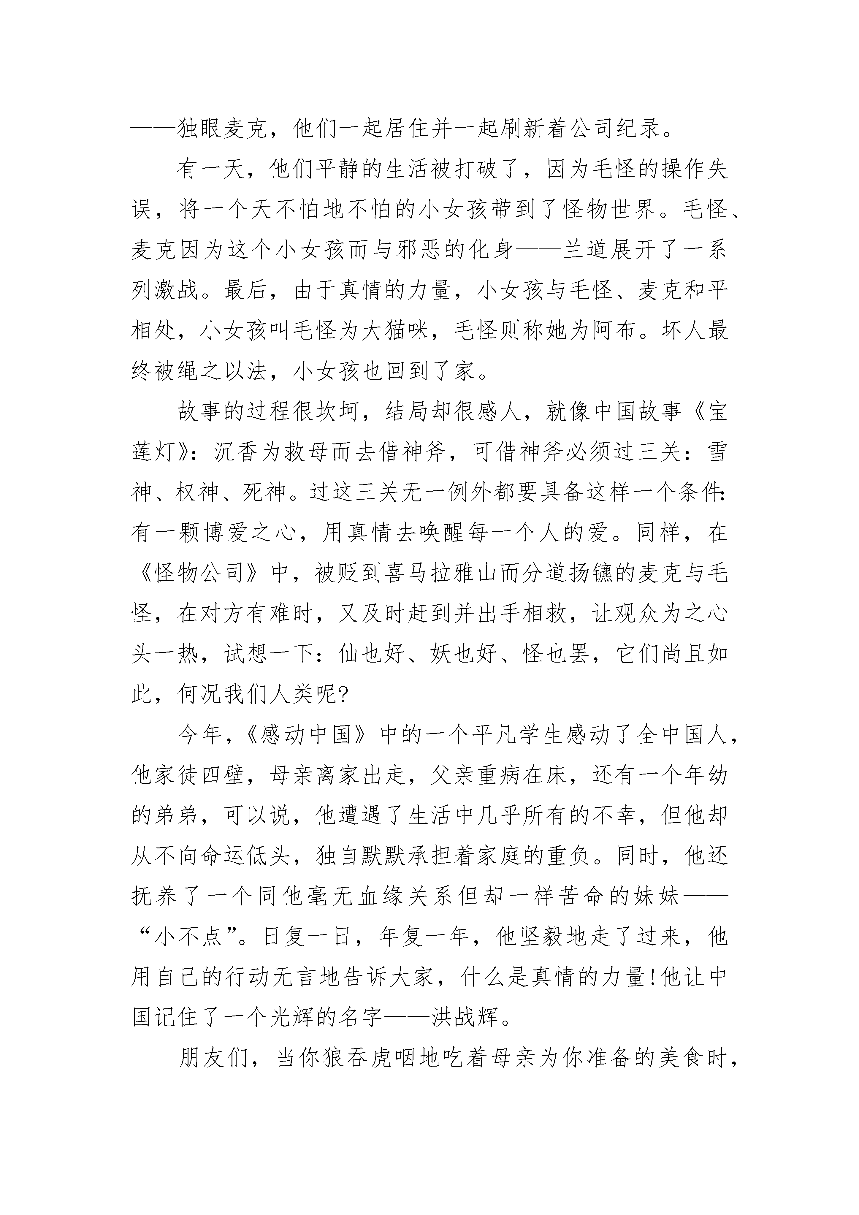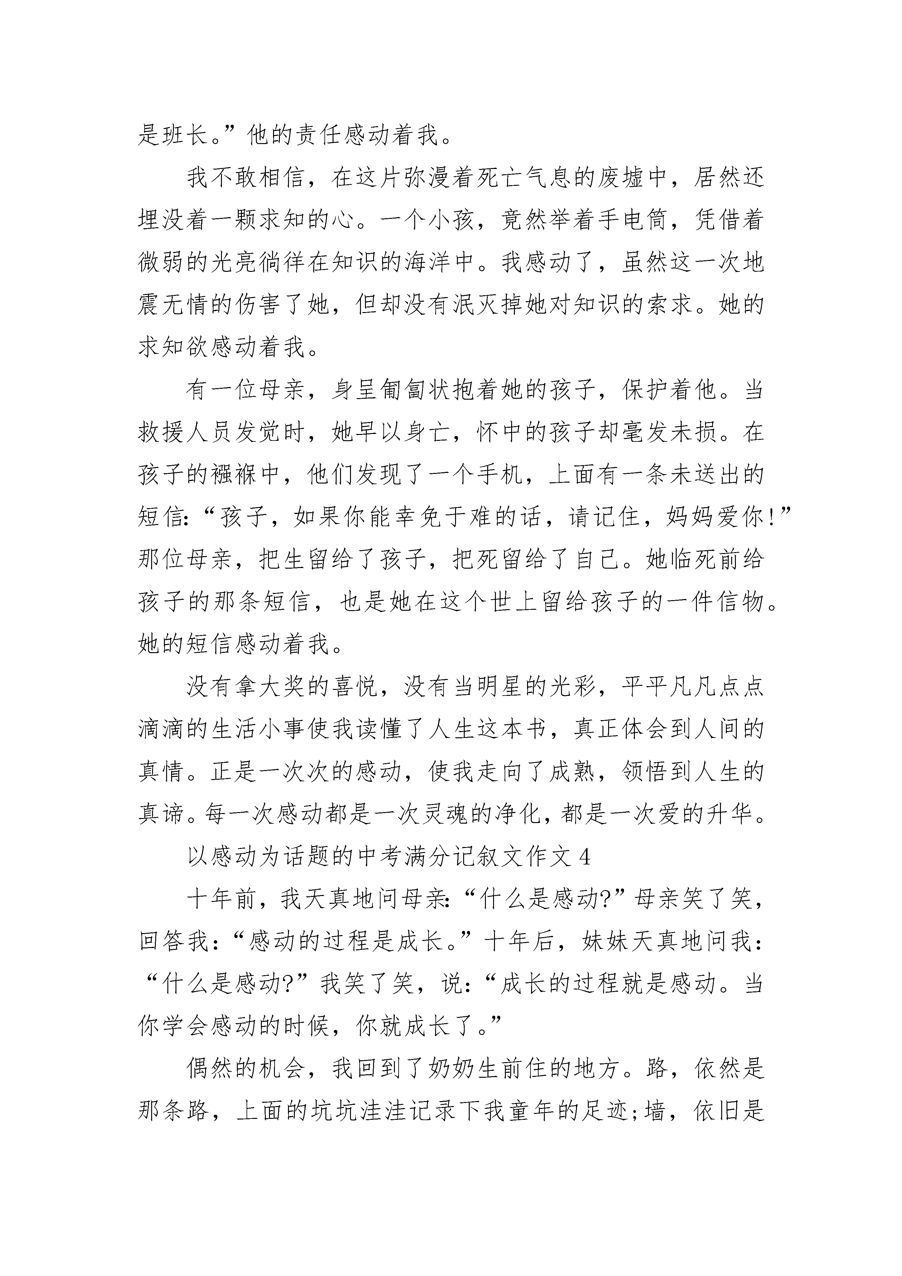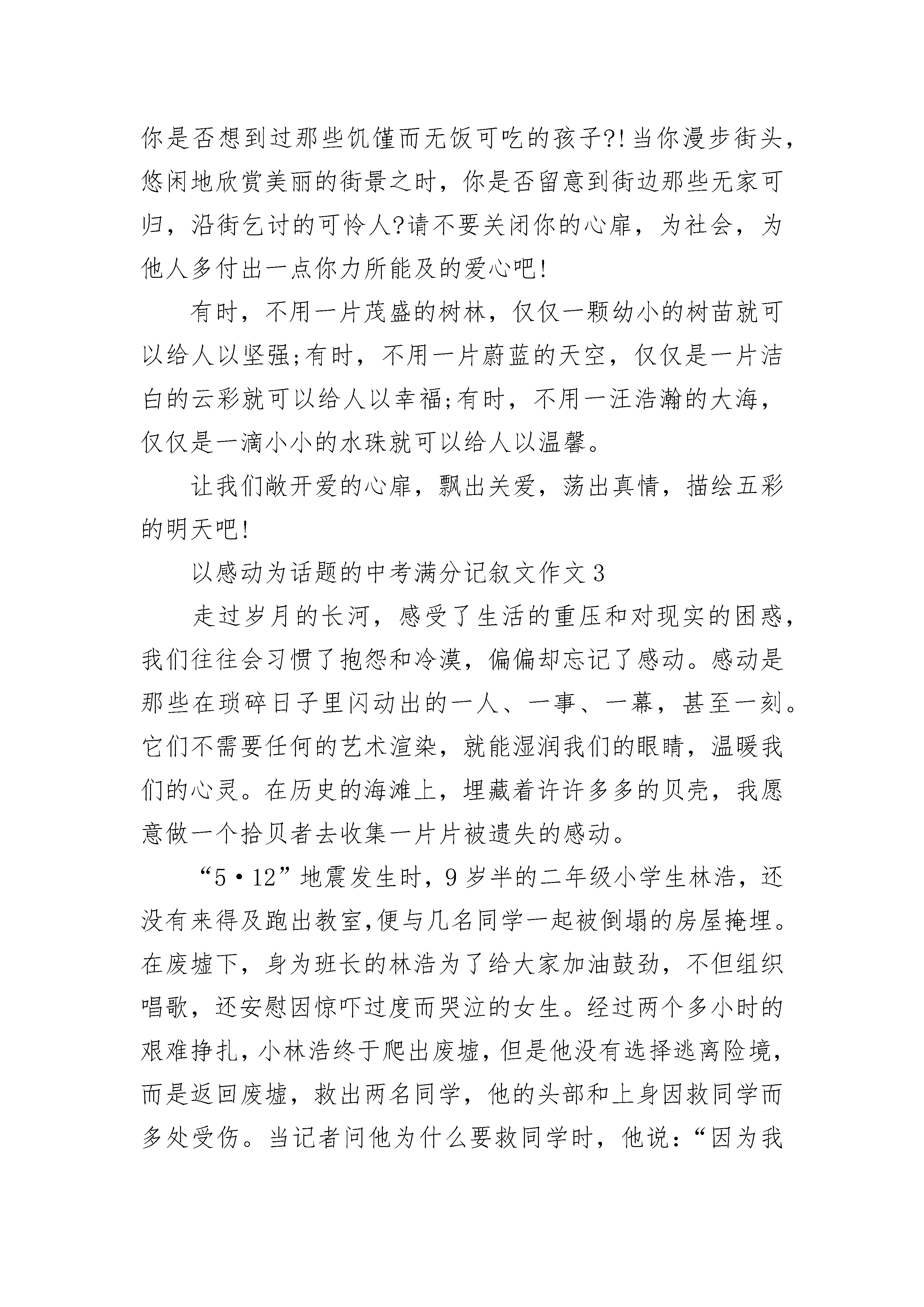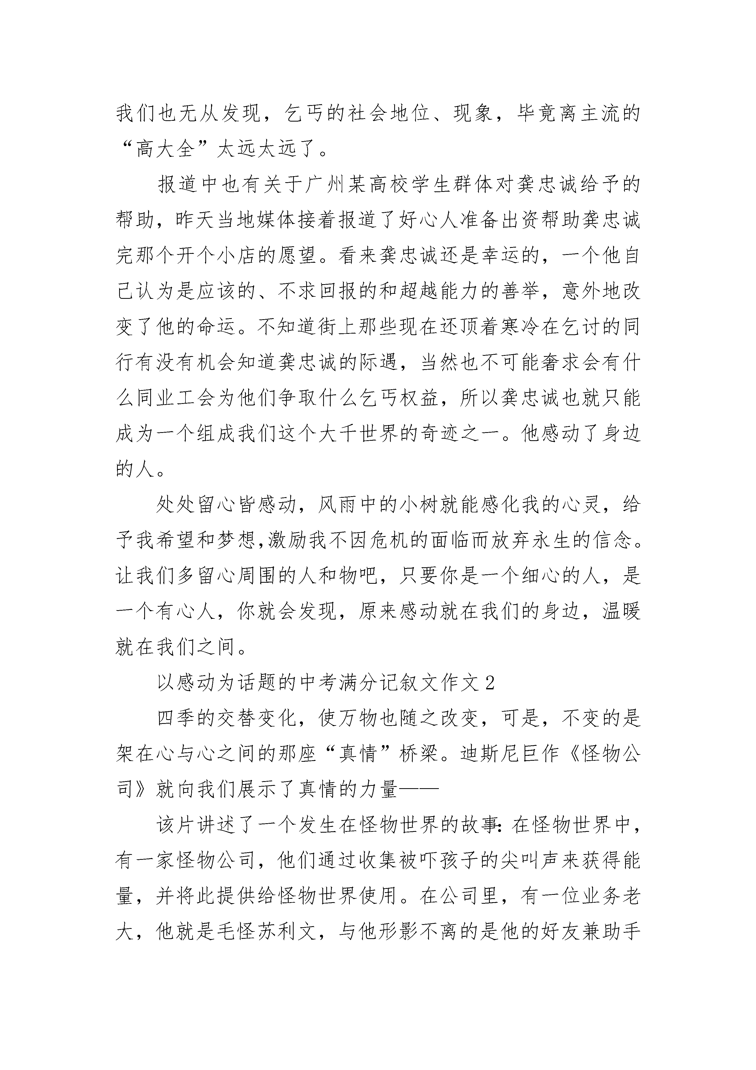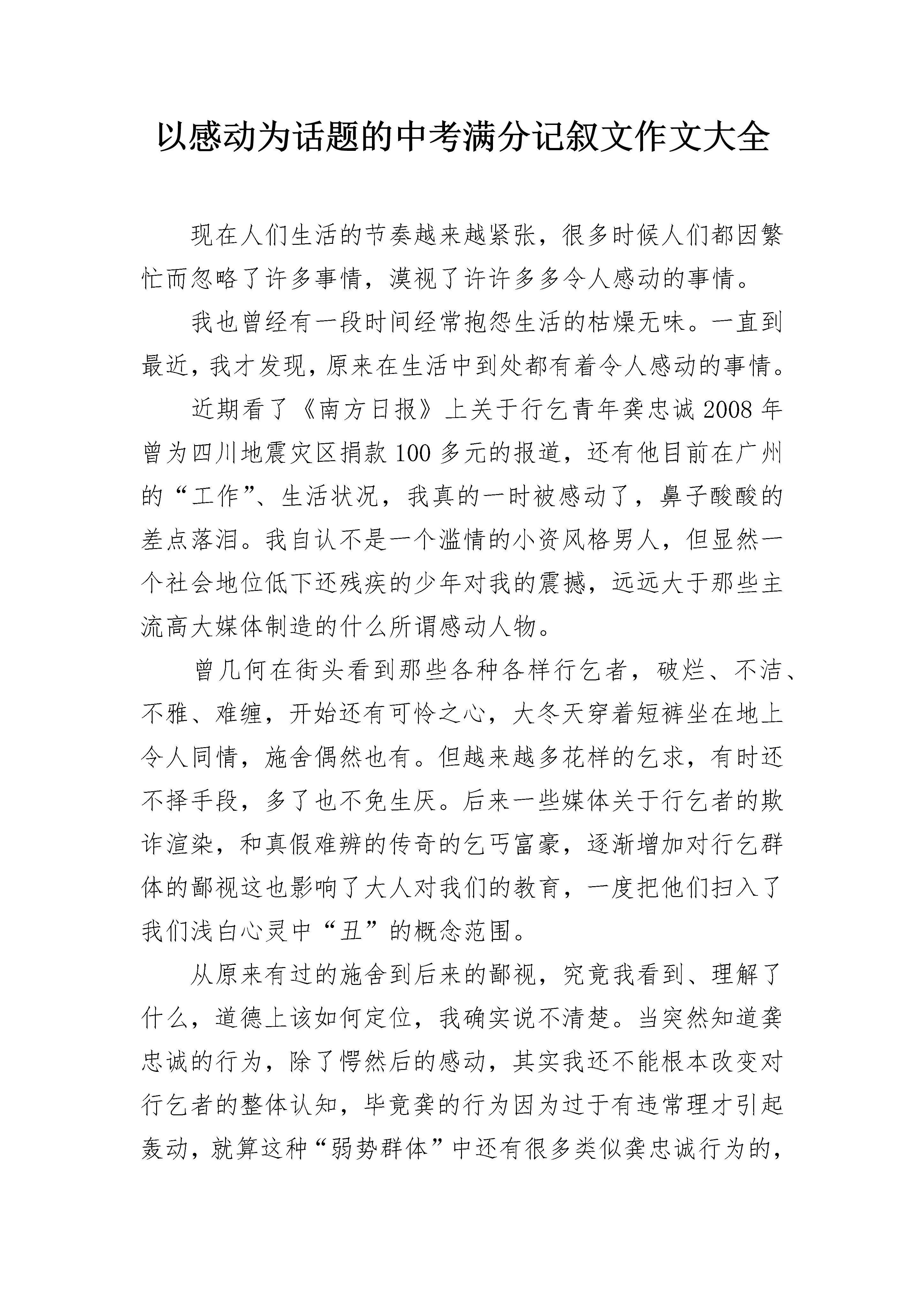 以感动为话题的中考满分记叙文作文大全现在人们生活的节奏越来越紧张,很多时候人们都因繁忙而忽略了许多事情,漠视了许许多多令人感动的事情。我也曾经有一段时间经常抱怨生活的枯燥无味。一直到最近,我才发现,原来在生活中到处都有着令人感动的事情。近期看了《南方日报》上关于行乞青年龚忠诚2008年曾为四川地震灾区捐款100多元的报道,还有他目前在广州的“工作”、生活状况,我真的一时被感动了,鼻子酸酸的差点落泪。我自认不是一个滥情的小资风格男人,但显然一个社会地位低下还残疾的少年对我的震撼,远远大于那些主流高大媒体制造的什么所谓感动人物。曾几何在街头看到那些各种各样行乞者,破烂、不洁、不雅、难缠,开始还有可怜之心,大冬天穿着短裤坐在地上令人同情,施舍偶然也有。但越来越多花样的乞求,有时还不择手段,多了也不免生厌。后来一些媒体关于行乞者的欺诈渲染,和真假难辨的传奇的乞丐富豪,逐渐增加对行乞群体的鄙视这也影响了大人对我们的教育,一度把他们扫入了我们浅白心灵中“丑”的概念范围。从原来有过的施舍到后来的鄙视,究竟我看到、理解了什么,道德上该如何定位,我确实说不清楚。当突然知道龚忠诚的行为,除了愕然后的感动,其实我还不能根本改变对行乞者的整体认知,毕竟龚的行为因为过于有违常理才引起轰动,就算这种“弱势群体”中还有很多类似龚忠诚行为的,我们也无从发现,乞丐的社会地位、现象,毕竟离主流的“高大全”太远太远了。报道中也有关于广州某高校学生群体对龚忠诚给予的帮助,昨天当地媒体接着报道了好心人准备出资帮助龚忠诚完那个开个小店的愿望。看来龚忠诚还是幸运的,一个他自己认为是应该的、不求回报的和超越能力的善举,意外地改变了他的命运。不知道街上那些现在还顶着寒冷在乞讨的同行有没有机会知道龚忠诚的际遇,当然也不可能奢求会有什么同业工会为他们争取什么乞丐权益,所以龚忠诚也就只能成为一个组成我们这个大千世界的奇迹之一。他感动了身边的人。处处留心皆感动,风雨中的小树就能感化我的心灵,给予我希望和梦想,激励我不因危机的面临而放弃永生的信念。让我们多留心周围的人和物吧,只要你是一个细心的人,是一个有心人,你就会发现,原来感动就在我们的身边,温暖就在我们之间。以感动为话题的中考满分记叙文作文2四季的交替变化,使万物也随之改变,可是,不变的是架在心与心之间的那座“真情”桥梁。迪斯尼巨作《怪物公司》就向我们展示了真情的力量——该片讲述了一个发生在怪物世界的故事:在怪物世界中,有一家怪物公司,他们通过收集被吓孩子的尖叫声来获得能量,并将此提供给怪物世界使用。在公司里,有一位业务老大,他就是毛怪苏利文,与他形影不离的是他的好友兼助手——独眼麦克,他们一起居住并一起刷新着公司纪录。有一天,他们平静的生活被打破了,因为毛怪的操作失误,将一个天不怕地不怕的小女孩带到了怪物世界。毛怪、麦克因为这个小女孩而与邪恶的化身——兰道展开了一系列激战。最后,由于真情的力量,小女孩与毛怪、麦克和平相处,小女孩叫毛怪为大猫咪,毛怪则称她为阿布。坏人最终被绳之以法,小女孩也回到了家。故事的过程很坎坷,结局却很感人,就像中国故事《宝莲灯》:沉香为救母而去借神斧,可借神斧必须过三关:雪神、权神、死神。过这三关无一例外都要具备这样一个条件:有一颗博爱之心,用真情去唤醒每一个人的爱。同样,在《怪物公司》中,被贬到喜马拉雅山而分道扬镳的麦克与毛怪,在对方有难时,又及时赶到并出手相救,让观众为之心头一热,试想一下:仙也好、妖也好、怪也罢,它们尚且如此,何况我们人类呢?今年,《感动中国》中的一个平凡学生感动了全中国人,他家徒四壁,母亲离家出走,父亲重病在床,还有一个年幼的弟弟,可以说,他遭遇了生活中几乎所有的不幸,但他却从不向命运低头,独自默默承担着家庭的重负。同时,他还抚养了一个同他毫无血缘关系但却一样苦命的妹妹——“小不点”。日复一日,年复一年,他坚毅地走了过来,他用自己的行动无言地告诉大家,什么是真情的力量!他让中国记住了一个光辉的名字——洪战辉。朋友们,当你狼吞虎咽地吃着母亲为你准备的美食时,你是否想到过那些饥馑而无饭可吃的孩子?!当你漫步街头,悠闲地欣赏美丽的街景之时,你是否留意到街边那些无家可归,沿街乞讨的可怜人?请不要关闭你的心扉,为社会,为他人多付出一点你力所能及的爱心吧!有时,不用一片茂盛的树林,仅仅一颗幼小的树苗就可以给人以坚强;有时,不用一片蔚蓝的天空,仅仅是一片洁白的云彩就可以给人以幸福;有时,不用一汪浩瀚的大海,仅仅是一滴小小的水珠就可以给人以温馨。让我们敞开爱的心扉,飘出关爱,荡出真情,描绘五彩的明天吧!以感动为话题的中考满分记叙文作文3走过岁月的长河,感受了生活的重压和对现实的困惑,我们往往会习惯了抱怨和冷漠,偏偏却忘记了感动。感动是那些在琐碎日子里闪动出的一人、一事、一幕,甚至一刻。它们不需