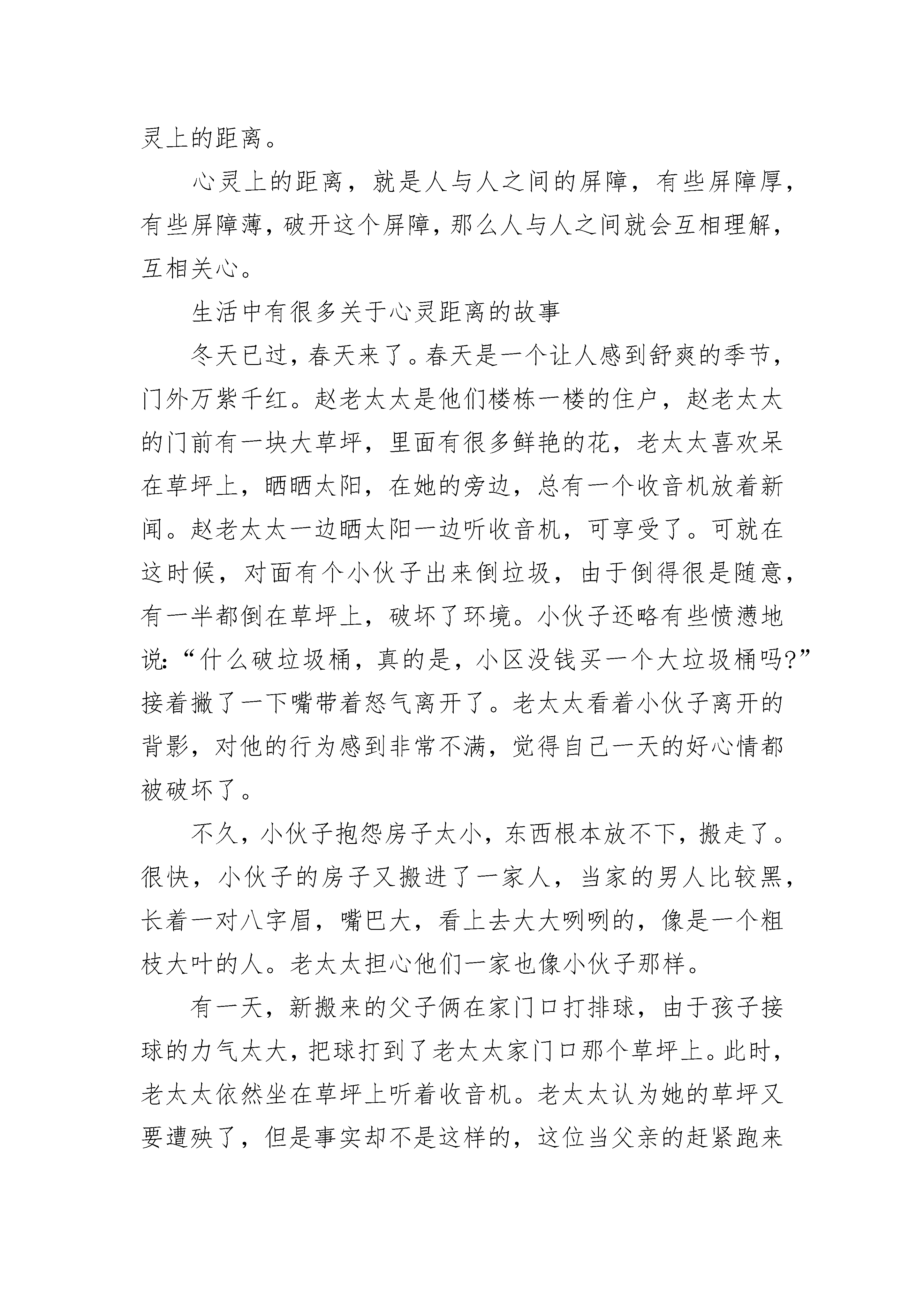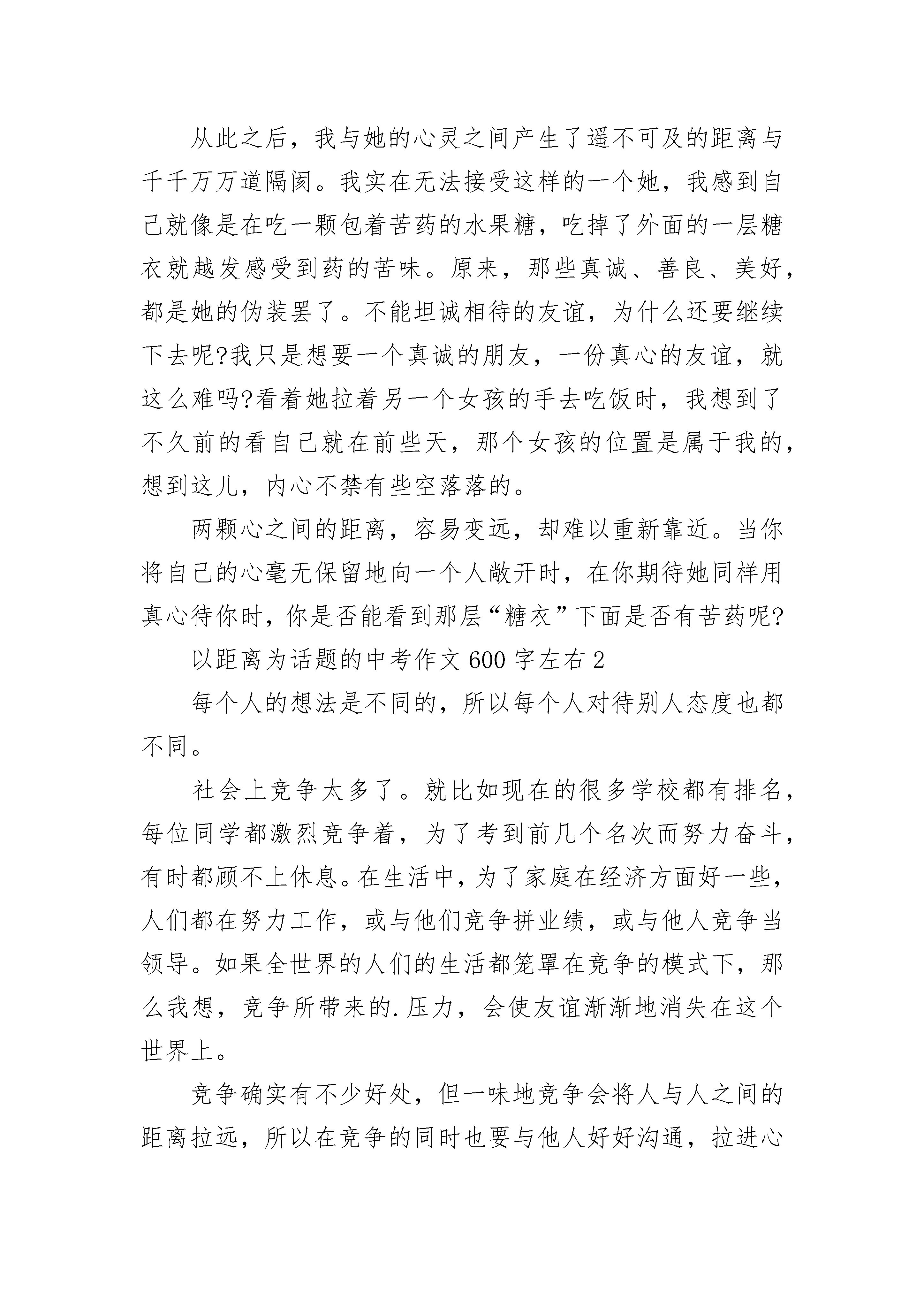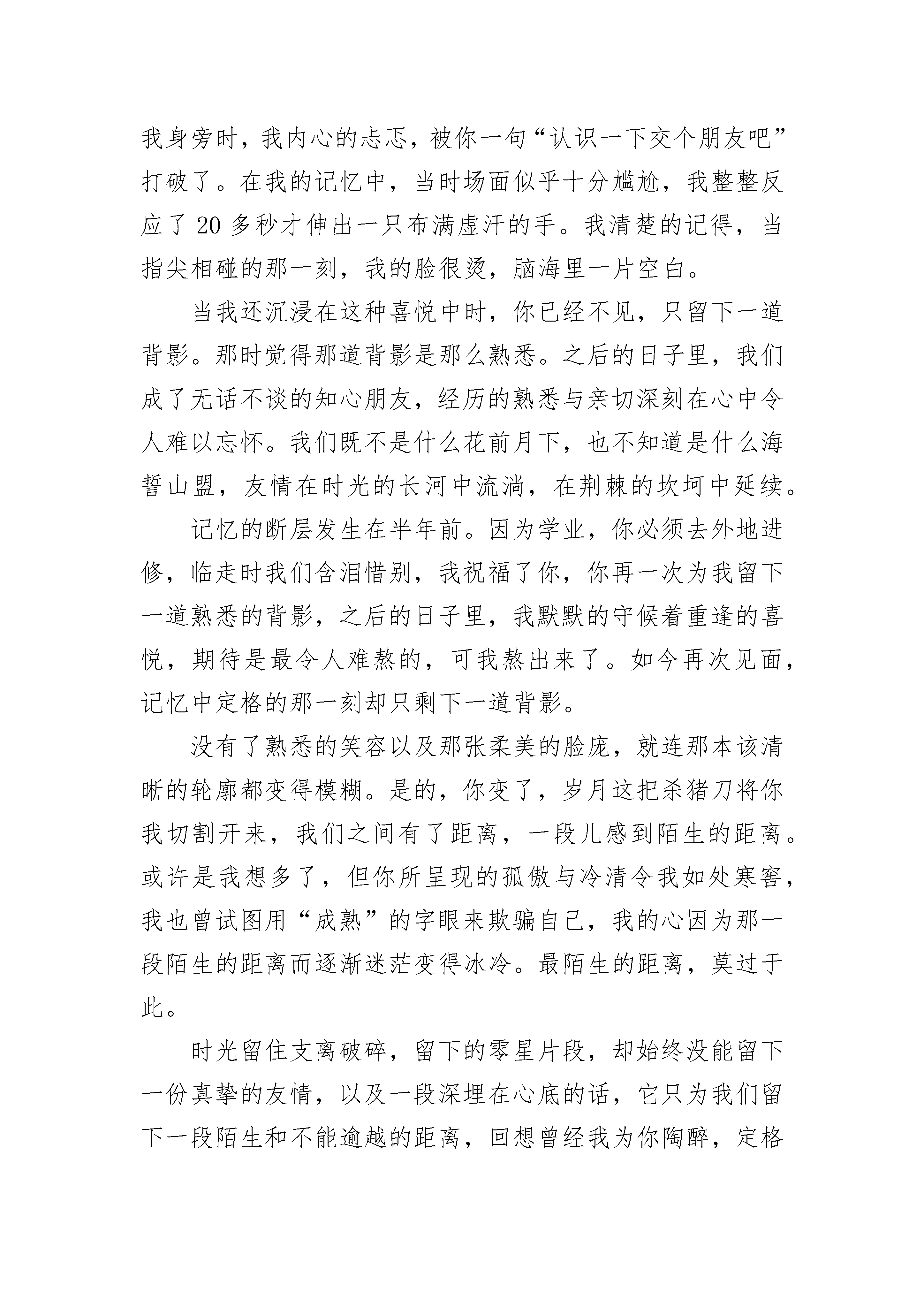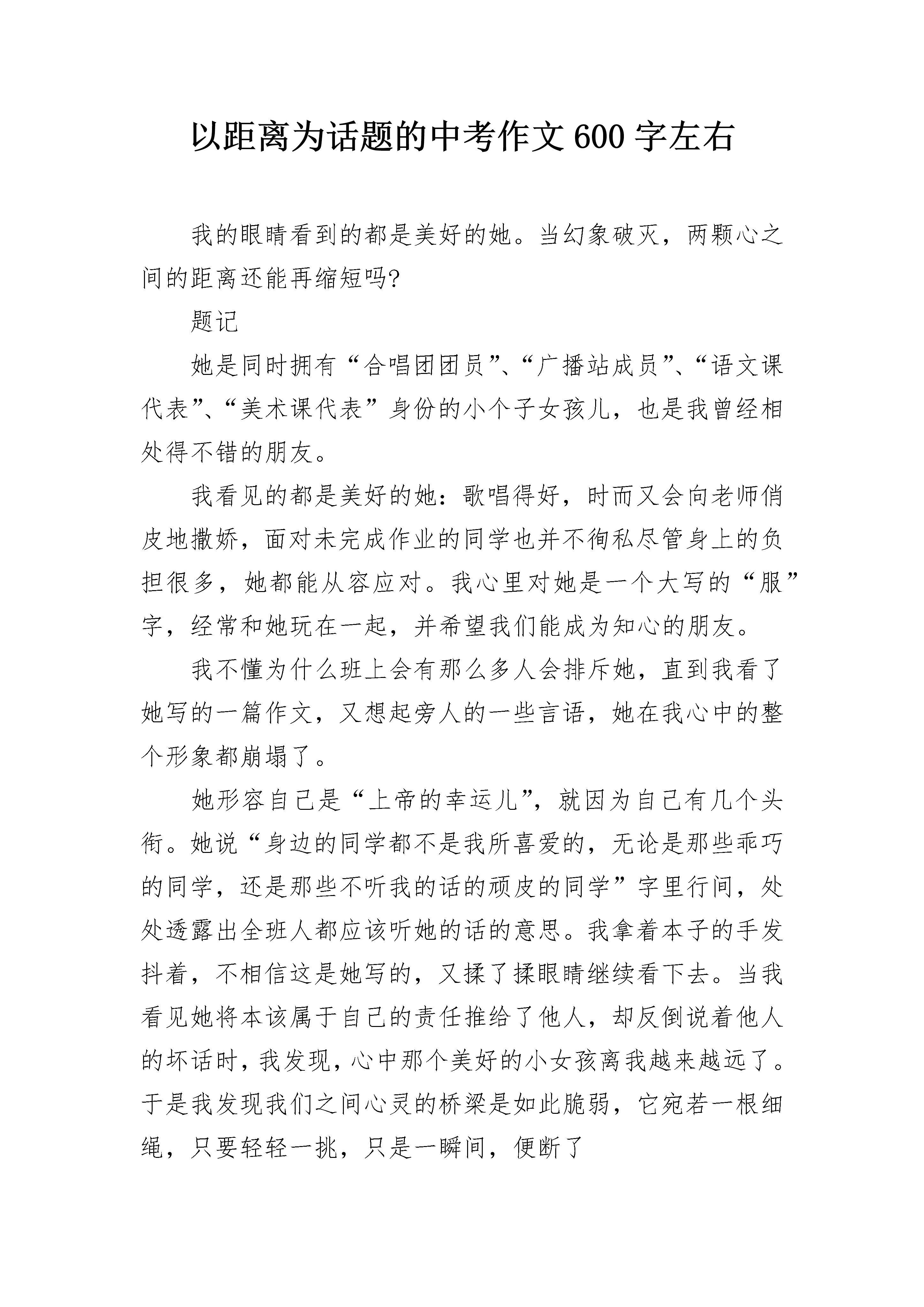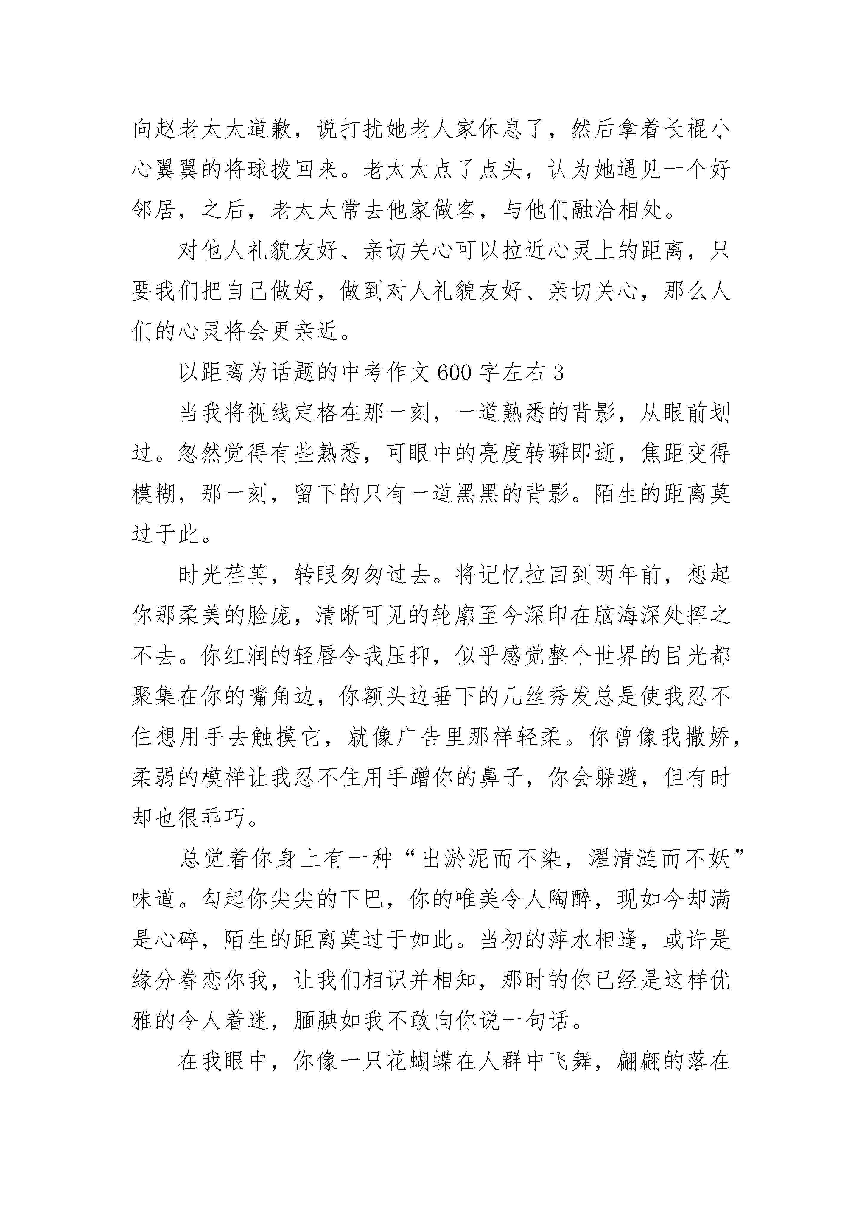 以距离为话题的中考作文600字左右我的眼睛看到的都是美好的她。当幻象破灭,两颗心之间的距离还能再缩短吗?题记她是同时拥有“合唱团团员”、“广播站成员”、“语文课代表”、“美术课代表”身份的小个子女孩儿,也是我曾经相处得不错的朋友。我看见的都是美好的她:歌唱得好,时而又会向老师俏皮地撒娇,面对未完成作业的同学也并不徇私尽管身上的负担很多,她都能从容应对。我心里对她是一个大写的“服”字,经常和她玩在一起,并希望我们能成为知心的朋友。我不懂为什么班上会有那么多人会排斥她,直到我看了她写的一篇作文,又想起旁人的一些言语,她在我心中的整个形象都崩塌了。她形容自己是“上帝的幸运儿”,就因为自己有几个头衔。她说“身边的同学都不是我所喜爱的,无论是那些乖巧的同学,还是那些不听我的话的顽皮的同学”字里行间,处处透露出全班人都应该听她的话的意思。我拿着本子的手发抖着,不相信这是她写的,又揉了揉眼睛继续看下去。当我看见她将本该属于自己的责任推给了他人,却反倒说着他人的坏话时,我发现,心中那个美好的小女孩离我越来越远了。于是我发现我们之间心灵的桥梁是如此脆弱,它宛若一根细绳,只要轻轻一挑,只是一瞬间,便断了从此之后,我与她的心灵之间产生了遥不可及的距离与千千万万道隔阂。我实在无法接受这样的一个她,我感到自己就像是在吃一颗包着苦药的水果糖,吃掉了外面的一层糖衣就越发感受到药的苦味。原来,那些真诚、善良、美好,都是她的伪装罢了。不能坦诚相待的友谊,为什么还要继续下去呢?我只是想要一个真诚的朋友,一份真心的友谊,就这么难吗?看着她拉着另一个女孩的手去吃饭时,我想到了不久前的看自己就在前些天,那个女孩的位置是属于我的,想到这儿,内心不禁有些空落落的。两颗心之间的距离,容易变远,却难以重新靠近。当你将自己的心毫无保留地向一个人敞开时,在你期待她同样用真心待你时,你是否能看到那层“糖衣”下面是否有苦药呢?以距离为话题的中考作文600字左右2每个人的想法是不同的,所以每个人对待别人态度也都不同。社会上竞争太多了。就比如现在的很多学校都有排名,每位同学都激烈竞争着,为了考到前几个名次而努力奋斗,有时都顾不上休息。在生活中,为了家庭在经济方面好一些,人们都在努力工作,或与他们竞争拼业绩,或与他人竞争当领导。如果全世界的人们的生活都笼罩在竞争的模式下,那么我想,竞争所带来的.压力,会使友谊渐渐地消失在这个世界上。竞争确实有不少好处,但一味地竞争会将人与人之间的距离拉远,所以在竞争的同时也要与他人好好沟通,拉进心灵上的距离。心灵上的距离,就是人与人之间的屏障,有些屏障厚,有些屏障薄,破开这个屏障,那么人与人之间就会互相理解,互相关心。生活中有很多关于心灵距离的故事冬天已过,春天来了。春天是一个让人感到舒爽的季节,门外万紫千红。赵老太太是他们楼栋一楼的住户,赵老太太的门前有一块大草坪,里面有很多鲜艳的花,老太太喜欢呆在草坪上,晒晒太阳,在她的旁边,总有一个收音机放着新闻。赵老太太一边晒太阳一边听收音机,可享受了。可就在这时候,对面有个小伙子出来倒垃圾,由于倒得很是随意,有一半都倒在草坪上,破坏了环境。小伙子还略有些愤懑地说:“什么破垃圾桶,真的是,小区没钱买一个大垃圾桶吗?”接着撇了一下嘴带着怒气离开了。老太太看着小伙子离开的背影,对他的行为感到非常不满,觉得自己一天的好心情都被破坏了。不久,小伙子抱怨房子太小,东西根本放不下,搬走了。很快,小伙子的房子又搬进了一家人,当家的男人比较黑,长着一对八字眉,嘴巴大,看上去大大咧咧的,像是一个粗枝大叶的人。老太太担心他们一家也像小伙子那样。有一天,新搬来的父子俩在家门口打排球,由于孩子接球的力气太大,把球打到了老太太家门口那个草坪上。此时,老太太依然坐在草坪上听着收音机。老太太认为她的草坪又要遭殃了,但是事实却不是这样的,这位当父亲的赶紧跑来向赵老太太道歉,说打扰她老人家休息了,然后拿着长棍小心翼翼的将球拨回来。老太太点了点头,认为她遇见一个好邻居,之后,老太太常去他家做客,与他们融洽相处。对他人礼貌友好、亲切关心可以拉近心灵上的距离,只要我们把自己做好,做到对人礼貌友好、亲切关心,那么人们的心灵将会更亲近。以距离为话题的中考作文600字左右3当我将视线定格在那一刻,一道熟悉的背影,从眼前划过。忽然觉得有些熟悉,可眼中的亮度转瞬即逝,焦距变得模糊,那一刻,留下的只有一道黑黑的背影。陌生的距离莫过于此。时光荏苒,转眼匆匆过去。将记忆拉回到两年前,想起你那柔美的脸庞,清晰可见的轮廓至今深印在脑海深处挥之不去。你红润的轻唇令我压抑,似乎感觉整个世界的目光都聚集在你的嘴角边,你额头边垂下的几丝秀发总是使我忍不住想用手去触摸它,就像广告里那样轻柔。你曾像我撒娇,柔弱的模样让我忍不住用手蹭你的鼻子,你会躲避,但有时却也很乖巧。总觉着你身上
