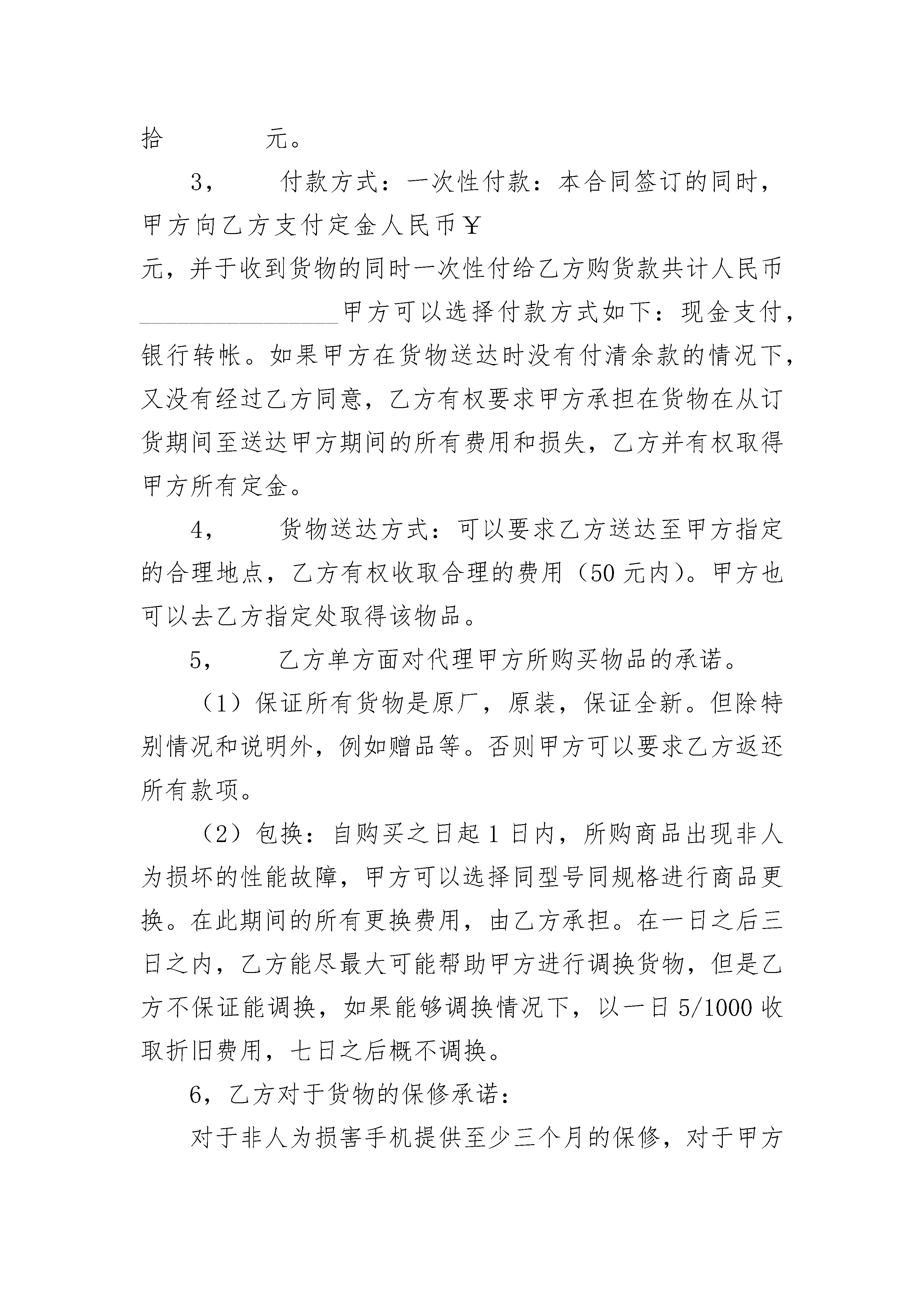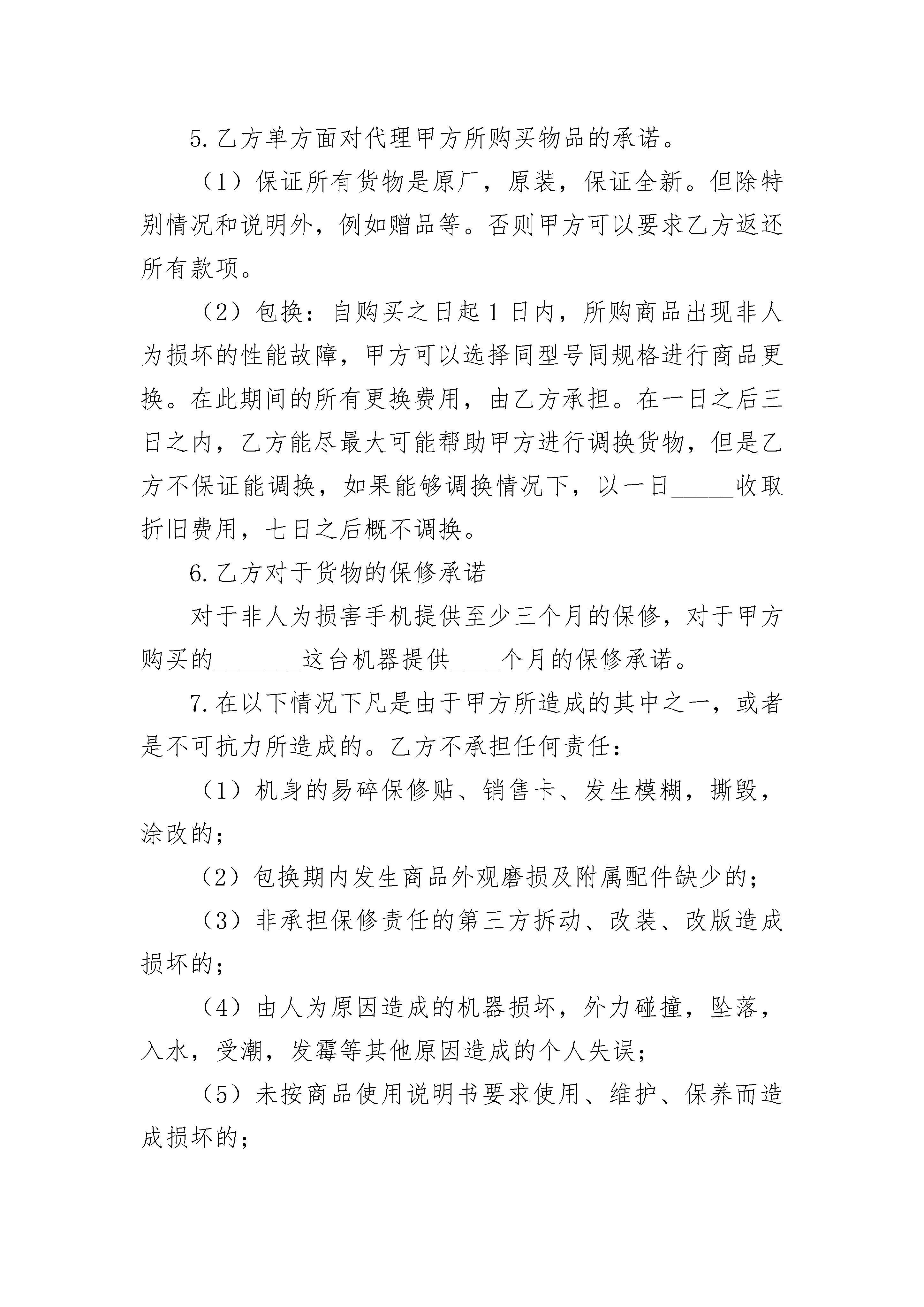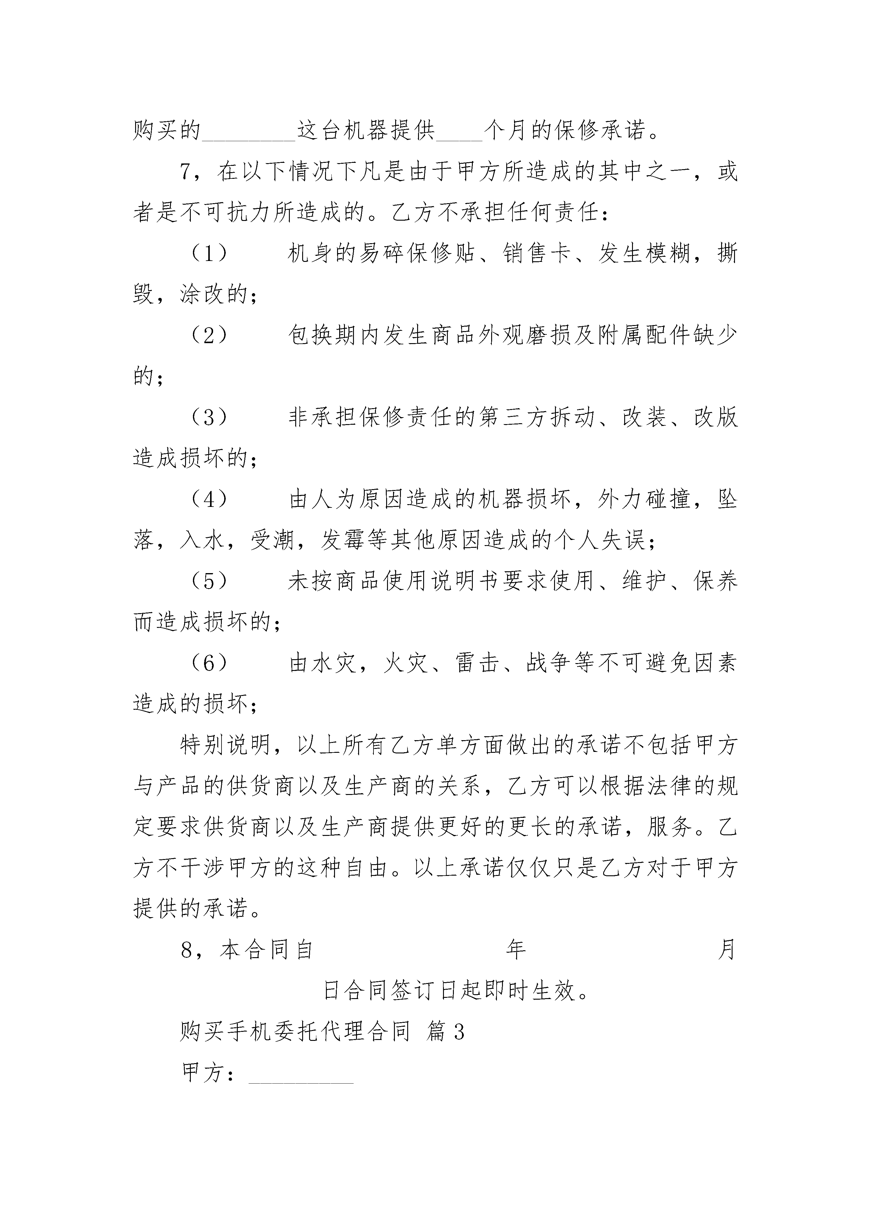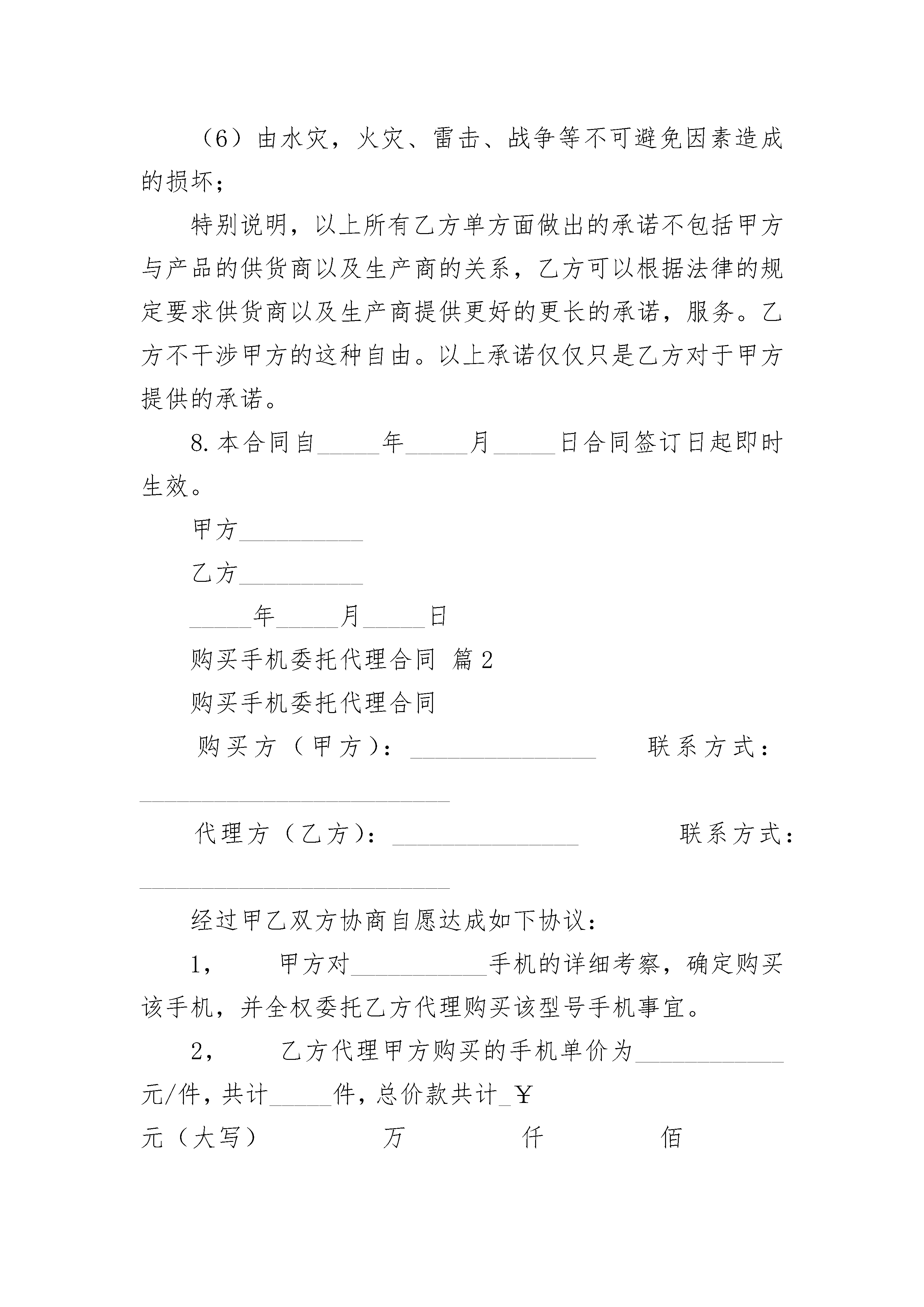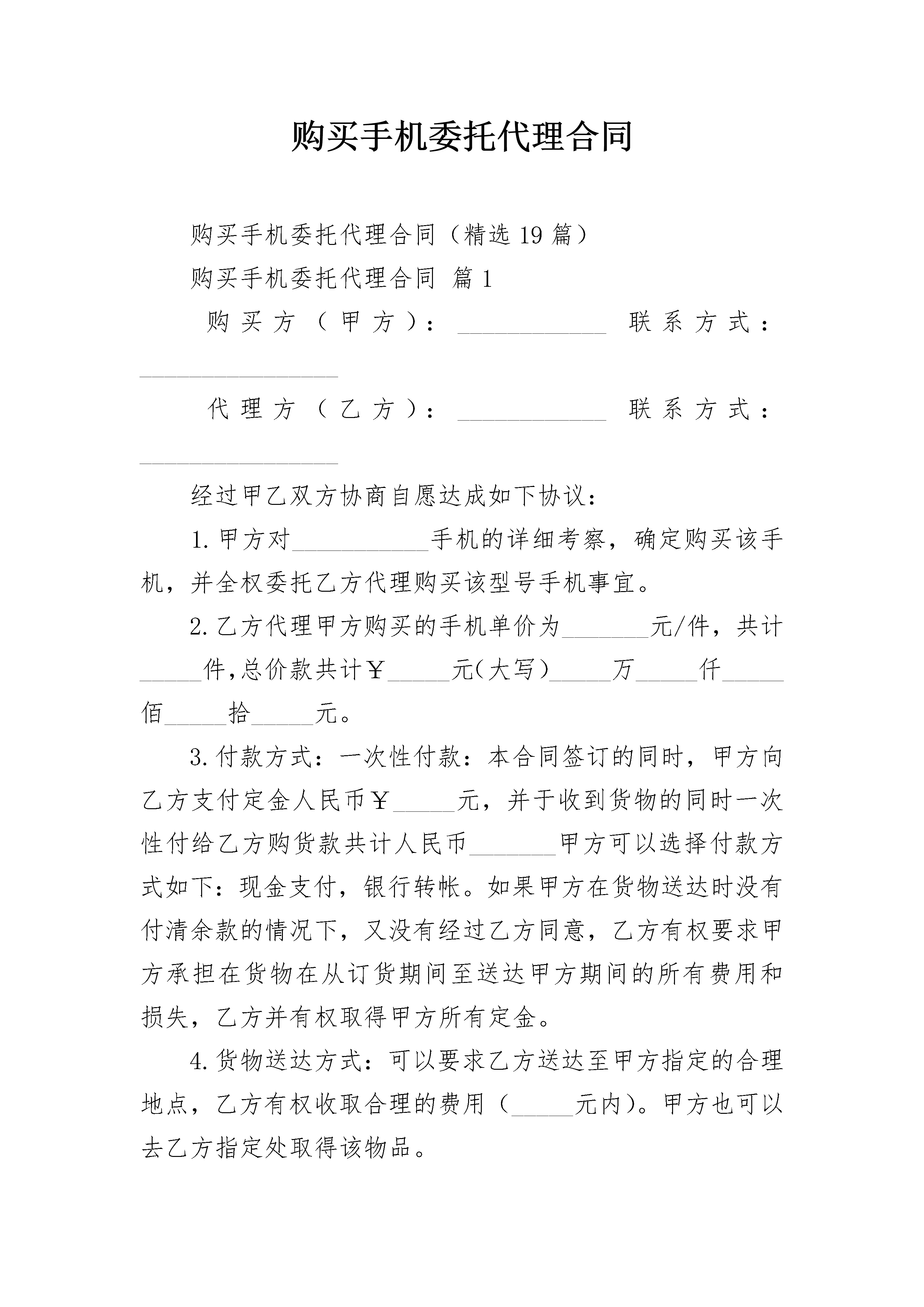 购买手机委托代理合同购买手机委托代理合同(精选19篇)购买手机委托代理合同篇1购买方(甲方):____________联系方式:________________代理方(乙方):____________联系方式:________________经过甲乙双方协商自愿达成如下协议:1.甲方对___________手机的详细考察,确定购买该手机,并全权委托乙方代理购买该型号手机事宜。2.乙方代理甲方购买的手机单价为_______元/件,共计_____件,总价款共计¥_____元(大写)_____万_____仟_____佰_____拾_____元。3.付款方式:一次性付款:本合同签订的同时,甲方向乙方支付定金人民币¥_____元,并于收到货物的同时一次性付给乙方购货款共计人民币_______甲方可以选择付款方式如下:现金支付,银行转帐。如果甲方在货物送达时没有付清余款的情况下,又没有经过乙方同意,乙方有权要求甲方承担在货物在从订货期间至送达甲方期间的所有费用和损失,乙方并有权取得甲方所有定金。4.货物送达方式:可以要求乙方送达至甲方指定的合理地点,乙方有权收取合理的费用(_____元内)。甲方也可以去乙方指定处取得该物品。5.乙方单方面对代理甲方所购买物品的承诺。(1)保证所有货物是原厂,原装,保证全新。但除特别情况和说明外,例如赠品等。否则甲方可以要求乙方返还所有款项。(2)包换:自购买之日起1日内,所购商品出现非人为损坏的性能故障,甲方可以选择同型号同规格进行商品更换。在此期间的所有更换费用,由乙方承担。在一日之后三日之内,乙方能尽最大可能帮助甲方进行调换货物,但是乙方不保证能调换,如果能够调换情况下,以一日_____收取折旧费用,七日之后概不调换。6.乙方对于货物的保修承诺对于非人为损害手机提供至少三个月的保修,对于甲方购买的_______这台机器提供____个月的保修承诺。7.在以下情况下凡是由于甲方所造成的其中之一,或者是不可抗力所造成的。乙方不承担任何责任:(1)机身的易碎保修贴、销售卡、发生模糊,撕毁,涂改的;(2)包换期内发生商品外观磨损及附属配件缺少的;(3)非承担保修责任的第三方拆动、改装、改版造成损坏的;(4)由人为原因造成的机器损坏,外力碰撞,坠落,入水,受潮,发霉等其他原因造成的个人失误;(5)未按商品使用说明书要求使用、维护、保养而造成损坏的;(6)由水灾,火灾、雷击、战争等不可避免因素造成的损坏;特别说明,以上所有乙方单方面做出的承诺不包括甲方与产品的供货商以及生产商的关系,乙方可以根据法律的规定要求供货商以及生产商提供更好的更长的承诺,服务。乙方不干涉甲方的这种自由。以上承诺仅仅只是乙方对于甲方提供的承诺。8.本合同自_____年_____月_____日合同签订日起即时生效。甲方__________乙方_______________年_____月_____日购买手机委托代理合同篇2购买手机委托代理合同购买方(甲方):_______________联系方式:_________________________代理方(乙方):_______________联系方式:_________________________经过甲乙双方协商自愿达成如下协议:1,甲方对___________手机的详细考察,确定购买该手机,并全权委托乙方代理购买该型号手机事宜。2,乙方代理甲方购买的手机单价为____________元/件,共计_____件,总价款共计_¥元(大写)万仟佰拾元。3,付款方式:一次性付款:本合同签订的同时,甲方向乙方支付定金人民币¥元,并于收到货物的同时一次性付给乙方购货款共计人民币________________甲方可以选择付款方式如下:现金支付,银行转帐。如果甲方在货物送达时没有付清余款的情况下,又没有经过乙方同意,乙方有权要求甲方承担在货物在从订货期间至送达甲方期间的所有费用和损失,乙方并有权取得甲方所有定金。4,货物送达方式:可以要求乙方送达至甲方指定的合理地点,乙方有权收取合理的费用(50元内)。甲方也可以去乙方指定处取得该物品。5,乙方单方面对代理甲方所购买物品的承诺。(1)保证所有货物是原厂,原装,保证全新。但除特别情况和说明外,例如赠品等。否则甲方可以要求乙方返还所有款项。(2)包换:自购买之日起1日内,所购商品出现非人为损坏的性能故障,甲方可以选择同型号同规格进行商品更换。在此期间的所有更换费用,由乙方承担。在一日之后三日之内,乙方能尽最大可能帮助甲方进行调换货物,但是乙方不保证能调换,如果能够调换情况下,以一日5/1000收取折旧费用,七日之后概不调换。6,乙方对于货物的保