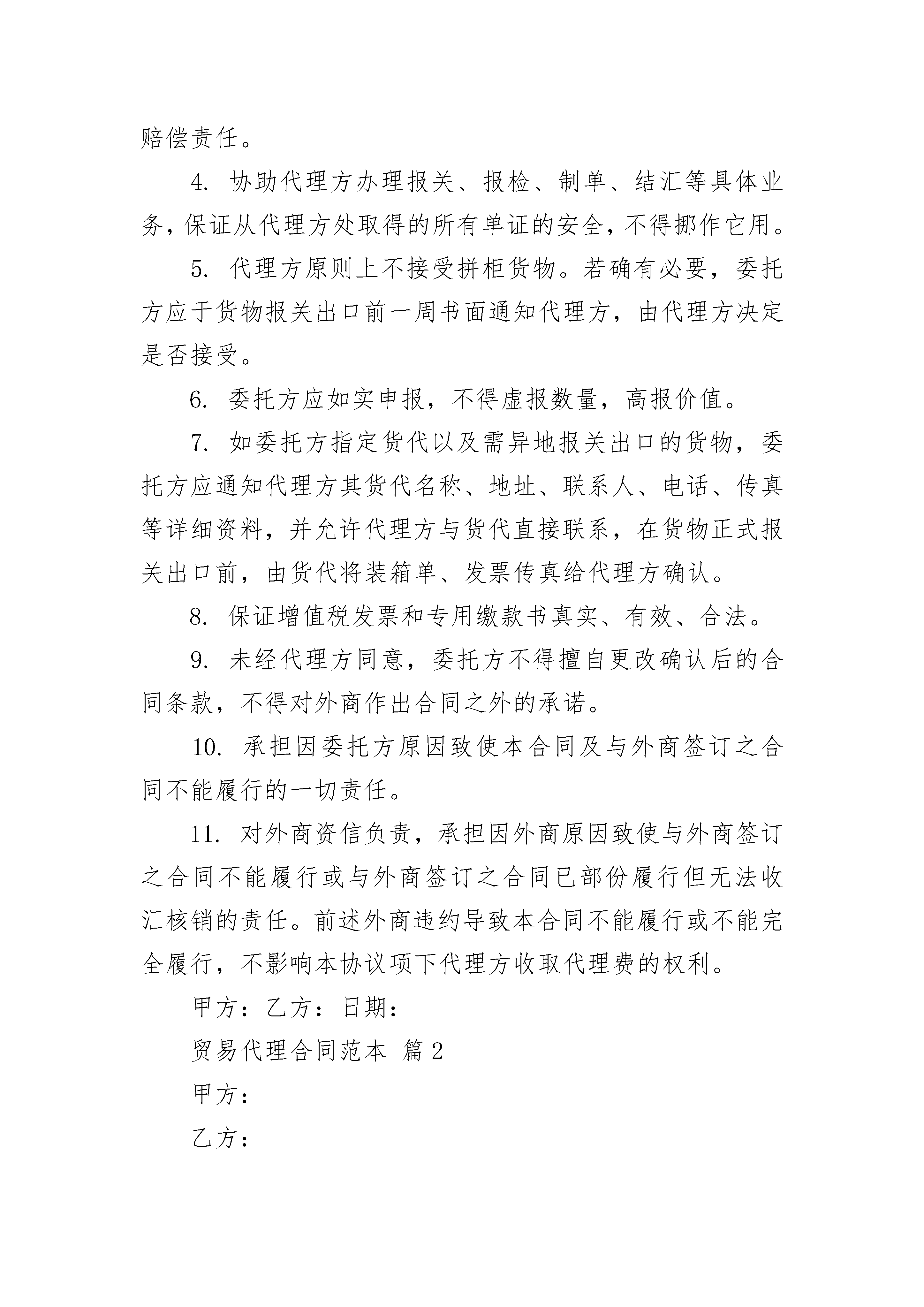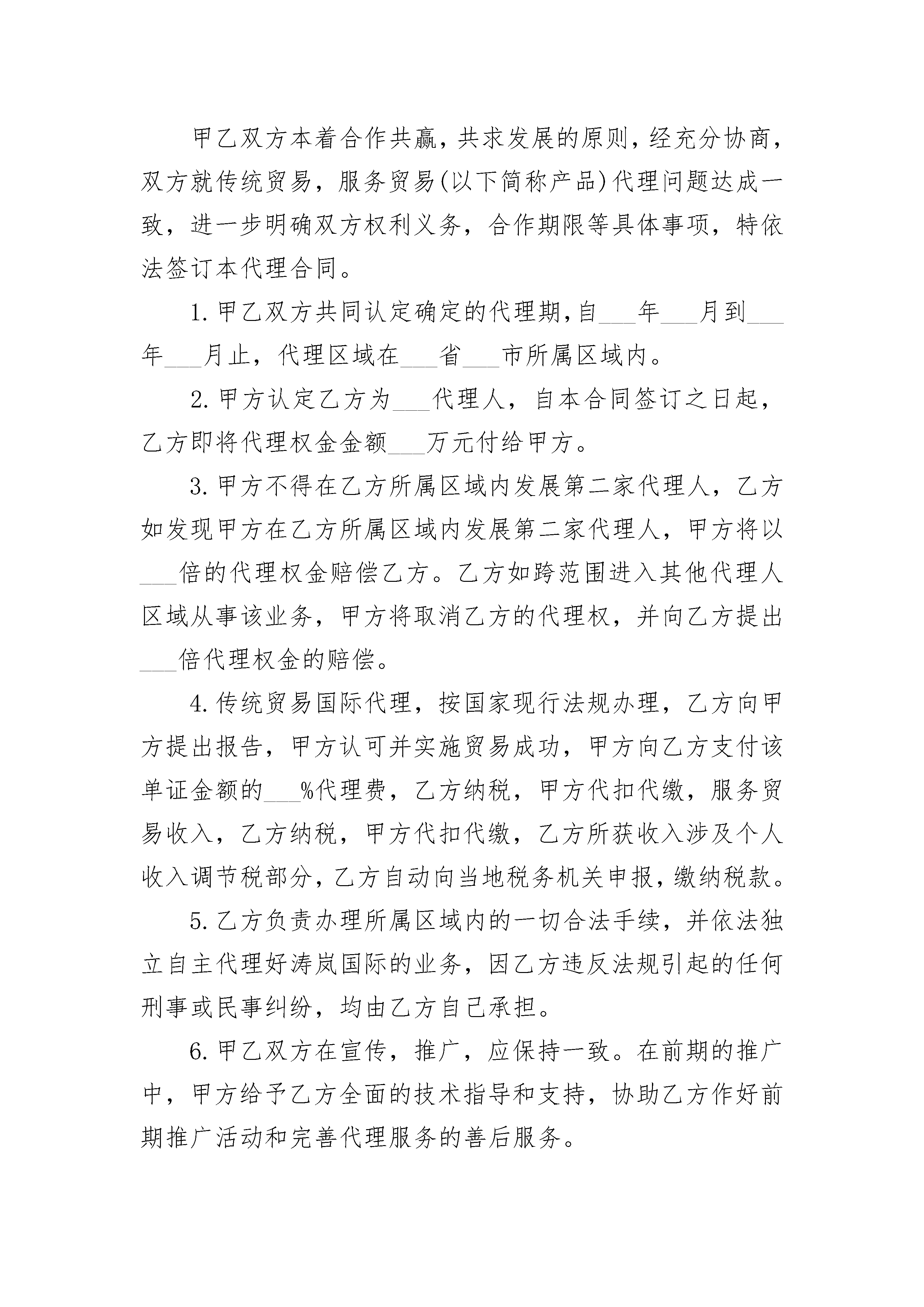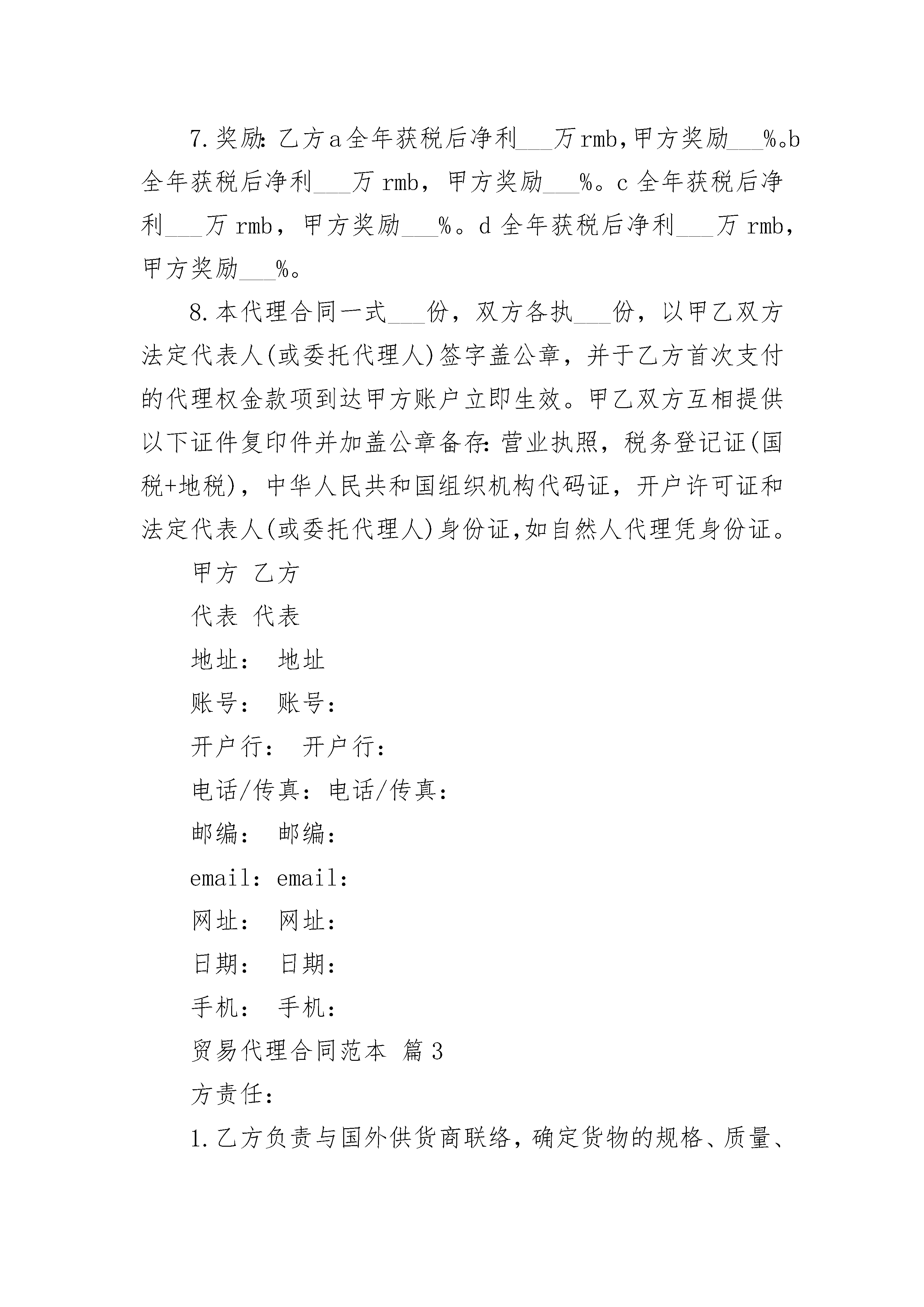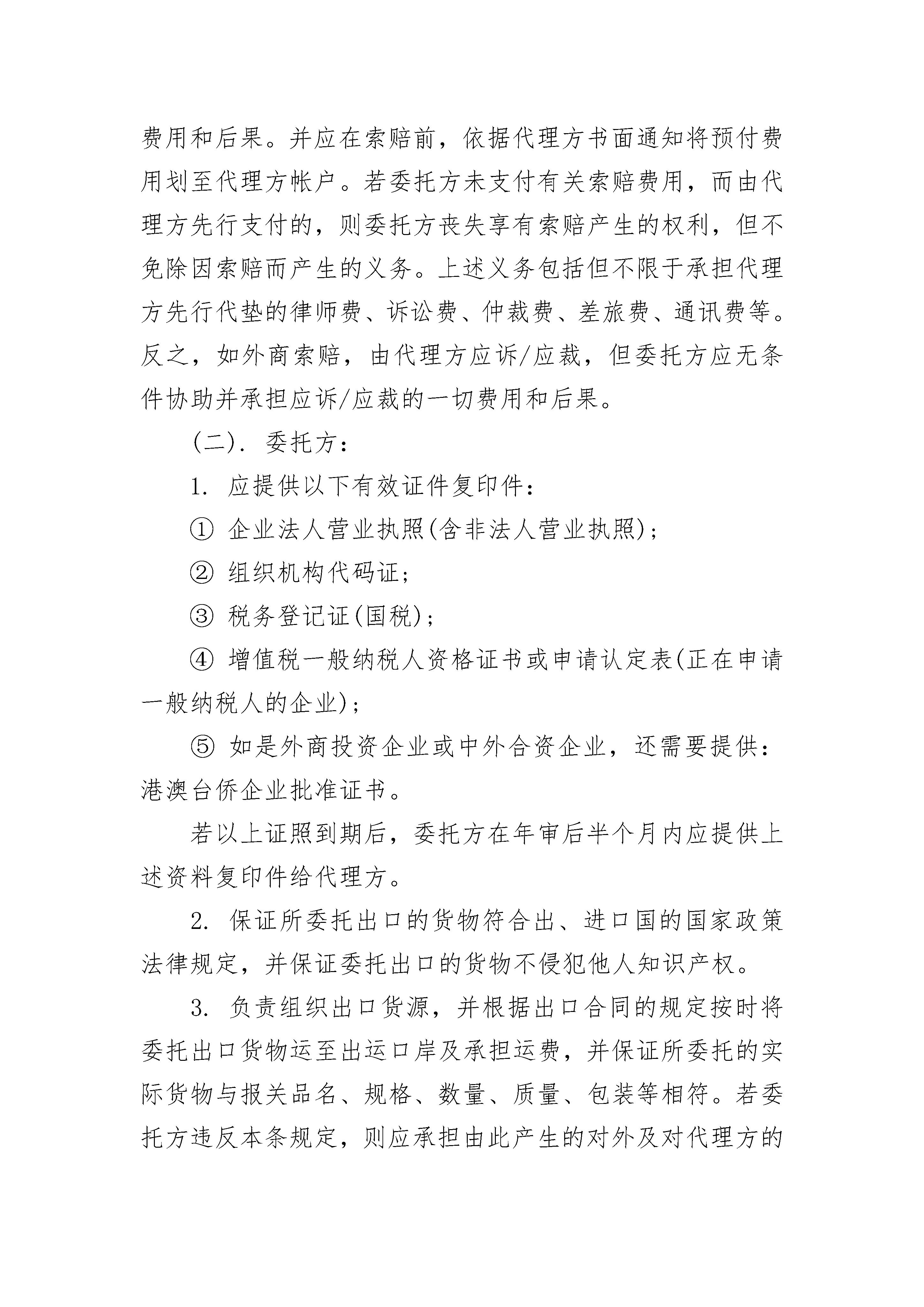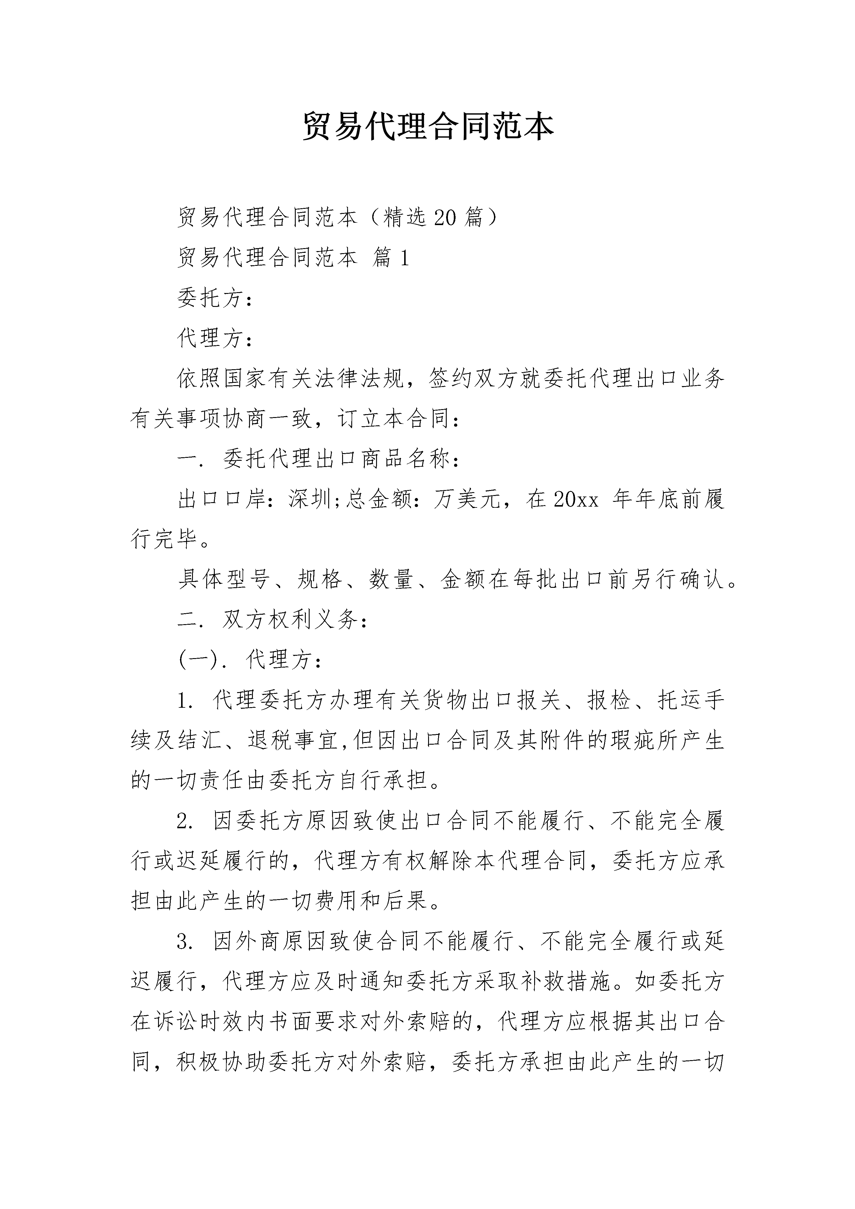 贸易代理合同范本贸易代理合同范本(精选20篇)贸易代理合同范本篇1委托方:代理方:依照国家有关法律法规,签约双方就委托代理出口业务有关事项协商一致,订立本合同:一.委托代理出口商品名称:出口口岸:深圳;总金额:万美元,在20xx年年底前履行完毕。具体型号、规格、数量、金额在每批出口前另行确认。二.双方权利义务:(一).代理方:1.代理委托方办理有关货物出口报关、报检、托运手续及结汇、退税事宜,但因出口合同及其附件的瑕疵所产生的一切责任由委托方自行承担。2.因委托方原因致使出口合同不能履行、不能完全履行或迟延履行的,代理方有权解除本代理合同,委托方应承担由此产生的一切费用和后果。3.因外商原因致使合同不能履行、不能完全履行或延迟履行,代理方应及时通知委托方采取补救措施。如委托方在诉讼时效内书面要求对外索赔的,代理方应根据其出口合同,积极协助委托方对外索赔,委托方承担由此产生的一切费用和后果。并应在索赔前,依据代理方书面通知将预付费用划至代理方帐户。若委托方未支付有关索赔费用,而由代理方先行支付的,则委托方丧失享有索赔产生的权利,但不免除因索赔而产生的义务。上述义务包括但不限于承担代理方先行代垫的律师费、诉讼费、仲裁费、差旅费、通讯费等。反之,如外商索赔,由代理方应诉/应裁,但委托方应无条件协助并承担应诉/应裁的一切费用和后果。(二).委托方:1.应提供以下有效证件复印件:①企业法人营业执照(含非法人营业执照);②组织机构代码证;③税务登记证(国税);④增值税一般纳税人资格证书或申请认定表(正在申请一般纳税人的企业);⑤如是外商投资企业或中外合资企业,还需要提供:港澳台侨企业批准证书。若以上证照到期后,委托方在年审后半个月内应提供上述资料复印件给代理方。2.保证所委托出口的货物符合出、进口国的国家政策法律规定,并保证委托出口的货物不侵犯他人知识产权。3.负责组织出口货源,并根据出口合同的规定按时将委托出口货物运至出运口岸及承担运费,并保证所委托的实际货物与报关品名、规格、数量、质量、包装等相符。若委托方违反本条规定,则应承担由此产生的对外及对代理方的赔偿责任。4.协助代理方办理报关、报检、制单、结汇等具体业务,保证从代理方处取得的所有单证的安全,不得挪作它用。5.代理方原则上不接受拼柜货物。若确有必要,委托方应于货物报关出口前一周书面通知代理方,由代理方决定是否接受。6.委托方应如实申报,不得虚报数量,高报价值。7.如委托方指定货代以及需异地报关出口的货物,委托方应通知代理方其货代名称、地址、联系人、电话、传真等详细资料,并允许代理方与货代直接联系,在货物正式报关出口前,由货代将装箱单、发票传真给代理方确认。8.保证增值税发票和专用缴款书真实、有效、合法。9.未经代理方同意,委托方不得擅自更改确认后的合同条款,不得对外商作出合同之外的承诺。10.承担因委托方原因致使本合同及与外商签订之合同不能履行的一切责任。11.对外商资信负责,承担因外商原因致使与外商签订之合同不能履行或与外商签订之合同已部份履行但无法收汇核销的责任。前述外商违约导致本合同不能履行或不能完全履行,不影响本协议项下代理方收取代理费的权利。甲方:乙方:日期:贸易代理合同范本篇2甲方:乙方:甲乙双方本着合作共赢,共求发展的原则,经充分协商,双方就传统贸易,服务贸易(以下简称产品)代理问题达成一致,进一步明确双方权利义务,合作期限等具体事项,特依法签订本代理合同。1.甲乙双方共同认定确定的代理期,自___年___月到___年___月止,代理区域在___省___市所属区域内。2.甲方认定乙方为___代理人,自本合同签订之日起,乙方即将代理权金金额___万元付给甲方。3.甲方不得在乙方所属区域内发展第二家代理人,乙方如发现甲方在乙方所属区域内发展第二家代理人,甲方将以___倍的代理权金赔偿乙方。乙方如跨范围进入其他代理人区域从事该业务,甲方将取消乙方的代理权,并向乙方提出___倍代理权金的赔偿。4.传统贸易国际代理,按国家现行法规办理,乙方向甲方提出报告,甲方认可并实施贸易成功,甲方向乙方支付该单证金额的___%代理费,乙方纳税,甲方代扣代缴,服务贸易收入,乙方纳税,甲方代扣代缴,乙方所获收入涉及个人收入调节税部分,乙方自动向当地税务机关申报,缴纳税款。5.乙方负责办理所属区域内的一切合法手续,并依法独立自主代理好涛岚国际的业务,因乙方违反法规引起的任何刑事或民事纠纷,均由乙方自己承担。6.甲乙双方在宣传,推广,应保持一致。在前期的推广中,甲方给予乙方全面的技术指导和支持,协助乙方作好前期推广活动和完善代理服务的善后服务。7.奖励:乙方a全年获税后净利___万rmb,甲方奖励___%。b全年获税后净利___万rmb,甲方奖励___%。c全年获税后净利___万rmb,甲方