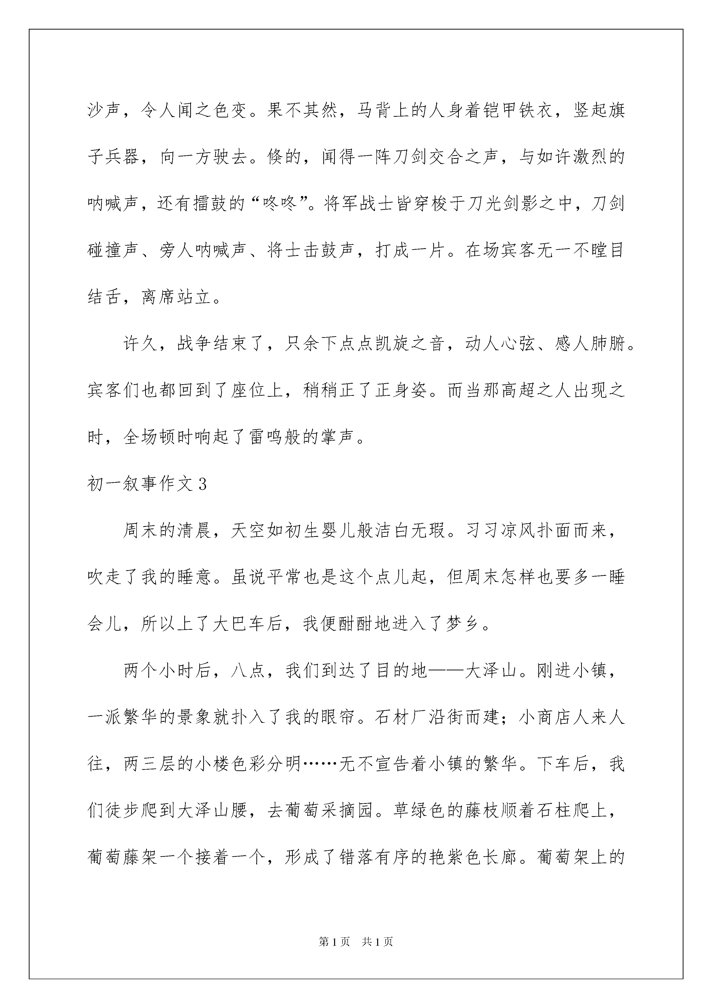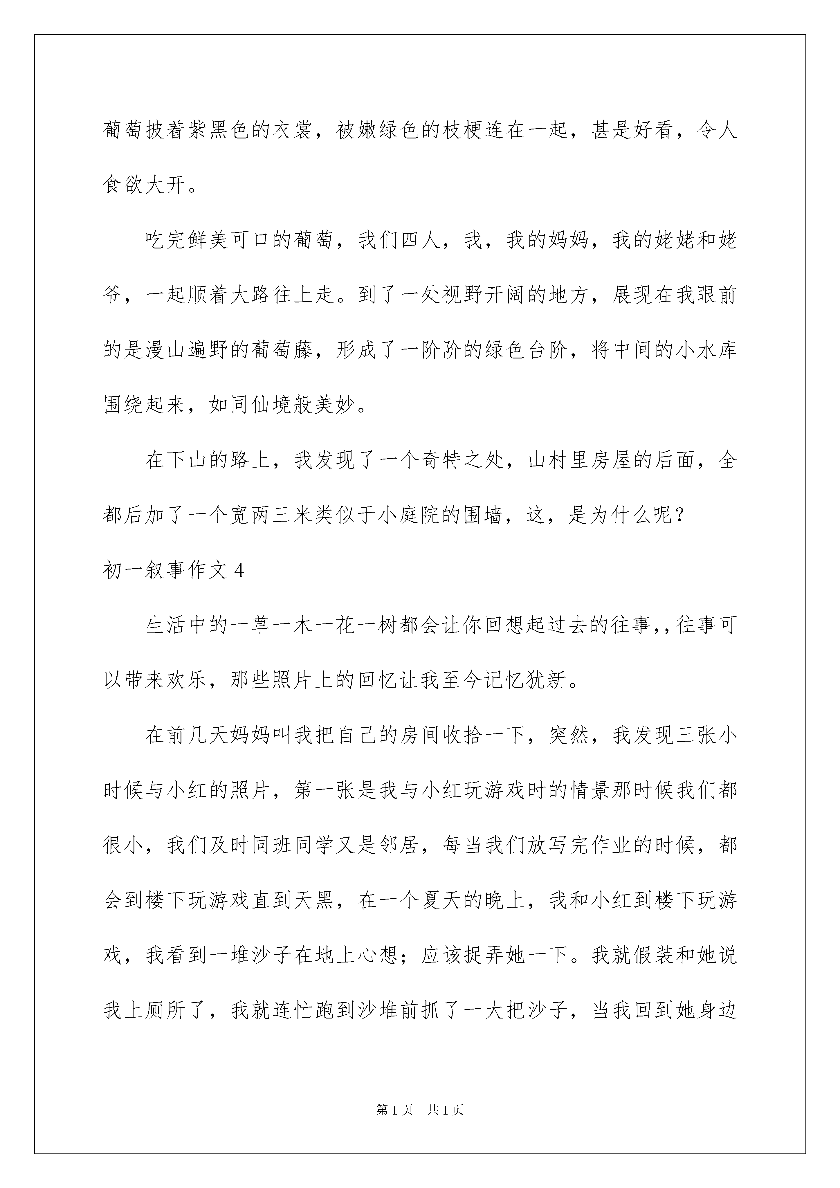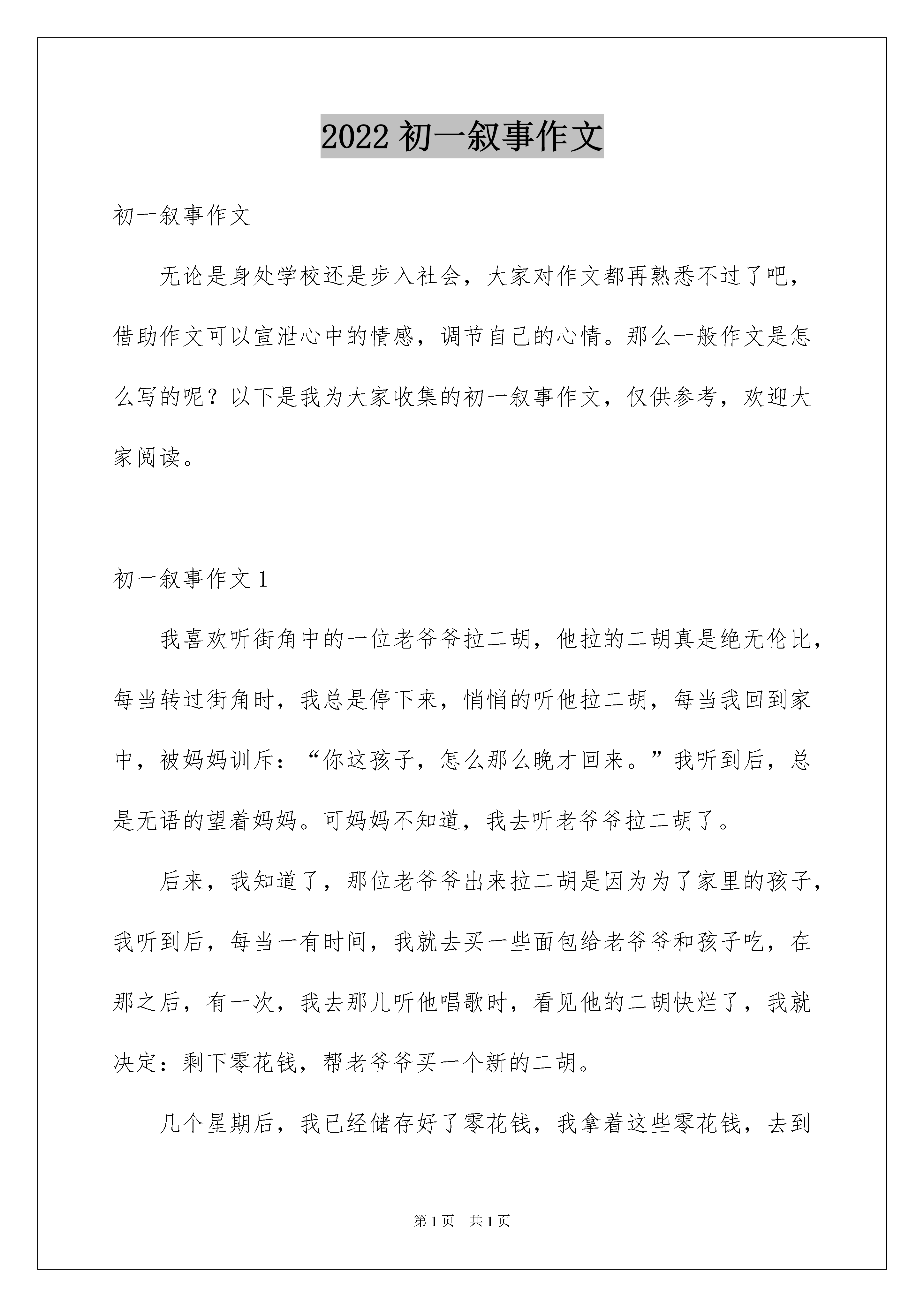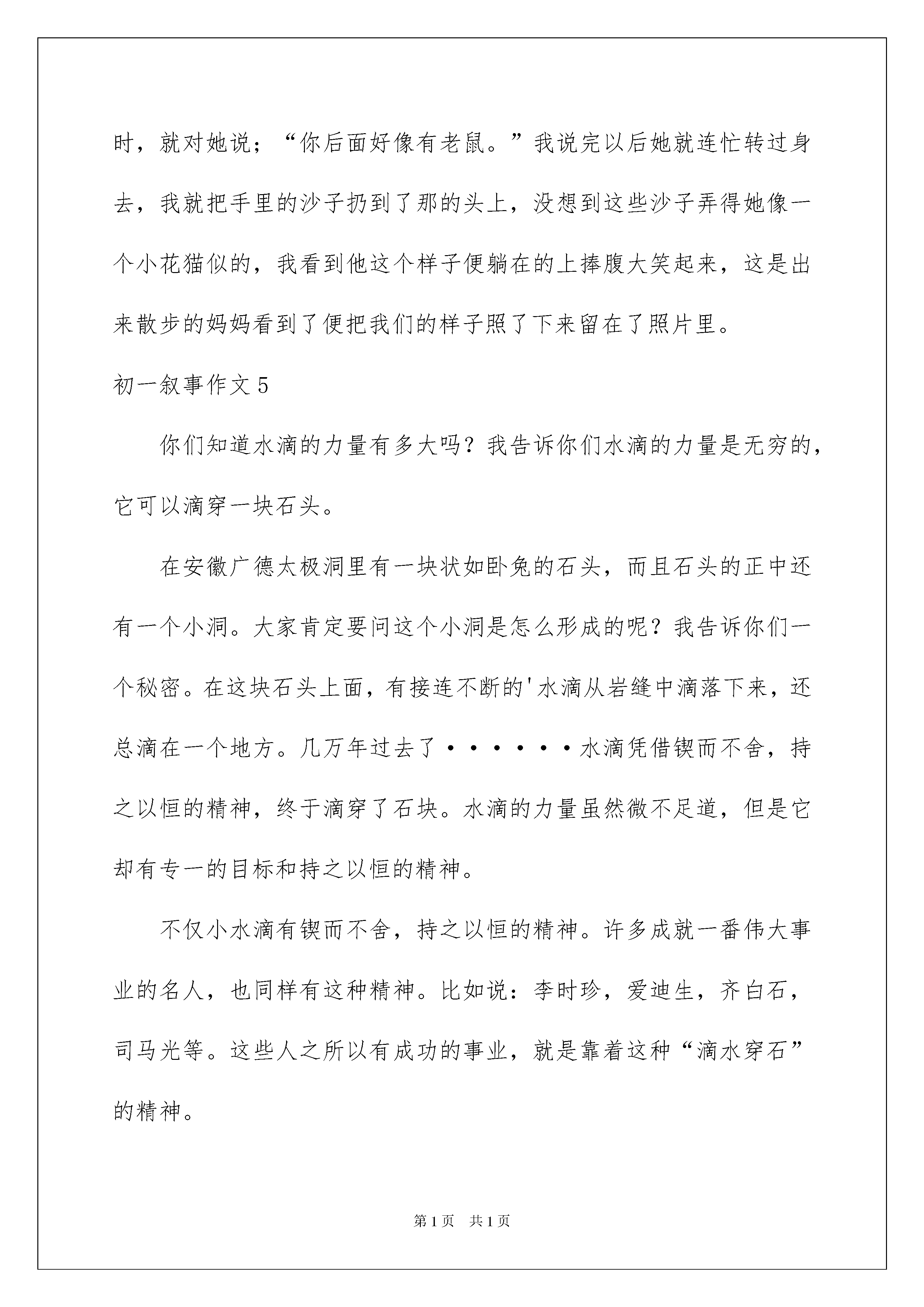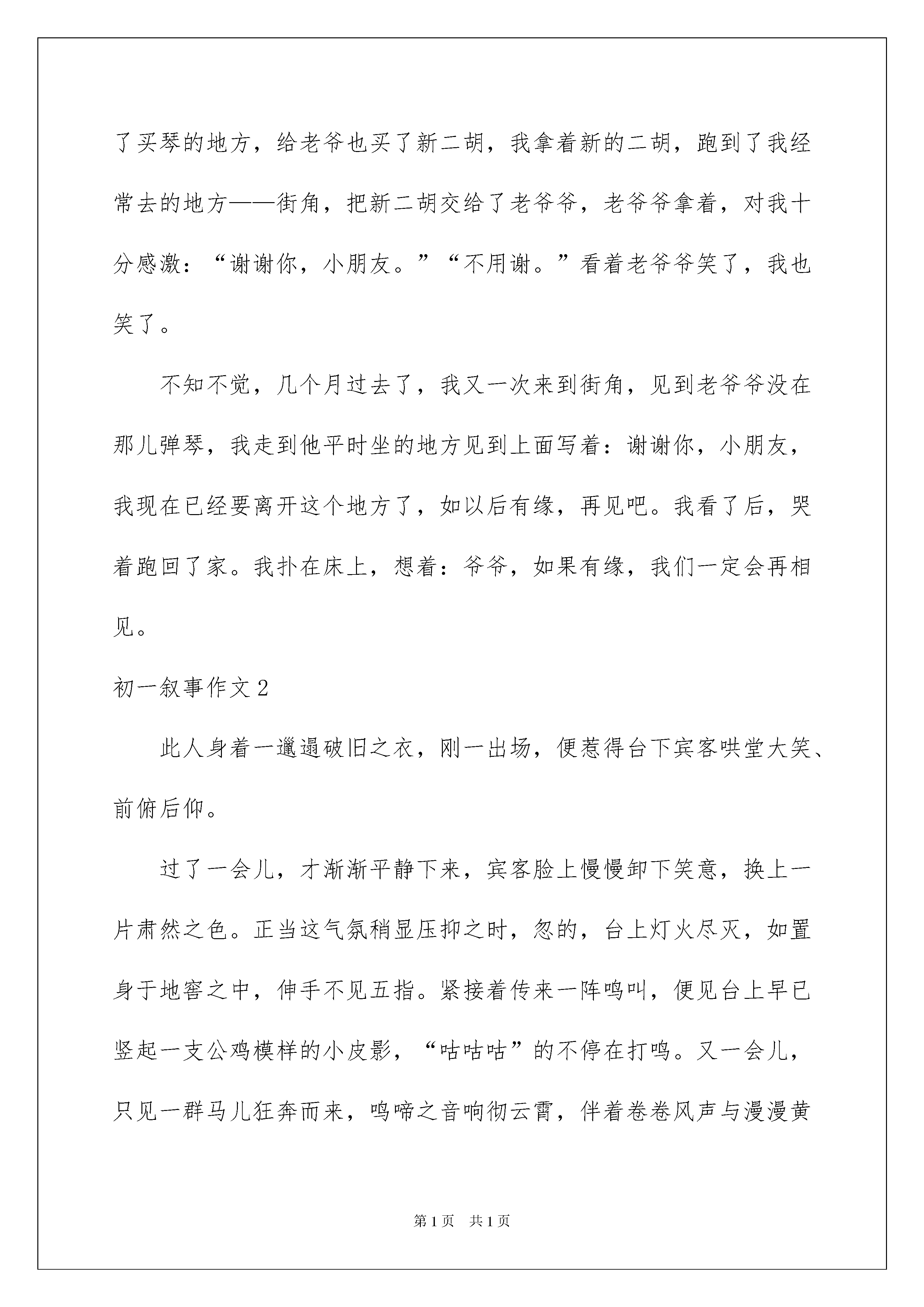 2022初一叙事作文初一叙事作文无论是身处学校还是步入社会,大家对作文都再熟悉不过了吧,借助作文可以宣泄心中的情感,调节自己的心情。那么一般作文是怎么写的呢?以下是我为大家收集的初一叙事作文,仅供参考,欢迎大家阅读。初一叙事作文1我喜欢听街角中的一位老爷爷拉二胡,他拉的二胡真是绝无伦比,每当转过街角时,我总是停下来,悄悄的听他拉二胡,每当我回到家中,被妈妈训斥:“你这孩子,怎么那么晚才回来。”我听到后,总是无语的望着妈妈。可妈妈不知道,我去听老爷爷拉二胡了。后来,我知道了,那位老爷爷出来拉二胡是因为为了家里的孩子,我听到后,每当一有时间,我就去买一些面包给老爷爷和孩子吃,在那之后,有一次,我去那儿听他唱歌时,看见他的二胡快烂了,我就决定:剩下零花钱,帮老爷爷买一个新的二胡。几个星期后,我已经储存好了零花钱,我拿着这些零花钱,去到了买琴的地方,给老爷也买了新二胡,我拿着新的二胡,跑到了我经常去的地方——街角,把新二胡交给了老爷爷,老爷爷拿着,对我十分感激:“谢谢你,小朋友。”“不用谢。”看着老爷爷笑了,我也笑了。不知不觉,几个月过去了,我又一次来到街角,见到老爷爷没在那儿弹琴,我走到他平时坐的地方见到上面写着:谢谢你,小朋友,我现在已经要离开这个地方了,如以后有缘,再见吧。我看了后,哭着跑回了家。我扑在床上,想着:爷爷,如果有缘,我们一定会再相见。初一叙事作文2此人身着一邋遢破旧之衣,刚一出场,便惹得台下宾客哄堂大笑、前俯后仰。过了一会儿,才渐渐平静下来,宾客脸上慢慢卸下笑意,换上一片肃然之色。正当这气氛稍显压抑之时,忽的,台上灯火尽灭,如置身于地窖之中,伸手不见五指。紧接着传来一阵鸣叫,便见台上早已竖起一支公鸡模样的小皮影,“咕咕咕”的不停在打鸣。又一会儿,只见一群马儿狂奔而来,鸣啼之音响彻云霄,伴着卷卷风声与漫漫黄沙声,令人闻之色变。果不其然,马背上的人身着铠甲铁衣,竖起旗子兵器,向一方驶去。倏的,闻得一阵刀剑交合之声,与如许激烈的呐喊声,还有擂鼓的“咚咚”。将军战士皆穿梭于刀光剑影之中,刀剑碰撞声、旁人呐喊声、将士击鼓声,打成一片。在场宾客无一不瞠目结舌,离席站立。许久,战争结束了,只余下点点凯旋之音,动人心弦、感人肺腑。宾客们也都回到了座位上,稍稍正了正身姿。而当那高超之人出现之时,全场顿时响起了雷鸣般的掌声。初一叙事作文3周末的清晨,天空如初生婴儿般洁白无瑕。习习凉风扑面而来,吹走了我的睡意。虽说平常也是这个点儿起,但周末怎样也要多一睡会儿,所以上了大巴车后,我便酣酣地进入了梦乡。两个小时后,八点,我们到达了目的地——大泽山。刚进小镇,一派繁华的景象就扑入了我的眼帘。石材厂沿街而建;小商店人来人往,两三层的小楼色彩分明……无不宣告着小镇的繁华。下车后,我们徒步爬到大泽山腰,去葡萄采摘园。草绿色的藤枝顺着石柱爬上,葡萄藤架一个接着一个,形成了错落有序的艳紫色长廊。葡萄架上的葡萄披着紫黑色的衣裳,被嫩绿色的枝梗连在一起,甚是好看,令人食欲大开。吃完鲜美可口的葡萄,我们四人,我,我的妈妈,我的姥姥和姥爷,一起顺着大路往上走。到了一处视野开阔的地方,展现在我眼前的是漫山遍野的葡萄藤,形成了一阶阶的绿色台阶,将中间的小水库围绕起来,如同仙境般美妙。在下山的路上,我发现了一个奇特之处,山村里房屋的后面,全都后加了一个宽两三米类似于小庭院的围墙,这,是为什么呢?初一叙事作文4生活中的一草一木一花一树都会让你回想起过去的往事,,往事可以带来欢乐,那些照片上的回忆让我至今记忆犹新。在前几天妈妈叫我把自己的房间收拾一下,突然,我发现三张小时候与小红的照片,第一张是我与小红玩游戏时的情景那时候我们都很小,我们及时同班同学又是邻居,每当我们放写完作业的时候,都会到楼下玩游戏直到天黑,在一个夏天的晚上,我和小红到楼下玩游戏,我看到一堆沙子在地上心想;应该捉弄她一下。我就假装和她说我上厕所了,我就连忙跑到沙堆前抓了一大把沙子,当我回到她身边时,就对她说;“你后面好像有老鼠。”我说完以后她就连忙转过身去,我就把手里的沙子扔到了那的头上,没想到这些沙子弄得她像一个小花猫似的,我看到他这个样子便躺在的上捧腹大笑起来,这是出来散步的妈妈看到了便把我们的样子照了下来留在了照片里。初一叙事作文5你们知道水滴的力量有多大吗?我告诉你们水滴的力量是无穷的,它可以滴穿一块石头。在安徽广德太极洞里有一块状如卧兔的石头,而且石头的正中还有一个小洞。大家肯定要问这个小洞是怎么形成的呢?我告诉你们一个秘密。在这块石头上面,有接连不断的'水滴从岩缝中滴落下来,还总滴在一个地方。几万年过去了······水滴凭借锲而不舍,