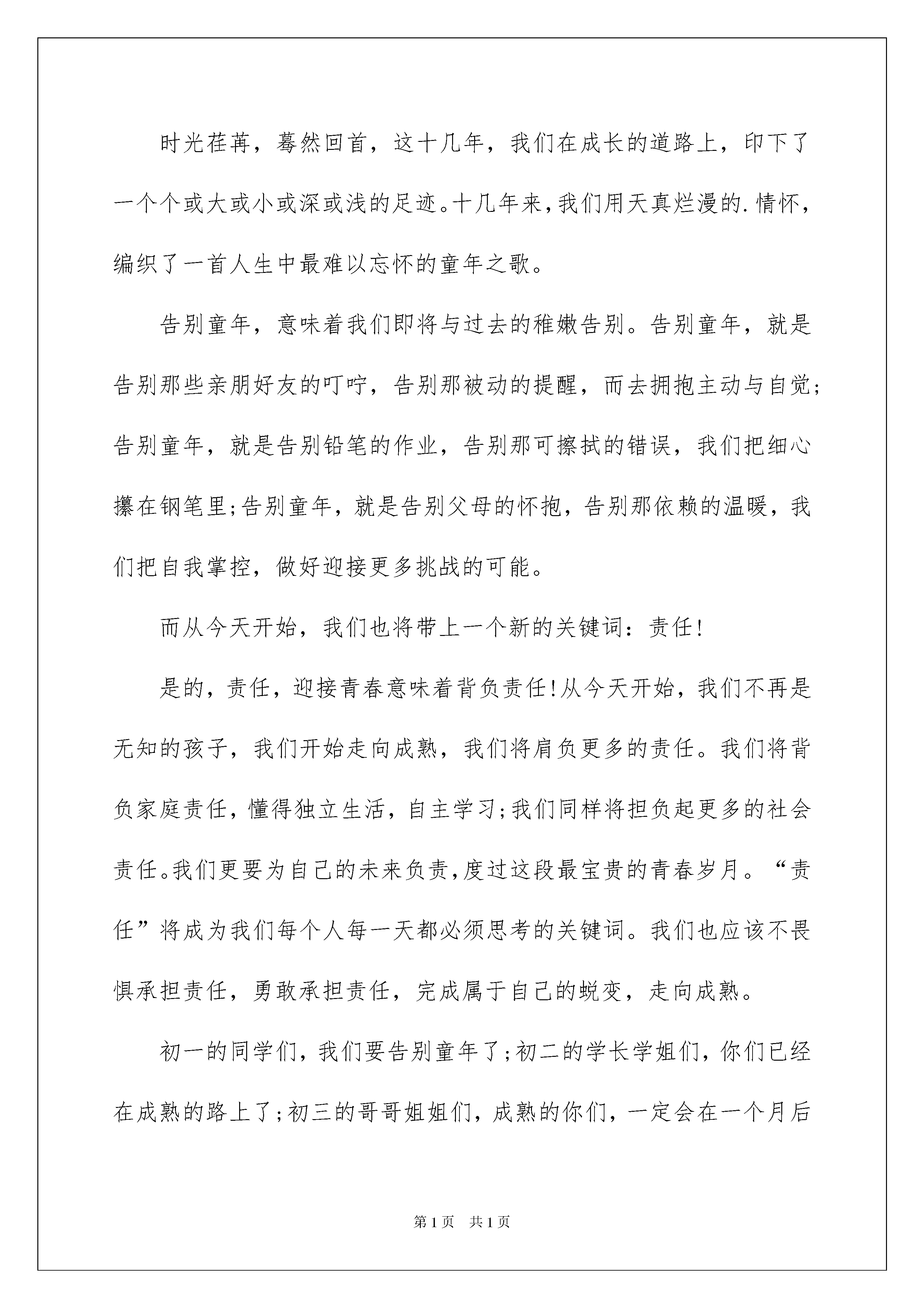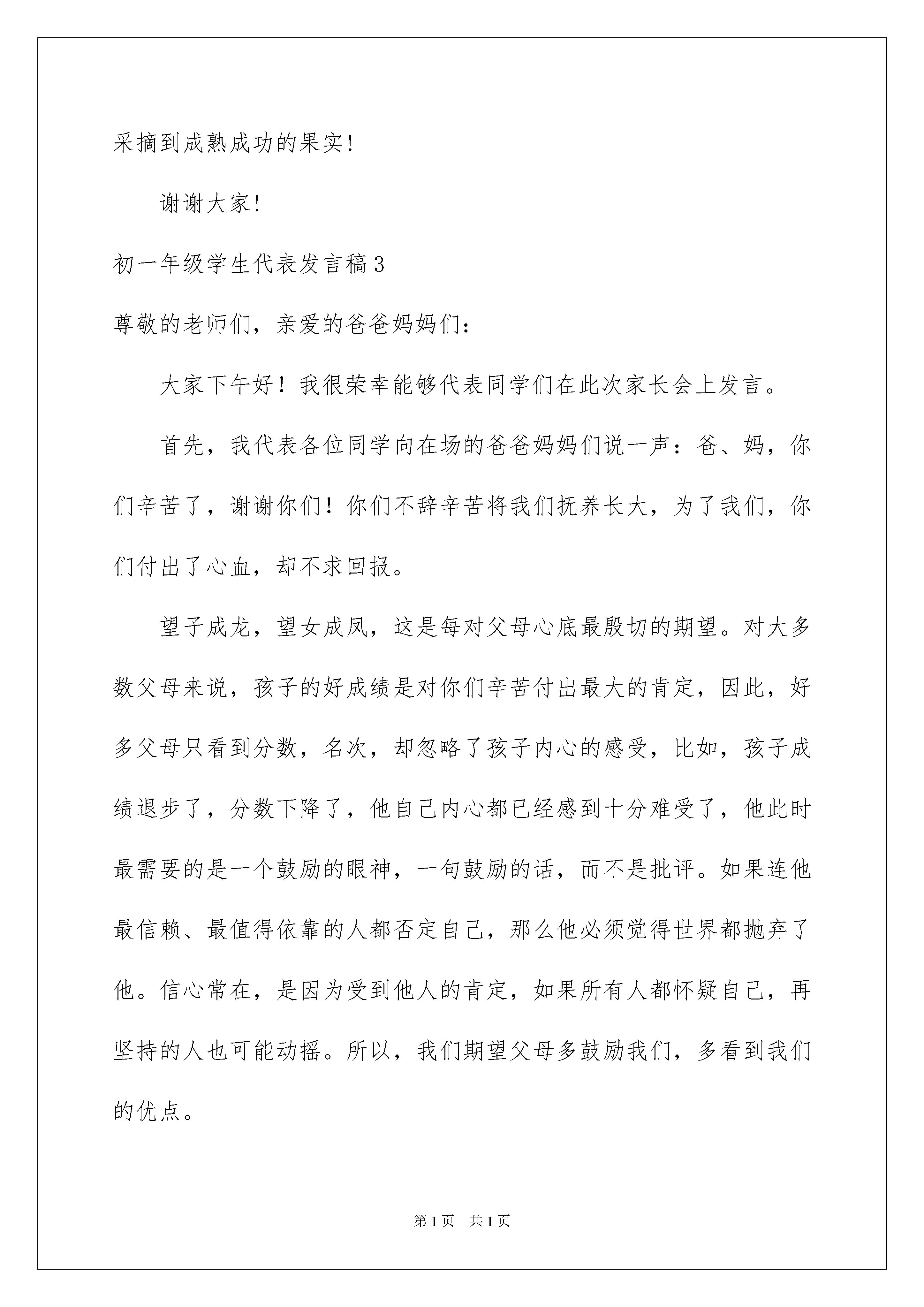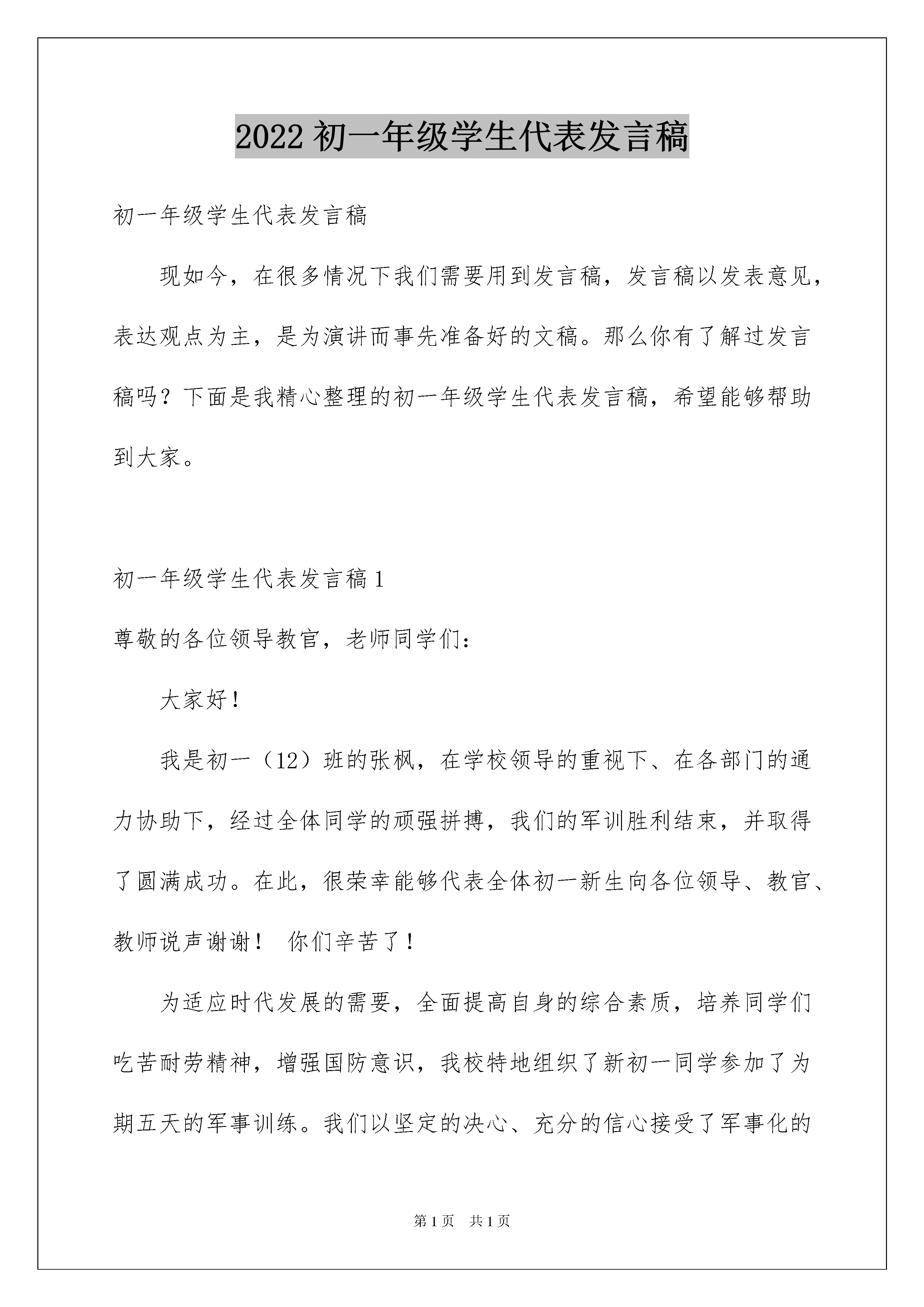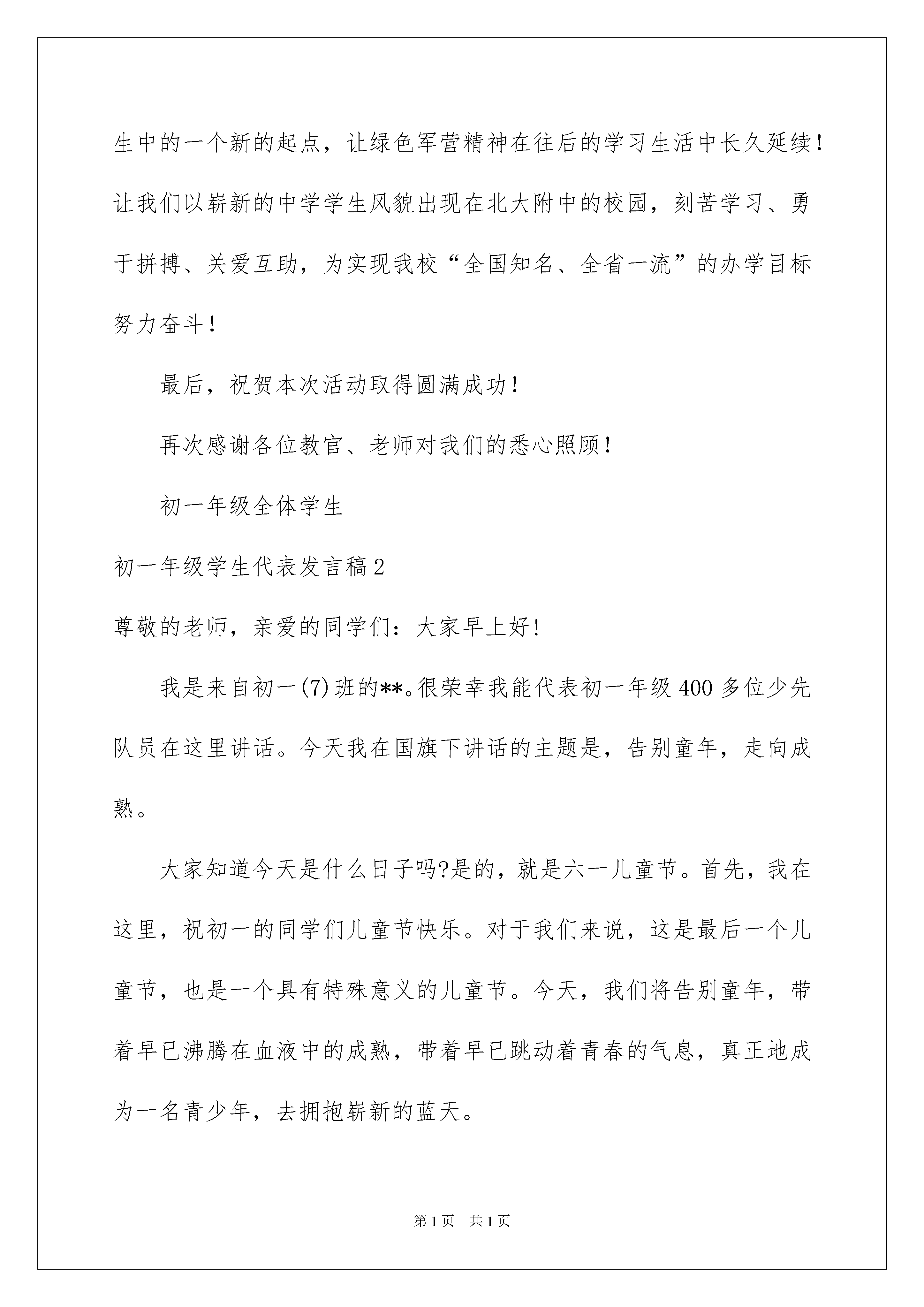 2022初一年级学生代表发言稿初一年级学生代表发言稿现如今,在很多情况下我们需要用到发言稿,发言稿以发表意见,表达观点为主,是为演讲而事先准备好的文稿。那么你有了解过发言稿吗?下面是我精心整理的初一年级学生代表发言稿,希望能够帮助到大家。初一年级学生代表发言稿1尊敬的各位领导教官,老师同学们:大家好!我是初一(12)班的张枫,在学校领导的重视下、在各部门的通力协助下,经过全体同学的顽强拼搏,我们的军训胜利结束,并取得了圆满成功。在此,很荣幸能够代表全体初一新生向各位领导、教官、教师说声谢谢!你们辛苦了!为适应时代发展的需要,全面提高自身的综合素质,培养同学们吃苦耐劳精神,增强国防意识,我校特地组织了新初一同学参加了为期五天的军事训练。我们以坚定的决心、充分的信心接受了军事化的训练,通过内务卫生、队列的训练、广播操的学习,锻炼了我们的意志,培养了我们的毅力,发挥了团队协作精神,也不断增强了自己的体魄。在五天的军训中,原本陌生的同学成为知己,六百一十四颗心连在一起;在五天的活动中,我们与严肃而又可爱的教官、建立了真挚的感情;五天中,我们学会了尊重与服从,学会了一切行动听指挥;五天中,我们学会了用高标准、严要求搞好内务卫生,不放过任何一个细节;五天中我们通过比一比、赛一赛的形式,树立了勇争第一的信念;五天的军训把我们磨得更锋利!我们经历了烈日和风雨,在全体教官的悉心教导、在大家的共同努力下,团结一致、刻苦训练,以教官为榜样,“流血流汗不流泪、掉皮掉肉不掉队”、“胆不怯、气不馁”,以高标准完成了各项训练任务,为自己的初中生涯添上青春靓丽的一笔!一切都来得太快,当我们还没来得及细细体味军营整齐划一的美和做事利索干练的军人风范,时光已然将我们送入了人生中最为美妙的初中时代。同学们,五天的军训之旅就要结束了。让我们把这次军训作为人生中的一个新的起点,让绿色军营精神在往后的学习生活中长久延续!让我们以崭新的中学学生风貌出现在北大附中的校园,刻苦学习、勇于拼搏、关爱互助,为实现我校“全国知名、全省一流”的办学目标努力奋斗!最后,祝贺本次活动取得圆满成功!再次感谢各位教官、老师对我们的悉心照顾!初一年级全体学生初一年级学生代表发言稿2尊敬的老师,亲爱的同学们:大家早上好!我是来自初一(7)班的**。很荣幸我能代表初一年级400多位少先队员在这里讲话。今天我在国旗下讲话的主题是,告别童年,走向成熟。大家知道今天是什么日子吗?是的,就是六一儿童节。首先,我在这里,祝初一的同学们儿童节快乐。对于我们来说,这是最后一个儿童节,也是一个具有特殊意义的儿童节。今天,我们将告别童年,带着早已沸腾在血液中的成熟,带着早已跳动着青春的气息,真正地成为一名青少年,去拥抱崭新的蓝天。时光荏苒,蓦然回首,这十几年,我们在成长的道路上,印下了一个个或大或小或深或浅的足迹。十几年来,我们用天真烂漫的.情怀,编织了一首人生中最难以忘怀的童年之歌。告别童年,意味着我们即将与过去的稚嫩告别。告别童年,就是告别那些亲朋好友的叮咛,告别那被动的提醒,而去拥抱主动与自觉;告别童年,就是告别铅笔的作业,告别那可擦拭的错误,我们把细心攥在钢笔里;告别童年,就是告别父母的怀抱,告别那依赖的温暖,我们把自我掌控,做好迎接更多挑战的可能。而从今天开始,我们也将带上一个新的关键词:责任!是的,责任,迎接青春意味着背负责任!从今天开始,我们不再是无知的孩子,我们开始走向成熟,我们将肩负更多的责任。我们将背负家庭责任,懂得独立生活,自主学习;我们同样将担负起更多的社会责任。我们更要为自己的未来负责,度过这段最宝贵的青春岁月。“责任”将成为我们每个人每一天都必须思考的关键词。我们也应该不畏惧承担责任,勇敢承担责任,完成属于自己的蜕变,走向成熟。初一的同学们,我们要告别童年了;初二的学长学姐们,你们已经在成熟的路上了;初三的哥哥姐姐们,成熟的你们,一定会在一个月后采摘到成熟成功的果实!谢谢大家!初一年级学生代表发言稿3尊敬的老师们,亲爱的爸爸妈妈们:大家下午好!我很荣幸能够代表同学们在此次家长会上发言。首先,我代表各位同学向在场的爸爸妈妈们说一声:爸、妈,你们辛苦了,谢谢你们!你们不辞辛苦将我们抚养长大,为了我们,你们付出了心血,却不求回报。望子成龙,望女成凤,这是每对父母心底最殷切的期望。对大多数父母来说,孩子的好成绩是对你们辛苦付出最大的肯定,因此,好多父母只看到分数,名次,却忽略了孩子内心的感受,比如,孩子成绩退步了,分数下降了,他自己内心都已经感到十分难受了,他此时最需要的是一个鼓励的眼神,一句鼓励的话,而不是批评。如果连他最信赖、最值得依靠