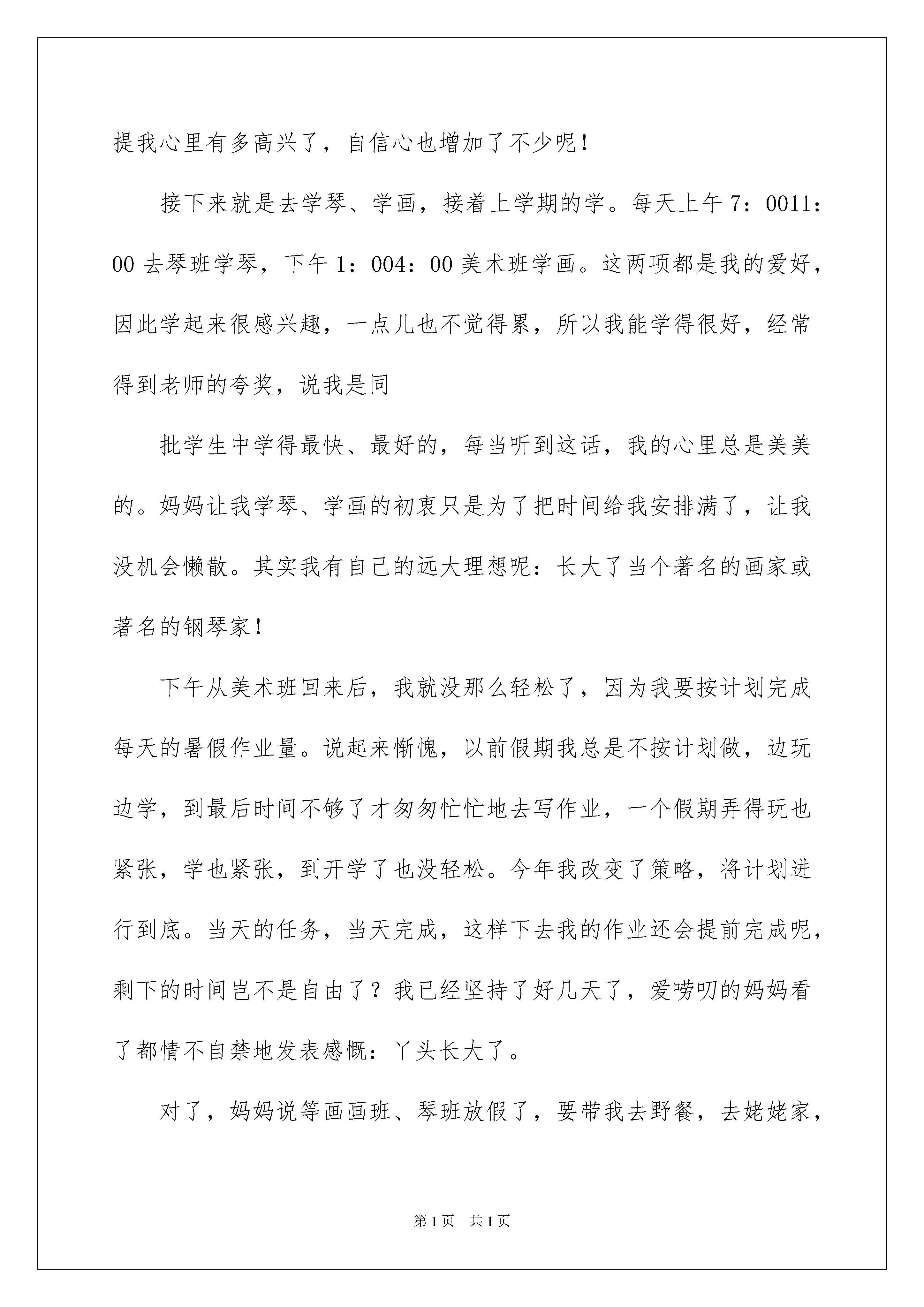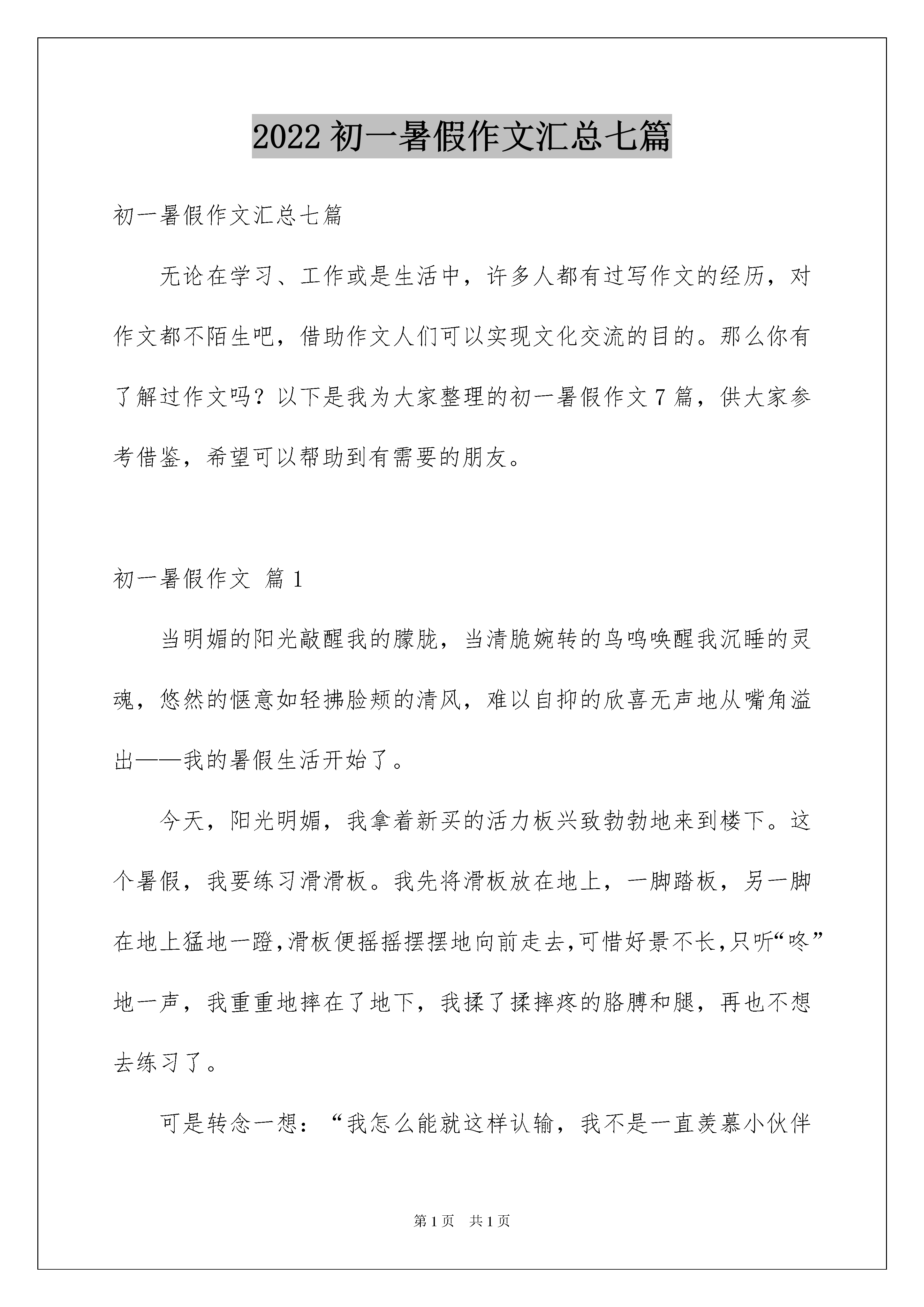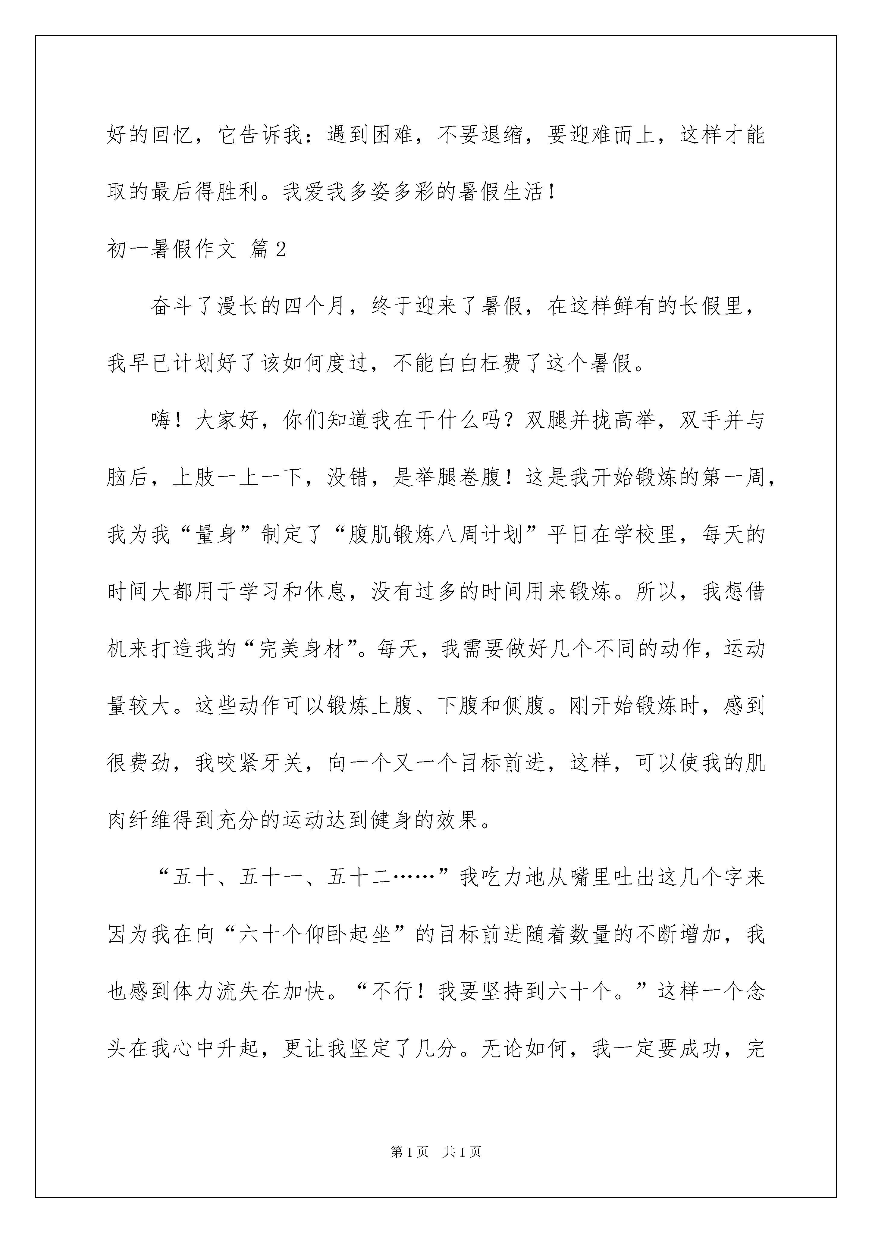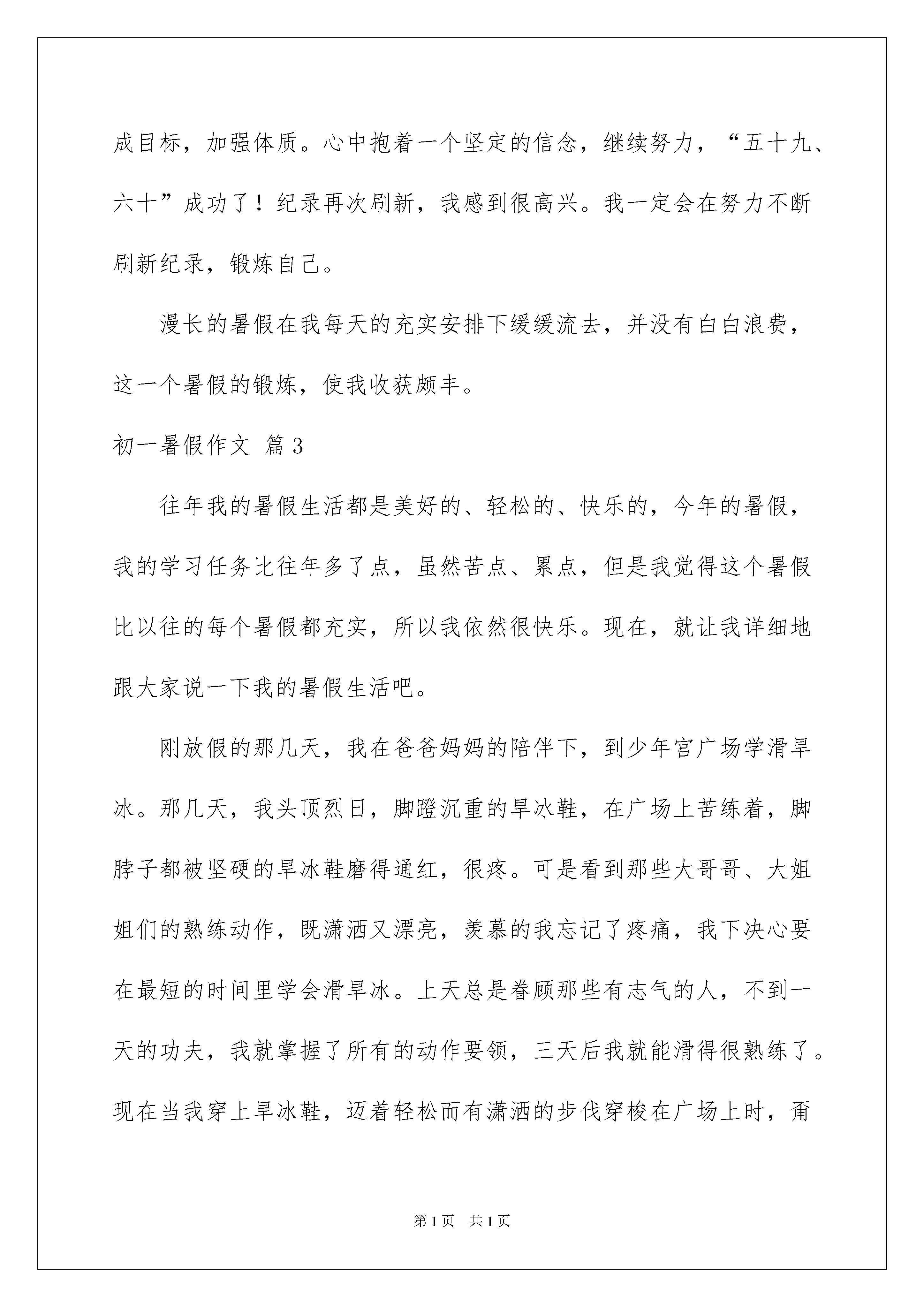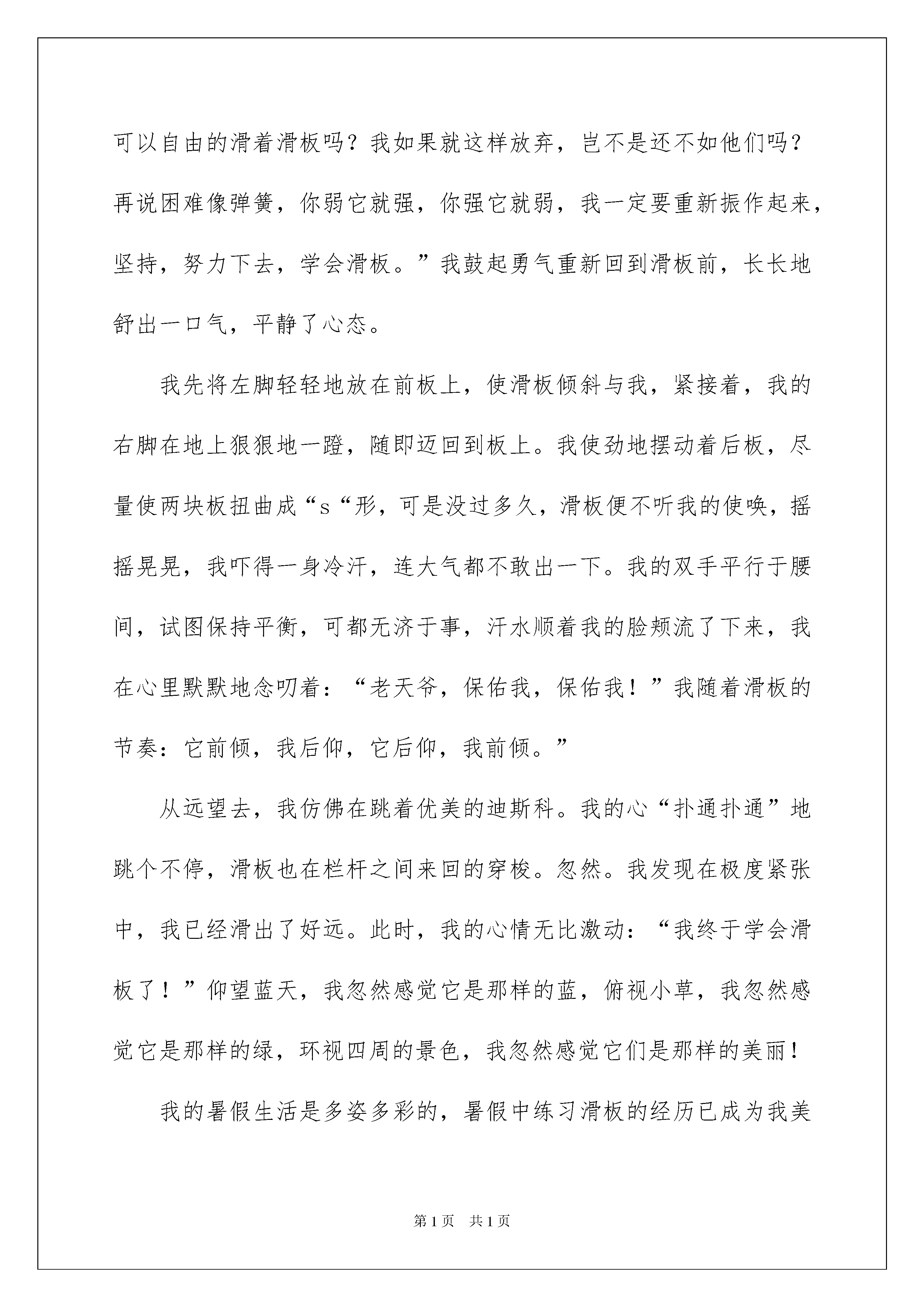 2022初一暑假作文汇总七篇初一暑假作文汇总七篇无论在学习、工作或是生活中,许多人都有过写作文的经历,对作文都不陌生吧,借助作文人们可以实现文化交流的目的。那么你有了解过作文吗?以下是我为大家整理的初一暑假作文7篇,供大家参考借鉴,希望可以帮助到有需要的朋友。初一暑假作文篇1当明媚的阳光敲醒我的朦胧,当清脆婉转的鸟鸣唤醒我沉睡的灵魂,悠然的惬意如轻拂脸颊的清风,难以自抑的欣喜无声地从嘴角溢出——我的暑假生活开始了。今天,阳光明媚,我拿着新买的活力板兴致勃勃地来到楼下。这个暑假,我要练习滑滑板。我先将滑板放在地上,一脚踏板,另一脚在地上猛地一蹬,滑板便摇摇摆摆地向前走去,可惜好景不长,只听“咚”地一声,我重重地摔在了地下,我揉了揉摔疼的胳膊和腿,再也不想去练习了。可是转念一想:“我怎么能就这样认输,我不是一直羡慕小伙伴可以自由的滑着滑板吗?我如果就这样放弃,岂不是还不如他们吗?再说困难像弹簧,你弱它就强,你强它就弱,我一定要重新振作起来,坚持,努力下去,学会滑板。”我鼓起勇气重新回到滑板前,长长地舒出一口气,平静了心态。我先将左脚轻轻地放在前板上,使滑板倾斜与我,紧接着,我的右脚在地上狠狠地一蹬,随即迈回到板上。我使劲地摆动着后板,尽量使两块板扭曲成“s“形,可是没过多久,滑板便不听我的使唤,摇摇晃晃,我吓得一身冷汗,连大气都不敢出一下。我的双手平行于腰间,试图保持平衡,可都无济于事,汗水顺着我的脸颊流了下来,我在心里默默地念叨着:“老天爷,保佑我,保佑我!”我随着滑板的节奏:它前倾,我后仰,它后仰,我前倾。”从远望去,我仿佛在跳着优美的迪斯科。我的心“扑通扑通”地跳个不停,滑板也在栏杆之间来回的穿梭。忽然。我发现在极度紧张中,我已经滑出了好远。此时,我的心情无比激动:“我终于学会滑板了!”仰望蓝天,我忽然感觉它是那样的蓝,俯视小草,我忽然感觉它是那样的绿,环视四周的景色,我忽然感觉它们是那样的美丽!我的暑假生活是多姿多彩的,暑假中练习滑板的经历已成为我美好的回忆,它告诉我:遇到困难,不要退缩,要迎难而上,这样才能取的最后得胜利。我爱我多姿多彩的暑假生活!初一暑假作文篇2奋斗了漫长的四个月,终于迎来了暑假,在这样鲜有的长假里,我早已计划好了该如何度过,不能白白枉费了这个暑假。嗨!大家好,你们知道我在干什么吗?双腿并拢高举,双手并与脑后,上肢一上一下,没错,是举腿卷腹!这是我开始锻炼的第一周,我为我“量身”制定了“腹肌锻炼八周计划”平日在学校里,每天的时间大都用于学习和休息,没有过多的时间用来锻炼。所以,我想借机来打造我的“完美身材”。每天,我需要做好几个不同的动作,运动量较大。这些动作可以锻炼上腹、下腹和侧腹。刚开始锻炼时,感到很费劲,我咬紧牙关,向一个又一个目标前进,这样,可以使我的肌肉纤维得到充分的运动达到健身的效果。“五十、五十一、五十二……”我吃力地从嘴里吐出这几个字来因为我在向“六十个仰卧起坐”的目标前进随着数量的不断增加,我也感到体力流失在加快。“不行!我要坚持到六十个。”这样一个念头在我心中升起,更让我坚定了几分。无论如何,我一定要成功,完成目标,加强体质。心中抱着一个坚定的信念,继续努力,“五十九、六十”成功了!纪录再次刷新,我感到很高兴。我一定会在努力不断刷新纪录,锻炼自己。漫长的暑假在我每天的充实安排下缓缓流去,并没有白白浪费,这一个暑假的锻炼,使我收获颇丰。初一暑假作文篇3往年我的暑假生活都是美好的、轻松的、快乐的,今年的暑假,我的学习任务比往年多了点,虽然苦点、累点,但是我觉得这个暑假比以往的每个暑假都充实,所以我依然很快乐。现在,就让我详细地跟大家说一下我的暑假生活吧。刚放假的那几天,我在爸爸妈妈的陪伴下,到少年宫广场学滑旱冰。那几天,我头顶烈日,脚蹬沉重的旱冰鞋,在广场上苦练着,脚脖子都被坚硬的旱冰鞋磨得通红,很疼。可是看到那些大哥哥、大姐姐们的熟练动作,既潇洒又漂亮,羡慕的我忘记了疼痛,我下决心要在最短的时间里学会滑旱冰。上天总是眷顾那些有志气的人,不到一天的功夫,我就掌握了所有的动作要领,三天后我就能滑得很熟练了。现在当我穿上旱冰鞋,迈着轻松而有潇洒的步伐穿梭在广场上时,甭提我心里有多高兴了,自信心也增加了不少呢!接下来就是去学琴、学画,接着上学期的学。每天上午7:0011:00去琴班学琴,下午1:004:00美术班学画。这两项都是我的爱好,因此学起来很感兴趣,一点儿也不觉得累,所以我能学得很好,经常得到老师的夸奖,说我是同批学生中学得最快、最好的,每当听到这话,我的心里总是美美的。妈妈让我学琴、学画的初衷只是为了把时间给我安排满了,让我没机
