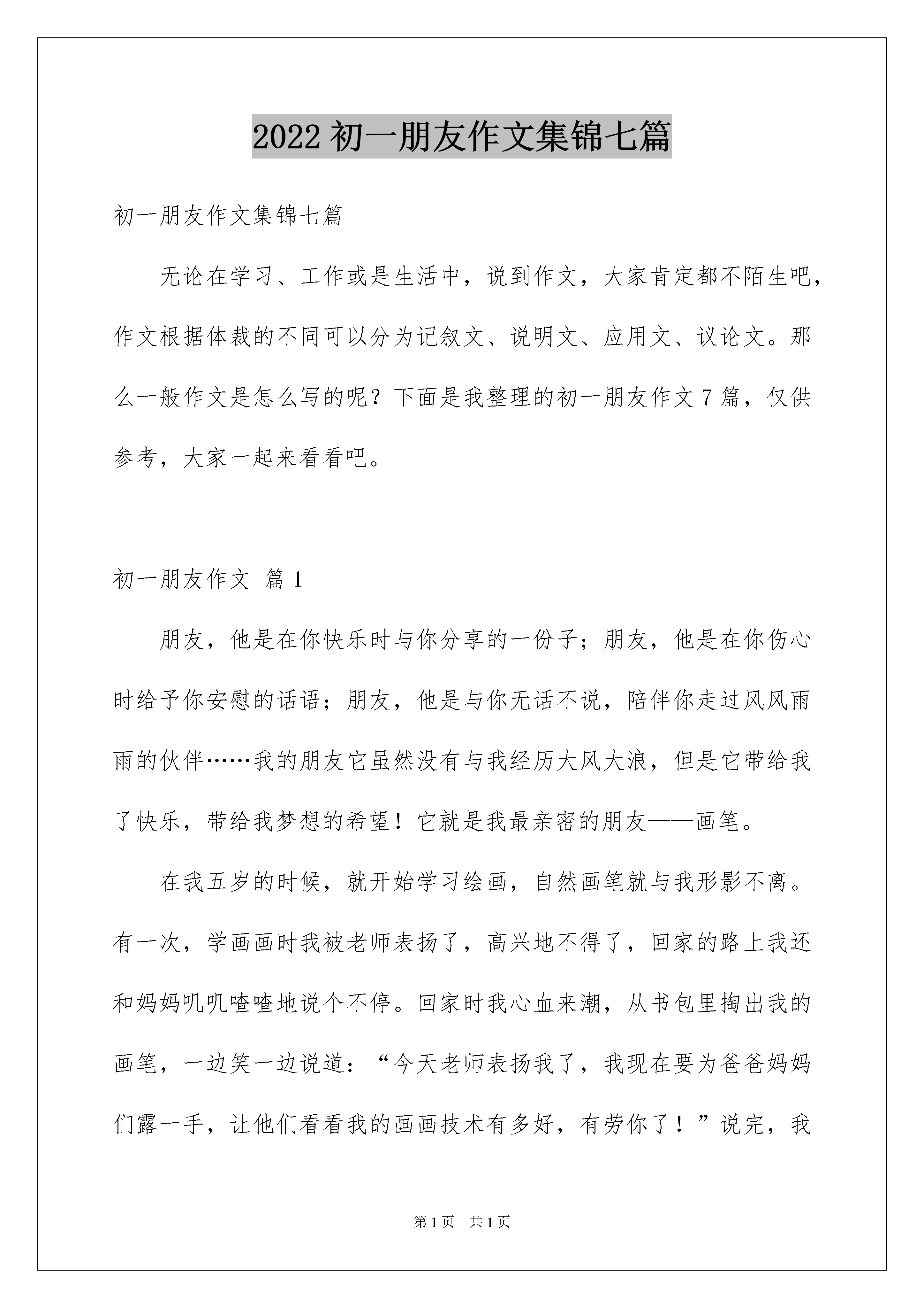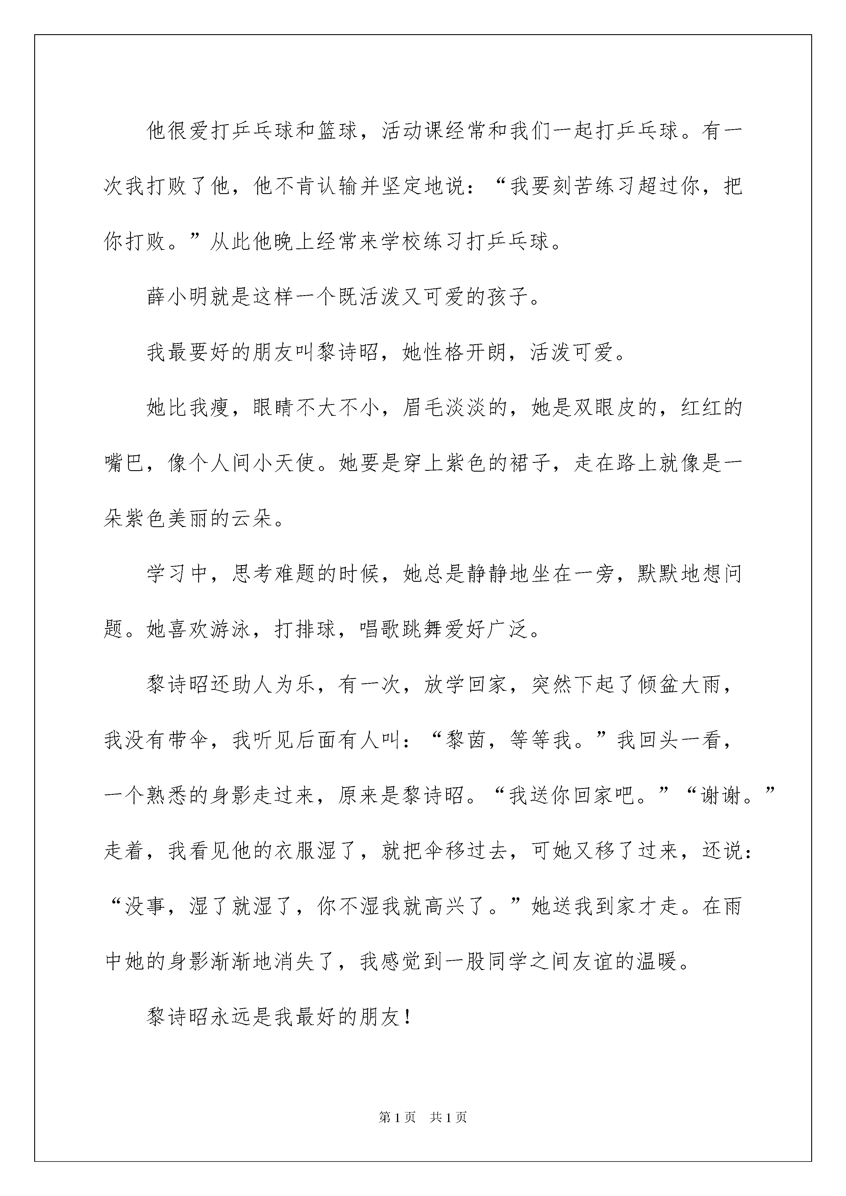 2022初一朋友作文集锦七篇初一朋友作文集锦七篇无论在学习、工作或是生活中,说到作文,大家肯定都不陌生吧,作文根据体裁的不同可以分为记叙文、说明文、应用文、议论文。那么一般作文是怎么写的呢?下面是我整理的初一朋友作文7篇,仅供参考,大家一起来看看吧。初一朋友作文篇1朋友,他是在你快乐时与你分享的一份子;朋友,他是在你伤心时给予你安慰的话语;朋友,他是与你无话不说,陪伴你走过风风雨雨的伙伴……我的朋友它虽然没有与我经历大风大浪,但是它带给我了快乐,带给我梦想的希望!它就是我最亲密的朋友——画笔。在我五岁的时候,就开始学习绘画,自然画笔就与我形影不离。有一次,学画画时我被老师表扬了,高兴地不得了,回家的路上我还和妈妈叽叽喳喳地说个不停。回家时我心血来潮,从书包里掏出我的画笔,一边笑一边说道:“今天老师表扬我了,我现在要为爸爸妈妈们露一手,让他们看看我的画画技术有多好,有劳你了!”说完,我便拿笔一挥,开始描绘我的“大作”。我趴在冰凉的地板上,在纸上画了一个大圆,又画了一个小圆说道:“这个是爸爸的脸和妈妈的脸。”然后又开始特别投入的画着,一个小时过后,我的“杰作”也完成了,兴奋得连蹦带跳,拼命大叫道:“爸爸妈妈,快来看呀!”听到我一声大叫,便走到客厅来,我十分自豪地展开我的“杰作”,“看”,我不停地指着画,还一边解释道:“这个是你——爸爸!这个是你——妈妈!”我心里得意地想着:嘿嘿,我这大师画得不错吧!没想到,我的画爸爸妈妈一看捧腹大笑,我满脸疑惑,“不是画得挺好吗?”妈妈见了,又强忍住笑:“是,是,画得不错,画得不错!”然后又转头大笑。我还当真他们是在表扬我,低下头又兴奋地对我的画笔说:“这次多亏了你,我得到爸爸妈妈的表扬了!”我的第一支画笔陪我走过了幼儿园的时光,第二支又光荣上岗了,上小学时,它又为我做了不少好事。艺术节来临,我几年学得的绘画本领终于可以大显身手啦!我在家里画了近两天的稿子,交给了美术老师,经过老师的层层选拔,我的画脱颖而出,还参加了鹿城区的比赛。回家后,我迫不及待地对我的画笔轻轻说道:“谢谢你,我的画笔,这回你可立了大功啦,我一定会再接再厉,让你发挥更大的作用!”不过后来我又得知没有比上,心情低落的我用画笔在纸上猛涂,鲜艳的色彩在白纸上跳跃,我似乎听到了画笔的安慰:“没关系,只要你努力了就好,不经历风雨怎能见彩虹?”顿时,我的内心如雨过天晴般变得明朗。这就是我最亲密的朋友!随着我的成长,我的画笔也换了一支又一支,但是换掉的每一支画笔,都为我留下了一张张充满童趣的画,一首首童年的诗,每一支新的画笔,鼓动着我向新的目标出发!初一朋友作文篇2我和小霍在学校里是非常要好的朋友,我们同是语文课代表,每天一起收作业、捧作业、发作业。我们一起洗饭盒,一起去打写文章,一起去上课,形影不离。可是有一件事,让我知道了,她,是我真正的朋友。记得有一次,我外出旅游,请了一个星期的假。我星期天出发,星期五下午回来。等到我回来的时候,已经是三点半了,我也懒得回学校了。于是,我决定放学的时候再回校拿作业。五点十分了,我拿上出入卡和钥匙,走向了学校。我来到教室,很多人已经走了只剩下几个人在教室抄作业。我走向我的桌子,那儿有一个人不知道在干什么。我走过去一看,原来是小霍在帮我整理作业。她把本子从小到大整整齐齐地叠好,周报折好,并写上我的名字。看到这一幕,我的心小小地颤动了一下。她也看到了我,笑着说:“你回来啦,我还想待会儿送到你家呢!作业已经整理好啦,给你!”她边说边把作业递给我。一时间,我不知道该说什么好。“呃,谢谢!”回到家,我的心中百感交集……我觉得,这,就是真正的朋友吧!初一朋友作文篇3我有一个好朋友叫薛小明,他今年八岁了,高高的个子,身体胖乎乎的,走路来一扭一扭的。他留着一头乌黑的短发,胖胖的脸像红苹果似的,弯弯的眉毛下有一双圆溜溜的'眼睛炯炯有神,高高的鼻梁上架着一副眼镜,一半张大大的嘴巴,笑的时候露出两个小酒窝,很可爱。他是个活泼可爱的小男孩,平时总是蹦蹦跳跳,爱说爱笑。他也很调皮好动,只要是活动时间他总要到球活动,有时候我们玩游戏时他常来捣乱。他是个爱吃零食的孩子,经常拿钱到小店铺买自己爱吃的零食。他很爱打乒乓球和篮球,活动课经常和我们一起打乒乓球。有一次我打败了他,他不肯认输并坚定地说:“我要刻苦练习超过你,把你打败。”从此他晚上经常来学校练习打乒乓球。薛小明就是这样一个既活泼又可爱的孩子。我最要好的朋友叫黎诗昭,她性格开朗,活泼可爱。她比我瘦,眼睛不大不小,眉毛淡淡的,她是双眼皮的,红红的嘴巴,像个人间小天使。她要是穿上紫色的裙子,走在路上就像是一朵紫色美丽的云朵。学习中