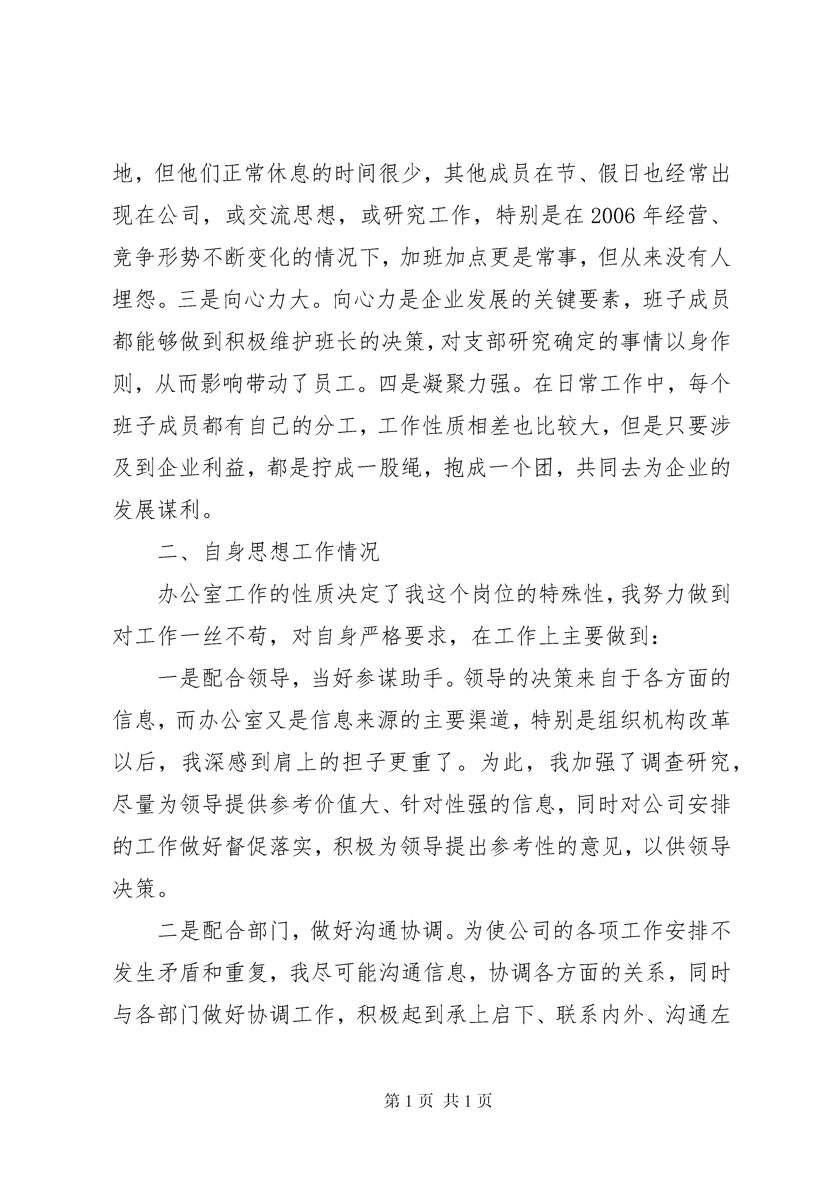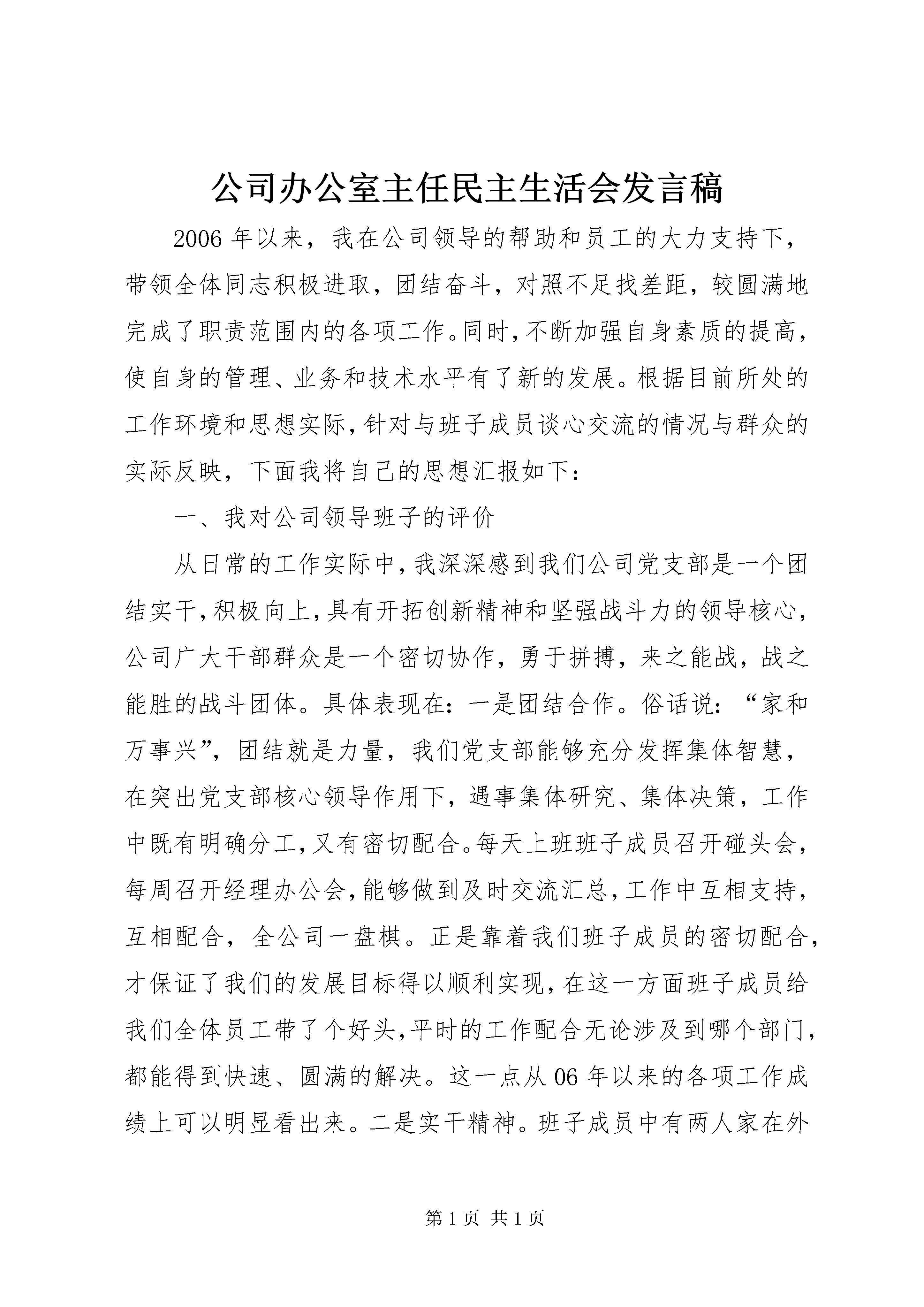 公司办公室主任民主生活会发言稿2006年以来,我在公司领导的帮助和员工的大力支持下,带领全体同志积极进取,团结奋斗,对照不足找差距,较圆满地完成了职责范围内的各项工作。同时,不断加强自身素质的提高,使自身的管理、业务和技术水平有了新的发展。根据目前所处的工作环境和思想实际,针对与班子成员谈心交流的情况与群众的实际反映,下面我将自己的思想汇报如下:一、我对公司领导班子的评价从日常的工作实际中,我深深感到我们公司党支部是一个团结实干,积极向上,具有开拓创新精神和坚强战斗力的领导核心,公司广大干部群众是一个密切协作,勇于拼搏,来之能战,战之能胜的战斗团体。具体表现在:一是团结合作。俗话说:“家和万事兴”,团结就是力量,我们党支部能够充分发挥集体智慧,在突出党支部核心领导作用下,遇事集体研究、集体决策,工作中既有明确分工,又有密切配合。每天上班班子成员召开碰头会,每周召开经理办公会,能够做到及时交流汇总,工作中互相支持,互相配合,全公司一盘棋。正是靠着我们班子成员的密切配合,才保证了我们的发展目标得以顺利实现,在这一方面班子成员给我们全体员工带了个好头,平时的工作配合无论涉及到哪个部门,都能得到快速、圆满的解决。这一点从06年以来的各项工作成绩上可以明显看出来。二是实干精神。班子成员中有两人家在外地,但他们正常休息的时间很少,其他成员在节、假日也经常出现在公司,或交流思想,或研究工作,特别是在2006年经营、竞争形势不断变化的情况下,加班加点更是常事,但从来没有人埋怨。三是向心力大。向心力是企业发展的关键要素,班子成员都能够做到积极维护班长的决策,对支部研究确定的事情以身作则,从而影响带动了员工。四是凝聚力强。在日常工作中,每个班子成员都有自己的分工,工作性质相差也比较大,但是只要涉及到企业利益,都是拧成一股绳,抱成一个团,共同去为企业的发展谋利。二、自身思想工作情况办公室工作的性质决定了我这个岗位的特殊性,我努力做到对工作一丝不苟,对自身严格要求,在工作上主要做到:一是配合领导,当好参谋助手。领导的决策来自于各方面的信息,而办公室又是信息来源的主要渠道,特别是组织机构改革以后,我深感到肩上的担子更重了。为此,我加强了调查研究,尽量为领导提供参考价值大、针对性强的信息,同时对公司安排的工作做好督促落实,积极为领导提出参考性的意见,以供领导决策。二是配合部门,做好沟通协调。为使公司的各项工作安排不发生矛盾和重复,我尽可能沟通信息,协调各方面的关系,同时与各部门做好协调工作,积极起到承上启下、联系内外、沟通左右的良好作用,为公司工作奠定良好的基础。三是配合经营,做好后勤保障。当前企业一切以经营为中心,办公室工作也是如此,我对下属人员严格要求,只要是有利于经营的工作,都要以企业利益为重,少顾及个人和部门利益,从车辆、人员、劳保等各方面给予最好的保障,以确保企业利益不受损失。四是配合管理,抓好安全生产。在管理上,我积极带头执行各项规章制度,并根据漏洞提出完善和解决的办法。特别是在安全生产方面,因为安全是一切工作的基础,我认真落实例行检查等各项安全制度,督促相关人员到基层去了解整改情况,为各项工作创造一个良好、安全的环境。通过以上工作,不仅使我的工作能力有了一定的提高,更重要的是促进了我思想的全面发展,人生观和世界观得到了进一步完善。但通过对自己思想冷静和深刻剖析,发现自身还存在差距和不足,主要表现在以下几个方面:1、思想仍有旧的观念,创新意识较差。通过与班子成员谈心,发现思想缺乏主动性和创造性,有时用老的模式去考虑问题、做工作,不能及时把新的思想运用到具体工作中去。2、工作方法不够灵活。在这一方面开拓精神较差,比较单一,经验还比较少。3、管理还不够细,不够大胆。在一些管理制度和细节上还存有不完善的地方,对部分难度大的问题没有做到大胆去管理,缺乏有效的管理手段。对自己的工作标准要求不高,满足于现状的思想仍存在,对大部分工作是完成了事,不能精益求精,对分管的工作要求的不够严格。4、工作效率有待于进一步提高。有时在一些工作上有所犹豫,存有畏难情绪,影响了工作的时效性。针对以上问题,结合自身实际情况,特制订整改措施如下:一、加强工作方法的灵活性和管理的严肃性。有针对性地对工作方法进行转变,因事而宜、因人而宜,做到有的放矢。对各项制度不断进行完善,在此基础上结合本部门实际,针对新情况出台相应的管理办法,增加自身的管理经验,不断提高管理水平。二、加强与员工的交流与联系。在工作上和生活上不断加强与员工的交流与联系,取得第一手资料,并将其运用到工作中去,做到学习与运用、言论与行动相统一,在联系群众的基础上创造性地开展工作。三、有意识地提高工作效率。力求做到在处理主动与被动的关系时,在被动与主动中力求主动快捷;处理规范化和随机性的关系