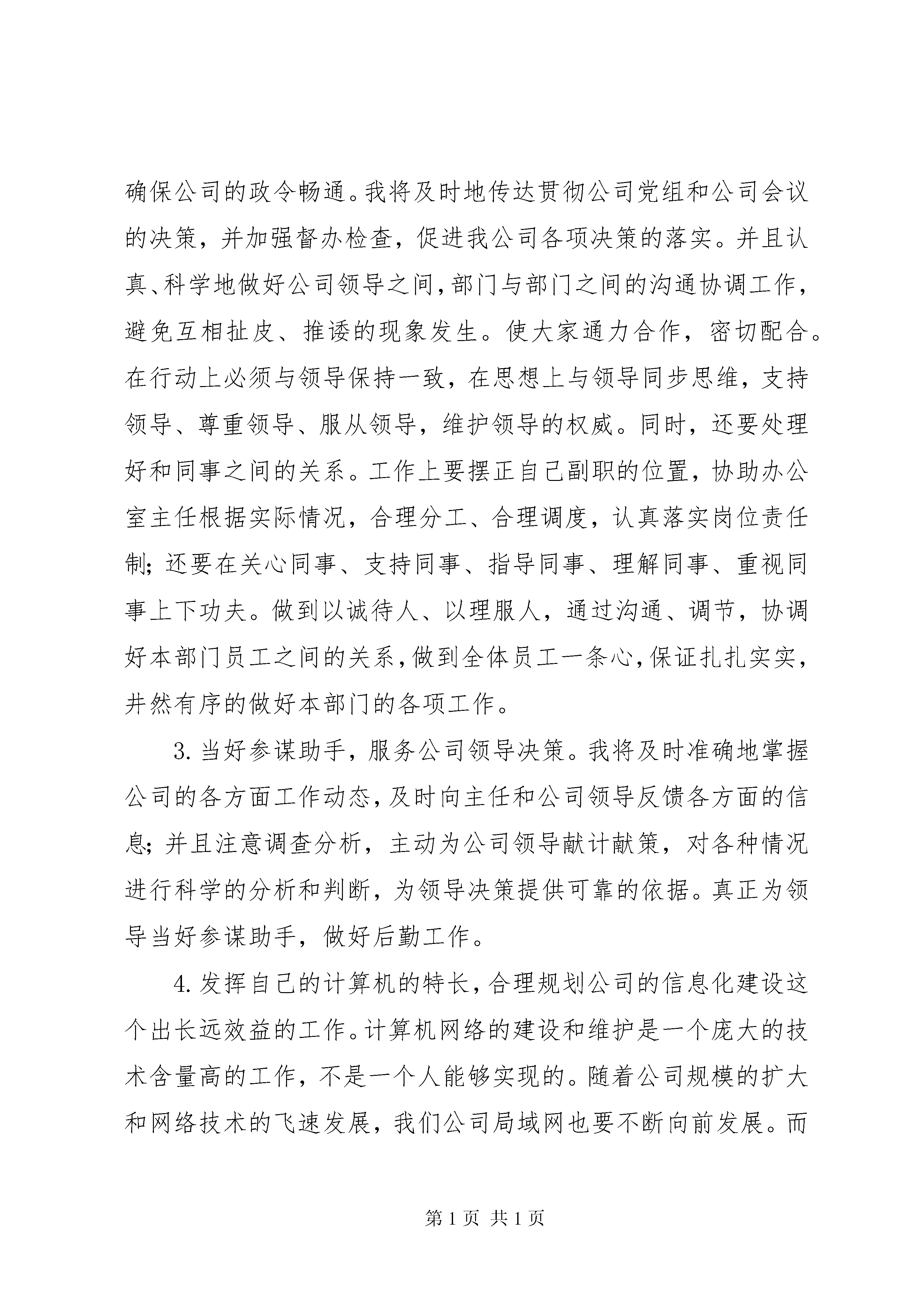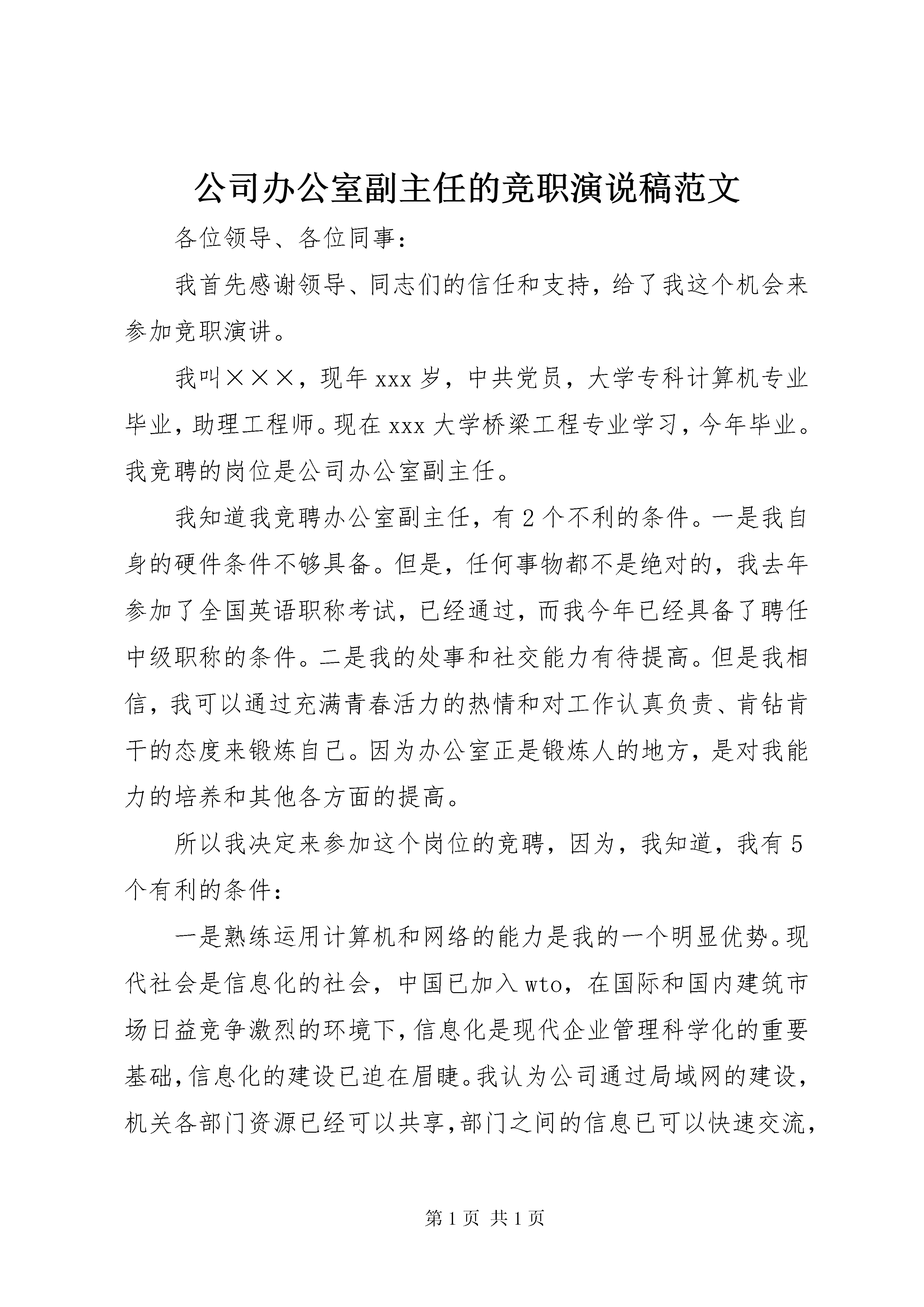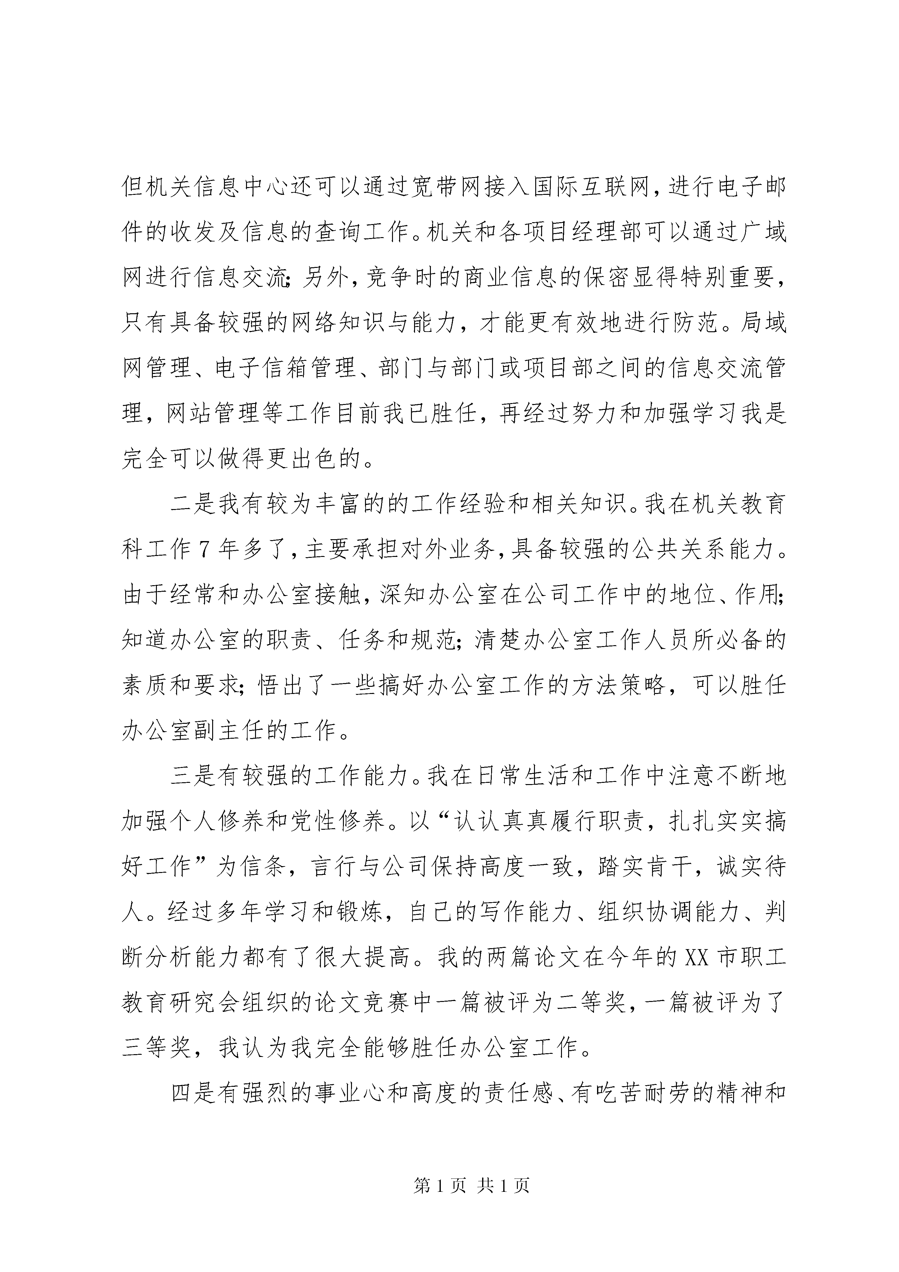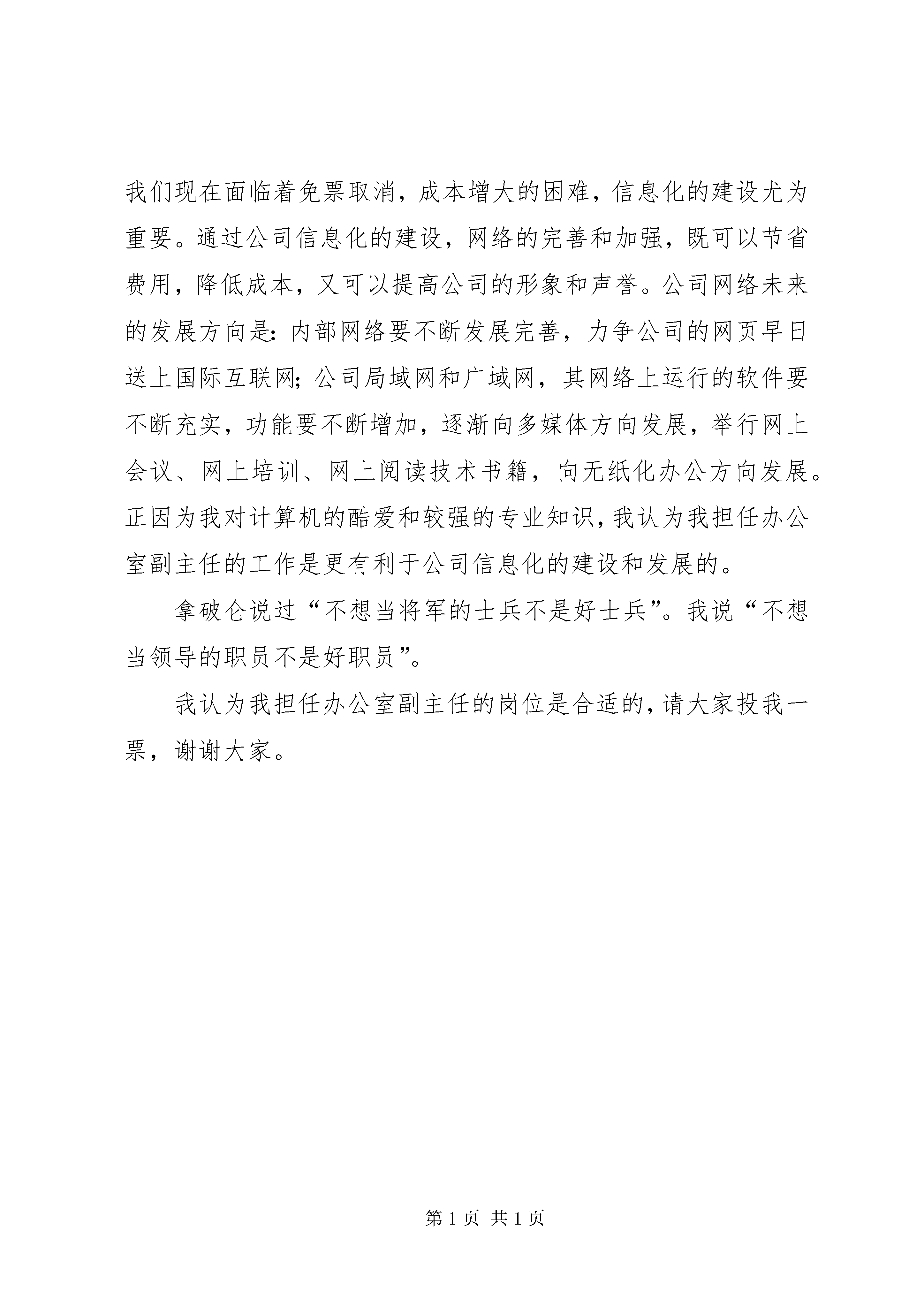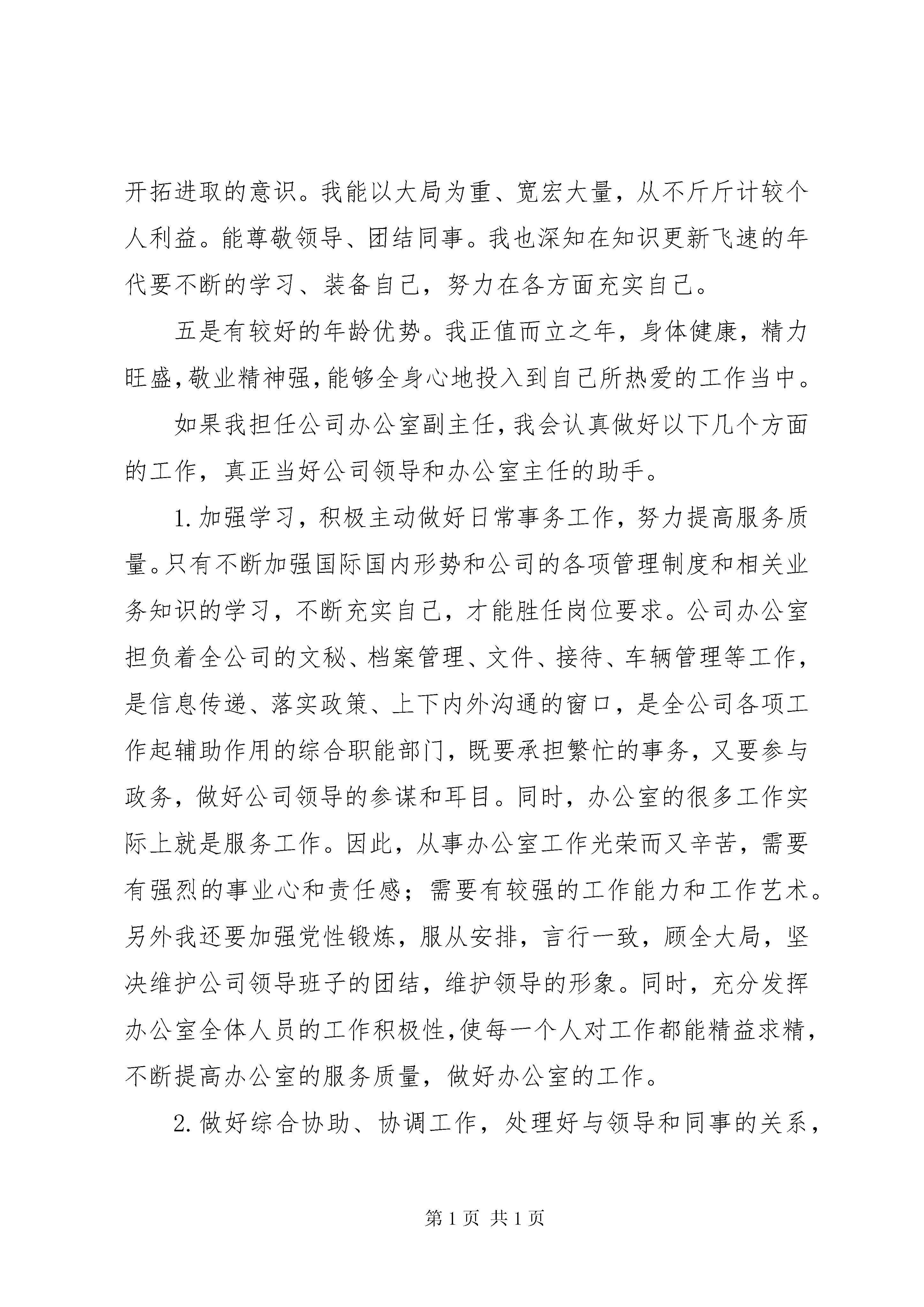 公司办公室副主任的竞职演说稿范文各位领导、各位同事:我首先感谢领导、同志们的信任和支持,给了我这个机会来参加竞职演讲。我叫×××,现年xxx岁,中共党员,大学专科计算机专业毕业,助理工程师。现在xxx大学桥梁工程专业学习,今年毕业。我竞聘的岗位是公司办公室副主任。我知道我竞聘办公室副主任,有2个不利的条件。一是我自身的硬件条件不够具备。但是,任何事物都不是绝对的,我去年参加了全国英语职称考试,已经通过,而我今年已经具备了聘任中级职称的条件。二是我的处事和社交能力有待提高。但是我相信,我可以通过充满青春活力的热情和对工作认真负责、肯钻肯干的态度来锻炼自己。因为办公室正是锻炼人的地方,是对我能力的培养和其他各方面的提高。所以我决定来参加这个岗位的竞聘,因为,我知道,我有5个有利的条件:一是熟练运用计算机和网络的能力是我的一个明显优势。现代社会是信息化的社会,中国已加入wto,在国际和国内建筑市场日益竞争激烈的环境下,信息化是现代企业管理科学化的重要基础,信息化的建设已迫在眉睫。我认为公司通过局域网的建设,机关各部门资源已经可以共享,部门之间的信息已可以快速交流,但机关信息中心还可以通过宽带网接入国际互联网,进行电子邮件的收发及信息的查询工作。机关和各项目经理部可以通过广域网进行信息交流;另外,竞争时的商业信息的保密显得特别重要,只有具备较强的网络知识与能力,才能更有效地进行防范。局域网管理、电子信箱管理、部门与部门或项目部之间的信息交流管理,网站管理等工作目前我已胜任,再经过努力和加强学习我是完全可以做得更出色的。二是我有较为丰富的的工作经验和相关知识。我在机关教育科工作7年多了,主要承担对外业务,具备较强的公共关系能力。由于经常和办公室接触,深知办公室在公司工作中的地位、作用;知道办公室的职责、任务和规范;清楚办公室工作人员所必备的素质和要求;悟出了一些搞好办公室工作的方法策略,可以胜任办公室副主任的工作。三是有较强的工作能力。我在日常生活和工作中注意不断地加强个人修养和党性修养。以“认认真真履行职责,扎扎实实搞好工作”为信条,言行与公司保持高度一致,踏实肯干,诚实待人。经过多年学习和锻炼,自己的写作能力、组织协调能力、判断分析能力都有了很大提高。我的两篇论文在今年的XX市职工教育研究会组织的论文竞赛中一篇被评为二等奖,一篇被评为了三等奖,我认为我完全能够胜任办公室工作。四是有强烈的事业心和高度的责任感、有吃苦耐劳的精神和开拓进取的意识。我能以大局为重、宽宏大量,从不斤斤计较个人利益。能尊敬领导、团结同事。我也深知在知识更新飞速的年代要不断的学习、装备自己,努力在各方面充实自己。五是有较好的年龄优势。我正值而立之年,身体健康,精力旺盛,敬业精神强,能够全身心地投入到自己所热爱的工作当中。如果我担任公司办公室副主任,我会认真做好以下几个方面的工作,真正当好公司领导和办公室主任的助手。1.加强学习,积极主动做好日常事务工作,努力提高服务质量。只有不断加强国际国内形势和公司的各项管理制度和相关业务知识的学习,不断充实自己,才能胜任岗位要求。公司办公室担负着全公司的文秘、档案管理、文件、接待、车辆管理等工作,是信息传递、落实政策、上下内外沟通的窗口,是全公司各项工作起辅助作用的综合职能部门,既要承担繁忙的事务,又要参与政务,做好公司领导的参谋和耳目。同时,办公室的很多工作实际上就是服务工作。因此,从事办公室工作光荣而又辛苦,需要有强烈的事业心和责任感;需要有较强的工作能力和工作艺术。另外我还要加强党性锻炼,服从安排,言行一致,顾全大局,坚决维护公司领导班子的团结,维护领导的形象。同时,充分发挥办公室全体人员的工作积极性,使每一个人对工作都能精益求精,不断提高办公室的服务质量,做好办公室的工作。2.做好综合协助、协调工作,处理好与领导和同事的关系,确保公司的政令畅通。我将及时地传达贯彻公司党组和公司会议的决策,并加强督办检查,促进我公司各项决策的落实。并且认真、科学地做好公司领导之间,部门与部门之间的沟通协调工作,避免互相扯皮、推诿的现象发生。使大家通力合作,密切配合。在行动上必须与领导保持一致,在思想上与领导同步思维,支持领导、尊重领导、服从领导,维护领导的权威。同时,还要处理好和同事之间的关系。工作上要摆正自己副职的位置,协助办公室主任根据实际情况,合理分工、合理调度,认真落实岗位责任制;还要在关心同事、支持同事、指导同事、理解同事、重视同事上下功夫。做到以诚待人、以理服人,通过沟通、调节,协调好本部门员工之间的关系,做到全体员工一条心,保证扎扎实实,井然有序的做好本部门的各项工作。3.当好参谋助手,服务公司领导决策。我将及时准确地掌握公司的各方面工作动态,及时向主任和公司领导反馈各方面的信息;并且注意调查分