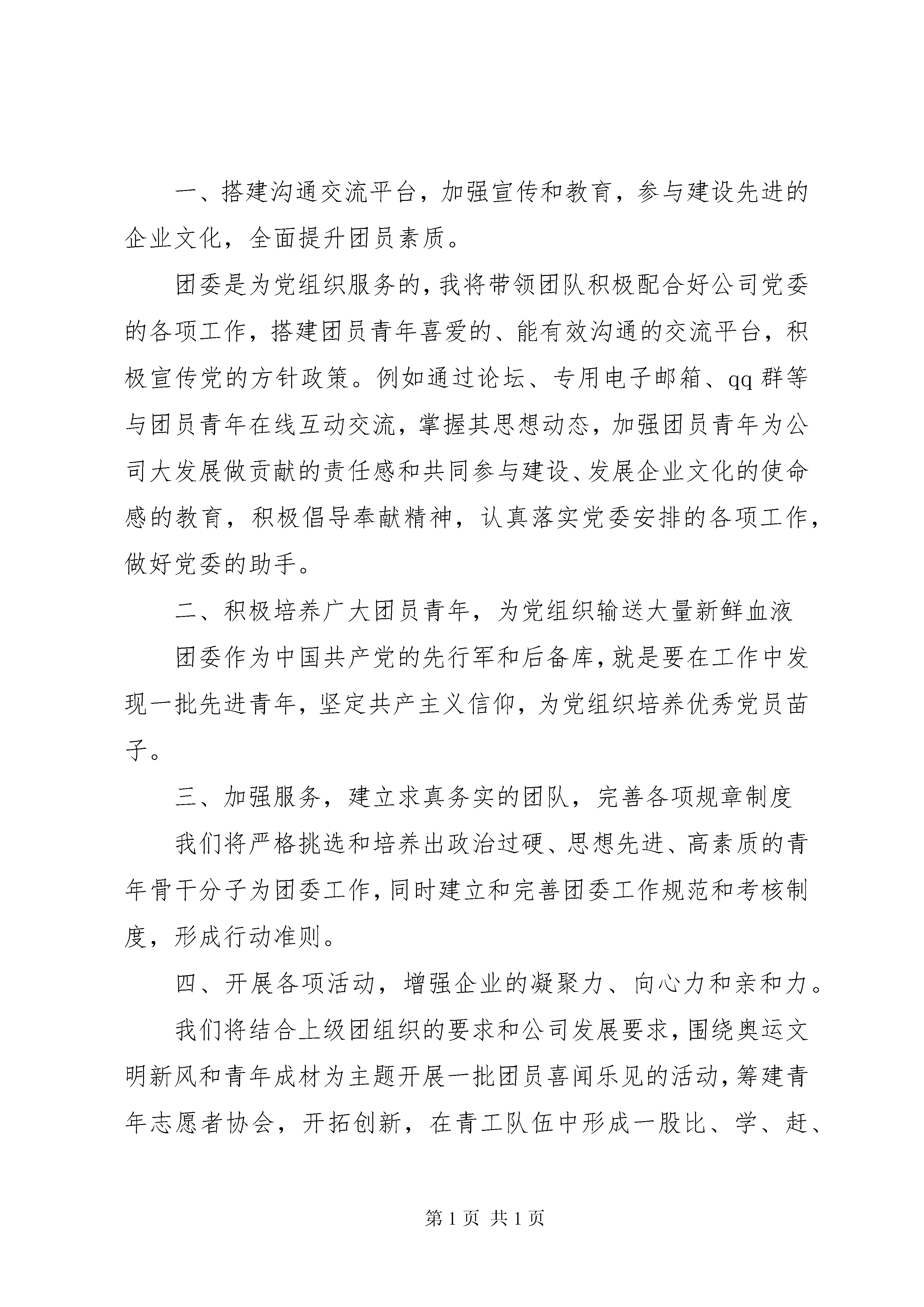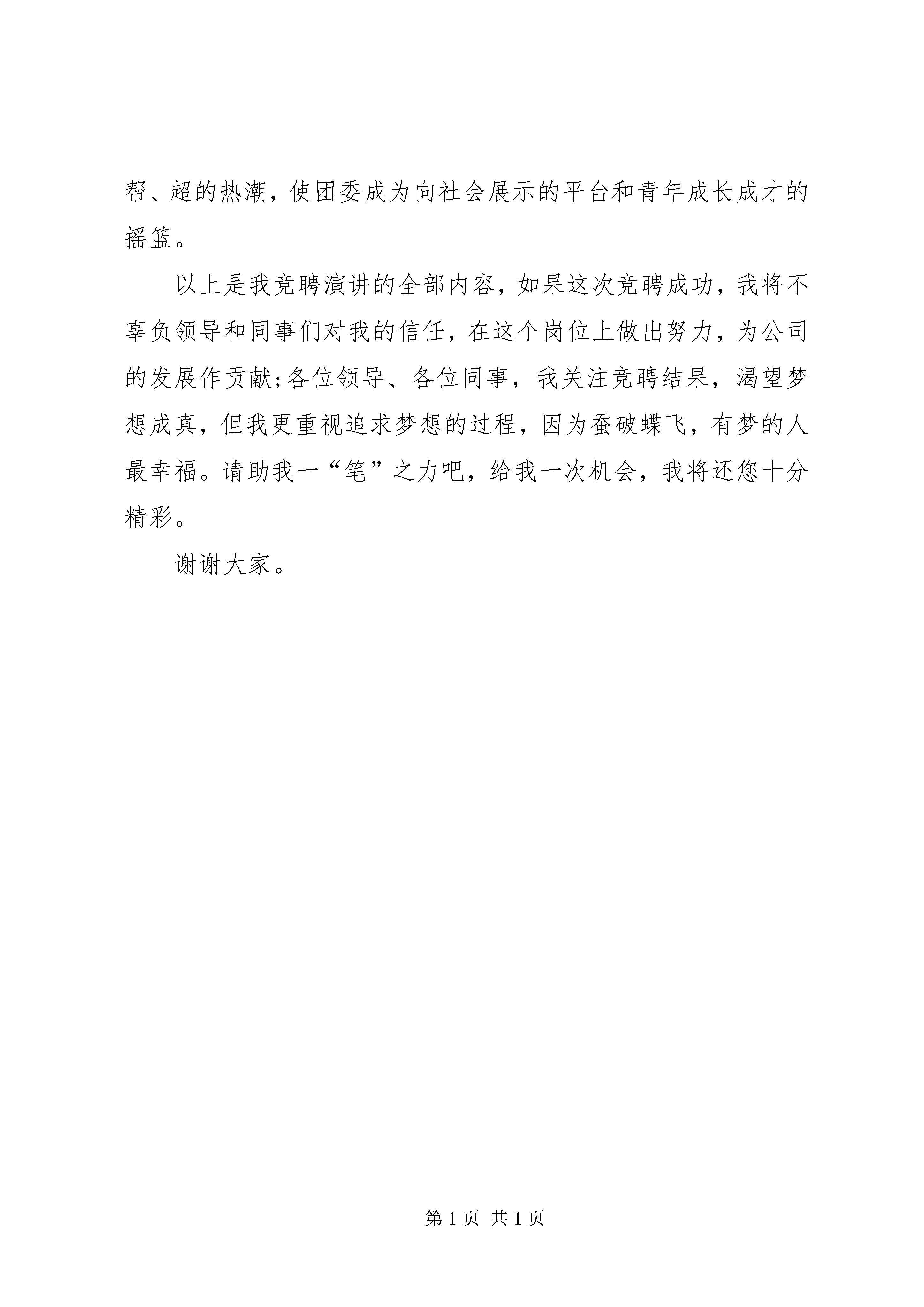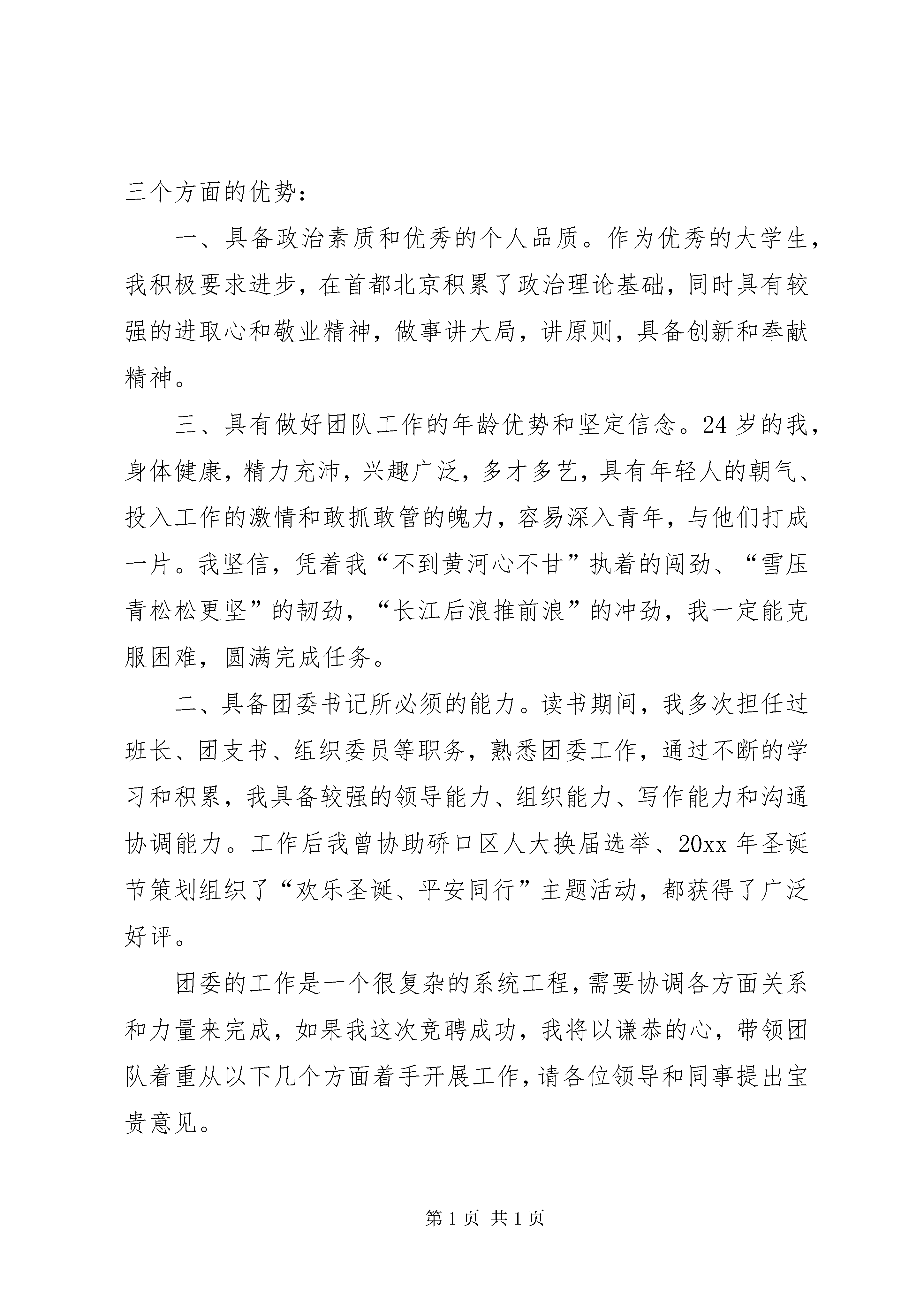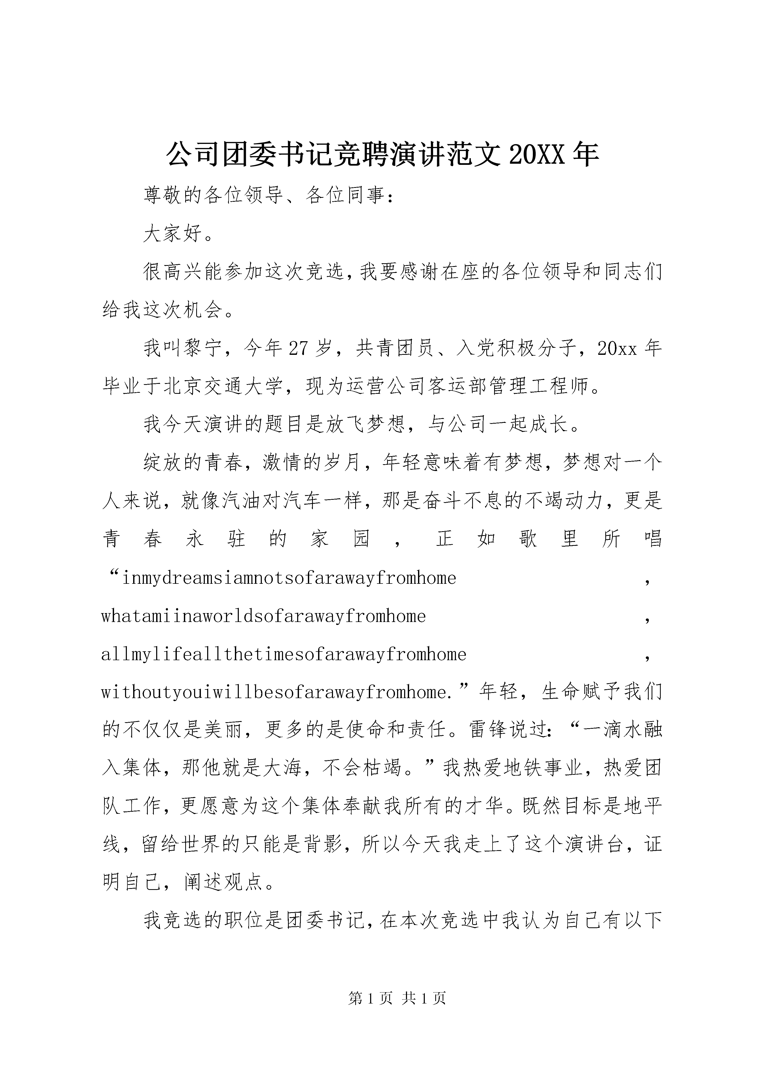 公司团委书记竞聘演讲范文20XX年尊敬的各位领导、各位同事:大家好。很高兴能参加这次竞选,我要感谢在座的各位领导和同志们给我这次机会。我叫黎宁,今年27岁,共青团员、入党积极分子,20xx年毕业于北京交通大学,现为运营公司客运部管理工程师。我今天演讲的题目是放飞梦想,与公司一起成长。绽放的青春,激情的岁月,年轻意味着有梦想,梦想对一个人来说,就像汽油对汽车一样,那是奋斗不息的不竭动力,更是青春永驻的家园,正如歌里所唱“inmydreamsiamnotsofarawayfromhome,whatamiinaworldsofarawayfromhome,allmylifeallthetimesofarawayfromhome,withoutyouiwillbesofarawayfromhome.”年轻,生命赋予我们的不仅仅是美丽,更多的是使命和责任。雷锋说过:“一滴水融入集体,那他就是大海,不会枯竭。”我热爱地铁事业,热爱团队工作,更愿意为这个集体奉献我所有的才华。既然目标是地平线,留给世界的只能是背影,所以今天我走上了这个演讲台,证明自己,阐述观点。我竞选的职位是团委书记,在本次竞选中我认为自己有以下三个方面的优势:一、具备政治素质和优秀的个人品质。作为优秀的大学生,我积极要求进步,在首都北京积累了政治理论基础,同时具有较强的进取心和敬业精神,做事讲大局,讲原则,具备创新和奉献精神。三、具有做好团队工作的年龄优势和坚定信念。24岁的我,身体健康,精力充沛,兴趣广泛,多才多艺,具有年轻人的朝气、投入工作的激情和敢抓敢管的魄力,容易深入青年,与他们打成一片。我坚信,凭着我“不到黄河心不甘”执着的闯劲、“雪压青松松更坚”的韧劲,“长江后浪推前浪”的冲劲,我一定能克服困难,圆满完成任务。二、具备团委书记所必须的能力。读书期间,我多次担任过班长、团支书、组织委员等职务,熟悉团委工作,通过不断的学习和积累,我具备较强的领导能力、组织能力、写作能力和沟通协调能力。工作后我曾协助硚口区人大换届选举、20xx年圣诞节策划组织了“欢乐圣诞、平安同行”主题活动,都获得了广泛好评。团委的工作是一个很复杂的系统工程,需要协调各方面关系和力量来完成,如果我这次竞聘成功,我将以谦恭的心,带领团队着重从以下几个方面着手开展工作,请各位领导和同事提出宝贵意见。一、搭建沟通交流平台,加强宣传和教育,参与建设先进的企业文化,全面提升团员素质。团委是为党组织服务的,我将带领团队积极配合好公司党委的各项工作,搭建团员青年喜爱的、能有效沟通的交流平台,积极宣传党的方针政策。例如通过论坛、专用电子邮箱、qq群等与团员青年在线互动交流,掌握其思想动态,加强团员青年为公司大发展做贡献的责任感和共同参与建设、发展企业文化的使命感的教育,积极倡导奉献精神,认真落实党委安排的各项工作,做好党委的助手。二、积极培养广大团员青年,为党组织输送大量新鲜血液团委作为中国共产党的先行军和后备库,就是要在工作中发现一批先进青年,坚定共产主义信仰,为党组织培养优秀党员苗子。三、加强服务,建立求真务实的团队,完善各项规章制度我们将严格挑选和培养出政治过硬、思想先进、高素质的青年骨干分子为团委工作,同时建立和完善团委工作规范和考核制度,形成行动准则。四、开展各项活动,增强企业的凝聚力、向心力和亲和力。我们将结合上级团组织的要求和公司发展要求,围绕奥运文明新风和青年成材为主题开展一批团员喜闻乐见的活动,筹建青年志愿者协会,开拓创新,在青工队伍中形成一股比、学、赶、帮、超的热潮,使团委成为向社会展示的平台和青年成长成才的摇篮。以上是我竞聘演讲的全部内容,如果这次竞聘成功,我将不辜负领导和同事们对我的信任,在这个岗位上做出努力,为公司的发展作贡献;各位领导、各位同事,我关注竞聘结果,渴望梦想成真,但我更重视追求梦想的过程,因为蚕破蝶飞,有梦的人最幸福。请助我一“笔”之力吧,给我一次机会,我将还您十分精彩。谢谢大家。