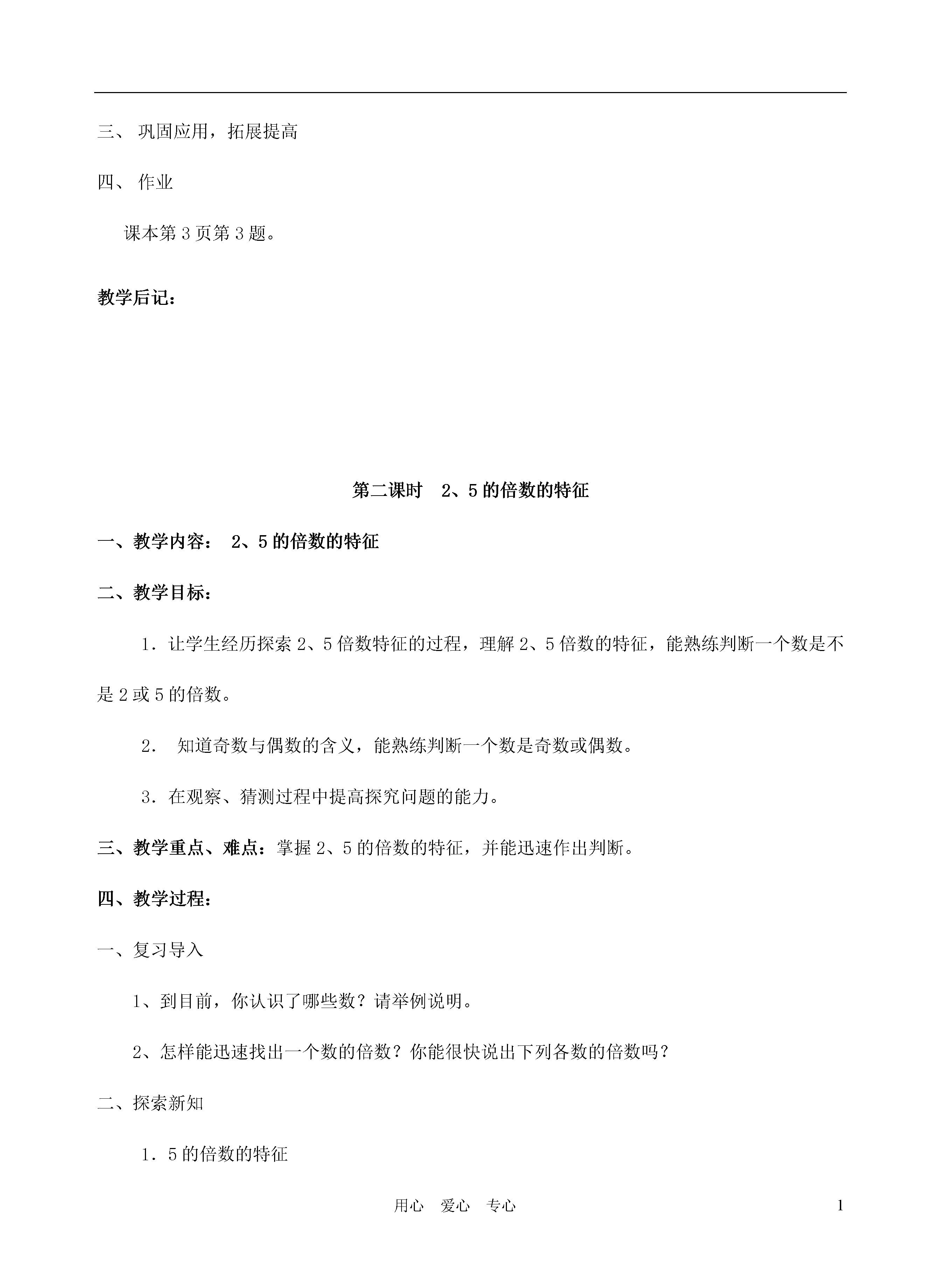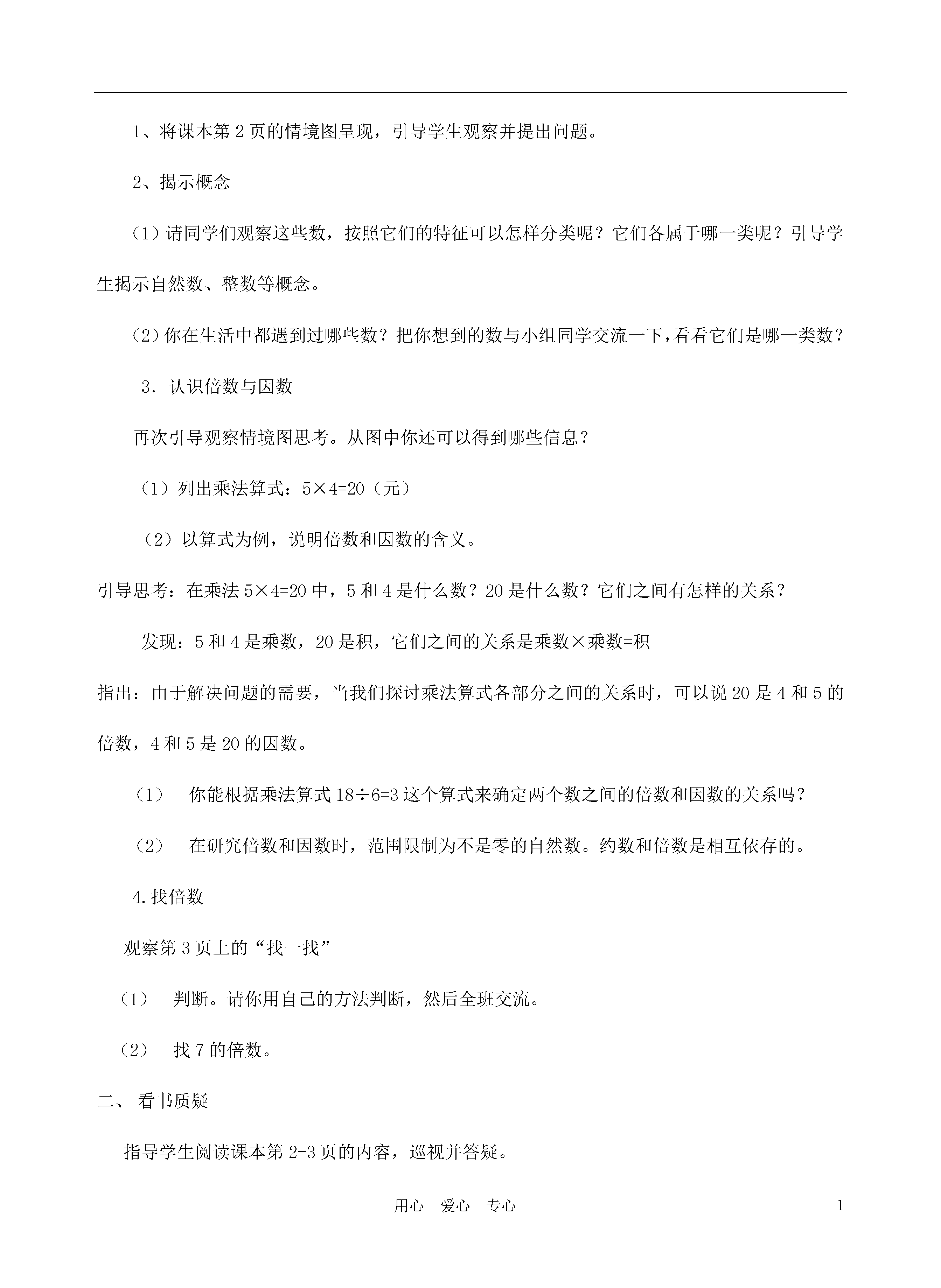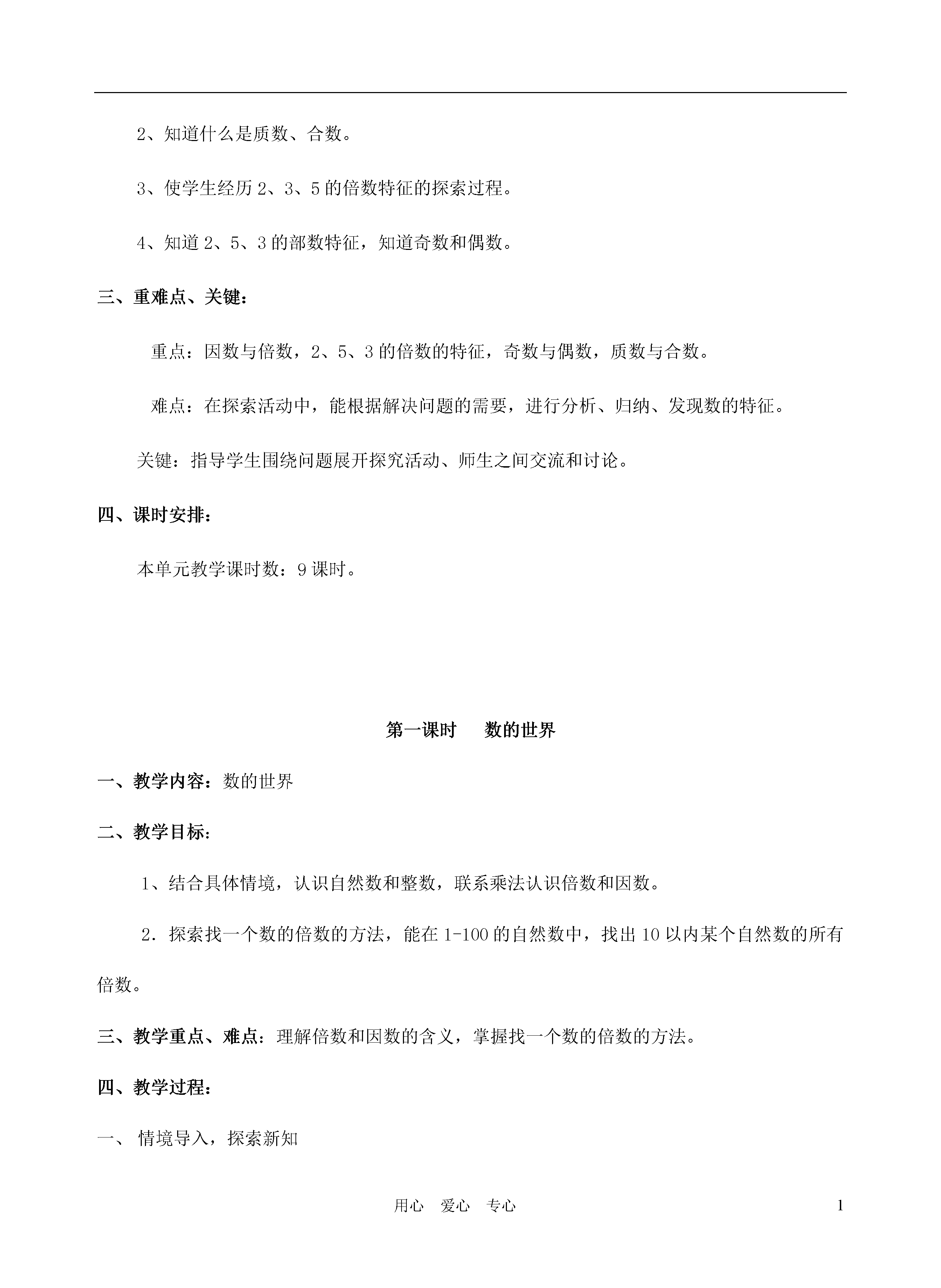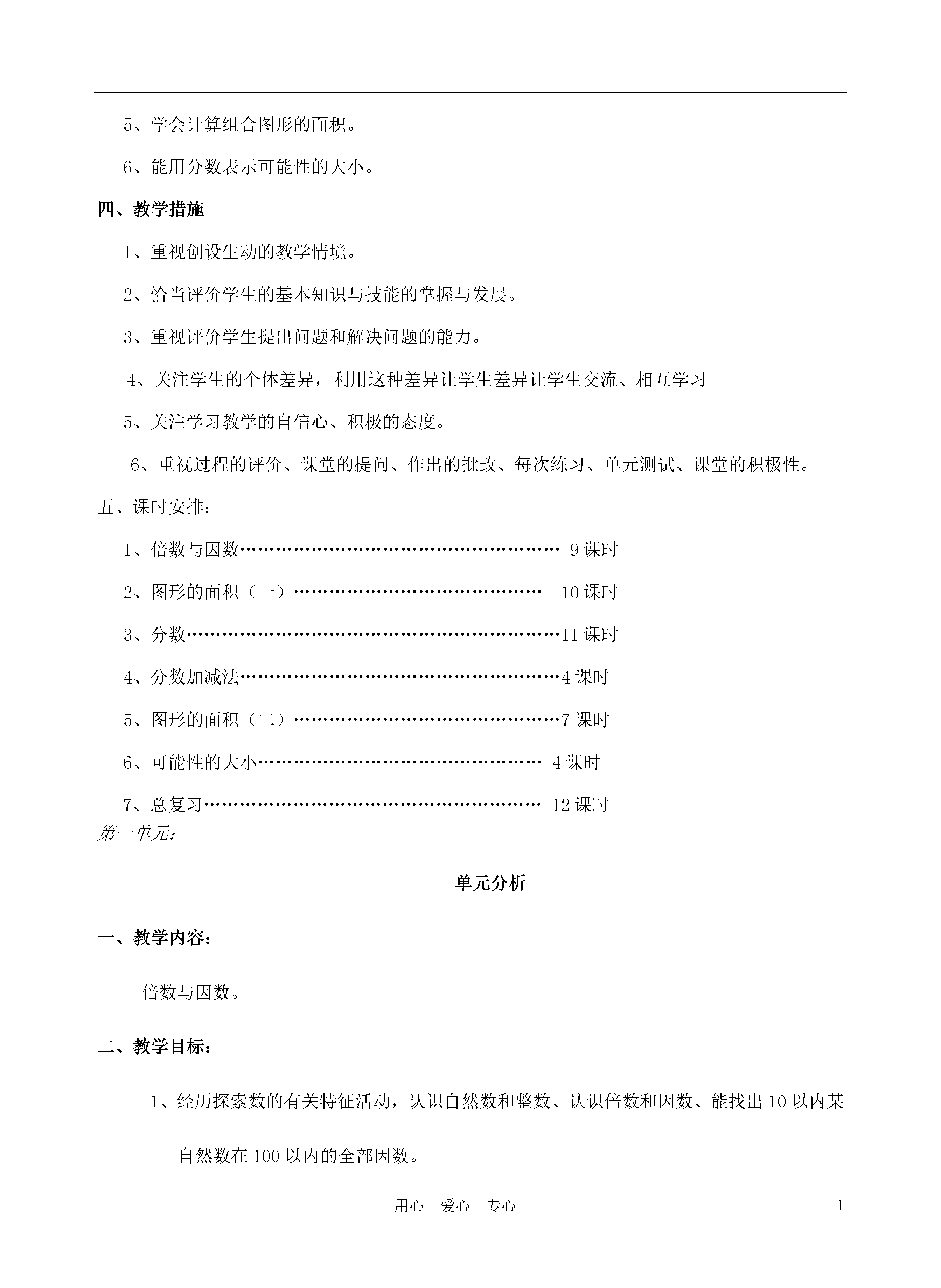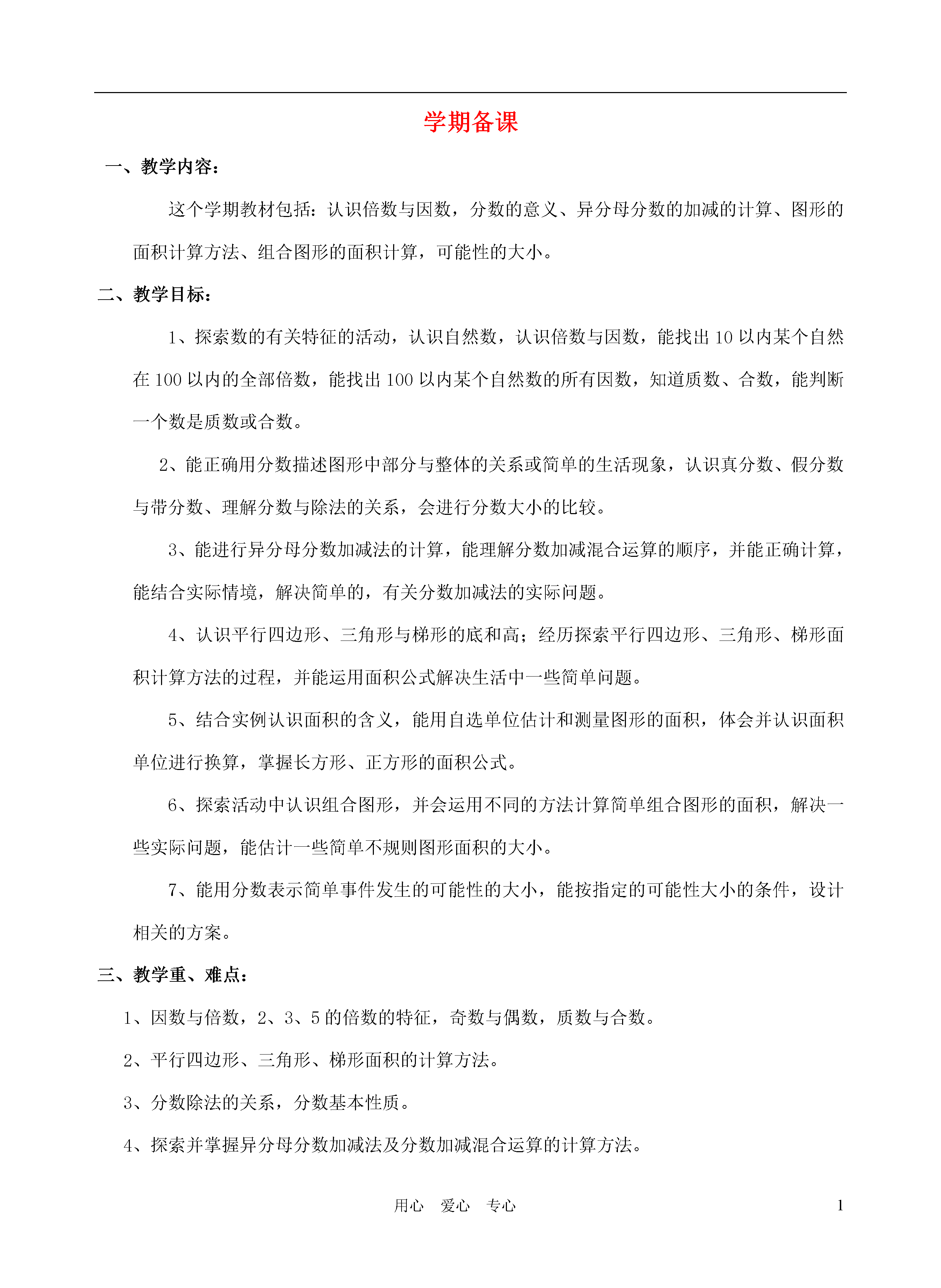 1用心爱心专心学期备课一、教学内容:这个学期教材包括:认识倍数与因数,分数的意义、异分母分数的加减的计算、图形的面积计算方法、组合图形的面积计算,可能性的大小。二、教学目标:1、探索数的有关特征的活动,认识自然数,认识倍数与因数,能找出10以内某个自然在100以内的全部倍数,能找出100以内某个自然数的所有因数,知道质数、合数,能判断一个数是质数或合数。2、能正确用分数描述图形中部分与整体的关系或简单的生活现象,认识真分数、假分数与带分数、理解分数与除法的关系,会进行分数大小的比较。3、能进行异分母分数加减法的计算,能理解分数加减混合运算的顺序,并能正确计算,能结合实际情境,解决简单的,有关分数加减法的实际问题。4、认识平行四边形、三角形与梯形的底和高;经历探索平行四边形、三角形、梯形面积计算方法的过程,并能运用面积公式解决生活中一些简单问题。5、结合实例认识面积的含义,能用自选单位估计和测量图形的面积,体会并认识面积单位进行换算,掌握长方形、正方形的面积公式。6、探索活动中认识组合图形,并会运用不同的方法计算简单组合图形的面积,解决一些实际问题,能估计一些简单不规则图形面积的大小。7、能用分数表示简单事件发生的可能性的大小,能按指定的可能性大小的条件,设计相关的方案。三、教学重、难点:1、因数与倍数,2、3、5的倍数的特征,奇数与偶数,质数与合数。2、平行四边形、三角形、梯形面积的计算方法。3、分数除法的关系,分数基本性质。4、探索并掌握异分母分数加减法及分数加减混合运算的计算方法。5、学会计算组合图形的面积。6、能用分数表示可能性的大小。四、教学措施1、重视创设生动的教学情境。2、恰当评价学生的基本知识与技能的掌握与发展。3、重视评价学生提出问题和解决问题的能力。4、关注学生的个体差异,利用这种差异让学生差异让学生交流、相互学习5、关注学习教学的自信心、积极的态度。6、重视过程的评价、课堂的提问、作出的批改、每次练习、单元测试、课堂的积极性。五、课时安排:1、倍数与因数………………………………………………9课时2、图形的面积(一)……………………………………10课时3、分数………………………………………………………11课时4、分数加减法………………………………………………4课时5、图形的面积(二)………………………………………7课时6、可能性的大小…………………………………………4课时7、总复习…………………………………………………12课时第一单元:单元分析一、教学内容:倍数与因数。二、教学目标:1、经历探索数的有关特征活动,认识自然数和整数、认识倍数和因数、能找出10以内某自然数在100以内的全部因数。2、知道什么是质数、合数。3、使学生经历2、3、5的倍数特征的探索过程。4、知道2、5、3的部数特征,知道奇数和偶数。三、重难点、关键:重点:因数与倍数,2、5、3的倍数的特征,奇数与偶数,质数与合数。难点:在探索活动中,能根据解决问题的需要,进行分析、归纳、发现数的特征。关键:指导学生围绕问题展开探究活动、师生之间交流和讨论。四、课时安排:本单元教学课时数:9课时。第一课时数的世界一、教学内容:数的世界二、教学目标:1、结合具体情境,认识自然数和整数,联系乘法认识倍数和因数。2.探索找一个数的倍数的方法,能在1-100的自然数中,找出10以内某个自然数的所有倍数。三、教学重点、难点:理解倍数和因数的含义,掌握找一个数的倍数的方法。四、教学过程:情境导入,探索新知1、将课本的情境图呈现,引导学生观察并提出问题。2、揭示概念(1)请同学们观察这些数,按照它们的特征可以怎样分类呢?它们各属于哪一类呢?引导学生揭示自然数、整数等概念。(2)你在生活中都遇到过哪些数?把你想到的数与小组同学交流一下,看看它们是哪一类数?3.认识倍数与因数再次引导观察情境图思考。从图中你还可以得到哪些信息?(1)列出乘法算式:5×4=20(元)(2)以算式为例,说明倍数和因数的含义。引导思考:在乘法5×4=20中,5和4是什么数?20是什么数?它们之间有怎样的关系?发现:5和4是乘数,20是积,它们之间的关系是乘数×乘数=积指出:由于解决问题的需要,当我们探讨乘法算式各部分之间的关系时,可以说20是4和5的倍数,4和5是20的因数。你能根据乘法算式18÷6=3这个算式来确定两个数之间的倍数和因数的关系吗?在研究倍数和因数时,范围限制为不是零的自然数。约数和倍数是相互依存的。4.找倍数观察上的“找一找”判断。请你用自己的方法判断,然后全班交流。找7的倍数。看书质疑指导学生阅读