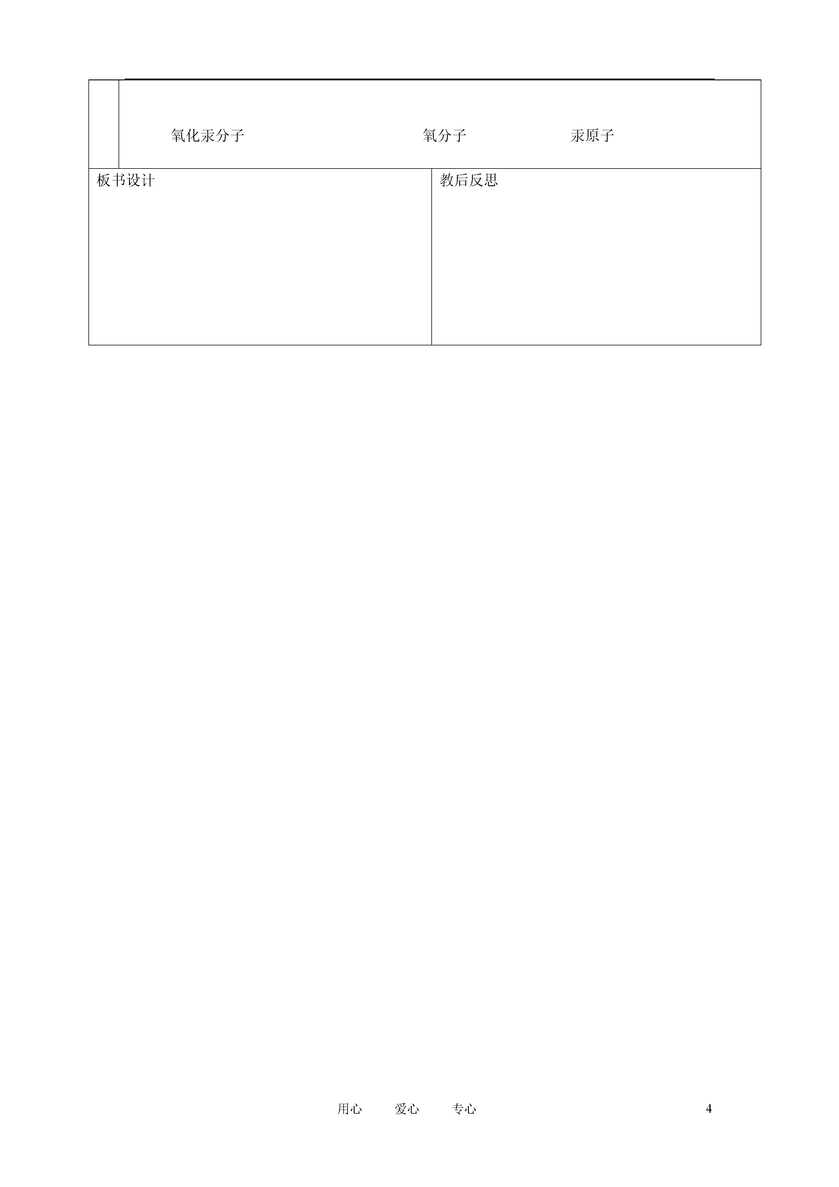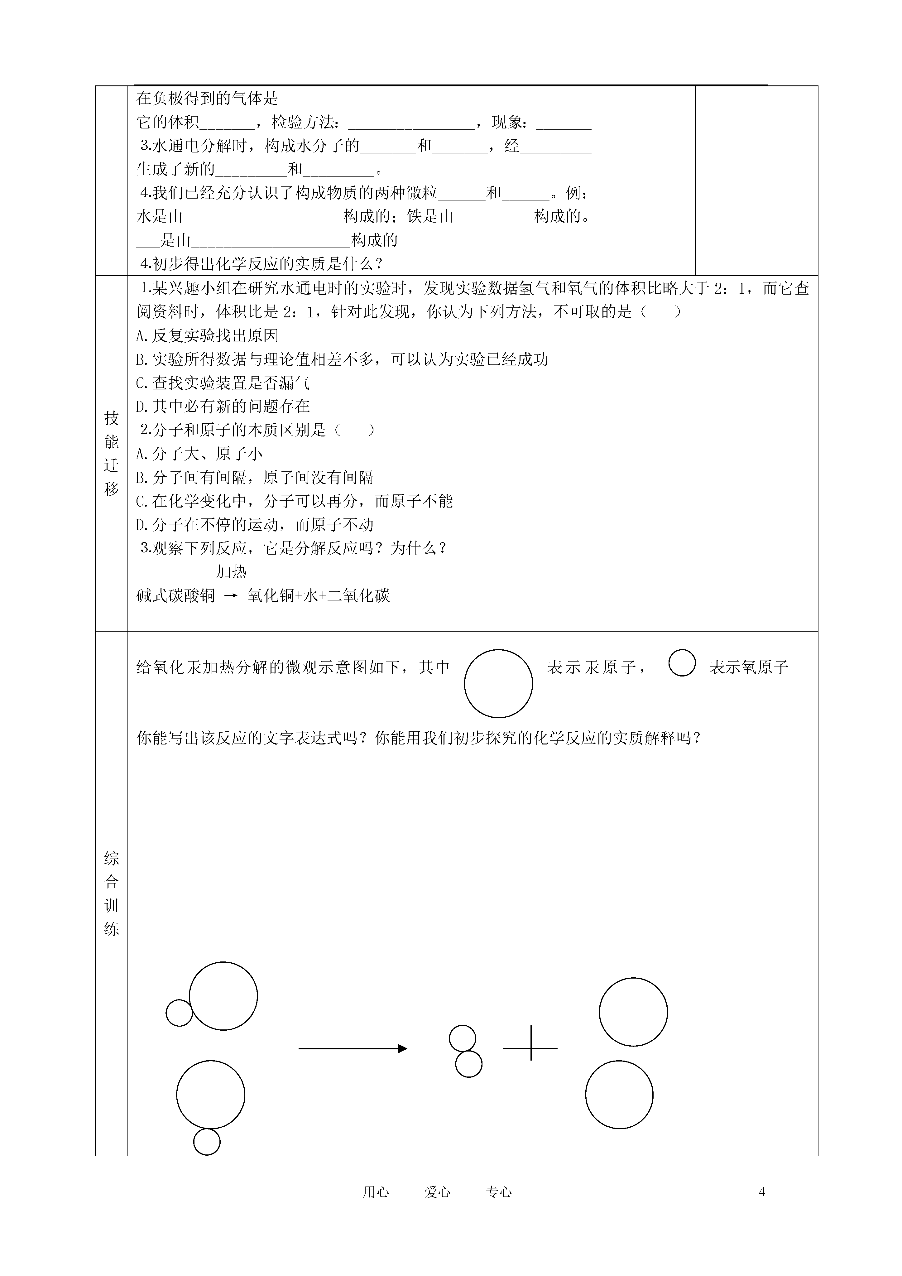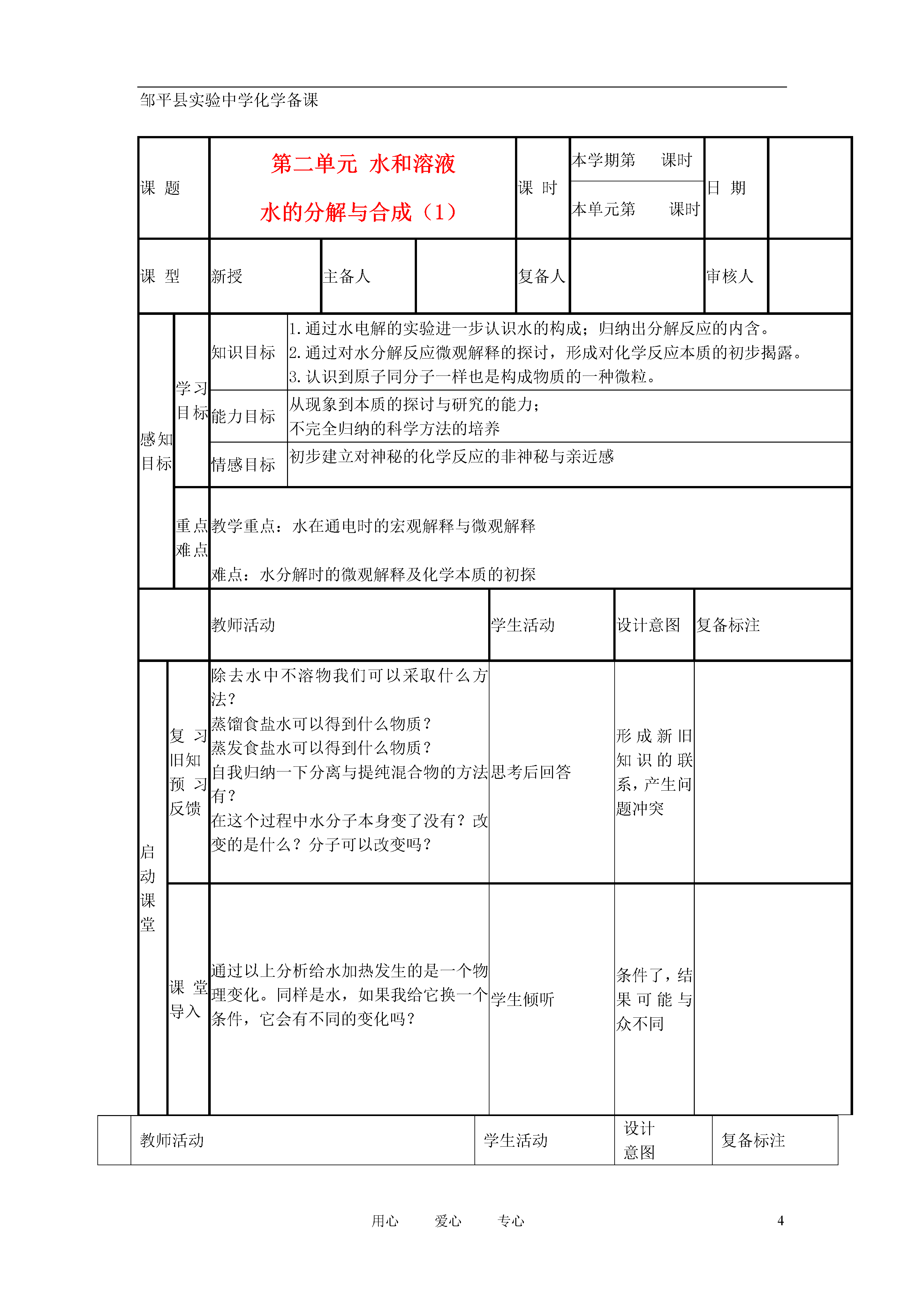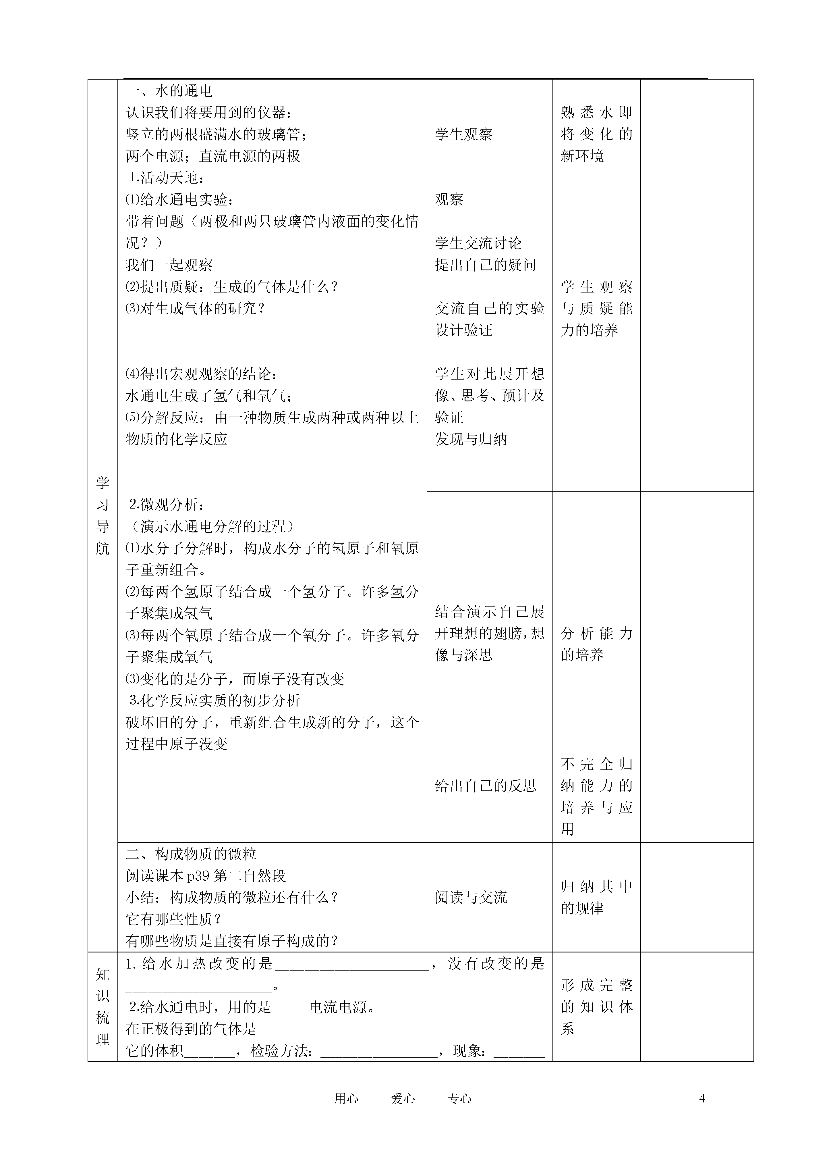 4用心爱心专心课题第二单元水和溶液水的分解与合成(1)课时本学期第课时日期本单元第课时课型新授主备人复备人审核人感知目标学习目标知识目标1.通过水电解的实验进一步认识水的构成;归纳出分解反应的内含。2.通过对水分解反应微观解释的探讨,形成对化学反应本质的初步揭露。3.认识到原子同分子一样也是构成物质的一种微粒。能力目标从现象到本质的探讨与研究的能力;不完全归纳的科学方法的培养情感目标初步建立对神秘的化学反应的非神秘与亲近感重点难点教学重点:水在通电时的宏观解释与微观解释难点:水分解时的微观解释及化学本质的初探教师活动学生活动设计意图复备标注启动课堂复习旧知预习反馈除去水中不溶物我们可以采取什么方法?蒸馏食盐水可以得到什么物质?蒸发食盐水可以得到什么物质?自我归纳一下分离与提纯混合物的方法有?在这个过程中水分子本身变了没有?改变的是什么?分子可以改变吗?思考后回答形成新旧知识的联系,产生问题冲突课堂导入通过以上分析给水加热发生的是一个物理变化。同样是水,如果我给它换一个条件,它会有不同的变化吗?学生倾听条件了,结果可能与众不同邹平县实验中学化学备课教师活动学生活动设计意图复备标注学习导航一、水的通电认识我们将要用到的仪器:竖立的两根盛满水的玻璃管;两个电源;直流电源的两极⒈活动天地:⑴给水通电实验:带着问题(两极和两只玻璃管内液面的变化情况?)我们一起观察⑵提出质疑:生成的气体是什么?⑶对生成气体的研究?⑷得出宏观观察的结论:水通电生成了氢气和氧气;⑸分解反应:由一种物质生成两种或两种以上物质的化学反应⒉微观分析:(演示水通电分解的过程)⑴水分子分解时,构成水分子的氢原子和氧原子重新组合。⑵每两个氢原子结合成一个氢分子。许多氢分子聚集成氢气⑶每两个氧原子结合成一个氧分子。许多氧分子聚集成氧气⑶变化的是分子,而原子没有改变⒊化学反应实质的初步分析破坏旧的分子,重新组合生成新的分子,这个过程中原子没变学生观察观察学生交流讨论提出自己的疑问交流自己的实验设计验证学生对此展开想像、思考、预计及验证发现与归纳熟悉水即将变化的新环境学生观察与质疑能力的培养结合演示自己展开理想的翅膀,想像与深思给出自己的反思分析能力的培养不完全归纳能力的培养与应用二、构成物质的微粒阅读课本p39第二自然段小结:构成物质的微粒还有什么?它有哪些性质?有哪些物质是直接有原子构成的?阅读与交流归纳其中的规律知识梳理1.给水加热改变的是_____________________,没有改变的是____________________。⒉给水通电时,用的是_____电流电源。在正极得到的气体是______它的体积_______,检验方法:________________,现象:_______在负极得到的气体是______它的体积_______,检验方法:________________,现象:_______⒊水通电分解时,构成水分子的_______和_______,经_________生成了新的_________和_________。⒋我们已经充分认识了构成物质的两种微粒______和______。例:水是由____________________构成的;铁是由__________构成的。___是由____________________构成的⒋初步得出化学反应的实质是什么?形成完整的知识体系技能迁移⒈某兴趣小组在研究水通电时的实验时,发现实验数据氢气和氧气的体积比略大于2:1,而它查阅资料时,体积比是2:1,针对此发现,你认为下列方法,不可取的是()A.反复实验找出原因B.实验所得数据与理论值相差不多,可以认为实验已经成功C.查找实验装置是否漏气D.其中必有新的问题存在⒉分子和原子的本质区别是()A.分子大、原子小B.分子间有间隔,原子间没有间隔C.在化学变化中,分子可以再分,而原子不能D.分子在不停的运动,而原子不动⒊观察下列反应,它是分解反应吗?为什么?加热碱式碳酸铜→氧化铜+水+二氧化碳综合训练给氧化汞加热分解的微观示意图如下,其中表示汞原子,表示氧原子你能写出该反应的文字表达式吗?你能用我们初步探究的化学反应的实质解释吗?氧化汞分子氧分子汞原子板书设计教后反思
