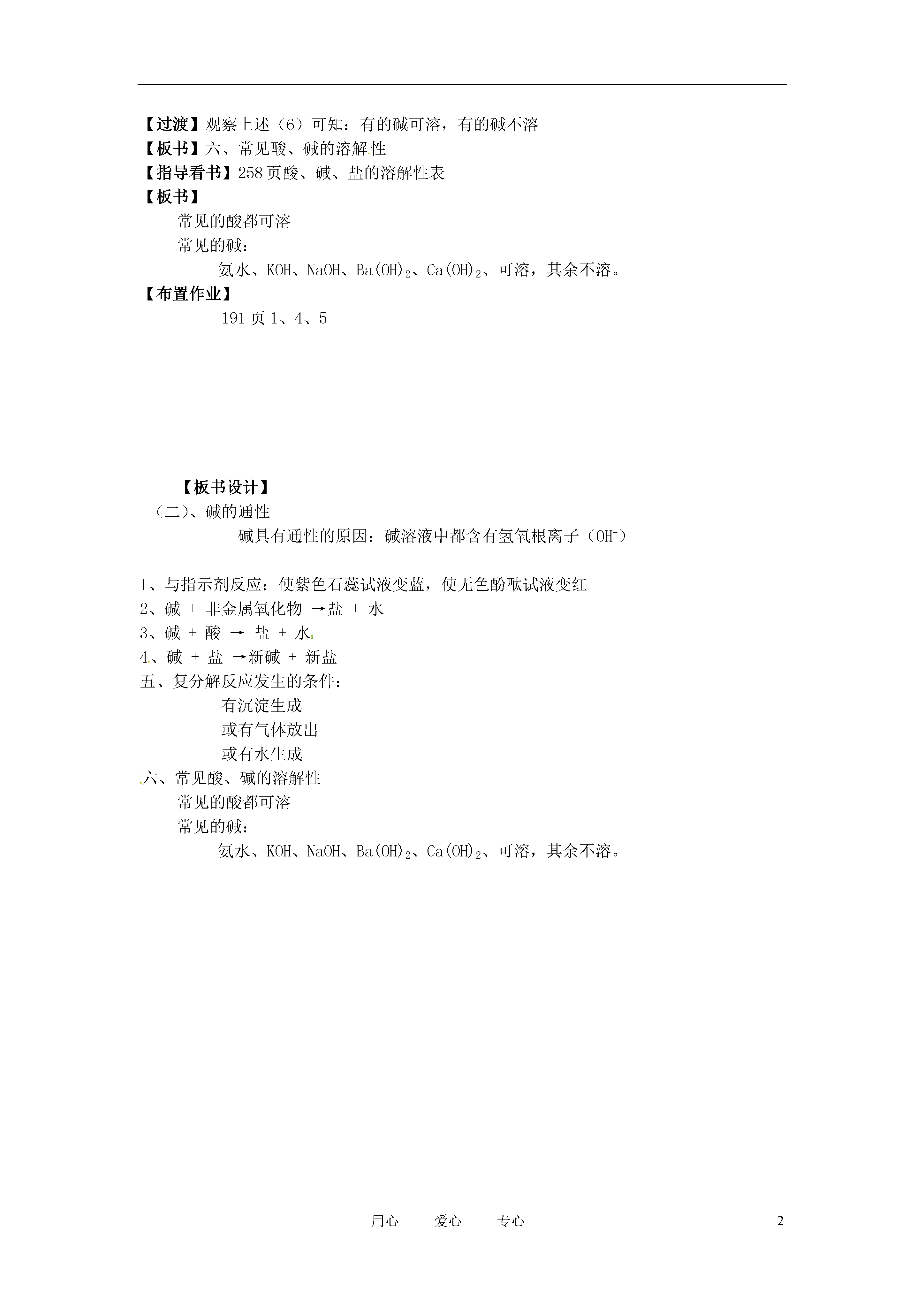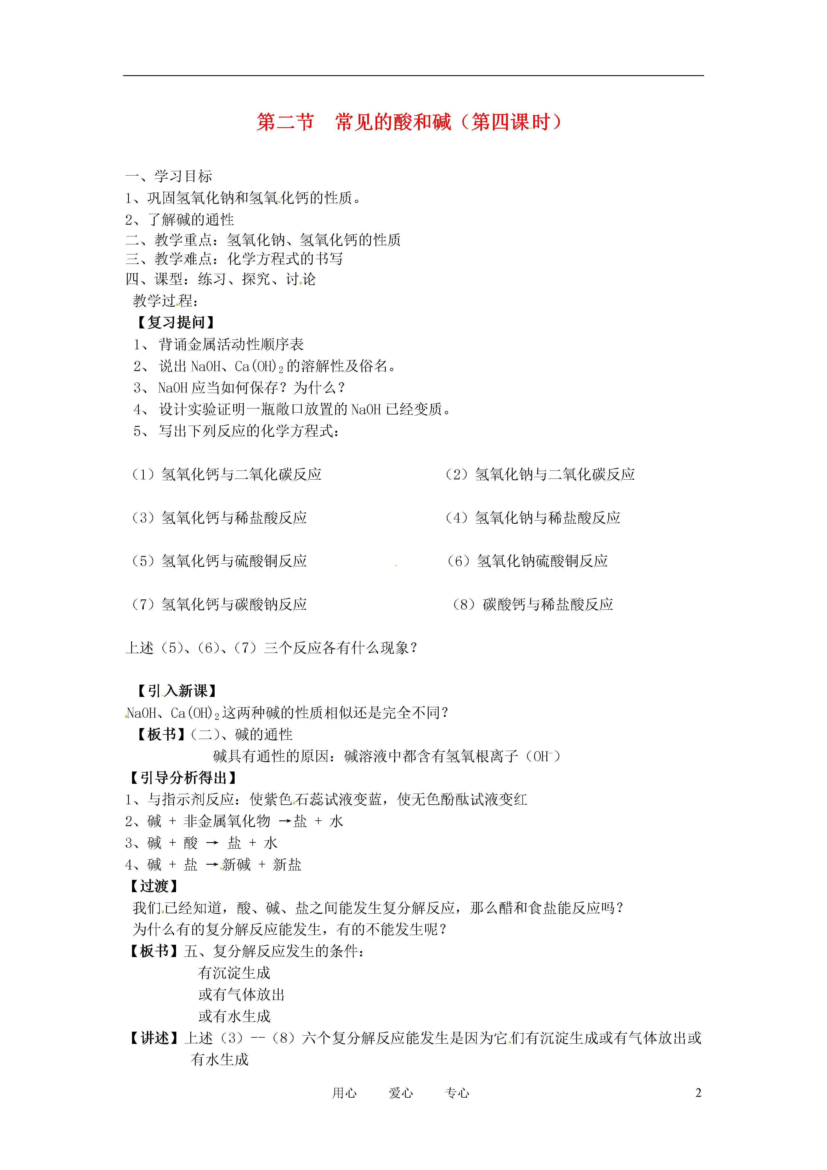 2用心爱心专心第二节常见的酸和碱(第四课时)一、学习目标1、巩固氢氧化钠和氢氧化钙的性质。2、了解碱的通性二、教学重点:氢氧化钠、氢氧化钙的性质三、教学难点:化学方程式的书写四、课型:练习、探究、讨论教学过程:【复习提问】背诵金属活动性顺序表说出Na0H、Ca(OH)2的溶解性及俗名。Na0H应当如何保存?为什么?设计实验证明一瓶敞口放置的Na0H已经变质。写出下列反应的化学方程式:(1)氢氧化钙与二氧化碳反应(2)氢氧化钠与二氧化碳反应(3)氢氧化钙与稀盐酸反应(4)氢氧化钠与稀盐酸反应(5)氢氧化钙与硫酸铜反应(6)氢氧化钠硫酸铜反应(7)氢氧化钙与碳酸钠反应(8)碳酸钙与稀盐酸反应上述(5)、(6)、(7)三个反应各有什么现象?【引入新课】Na0H、Ca(OH)2这两种碱的性质相似还是完全不同?【板书】(二)、碱的通性碱具有通性的原因:碱溶液中都含有氢氧根离子(OH-)【引导分析得出】1、与指示剂反应:使紫色石蕊试液变蓝,使无色酚酞试液变红2、碱+非金属氧化物→盐+水3、碱+酸→盐+水4、碱+盐→新碱+新盐【过渡】我们已经知道,酸、碱、盐之间能发生复分解反应,那么醋和食盐能反应吗?为什么有的复分解反应能发生,有的不能发生呢?【板书】五、复分解反应发生的条件:有沉淀生成或有气体放出或有水生成【讲述】上述(3)--(8)六个复分解反应能发生是因为它们有沉淀生成或有气体放出或有水生成【过渡】观察上述(6)可知:有的碱可溶,有的碱不溶【板书】六、常见酸、碱的溶解性【指导看书】258页酸、碱、盐的溶解性表【板书】常见的酸都可溶常见的碱:氨水、KOH、NaOH、Ba(OH)2、Ca(OH)2、可溶,其余不溶。【布置作业】191页1、4、5【板书设计】(二)、碱的通性碱具有通性的原因:碱溶液中都含有氢氧根离子(OH-)1、与指示剂反应:使紫色石蕊试液变蓝,使无色酚酞试液变红2、碱+非金属氧化物→盐+水3、碱+酸→盐+水4、碱+盐→新碱+新盐五、复分解反应发生的条件:有沉淀生成或有气体放出或有水生成六、常见酸、碱的溶解性常见的酸都可溶常见的碱:氨水、KOH、NaOH、Ba(OH)2、Ca(OH)2、可溶,其余不溶。