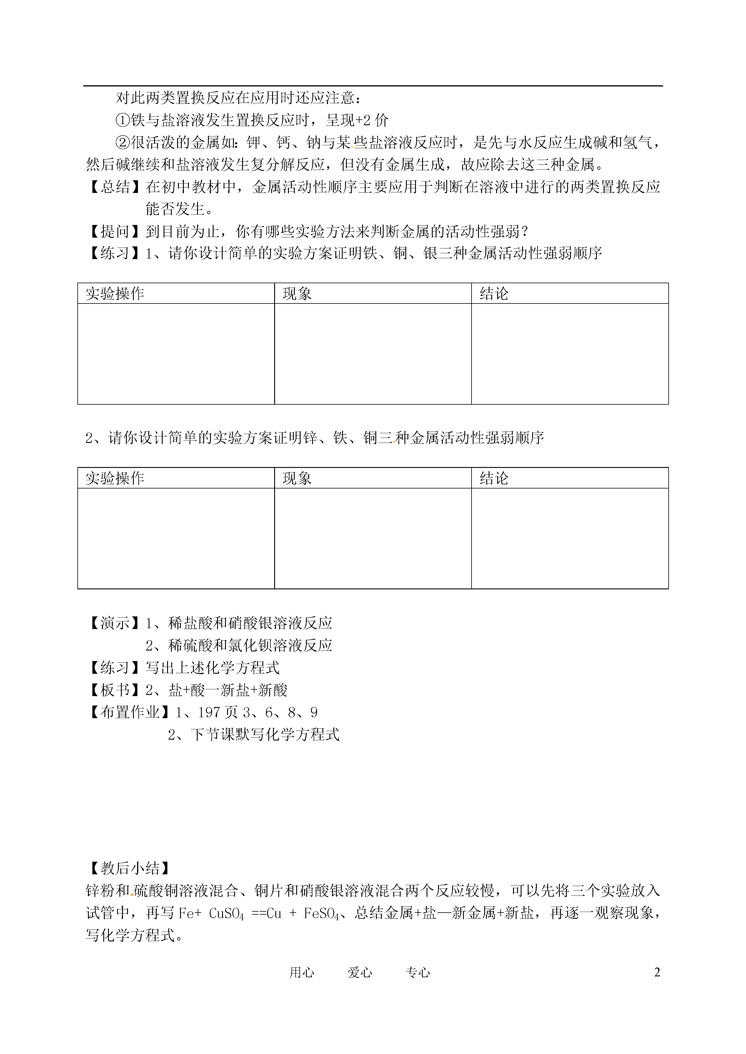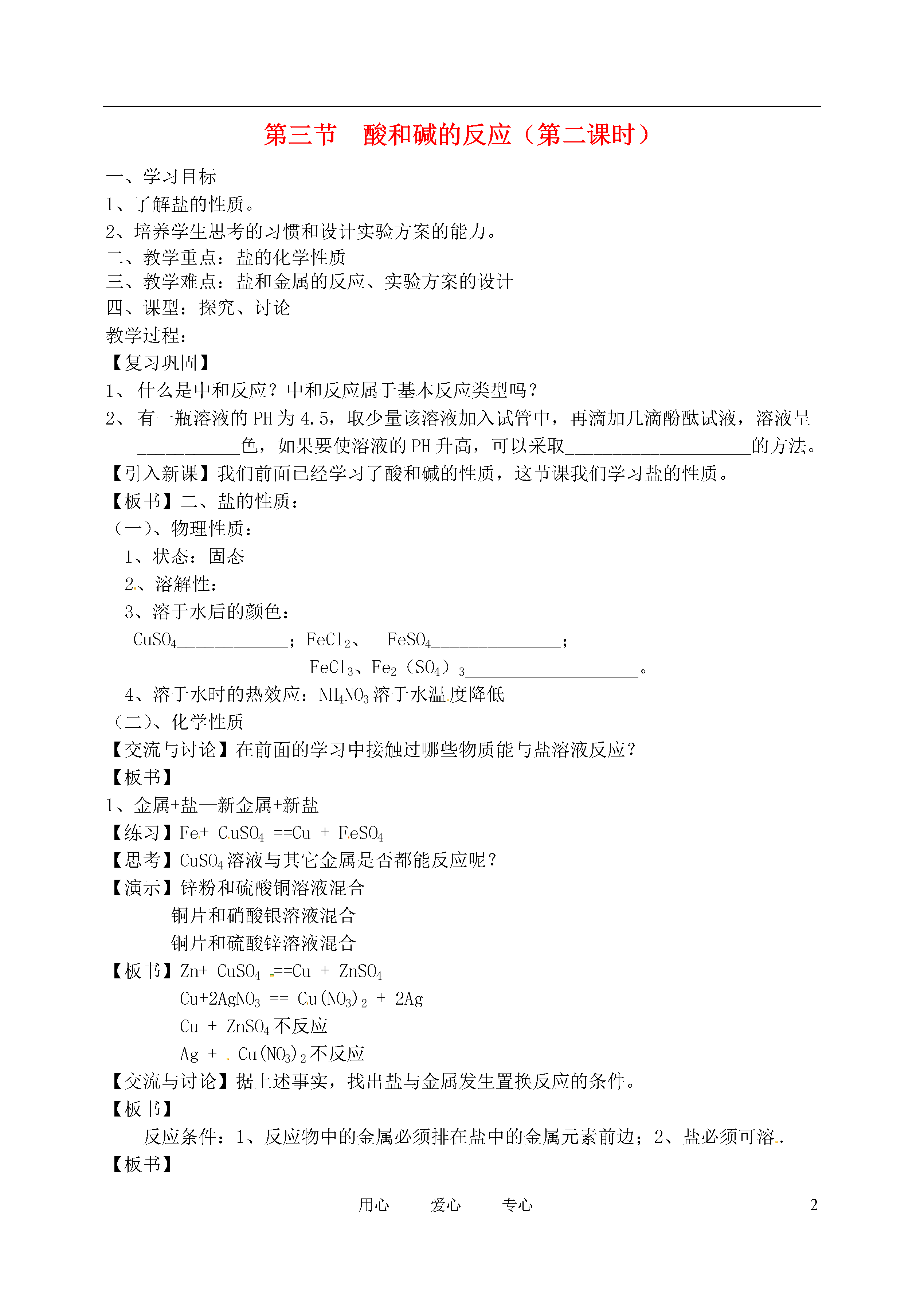 2用心爱心专心第三节酸和碱的反应(第二课时)一、学习目标1、了解盐的性质。2、培养学生思考的习惯和设计实验方案的能力。二、教学重点:盐的化学性质三、教学难点:盐和金属的反应、实验方案的设计四、课型:探究、讨论教学过程:【复习巩固】什么是中和反应?中和反应属于基本反应类型吗?有一瓶溶液的PH为4.5,取少量该溶液加入试管中,再滴加几滴酚酞试液,溶液呈___________色,如果要使溶液的PH升高,可以采取____________________的方法。【引入新课】我们前面已经学习了酸和碱的性质,这节课我们学习盐的性质。【板书】二、盐的性质:(一)、物理性质:1、状态:固态2、溶解性:3、溶于水后的颜色:CuSO4____________;FeCl2、FeSO4______________;FeCl3、Fe2(SO4)3____________________________。4、溶于水时的热效应:NH4NO3溶于水温度降低(二)、化学性质【交流与讨论】在前面的学习中接触过哪些物质能与盐溶液反应?【板书】1、金属+盐—新金属+新盐【练习】Fe+CuSO4==Cu+FeSO4【思考】CuSO4溶液与其它金属是否都能反应呢?【演示】锌粉和硫酸铜溶液混合铜片和硝酸银溶液混合铜片和硫酸锌溶液混合【板书】Zn+CuSO4==Cu+ZnSO4Cu+2AgNO3==Cu(NO3)2+2AgCu+ZnSO4不反应Ag+Cu(NO3)2不反应【交流与讨论】据上述事实,找出盐与金属发生置换反应的条件。【板书】反应条件:1、反应物中的金属必须排在盐中的金属元素前边;2、盐必须可溶.【板书】对此两类置换反应在应用时还应注意:①铁与盐溶液发生置换反应时,呈现+2价②很活泼的金属如:钾、钙、钠与某些盐溶液反应时,是先与水反应生成碱和氢气,然后碱继续和盐溶液发生复分解反应,但没有金属生成,故应除去这三种金属。【总结】在初中教材中,金属活动性顺序主要应用于判断在溶液中进行的两类置换反应能否发生。【提问】到目前为止,你有哪些实验方法来判断金属的活动性强弱?【练习】1、请你设计简单的实验方案证明铁、铜、银三种金属活动性强弱顺序实验操作现象结论2、请你设计简单的实验方案证明锌、铁、铜三种金属活动性强弱顺序实验操作现象结论【演示】1、稀盐酸和硝酸银溶液反应2、稀硫酸和氯化钡溶液反应【练习】写出上述化学方程式【板书】2、盐+酸一新盐+新酸【布置作业】1、197页3、6、8、92、下节课默写化学方程式【教后小结】锌粉和硫酸铜溶液混合、铜片和硝酸银溶液混合两个反应较慢,可以先将三个实验放入试管中,再写Fe+CuSO4==Cu+FeSO4、总结金属+盐—新金属+新盐,再逐一观察现象,写化学方程式。