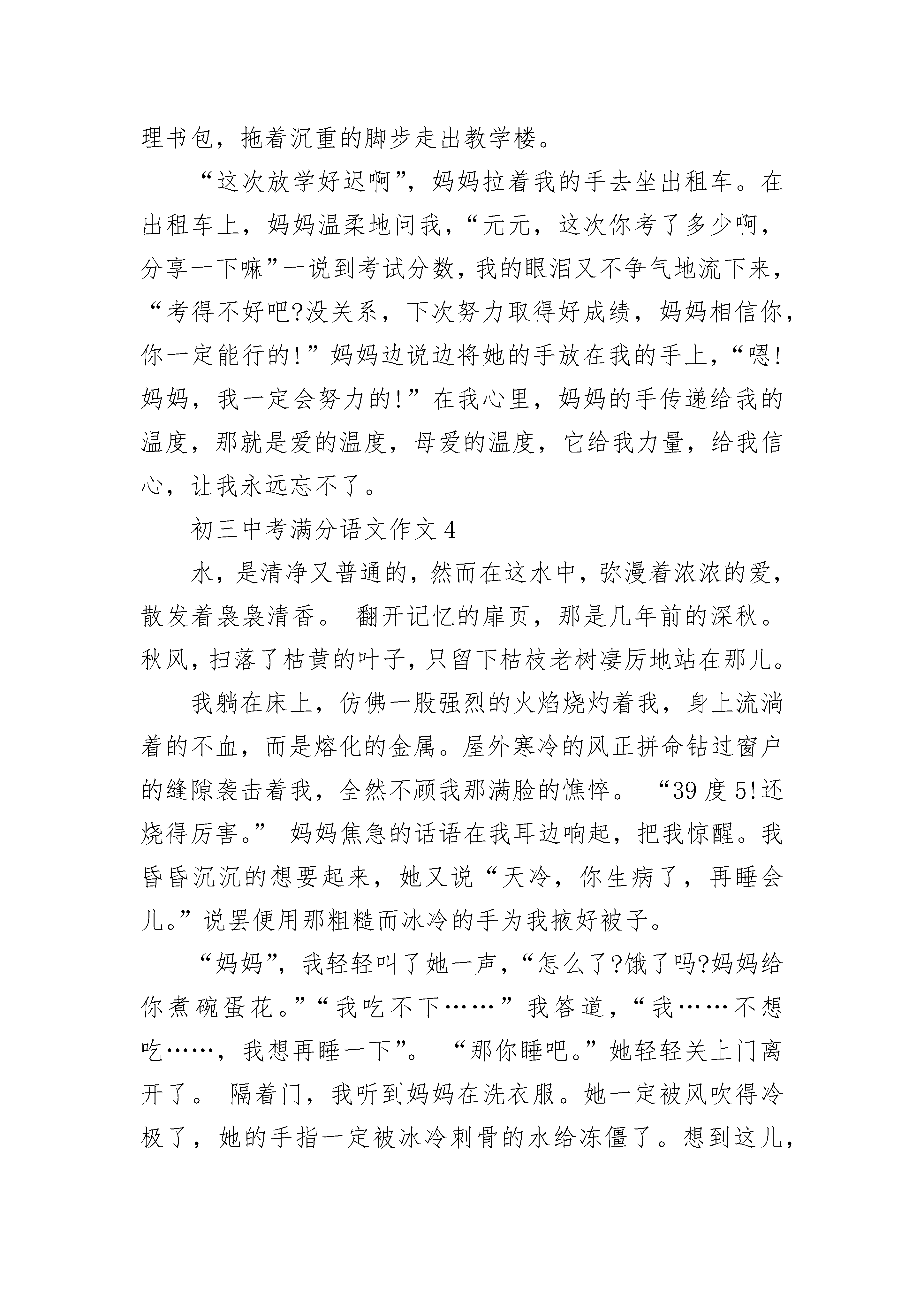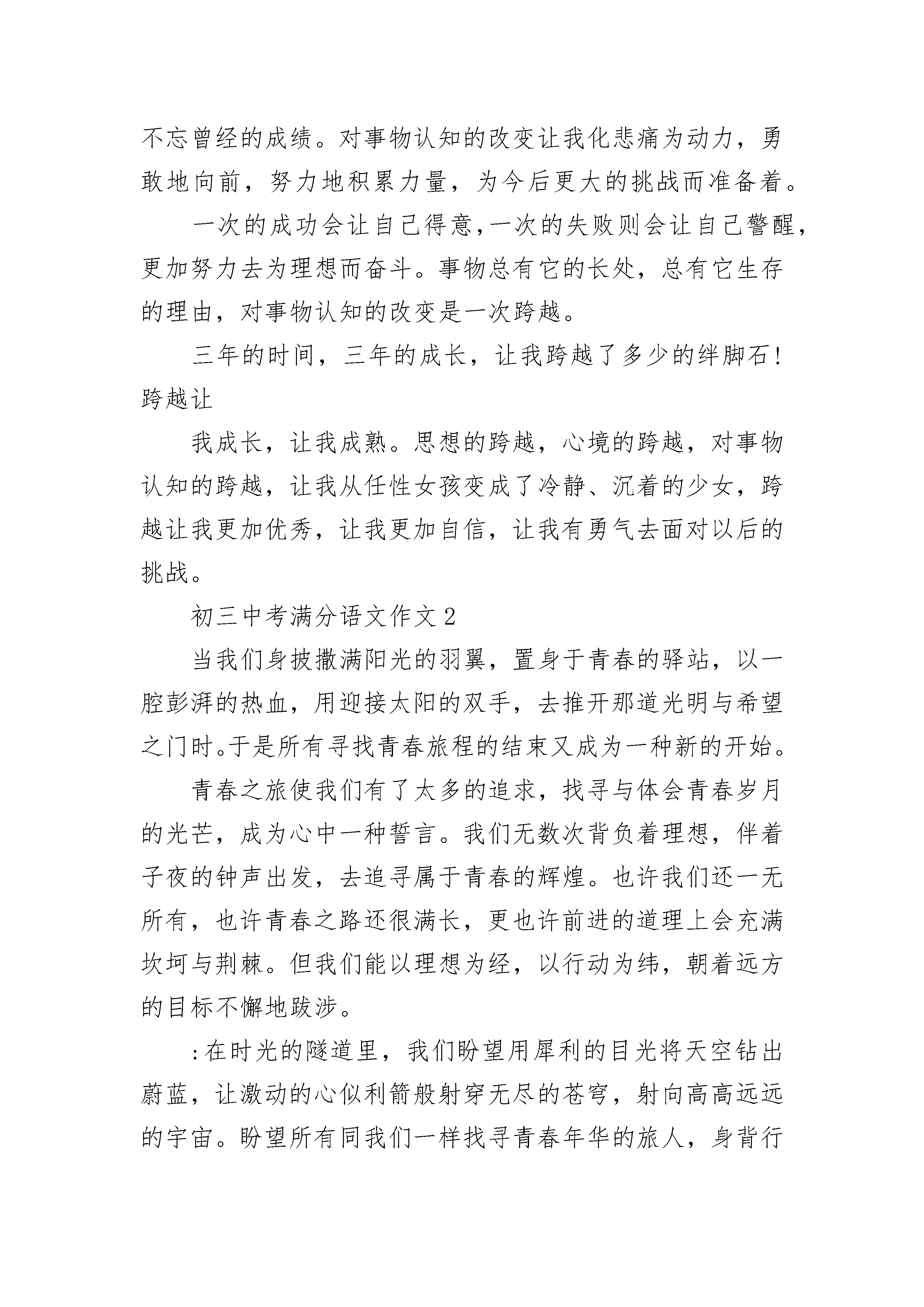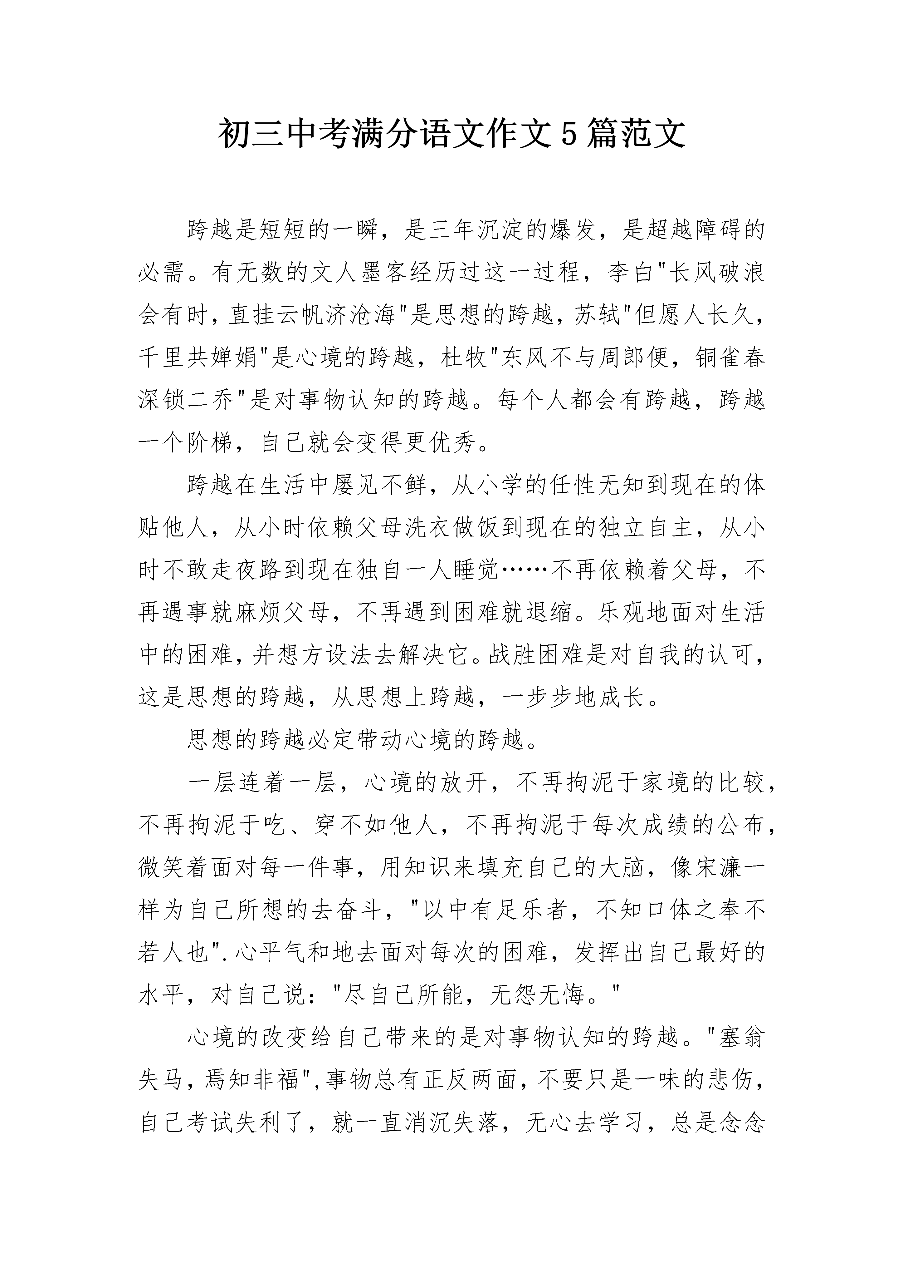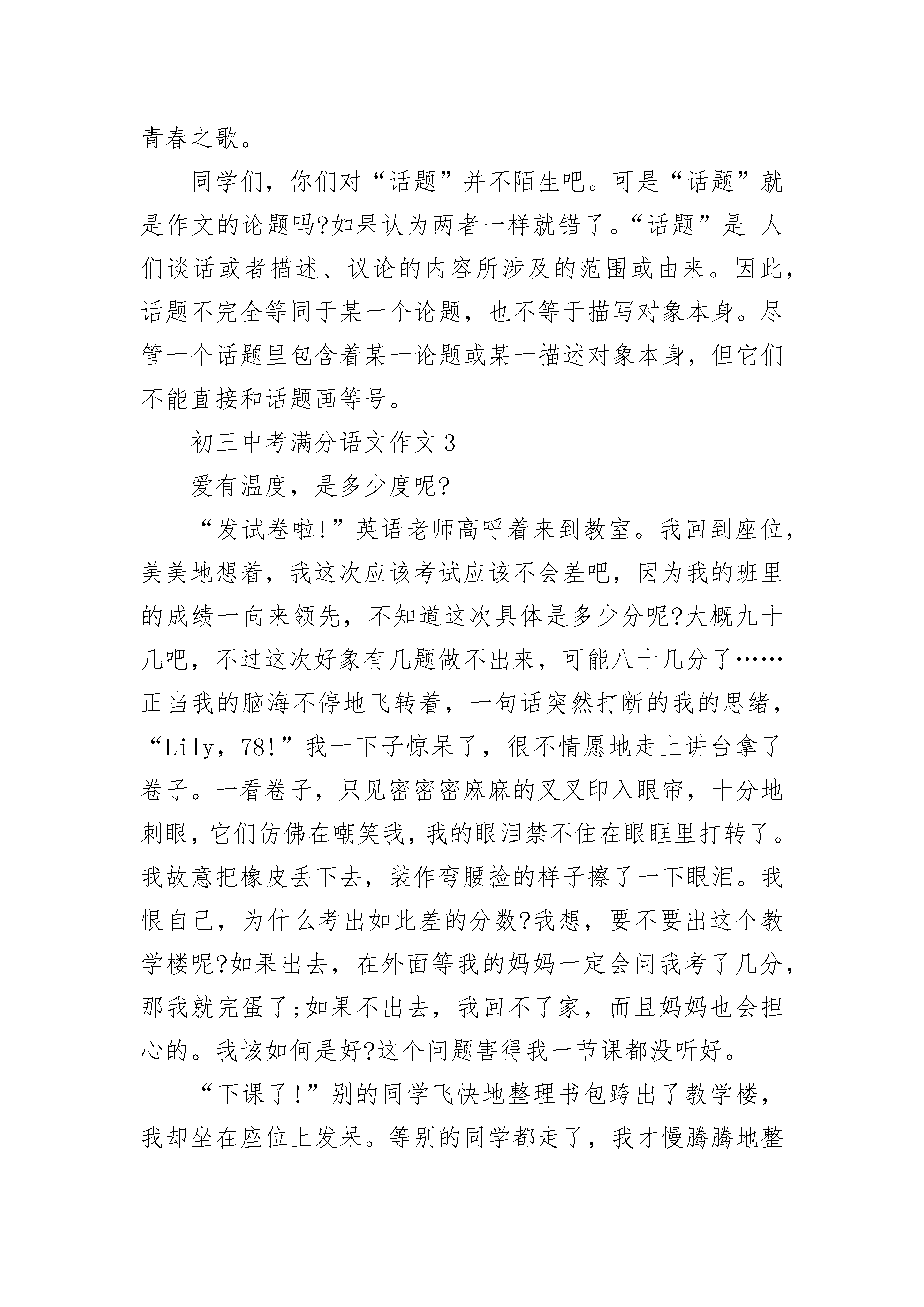 初三中考满分语文作文5篇范文跨越是短短的一瞬,是三年沉淀的爆发,是超越障碍的必需。有无数的文人墨客经历过这一过程,李白"长风破浪会有时,直挂云帆济沧海"是思想的跨越,苏轼"但愿人长久,千里共婵娟"是心境的跨越,杜牧"东风不与周郎便,铜雀春深锁二乔"是对事物认知的跨越。每个人都会有跨越,跨越一个阶梯,自己就会变得更优秀。跨越在生活中屡见不鲜,从小学的任性无知到现在的体贴他人,从小时依赖父母洗衣做饭到现在的独立自主,从小时不敢走夜路到现在独自一人睡觉……不再依赖着父母,不再遇事就麻烦父母,不再遇到困难就退缩。乐观地面对生活中的困难,并想方设法去解决它。战胜困难是对自我的认可,这是思想的跨越,从思想上跨越,一步步地成长。思想的跨越必定带动心境的跨越。一层连着一层,心境的放开,不再拘泥于家境的比较,不再拘泥于吃、穿不如他人,不再拘泥于每次成绩的公布,微笑着面对每一件事,用知识来填充自己的大脑,像宋濂一样为自己所想的去奋斗,"以中有足乐者,不知口体之奉不若人也".心平气和地去面对每次的困难,发挥出自己最好的水平,对自己说:"尽自己所能,无怨无悔。"心境的改变给自己带来的是对事物认知的跨越。"塞翁失马,焉知非福",事物总有正反两面,不要只是一味的悲伤,自己考试失利了,就一直消沉失落,无心去学习,总是念念不忘曾经的成绩。对事物认知的改变让我化悲痛为动力,勇敢地向前,努力地积累力量,为今后更大的挑战而准备着。一次的成功会让自己得意,一次的失败则会让自己警醒,更加努力去为理想而奋斗。事物总有它的长处,总有它生存的理由,对事物认知的改变是一次跨越。三年的时间,三年的成长,让我跨越了多少的绊脚石!跨越让我成长,让我成熟。思想的跨越,心境的跨越,对事物认知的跨越,让我从任性女孩变成了冷静、沉着的少女,跨越让我更加优秀,让我更加自信,让我有勇气去面对以后的挑战。初三中考满分语文作文2当我们身披撒满阳光的羽翼,置身于青春的驿站,以一腔彭湃的热血,用迎接太阳的双手,去推开那道光明与希望之门时。于是所有寻找青春旅程的结束又成为一种新的开始。青春之旅使我们有了太多的追求,找寻与体会青春岁月的光芒,成为心中一种誓言。我们无数次背负着理想,伴着子夜的钟声出发,去追寻属于青春的辉煌。也许我们还一无所有,也许青春之路还很满长,更也许前进的道理上会充满坎坷与荆棘。但我们能以理想为经,以行动为纬,朝着远方的目标不懈地跋涉。:在时光的隧道里,我们盼望用犀利的目光将天空钻出蔚蓝,让激动的心似利箭般射穿无尽的苍穹,射向高高远远的宇宙。盼望所有同我们一样找寻青春年华的旅人,身背行囊,朝着一个遥远而圣洁的目的地,虔诚地去朝拜,直到坚守到生命最后的时刻。青春的呼唤,使我们远足的信念在心中牢牢扎根,脚下的追寻之路似草一般疯长。我们吹着青春的号角,不顾一切地翻山越岭而去,并且一如既往向着目的地进发。犹如鱼儿恋水,生命的绿色追赶太阳般执著。寻找青春的家园,我们别无选择。当我们用辛劳的汗水和彭湃的热血铸成一种理想的文字,去记载或表述生命中不可或缺的追求时。所有经历过的磨难都似纷纷扬扬的雪花般落入泥土。曾几何时,我们扪心自问,是不是因为青春的呼唤,使生命的长河过早地澎湃?以至撑起飞翔的翅膀去冲击风雨雷电。是不是因为青春的呼唤,使盛开的理想花朵固守在生命的岸边点缀?以至绽放鲜艳之色去成为人们眼中一片美丽的风景。不可念及许多言不由衷,其实青春之旅许多是涉舟而来,又随波而去。犹如远征的驼队,牢记前方的路依旧漫长而遥远,摇动叮叮当当的驼铃,就知前方的路程无法丈量,穿越的过程便是追求的证明。希望的钟声敲响着黎明时空,相信每个早晨的阳光会使天空灿烂。相信青春的灯火正亮,定会照亮有志青年不懈的追求之路。让我们携起手来,披着阳光穿行岁月,加快青春的脚步,去点亮挂在心头的那束理想之光。用挚爱的情怀去高歌一首青春之歌。同学们,你们对“话题”并不陌生吧。可是“话题”就是作文的论题吗?如果认为两者一样就错了。“话题”是人们谈话或者描述、议论的内容所涉及的范围或由来。因此,话题不完全等同于某一个论题,也不等于描写对象本身。尽管一个话题里包含着某一论题或某一描述对象本身,但它们不能直接和话题画等号。初三中考满分语文作文3爱有温度,是多少度呢?“发试卷啦!”英语老师高呼着来到教室。我回到座位,美美地想着,我这次应该考试应该不会差吧,因为我的班里的成绩一向来领先,不知道这次具体是多少分呢?大概九十几吧,不过这次好象有几题做不出来,可能八十几分了……正当我的脑海不停地飞转着,一句话突然打断的我的思绪,“Lily,78!”我一下子惊呆了,很不情愿地走上讲台拿了卷子。一看卷子,只见密密密麻麻的叉叉印入眼帘,十分地刺眼,它们仿佛在嘲笑我,我的眼泪禁不住在眼眶里打转了。我故意把橡皮丢下去,装作弯腰捡的样子擦了一下眼泪。我恨自己,为