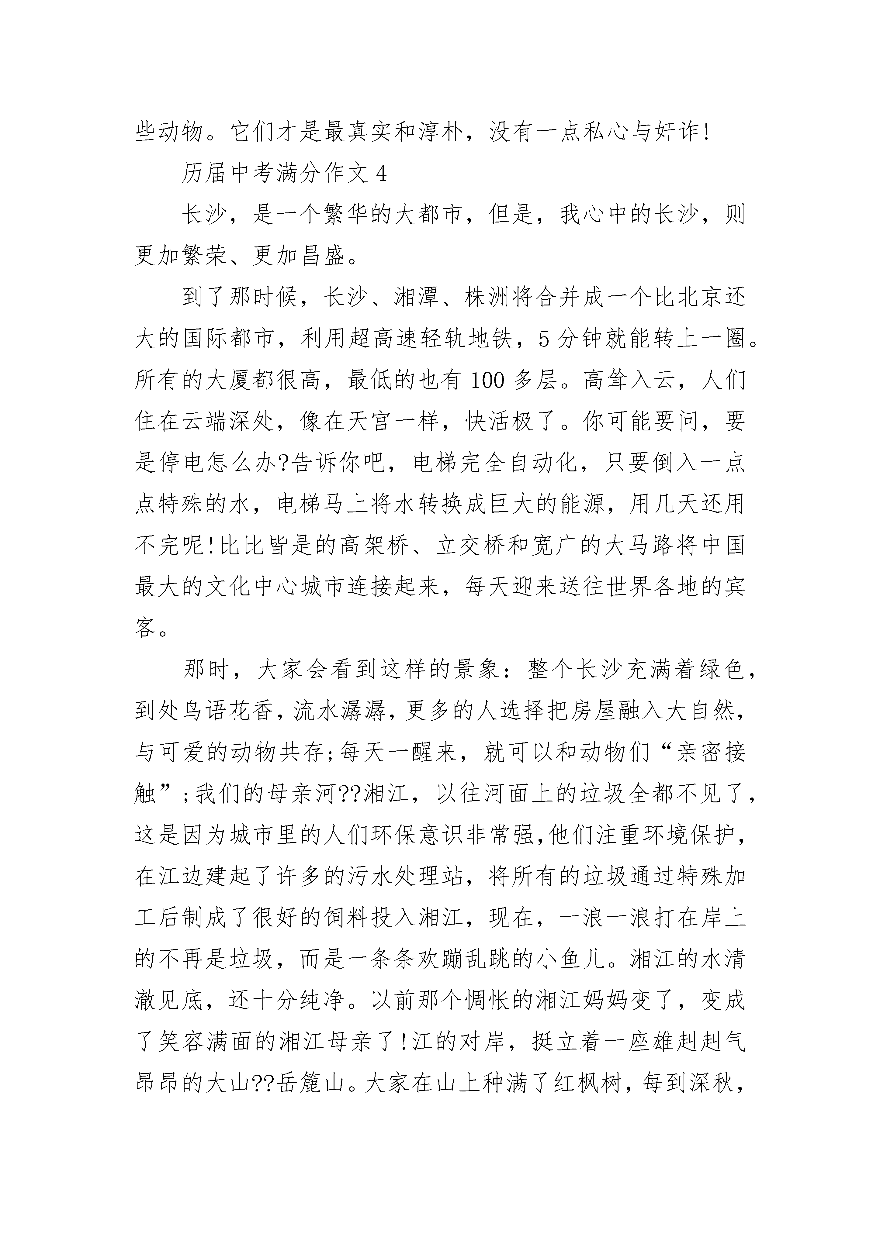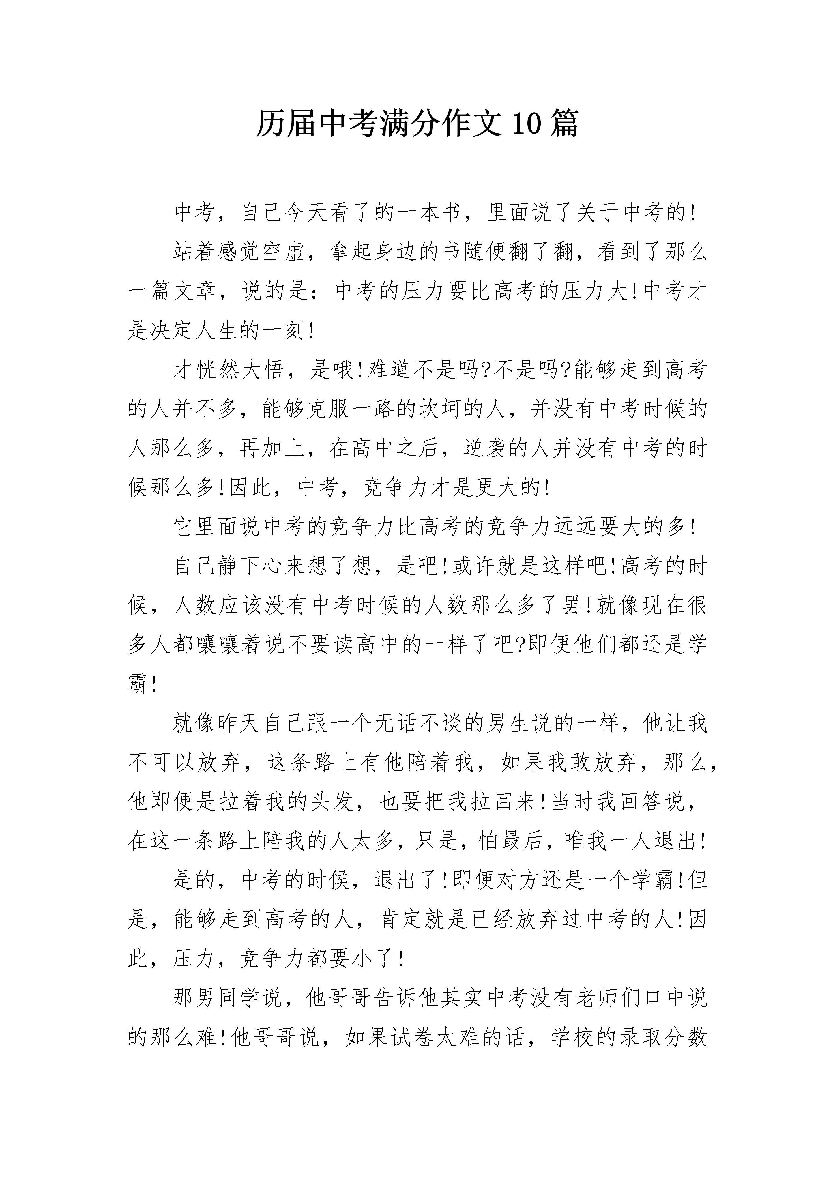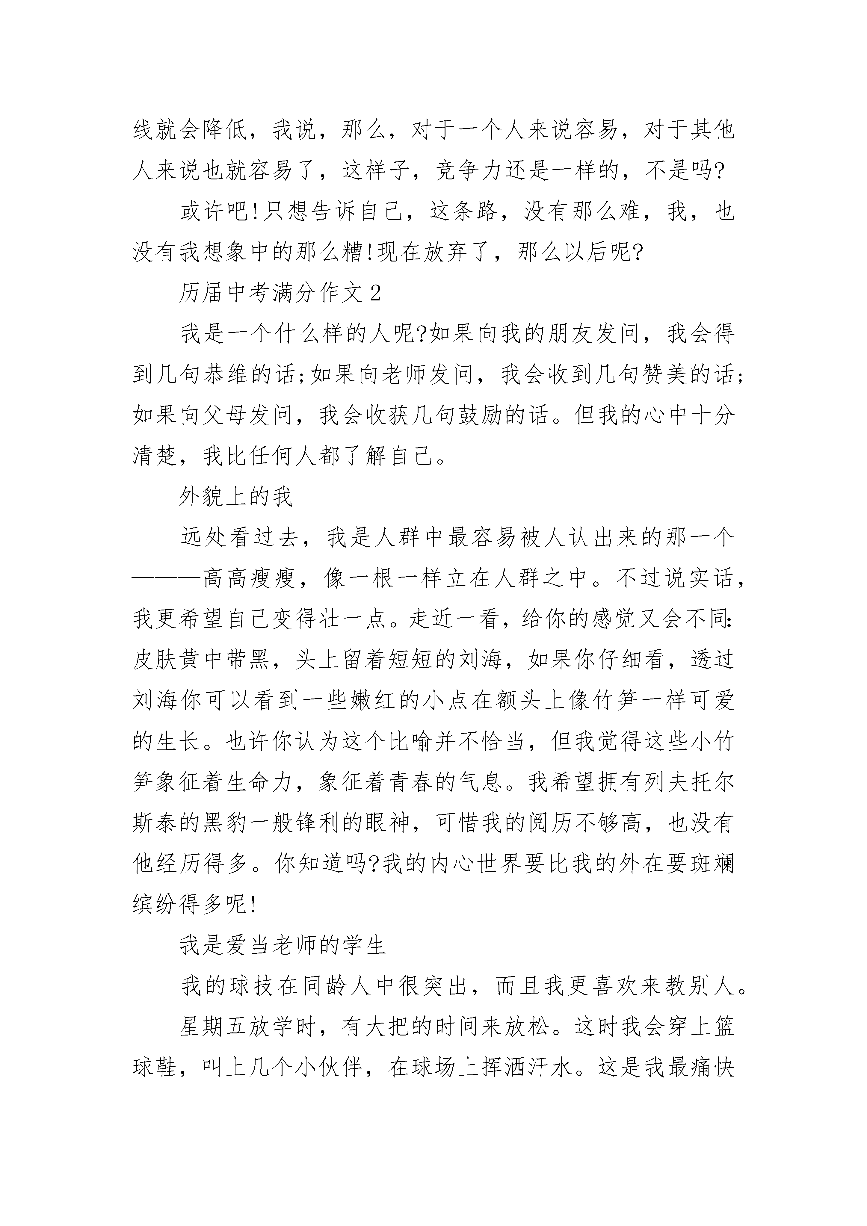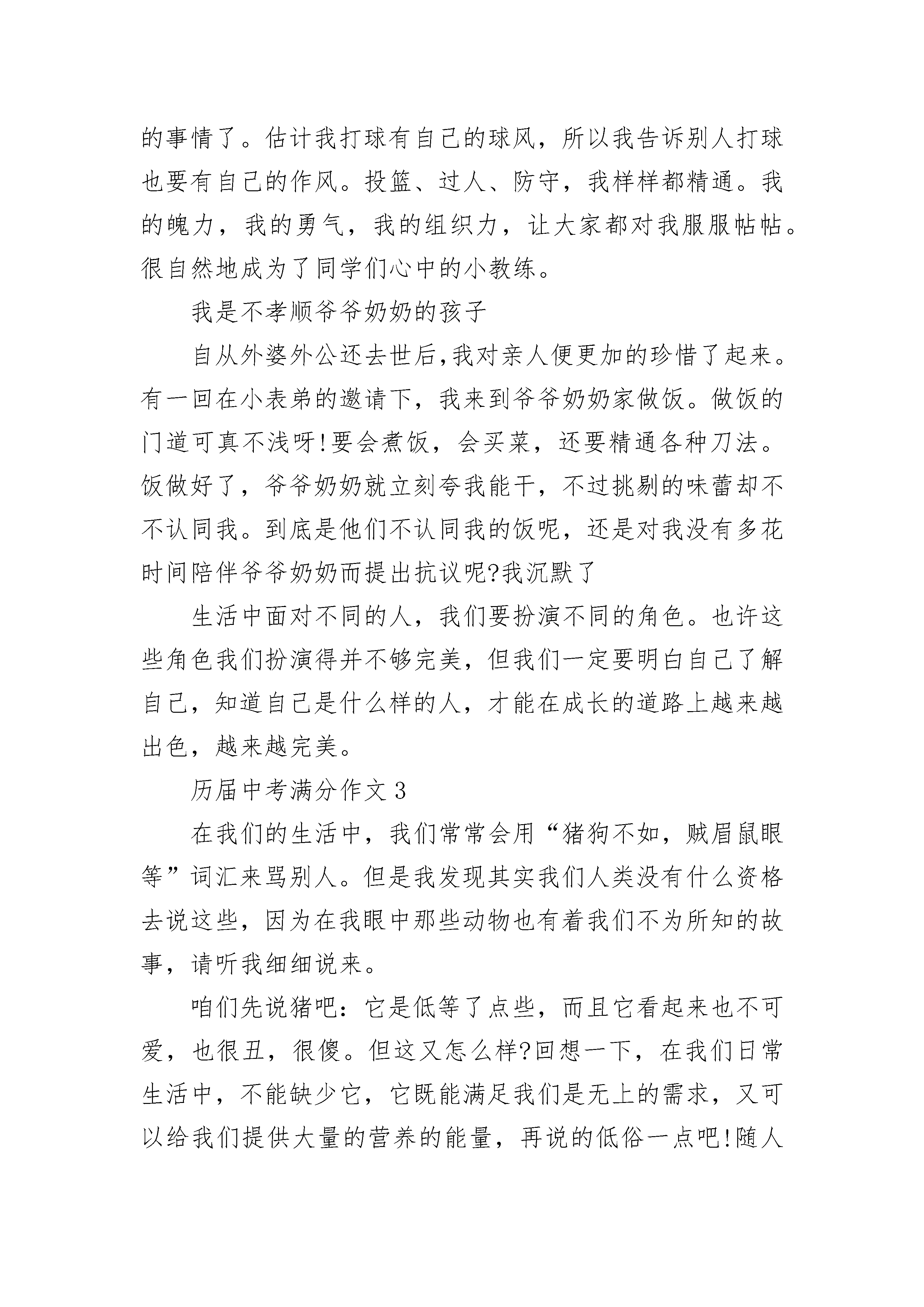 历届中考满分作文10篇中考,自己今天看了的一本书,里面说了关于中考的!站着感觉空虚,拿起身边的书随便翻了翻,看到了那么一篇文章,说的是:中考的压力要比高考的压力大!中考才是决定人生的一刻!才恍然大悟,是哦!难道不是吗?不是吗?能够走到高考的人并不多,能够克服一路的坎坷的人,并没有中考时候的人那么多,再加上,在高中之后,逆袭的人并没有中考的时候那么多!因此,中考,竞争力才是更大的!它里面说中考的竞争力比高考的竞争力远远要大的多!自己静下心来想了想,是吧!或许就是这样吧!高考的时候,人数应该没有中考时候的人数那么多了罢!就像现在很多人都嚷嚷着说不要读高中的一样了吧?即便他们都还是学霸!就像昨天自己跟一个无话不谈的男生说的一样,他让我不可以放弃,这条路上有他陪着我,如果我敢放弃,那么,他即便是拉着我的头发,也要把我拉回来!当时我回答说,在这一条路上陪我的人太多,只是,怕最后,唯我一人退出!是的,中考的时候,退出了!即便对方还是一个学霸!但是,能够走到高考的人,肯定就是已经放弃过中考的人!因此,压力,竞争力都要小了!那男同学说,他哥哥告诉他其实中考没有老师们口中说的那么难!他哥哥说,如果试卷太难的话,学校的录取分数线就会降低,我说,那么,对于一个人来说容易,对于其他人来说也就容易了,这样子,竞争力还是一样的,不是吗?或许吧!只想告诉自己,这条路,没有那么难,我,也没有我想象中的那么糟!现在放弃了,那么以后呢?历届中考满分作文2我是一个什么样的人呢?如果向我的朋友发问,我会得到几句恭维的话;如果向老师发问,我会收到几句赞美的话;如果向父母发问,我会收获几句鼓励的话。但我的心中十分清楚,我比任何人都了解自己。外貌上的我远处看过去,我是人群中最容易被人认出来的那一个———高高瘦瘦,像一根一样立在人群之中。不过说实话,我更希望自己变得壮一点。走近一看,给你的感觉又会不同:皮肤黄中带黑,头上留着短短的刘海,如果你仔细看,透过刘海你可以看到一些嫩红的小点在额头上像竹笋一样可爱的生长。也许你认为这个比喻并不恰当,但我觉得这些小竹笋象征着生命力,象征着青春的气息。我希望拥有列夫托尔斯泰的黑豹一般锋利的眼神,可惜我的阅历不够高,也没有他经历得多。你知道吗?我的内心世界要比我的外在要斑斓缤纷得多呢!我是爱当老师的学生我的球技在同龄人中很突出,而且我更喜欢来教别人。星期五放学时,有大把的时间来放松。这时我会穿上篮球鞋,叫上几个小伙伴,在球场上挥洒汗水。这是我最痛快的事情了。估计我打球有自己的球风,所以我告诉别人打球也要有自己的作风。投篮、过人、防守,我样样都精通。我的魄力,我的勇气,我的组织力,让大家都对我服服帖帖。很自然地成为了同学们心中的小教练。我是不孝顺爷爷奶奶的孩子自从外婆外公还去世后,我对亲人便更加的珍惜了起来。有一回在小表弟的邀请下,我来到爷爷奶奶家做饭。做饭的门道可真不浅呀!要会煮饭,会买菜,还要精通各种刀法。饭做好了,爷爷奶奶就立刻夸我能干,不过挑剔的味蕾却不不认同我。到底是他们不认同我的饭呢,还是对我没有多花时间陪伴爷爷奶奶而提出抗议呢?我沉默了生活中面对不同的人,我们要扮演不同的角色。也许这些角色我们扮演得并不够完美,但我们一定要明白自己了解自己,知道自己是什么样的人,才能在成长的道路上越来越出色,越来越完美。历届中考满分作文3在我们的生活中,我们常常会用“猪狗不如,贼眉鼠眼等”词汇来骂别人。但是我发现其实我们人类没有什么资格去说这些,因为在我眼中那些动物也有着我们不为所知的故事,请听我细细说来。咱们先说猪吧:它是低等了点些,而且它看起来也不可爱,也很丑,很傻。但这又怎么样?回想一下,在我们日常生活中,不能缺少它,它既能满足我们是无上的需求,又可以给我们提供大量的营养的能量,再说的低俗一点吧!随人在我们嘴里蹦的词体现出它十分的贱,但他也只不少的钱呢,想一想他有那么低贱了吗?咱们再说说狗吧:它呢跟猪就不同了,它看起来威武雄壮,对主人忠心耿耿,但照样被描述的如此低贱!譬如:狗奴才,看门狗。但它起码懂得保护主人,为主人做事看门。非常时期时,它还能牺牲自己,扞卫国家!而不像有些人,遇到困难就只想到逃跑,而不是勇于奋战!它有那么低贱了吗?最后再说说鼠吧!虽说那灰鼠是五害之一吧!它们实该憎恨,因为它会偷吃粮食!但鼠也有好坏啊。像我们现在科学上要用到的试验品——小白鼠!!!我们现在医学上有很大的进步,那小白鼠是功不可没啊!有多少的疾病疫苗和药品都在它们身上诞生。而它们一只只的牺牲有可能挽回或置治愈一个病人!这就叫做舍己为人,也是舍己为世界、为大家啊!!!而在我们身边有几个人能做到?他有那么低贱了吗?每当我想到这儿,我都会暗暗的自叹不如。所以,我从来不会说别人猪狗不如等词!!!因为我知道,当你说出这句话的时候,你不但伤害了他人的自尊心,也侮辱了这些