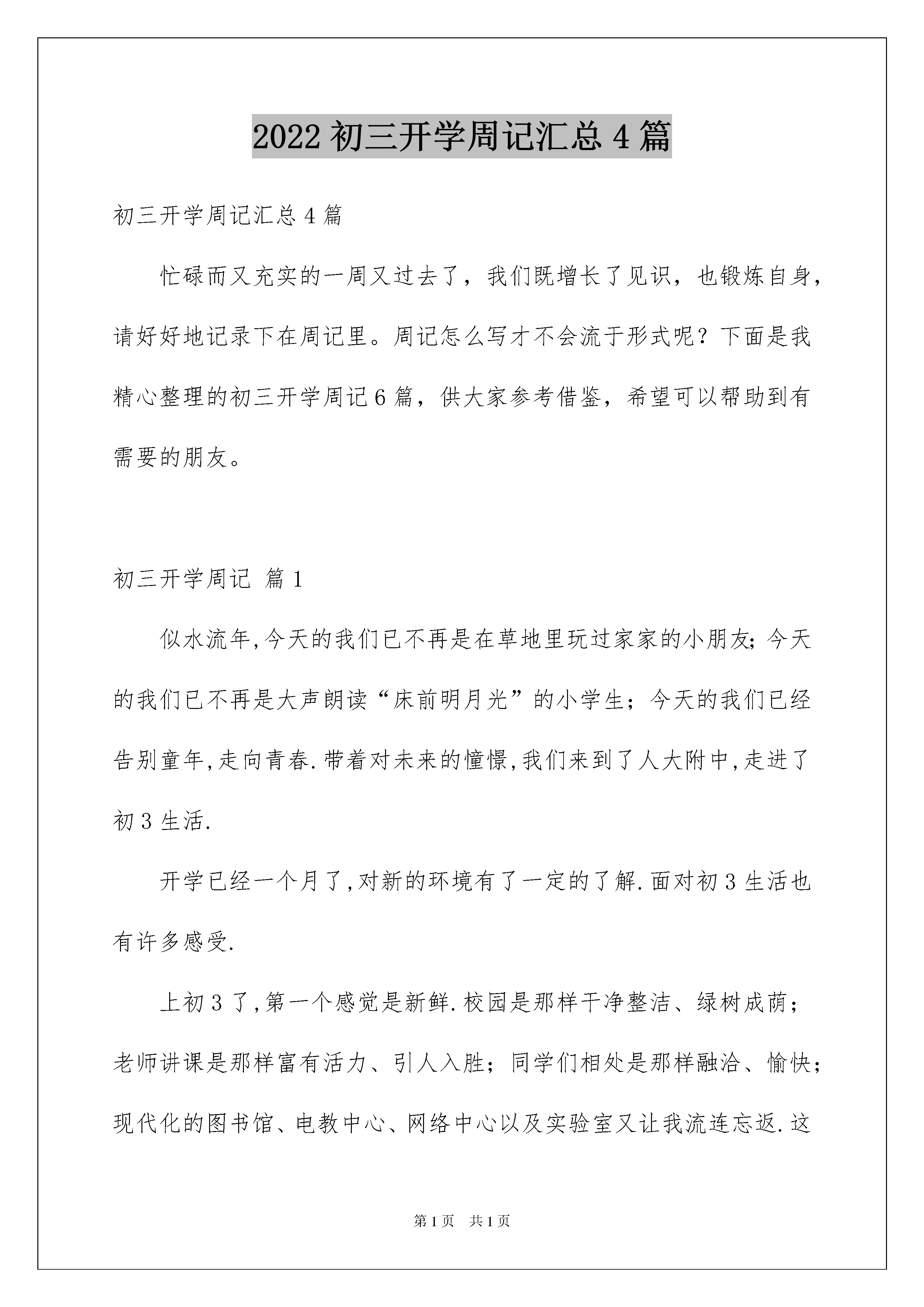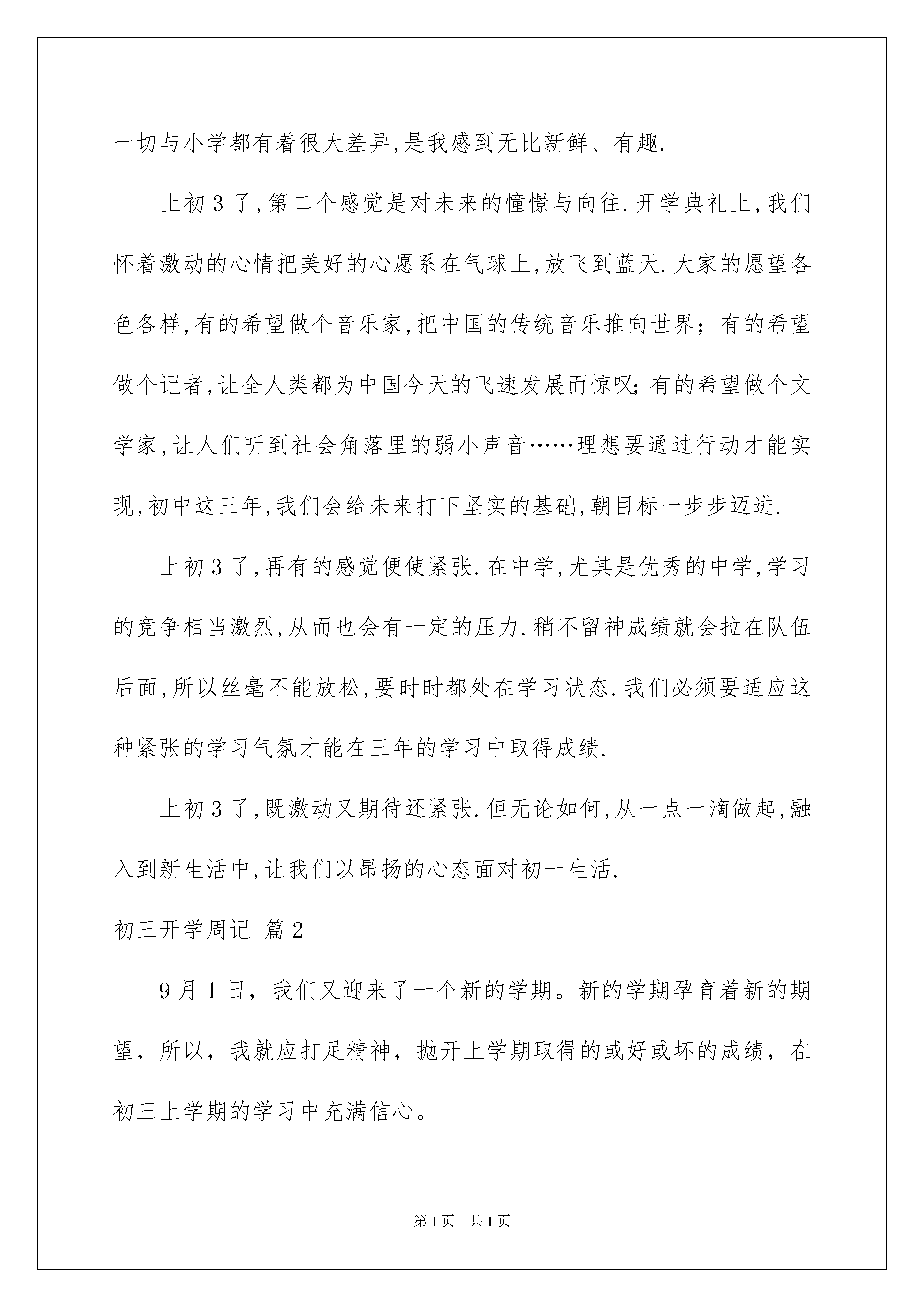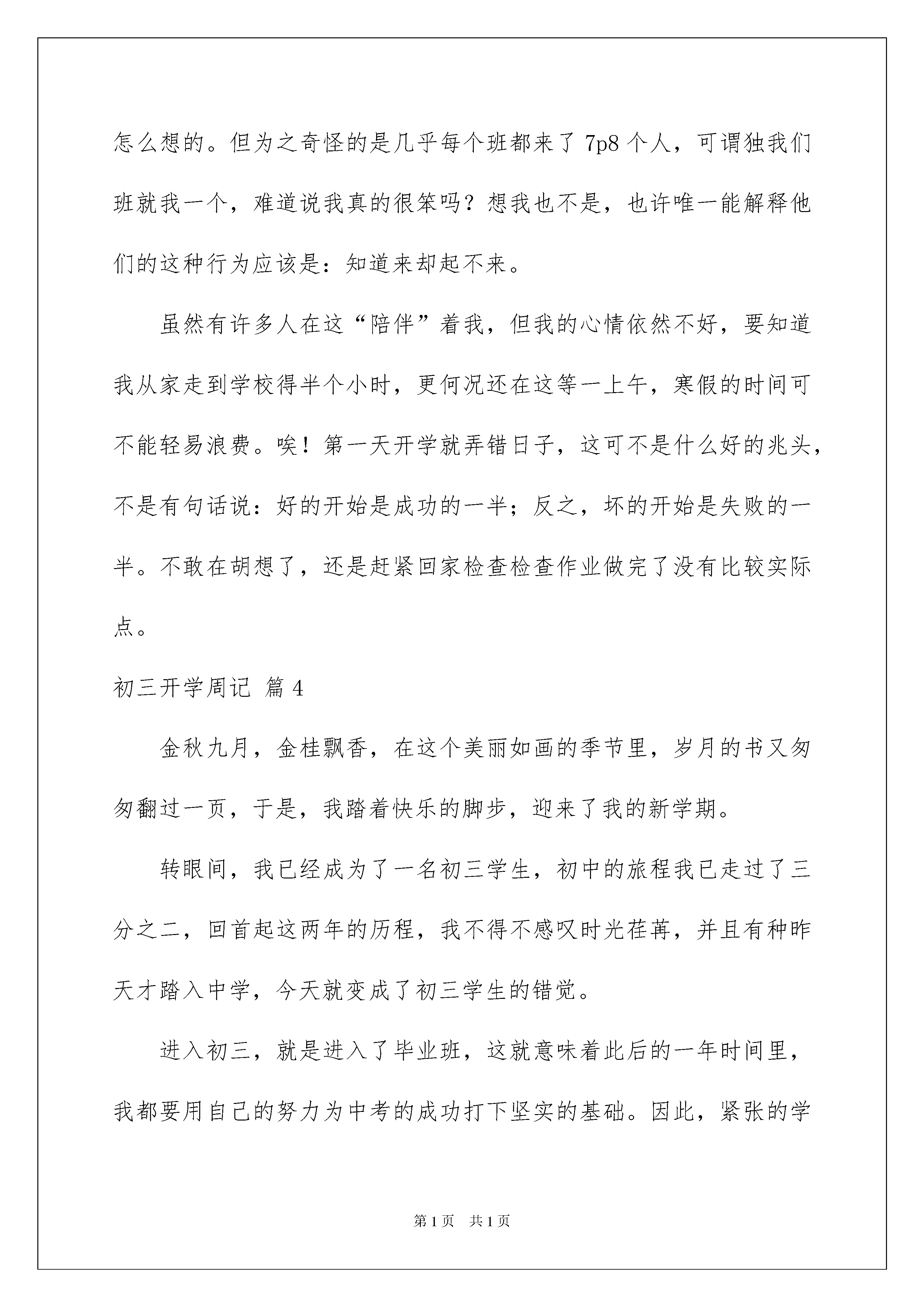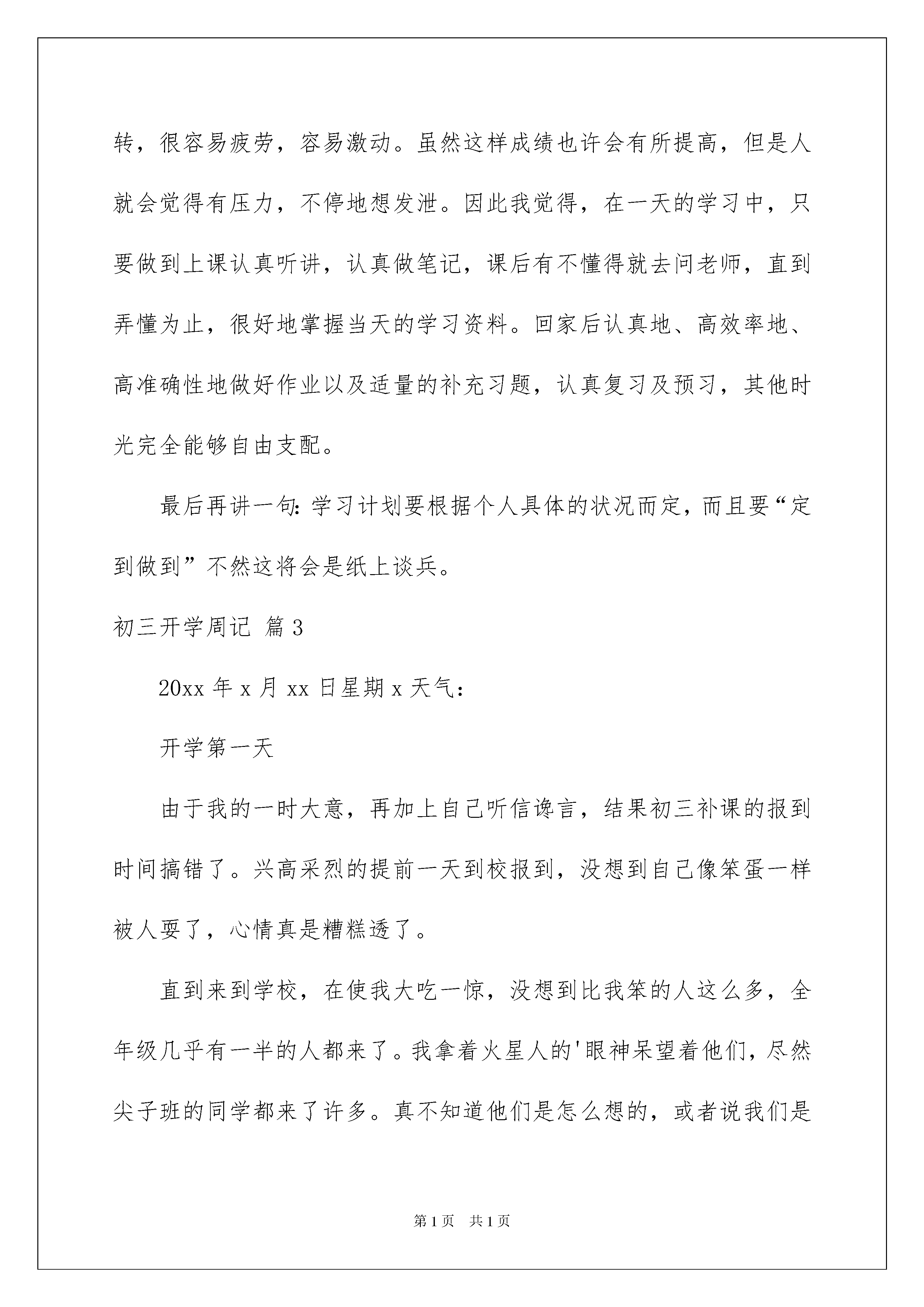 2022初三开学周记汇总4篇初三开学周记汇总4篇忙碌而又充实的一周又过去了,我们既增长了见识,也锻炼自身,请好好地记录下在周记里。周记怎么写才不会流于形式呢?下面是我精心整理的初三开学周记6篇,供大家参考借鉴,希望可以帮助到有需要的朋友。初三开学周记篇1似水流年,今天的我们已不再是在草地里玩过家家的小朋友;今天的我们已不再是大声朗读“床前明月光”的小学生;今天的我们已经告别童年,走向青春.带着对未来的憧憬,我们来到了人大附中,走进了初3生活.开学已经一个月了,对新的环境有了一定的了解.面对初3生活也有许多感受.上初3了,第一个感觉是新鲜.校园是那样干净整洁、绿树成荫;老师讲课是那样富有活力、引人入胜;同学们相处是那样融洽、愉快;现代化的图书馆、电教中心、网络中心以及实验室又让我流连忘返.这一切与小学都有着很大差异,是我感到无比新鲜、有趣.上初3了,第二个感觉是对未来的憧憬与向往.开学典礼上,我们怀着激动的心情把美好的心愿系在气球上,放飞到蓝天.大家的愿望各色各样,有的希望做个音乐家,把中国的传统音乐推向世界;有的希望做个记者,让全人类都为中国今天的飞速发展而惊叹;有的希望做个文学家,让人们听到社会角落里的弱小声音……理想要通过行动才能实现,初中这三年,我们会给未来打下坚实的基础,朝目标一步步迈进.上初3了,再有的感觉便使紧张.在中学,尤其是优秀的中学,学习的竞争相当激烈,从而也会有一定的压力.稍不留神成绩就会拉在队伍后面,所以丝毫不能放松,要时时都处在学习状态.我们必须要适应这种紧张的学习气氛才能在三年的学习中取得成绩.上初3了,既激动又期待还紧张.但无论如何,从一点一滴做起,融入到新生活中,让我们以昂扬的心态面对初一生活.初三开学周记篇29月1日,我们又迎来了一个新的学期。新的学期孕育着新的期望,所以,我就应打足精神,抛开上学期取得的或好或坏的成绩,在初三上学期的学习中充满信心。首先,我认为,学习中不可忽略的一点就是要学会分析自我的学习特点,像我--理解潜力还能够,老师讲的东西不是不懂,但却总出错,而且对于一些死记硬背才能学会的东西总觉得不耐烦,因此,在这点上,我期望自我能在新学期里对待学习更认真,更有耐心。其次,我觉得,在学习中,确定学习目标也是很重要的,学习目标是学生学习努力的方向,正确的学习目标更是能催人奋进。反之,没有目标的学习,就是对时光一种极大的浪费。我们能够在短时光内定一个小的学习目标,并且在短时光内到达这个小目标,然后长时光到达一个大目标。在长短计划的指导下,使学习一步步地由小目标走向大目标。所以,我暂时的目标就是先进入全班前8名,而对于我较弱的数学以及其他的副科,我也会努力,让它们也有所进步。最后,也是最关键的一点,就是要科学、合理地安排作息时光,没有合理的安排,再好的计划也会付之东流。所以,在新学期里,我最要学会的就是要合理安排学习、娱乐、休息的时光,要把每一点一滴宝贵的时光都抓紧。有些同学认为:只要把所有的心思都扑在学习上,学习成绩就会提高。但我个人不赞同这一观点,因为我觉得一天中如果没有一点时光用来娱乐的话,大脑就会持续的工作,不停的运转,很容易疲劳,容易激动。虽然这样成绩也许会有所提高,但是人就会觉得有压力,不停地想发泄。因此我觉得,在一天的学习中,只要做到上课认真听讲,认真做笔记,课后有不懂得就去问老师,直到弄懂为止,很好地掌握当天的学习资料。回家后认真地、高效率地、高准确性地做好作业以及适量的补充习题,认真复习及预习,其他时光完全能够自由支配。最后再讲一句:学习计划要根据个人具体的状况而定,而且要“定到做到”不然这将会是纸上谈兵。初三开学周记篇320xx年x月xx日星期x天气:开学第一天由于我的一时大意,再加上自己听信谗言,结果初三补课的报到时间搞错了。兴高采烈的提前一天到校报到,没想到自己像笨蛋一样被人耍了,心情真是糟糕透了。直到来到学校,在使我大吃一惊,没想到比我笨的人这么多,全年级几乎有一半的人都来了。我拿着火星人的'眼神呆望着他们,尽然尖子班的同学都来了许多。真不知道他们是怎么想的,或者说我们是怎么想的。但为之奇怪的是几乎每个班都来了7p8个人,可谓独我们班就我一个,难道说我真的很笨吗?想我也不是,也许唯一能解释他们的这种行为应该是:知道来却起不来。虽然有许多人在这“陪伴”着我,但我的心情依然不好,要知道我从家走到学校得半个小时,更何况还在这等一上午,寒假的时间可不能轻易浪费。唉!第一天开学就弄错日子,这可不是什么好的兆头,不是有句话说:好的开始是成功的一半;反之,坏的开始是失败的一半。不敢在胡想了,还是赶紧回家检查检查作业做完了没