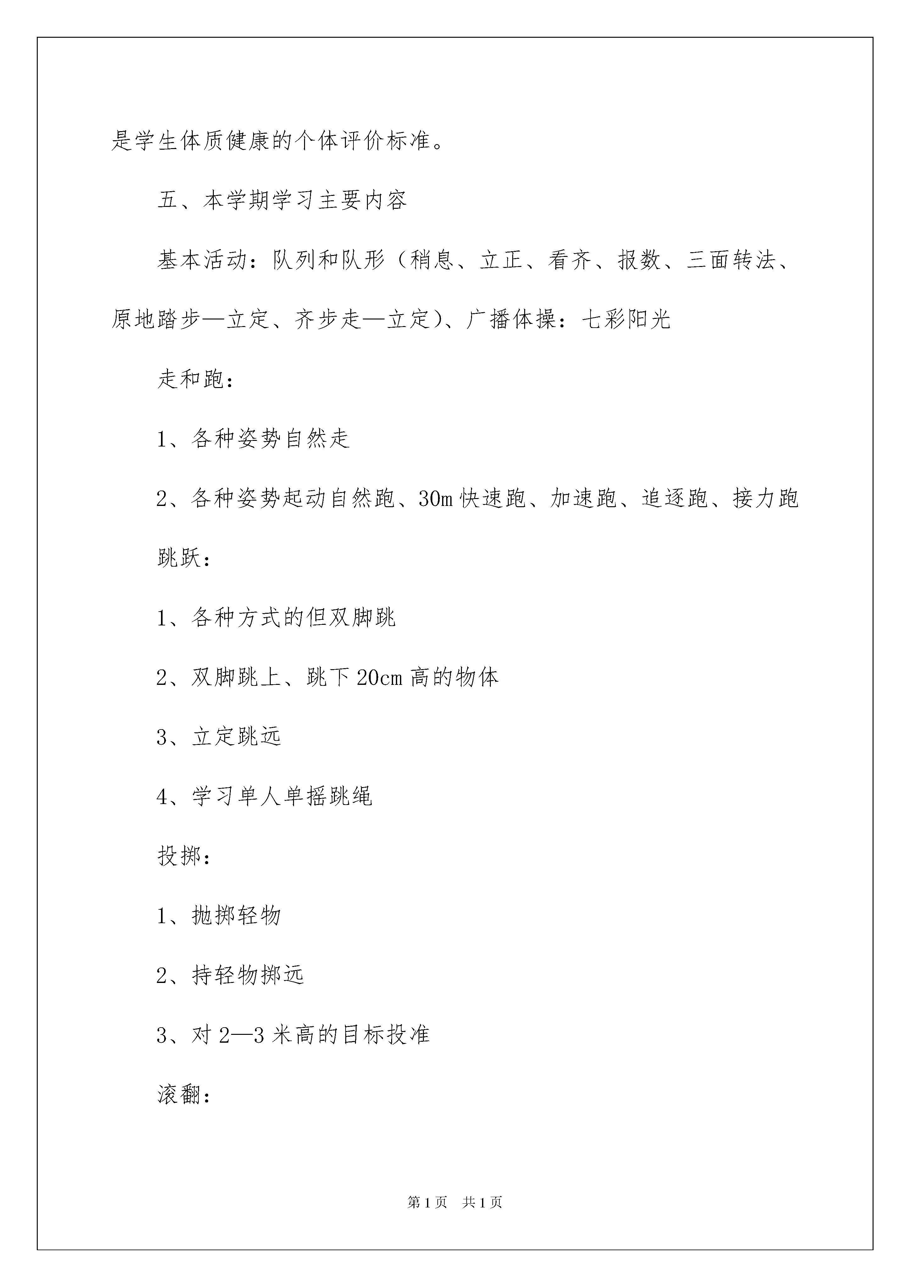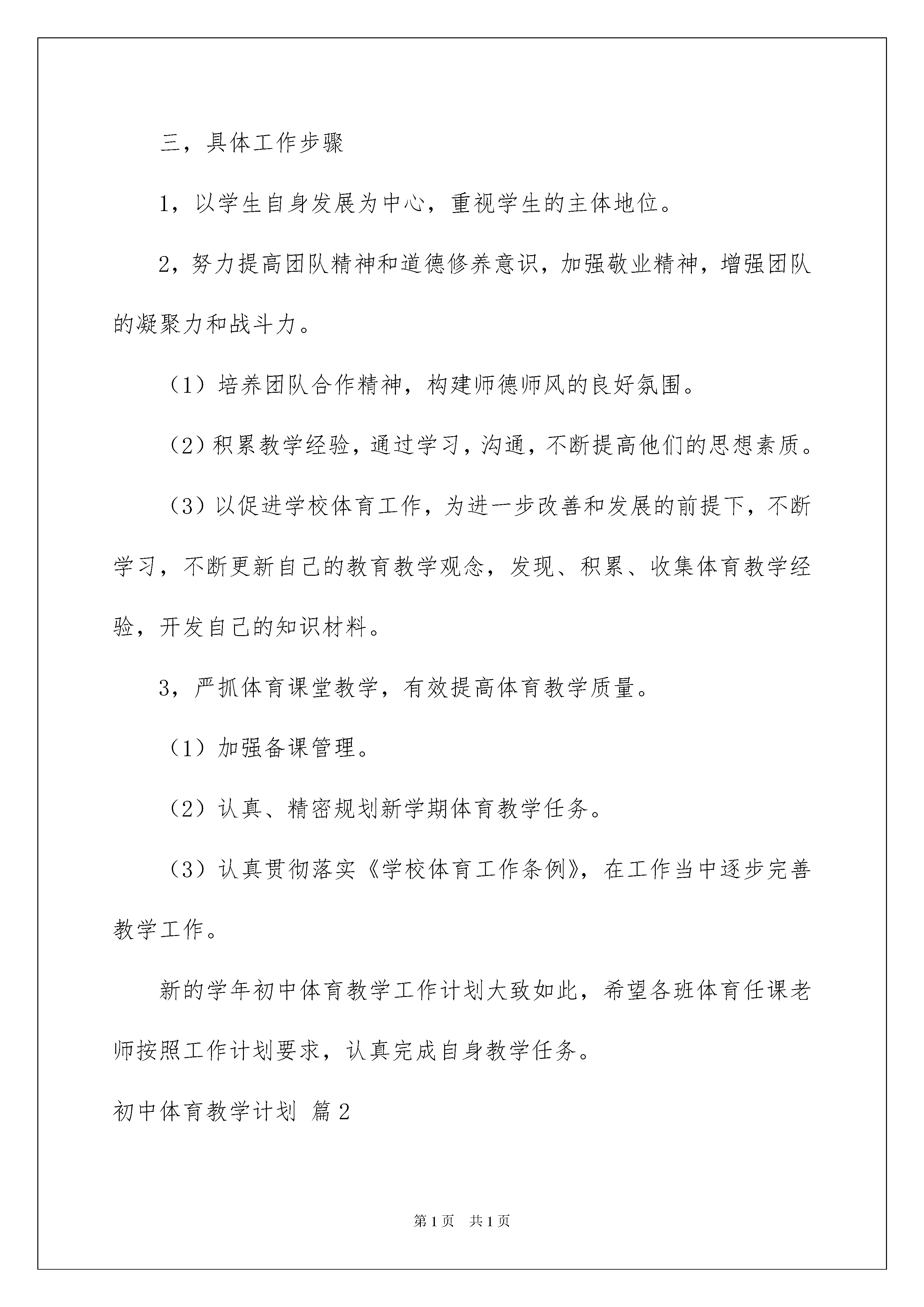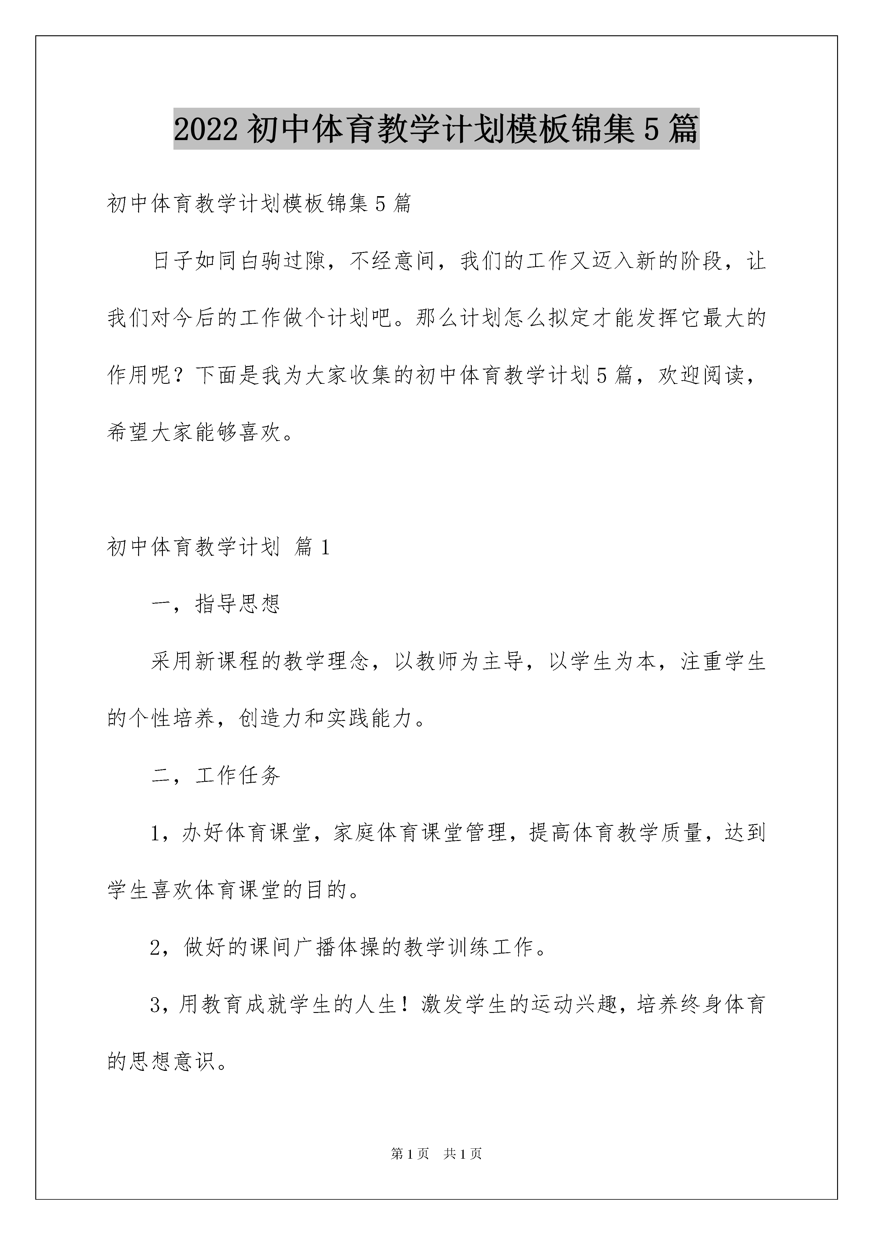 2022初中体育教学计划模板锦集5篇初中体育教学计划模板锦集5篇日子如同白驹过隙,不经意间,我们的工作又迈入新的阶段,让我们对今后的工作做个计划吧。那么计划怎么拟定才能发挥它最大的作用呢?下面是我为大家收集的初中体育教学计划5篇,欢迎阅读,希望大家能够喜欢。初中体育教学计划篇1一,指导思想采用新课程的教学理念,以教师为主导,以学生为本,注重学生的个性培养,创造力和实践能力。二,工作任务1,办好体育课堂,家庭体育课堂管理,提高体育教学质量,达到学生喜欢体育课堂的目的。2,做好的课间广播体操的教学训练工作。3,用教育成就学生的人生!激发学生的运动兴趣,培养终身体育的思想意识。三,具体工作步骤1,以学生自身发展为中心,重视学生的主体地位。2,努力提高团队精神和道德修养意识,加强敬业精神,增强团队的凝聚力和战斗力。(1)培养团队合作精神,构建师德师风的良好氛围。(2)积累教学经验,通过学习,沟通,不断提高他们的思想素质。(3)以促进学校体育工作,为进一步改善和发展的前提下,不断学习,不断更新自己的教育教学观念,发现、积累、收集体育教学经验,开发自己的知识材料。3,严抓体育课堂教学,有效提高体育教学质量。(1)加强备课管理。(2)认真、精密规划新学期体育教学任务。(3)认真贯彻落实《学校体育工作条例》,在工作当中逐步完善教学工作。新的学年初中体育教学工作计划大致如此,希望各班体育任课老师按照工作计划要求,认真完成自身教学任务。初中体育教学计划篇2一、指导思想体育教学有利于学生身心发展和终身学习,具有与时俱进性,开拓创新性,纲领性,方向性和指导性。而传统的体育教学计划中的教学目标表述,是以教材为中心和以教师为中心,缺少明确的导向作用,因此对学生的学习效果难以进行有序有效的做出客观评价。在实施新课程改革中,要贯彻新课标,运用新理念。体育与保健基础知识,也是推进素质教育的主要课程,为了发展体育与保健的综合能力打基础。本学期根据体育《新课标》中,明确地规定了小学体育的目的:“通过教师与学生互动性体育教学,向学生进行体育卫生保健教育,增进学生健康,增进体质,促进德、智、体全面发展,为提高全民族的的素质奠定基础。”二、学情分析一年级学生正处在生长发育的初期,他们生性好动活泼开朗,注意力不集中,课堂常规还不大了了解。有时难以控制自己行动,所以此阶段的当务之急就是培养他们的的兴趣,发掘其潜力,这就需要在教学中正确引导,力争学生在体力、心理素质方面得到一定的提高,从而充分培养学生终身体育的意识。本学期将因材施教,提高兴趣,发现体育人才,重点抓课堂纪律,强化课堂常规训练,为今后的学习打下基础。三、教材分析本学期教材内容由三个部分组成。第一部分是体育课程概述,该部分主要阐述了编写小学体育与健康教参的指导思想编写原则和整套教育教学体系简介,并对使用教材的有关事项进行了说明以便教师在总体上对这套教材有一概括的了解。第二部分是各类教学内容简介,逐一对各项教学进行介绍及教学注意事项进行说明。第三部分是小学生体育考核与达标标准。四、教学目标1、认知目标:初步了解体育锻炼对身体健康的良好作用,懂得一些保护自身健康的简单常识和方法,初步养成良好的习惯。2、技能目标:了解一些基本动作、游戏和韵律活动的方法,能保持正确的身体姿势,具备初步的发展身体素质的基础和基本活动的能力。3、情感目标:能感受和体验参加体育活动的乐趣,在体育活动中能促进学生体质健康发展、激励学生积极进行身体锻炼的教育手段,是学生体质健康的个体评价标准。五、本学期学习主要内容基本活动:队列和队形(稍息、立正、看齐、报数、三面转法、原地踏步—立定、齐步走—立定)、广播体操:七彩阳光走和跑:1、各种姿势自然走2、各种姿势起动自然跑、30m快速跑、加速跑、追逐跑、接力跑跳跃:1、各种方式的但双脚跳2、双脚跳上、跳下20cm高的物体3、立定跳远4、学习单人单摇跳绳投掷:1、抛掷轻物2、持轻物掷远3、对2—3米高的目标投准滚翻:1、各种方式的滚动2、前滚翻成坐撑体质测试:30m快速跑、30s跳绳六、教学主要措施1、认真备课,做到深入了解教材与教材有关的书籍及材料。写好角案,做好示范和讲解,使学生能有从客观和主观上学习。2、教学方法具有多样性、灵活性,主要以学生练习为主,教师知识起到指导,纠正学生错误为主,真正以学生为中心。3、及时进行考评,从学生自评、小组互评、教师总评相结合的方法来评价学生的学习情况。初中体育教学计划篇3一、指导思想根据新课标精神,根据我校工作计划,制定体育组工作计划。严格按照中学体育教学常规实施细则;以课程改革为指导,解放思想、转变观念,努力提