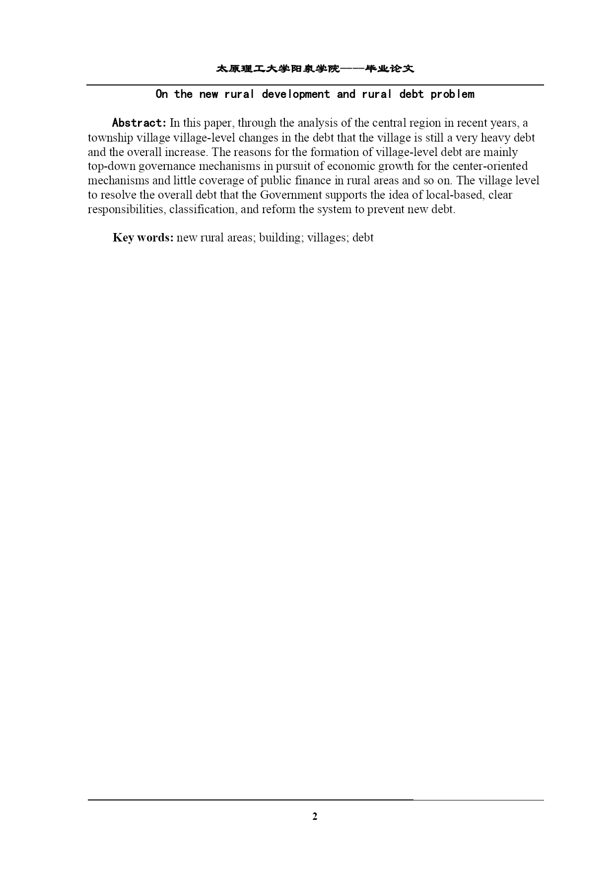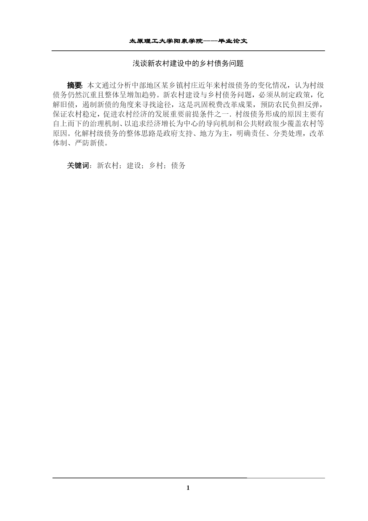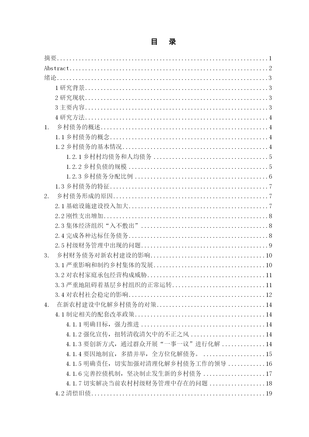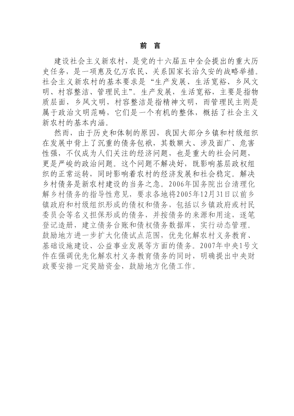 PAGEI前言建设社会主义新农村,是党的十六届五中全会提出的重大历史任务,是一项惠及亿万农民、关系国家长治久安的战略举措。社会主义新农村的基本要求是“生产发展、生活宽裕、乡风文明、村容整洁、管理民主”。生产发展,生活宽裕,主要是指物质层面,乡风文明,村容整洁是指精神文明,而管理民主则是属于政治文明范畴,它们是一个有机的整体,概括了社会主义新农村的基本内涵。然而,由于历史和体制的原因,我国大部分乡镇和村级组织在发展中背上了沉重的债务包袱,其数额大、涉及面广、危害性强,不仅成为人们关注的经济问题,也是重大的社会问题,更是严峻的政治问题。这个问题不解决好,既影响基层政权组织的正常运转,同时影响着农村的经济发展和社会稳定。解决乡村债务是新农村建设的当务之急。2006年国务院出台清理化解乡村债务的指导性意见,要求各地将2005年12月31日以前乡镇政府和村级组织形成的债权和债务,包括以乡镇政府或村民委员会等名义担保形成的债务,并按债务的来源和用途,逐笔登记造册,建立债务台账和债权债务数据库,实行动态管理。鼓励地方进一步扩大化债试点范围,优先化解农村义务教育、基础设施建设、公益事业发展等方面的债务。2007年中央1号文件在强调优先化解农村义务教育债务的同时,明确提出中央财政要安排一定奖励资金,鼓励地方化债工作。目录TOC\o"1-3"\h\z\uHYPERLINK\l"_Toc231983839"摘要PAGEREF_Toc231983839\h1HYPERLINK\l"_Toc231983841"AbstractPAGEREF_Toc231983841\h2HYPERLINK\l"_Toc231983842"绪论PAGEREF_Toc231983842\h3HYPERLINK\l"_Toc231983843"1研究背景PAGEREF_Toc231983843\h3HYPERLINK\l"_Toc231983844"2研究现状PAGEREF_Toc231983844\h3HYPERLINK\l"_Toc231983845"3主要内容PAGEREF_Toc231983845\h3HYPERLINK\l"_Toc231983846"4研究方法PAGEREF_Toc231983846\h4HYPERLINK\l"_Toc231983847"1.乡村债务的概述PAGEREF_Toc231983847\h4HYPERLINK\l"_Toc231983848"1.1乡村债务的概念PAGEREF_Toc231983848\h4HYPERLINK\l"_Toc231983849"1.2乡村债务的基本情况PAGEREF_Toc231983849\h4HYPERLINK\l"_Toc231983850"1.2.1乡村村均债务和人均债务PAGEREF_Toc231983850\h5HYPERLINK\l"_Toc231983851"1.2.2乡村负债的规模PAGEREF_Toc231983851\h5HYPERLINK\l"_Toc231983852"1.2.3乡村债务分配比例PAGEREF_Toc231983852\h6HYPERLINK\l"_Toc231983853"1.3乡村债务的特征PAGEREF_Toc231983853\h7HYPERLINK\l"_Toc231983854"2.乡村债务形成的原因PAGEREF_Toc231983854\h7HYPERLINK\l"_Toc231983855"2.1基础设施建设投入加大PAGEREF_Toc231983855\h7HYPERLINK\l"_Toc231983856"2.2刚性支出增加PAGEREF_Toc231983856\h8HYPERLINK\l"_Toc231983857"2.3集体经济组织“入不敷出”PAGEREF_Toc231983857\h8HYPERLINK\l"_Toc231983858"2.4完成各种达标任务债务PAGEREF_Toc231983858\h8HYPERLINK\l"_Toc231983859"2.5村级财务管理中出现的问题PAGEREF_Toc231983859\h9HYPERLINK\l"_Toc231983860"3.乡村财务债务对新农村建设的影响PAGEREF_Toc231983860\h10HYPERLINK\l"_Toc231983861"3.1严重影响和制约乡村集体的发展PAGEREF_To