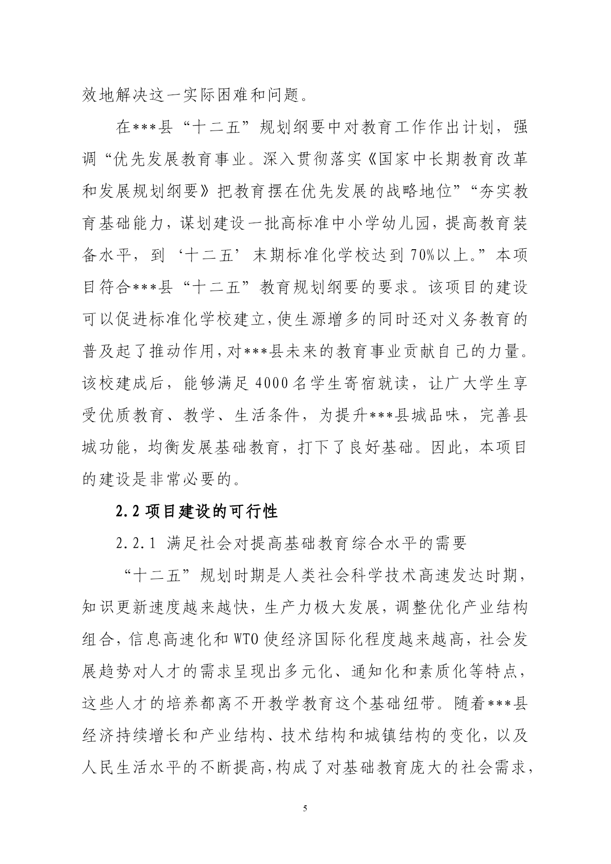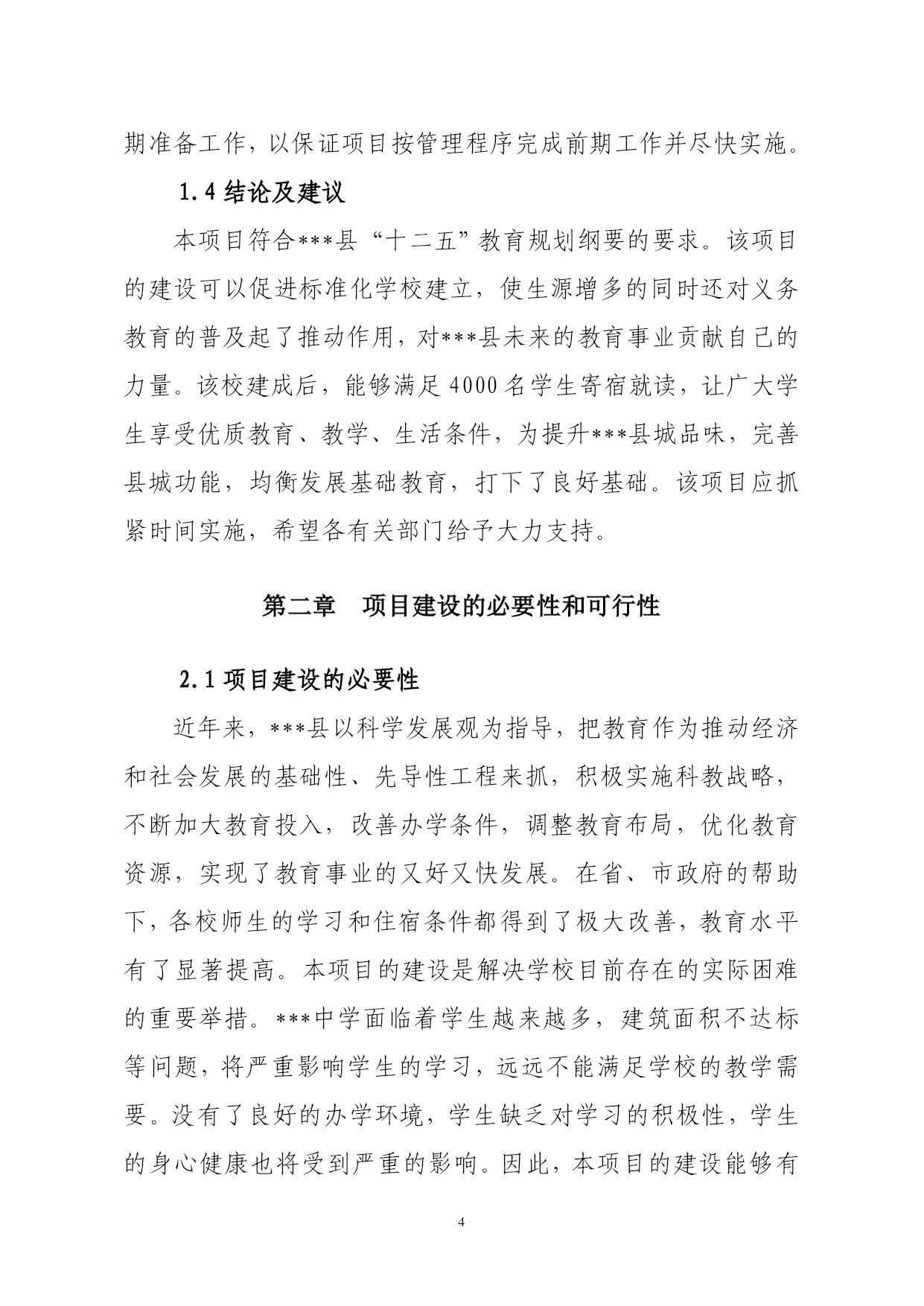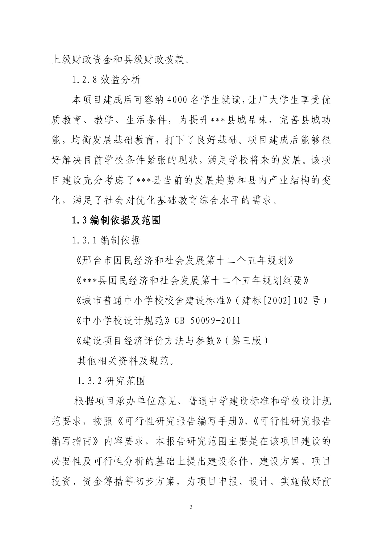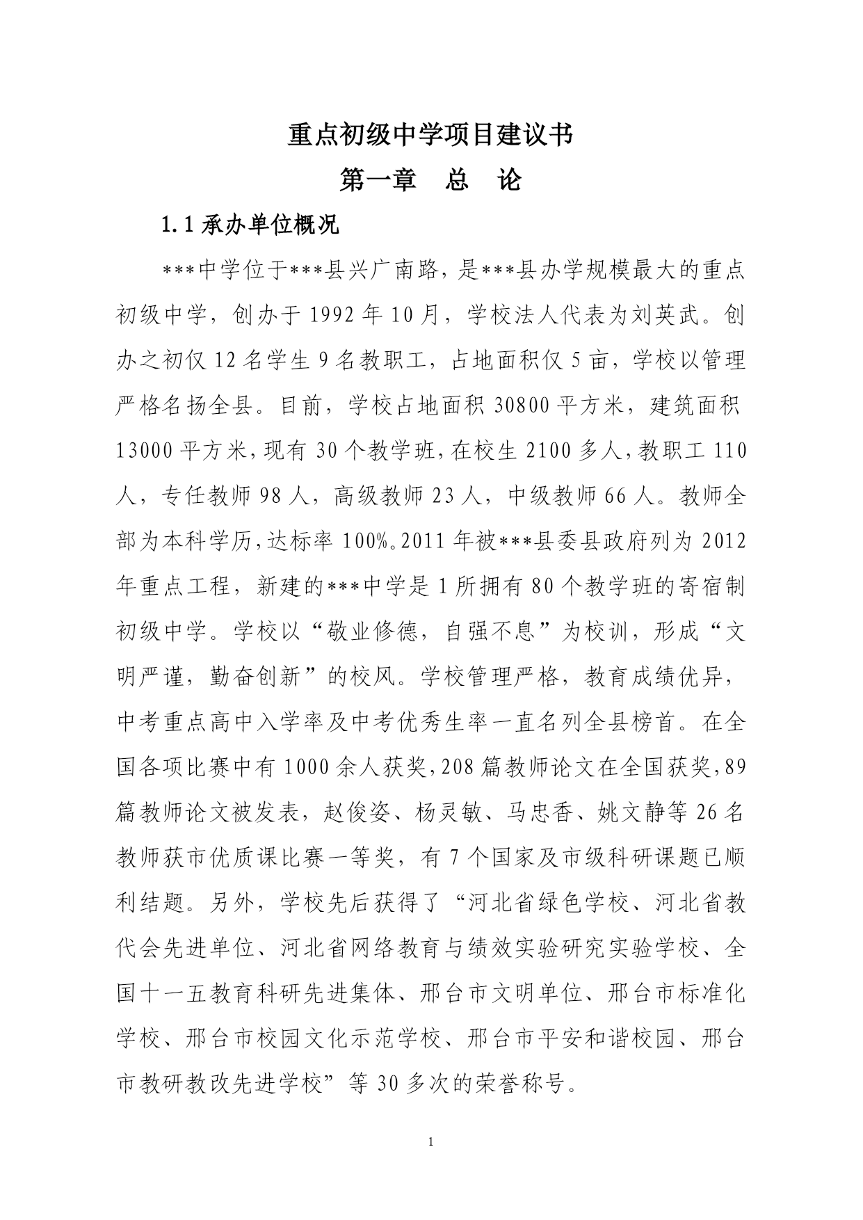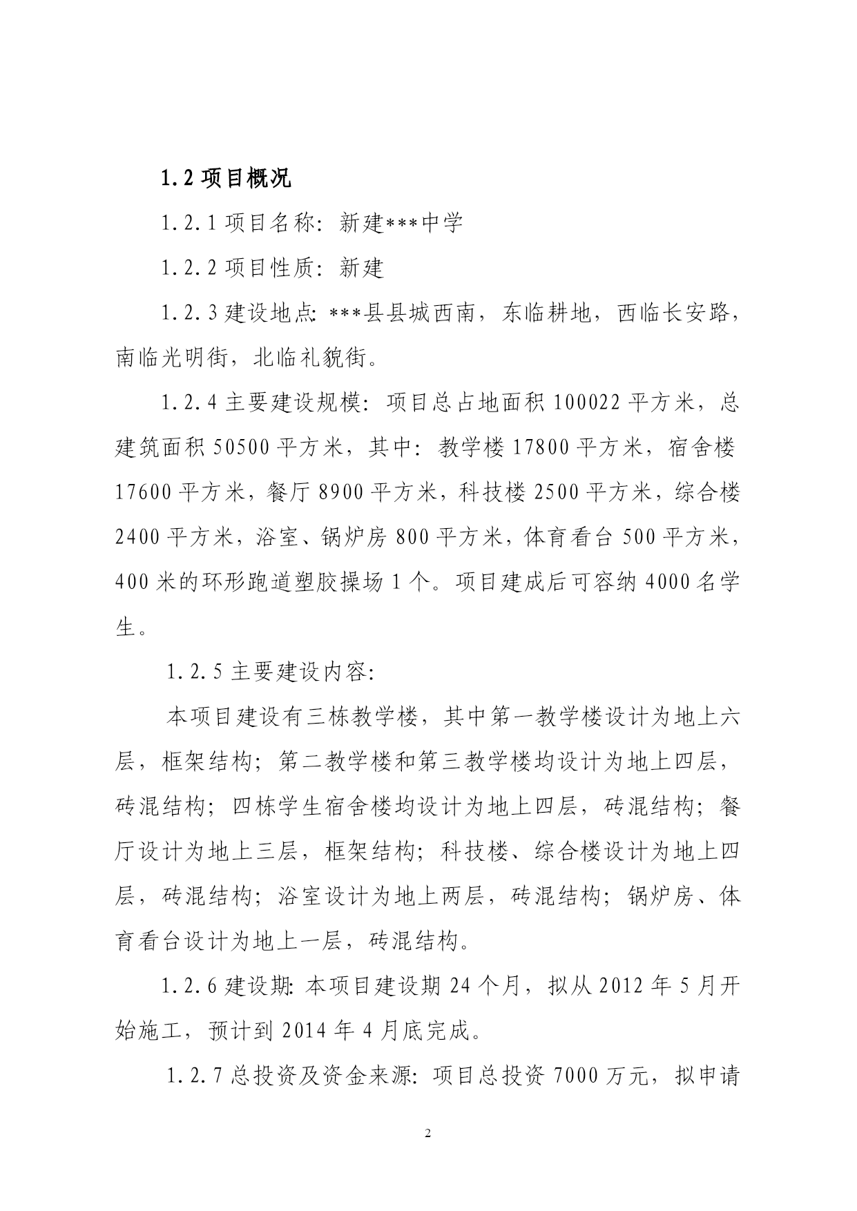 重点初级中学项目建议书第一章总论1.1承办单位概况***中学位于***县兴广南路,是***县办学规模最大的重点初级中学,创办于1992年10月,学校法人代表为刘英武。创办之初仅12名学生9名教职工,占地面积仅5亩,学校以管理严格名扬全县。目前,学校占地面积30800平方米,建筑面积13000平方米,现有30个教学班,在校生2100多人,教职工110人,专任教师98人,高级教师23人,中级教师66人。教师全部为本科学历,达标率100%。2011年被***县委县政府列为2012年重点工程,新建的***中学是1所拥有80个教学班的寄宿制初级中学。学校以“敬业修德,自强不息”为校训,形成“文明严谨,勤奋创新”的校风。学校管理严格,教育成绩优异,中考重点高中入学率及中考优秀生率一直名列全县榜首。在全国各项比赛中有1000余人获奖,208篇教师论文在全国获奖,89篇教师论文被发表,赵俊姿、杨灵敏、马忠香、姚文静等26名教师获市优质课比赛一等奖,有7个国家及市级科研课题已顺利结题。另外,学校先后获得了“河北省绿色学校、河北省教代会先进单位、河北省网络教育与绩效实验研究实验学校、全国十一五教育科研先进集体、邢台市文明单位、邢台市标准化学校、邢台市校园文化示范学校、邢台市平安和谐校园、邢台市教研教改先进学校”等30多次的荣誉称号。1.2项目概况1.2.1项目名称:新建***中学1.2.2项目性质:新建1.2.3建设地点:***县县城西南,东临耕地,西临长安路,南临光明街,北临礼貌街。1.2.4主要建设规模:项目总占地面积100022平方米,总建筑面积50500平方米,其中:教学楼17800平方米,宿舍楼17600平方米,餐厅8900平方米,科技楼2500平方米,综合楼2400平方米,浴室、锅炉房800平方米,体育看台500平方米,400米的环形跑道塑胶操场1个。项目建成后可容纳4000名学生。1.2.5主要建设内容:本项目建设有三栋教学楼,其中第一教学楼设计为地上六层,框架结构;第二教学楼和第三教学楼均设计为地上四层,砖混结构;四栋学生宿舍楼均设计为地上四层,砖混结构;餐厅设计为地上三层,框架结构;科技楼、综合楼设计为地上四层,砖混结构;浴室设计为地上两层,砖混结构;锅炉房、体育看台设计为地上一层,砖混结构。1.2.6建设期:本项目建设期24个月,拟从2012年5月开始施工,预计到2014年4月底完成。1.2.7总投资及资金来源:项目总投资7000万元,拟申请上级财政资金和县级财政拨款。1.2.8效益分析本项目建成后可容纳4000名学生就读,让广大学生享受优质教育、教学、生活条件,为提升***县城品味,完善县城功能,均衡发展基础教育,打下了良好基础。项目建成后能够很好解决目前学校条件紧张的现状,满足学校将来的发展。该项目建设充分考虑了***县当前的发展趋势和县内产业结构的变化,满足了社会对优化基础教育综合水平的需求。1.3编制依据及范围1.3.1编制依据《邢台市国民经济和社会发展第十二个五年规划》《***县国民经济和社会发展第十二个五年规划纲要》《城市普通中小学校校舍建设标准》(建标[2002]102号)《中小学校设计规范》GB50099-2011《建设项目经济评价方法与参数》(第三版)其他相关资料及规范。1.3.2研究范围根据项目承办单位意见、普通中学建设标准和学校设计规范要求,按照《可行性研究报告编写手册》、《可行性研究报告编写指南》内容要求,本报告研究范围主要是在该项目建设的必要性及可行性分析的基础上提出建设条件、建设方案、项目投资、资金筹措等初步方案,为项目申报、设计、实施做好前期准备工作,以保证项目按管理程序完成前期工作并尽快实施。1.4结论及建议本项目符合***县“十二五”教育规划纲要的要求。该项目的建设可以促进标准化学校建立,使生源增多的同时还对义务教育的普及起了推动作用,对***县未来的教育事业贡献自己的力量。该校建成后,能够满足4000名学生寄宿就读,让广大学生享受优质教育、教学、生活条件,为提升***县城品味,完善县城功能,均衡发展基础教育,打下了良好基础。该项目应抓紧时间实施,希望各有关部门给予大力支持。第二章项目建设的必要性和可行性2.1项目建设的必要性近年来,***县以科学发展观为指导,把教育作为推动经济和社会发展的基础性、先导性工程来抓,积极实施科教战略,不断加大教育投入,改善办学条件,调整教育布局,优化教育资源,实现了教育事业的又好又快发展。在省、市政府的帮助下,各校师生的学习和住宿条件都得到了极大改善,教育水平有了显著提高。本项目的建设是解决学校目前存在的实际困难的重要举措。***中学面临着学生越来越多,建筑面积不达标等问题,将严重影响学生的学习,远远不能满足学校的教学需要。没有