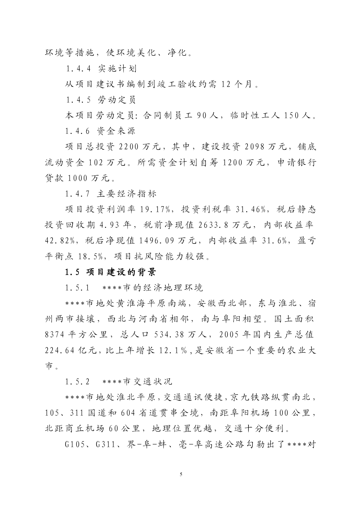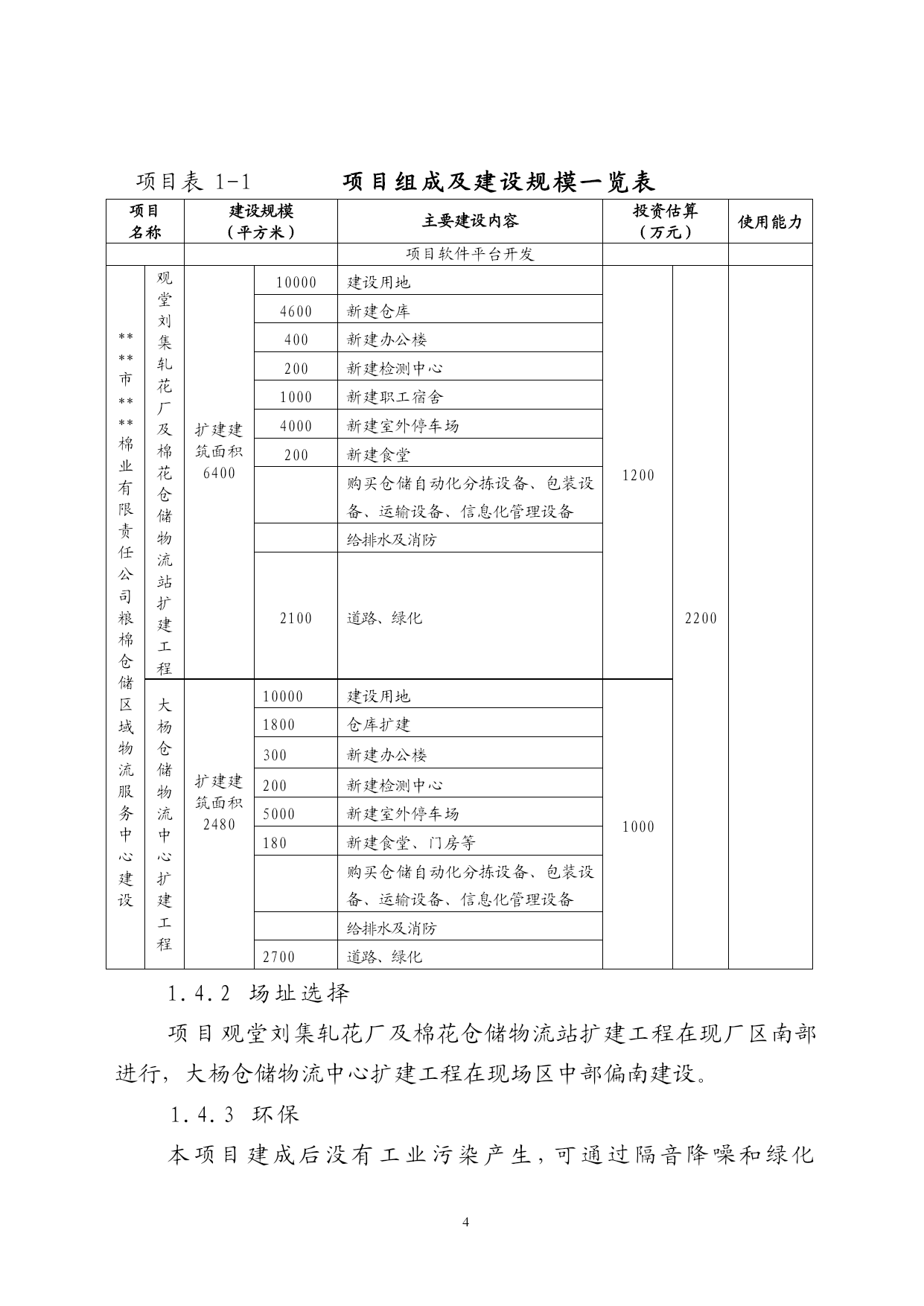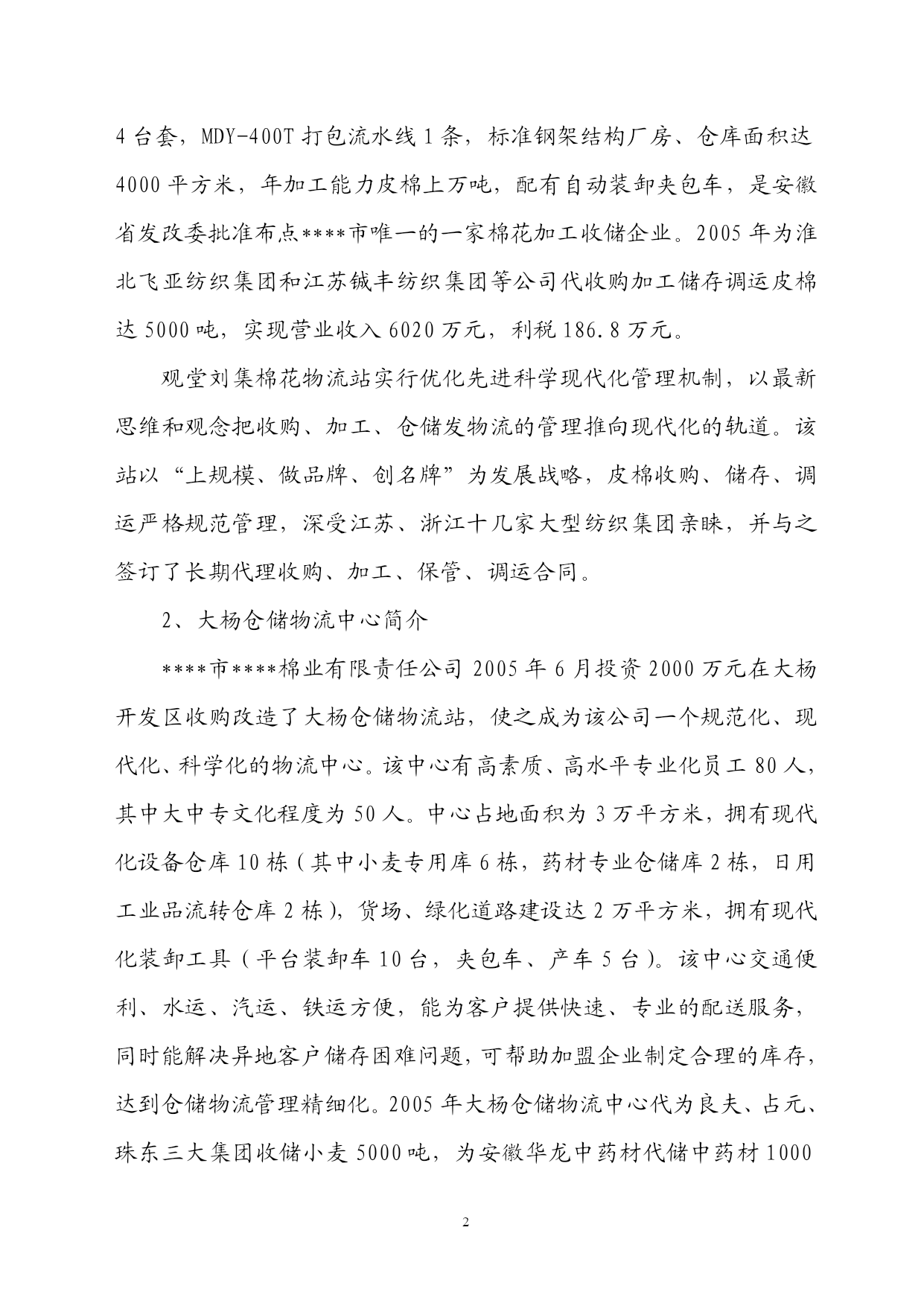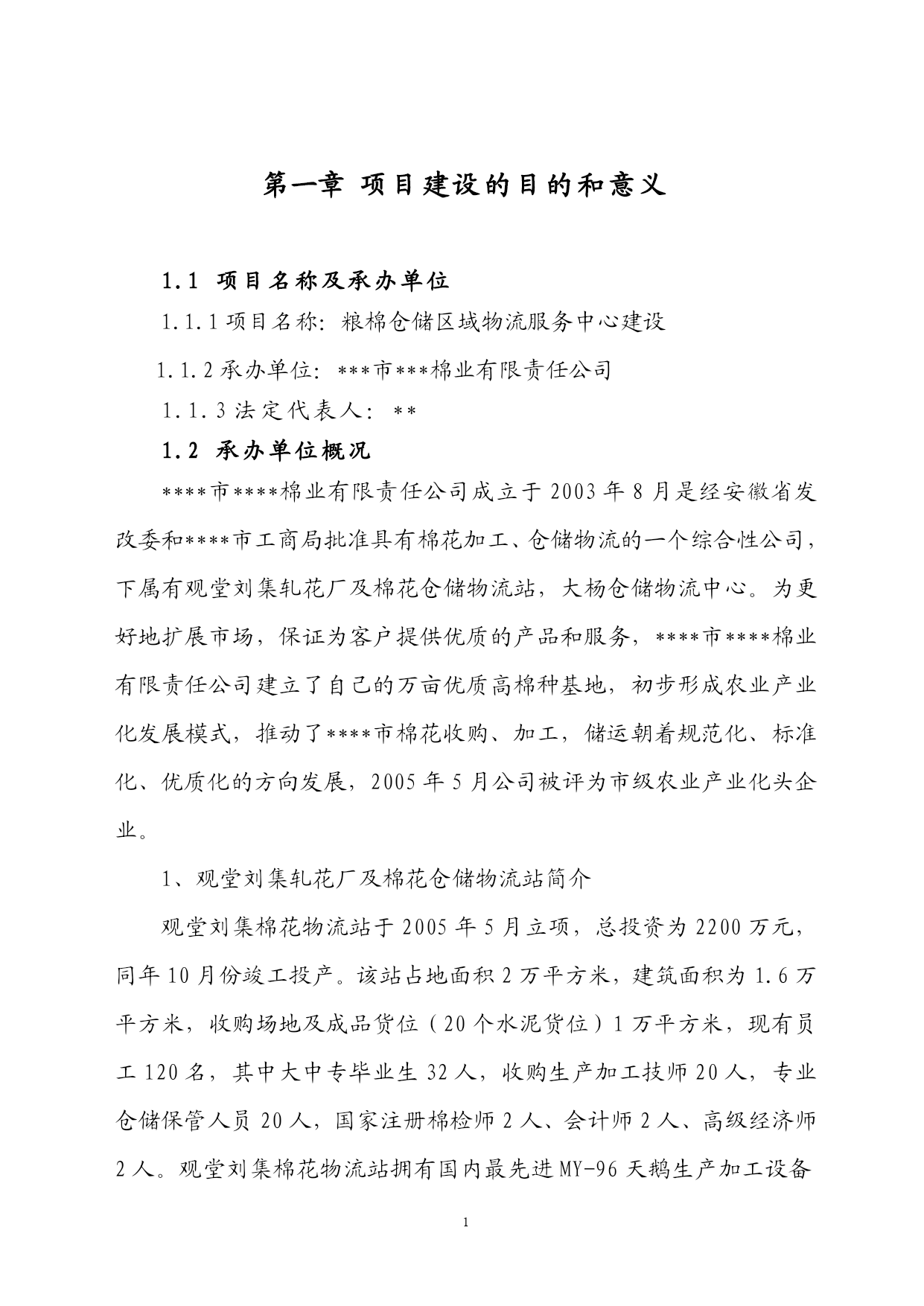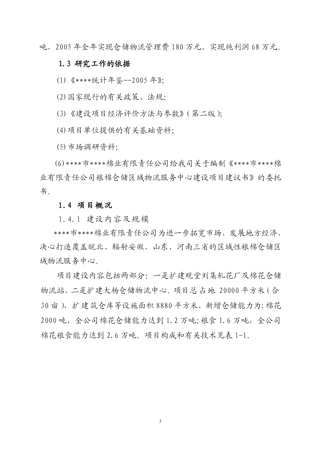 第一章项目建设的目的和意义1.1项目名称及承办单位1.1.1项目名称:粮棉仓储区域物流服务中心建设1.1.2承办单位:***市***棉业有限责任公司1.1.3法定代表人:**1.2承办单位概况****市****棉业有限责任公司成立于2003年8月是经安徽省发改委和****市工商局批准具有棉花加工、仓储物流的一个综合性公司,下属有观堂刘集轧花厂及棉花仓储物流站,大杨仓储物流中心。为更好地扩展市场,保证为客户提供优质的产品和服务,****市****棉业有限责任公司建立了自己的万亩优质高棉种基地,初步形成农业产业化发展模式,推动了****市棉花收购、加工,储运朝着规范化、标准化、优质化的方向发展,2005年5月公司被评为市级农业产业化头企业。1、观堂刘集轧花厂及棉花仓储物流站简介观堂刘集棉花物流站于2005年5月立项,总投资为2200万元,同年10月份竣工投产。该站占地面积2万平方米,建筑面积为1.6万平方米,收购场地及成品货位(20个水泥货位)1万平方米,现有员工120名,其中大中专毕业生32人,收购生产加工技师20人,专业仓储保管人员20人,国家注册棉检师2人、会计师2人、高级经济师2人。观堂刘集棉花物流站拥有国内最先进MY-96天鹅生产加工设备4台套,MDY-400T打包流水线1条,标准钢架结构厂房、仓库面积达4000平方米,年加工能力皮棉上万吨,配有自动装卸夹包车,是安徽省发改委批准布点****市唯一的一家棉花加工收储企业。2005年为淮北飞亚纺织集团和江苏铖丰纺织集团等公司代收购加工储存调运皮棉达5000吨,实现营业收入6020万元,利税186.8万元。观堂刘集棉花物流站实行优化先进科学现代化管理机制,以最新思维和观念把收购、加工、仓储发物流的管理推向现代化的轨道。该站以“上规模、做品牌、创名牌”为发展战略,皮棉收购、储存、调运严格规范管理,深受江苏、浙江十几家大型纺织集团亲睐,并与之签订了长期代理收购、加工、保管、调运合同。2、大杨仓储物流中心简介****市****棉业有限责任公司2005年6月投资2000万元在大杨开发区收购改造了大杨仓储物流站,使之成为该公司一个规范化、现代化、科学化的物流中心。该中心有高素质、高水平专业化员工80人,其中大中专文化程度为50人。中心占地面积为3万平方米,拥有现代化设备仓库10栋(其中小麦专用库6栋,药材专业仓储库2栋,日用工业品流转仓库2栋),货场、绿化道路建设达2万平方米,拥有现代化装卸工具(平台装卸车10台,夹包车、产车5台)。该中心交通便利、水运、汽运、铁运方便,能为客户提供快速、专业的配送服务,同时能解决异地客户储存困难问题,可帮助加盟企业制定合理的库存,达到仓储物流管理精细化。2005年大杨仓储物流中心代为良夫、占元、珠东三大集团收储小麦5000吨,为安徽华龙中药材代储中药材1000吨,2005年全年实现仓储物流管理费180万元,实现纯利润68万元。1.3研究工作的依据(1)《****统计年鉴--2005年》;(2)国家现行的有关政策、法规;(3)《建设项目经济评价方法与参数》(第二版);(4)项目单位提供的有关基础资料;(5)市场调研资料;(6)****市****棉业有限责任公司给我司关于编制《****市****棉业有限责任公司粮棉仓储区域物流服务中心建设项目建议书》的委托书。1.4项目概况1.4.1建设内容及规模****市****棉业有限责任公司为进一步拓宽市场,发展地方经济,决心打造覆盖皖北、辐射安徽、山东、河南三省的区域性粮棉仓储区域物流服务中心。项目建设内容包括两部分:一是扩建观堂刘集轧花厂及棉花仓储物流站,二是扩建大杨仓储物流中心。项目总占地20000平方米(合30亩),扩建筑仓库等设施面积8880平方米,新增仓储能力为:棉花2000吨,全公司棉花仓储能力达到1.2万吨;粮食1.6万吨,全公司棉花粮食能力达到2.6万吨。项目构成和有关技术见表1-1。项目表1-1项目组成及建设规模一览表项目名称建设规模(平方米)主要建设内容投资估算(万元)使用能力项目软件平台开发****市****棉业有限责任公司粮棉仓储区域物流服务中心建设观堂刘集轧花厂及棉花仓储物流站扩建工程扩建建筑面积640010000建设用地120022004600新建仓库400新建办公楼200新建检测中心1000新建职工宿舍4000新建室外停车场200新建食堂购买仓储自动化分拣设备、包装设备、运输设备、信息化管理设备给排水及消防2100道路、绿化大杨仓储物流中心扩建工程扩建建筑面积248010000建设用地10001800仓库扩建300新建办公楼200新建检测中心5000新建室外停车场180新建食堂、门房等购买仓储自动化分拣设备、包装设备、运输设备、信息化管理设备给排水及消