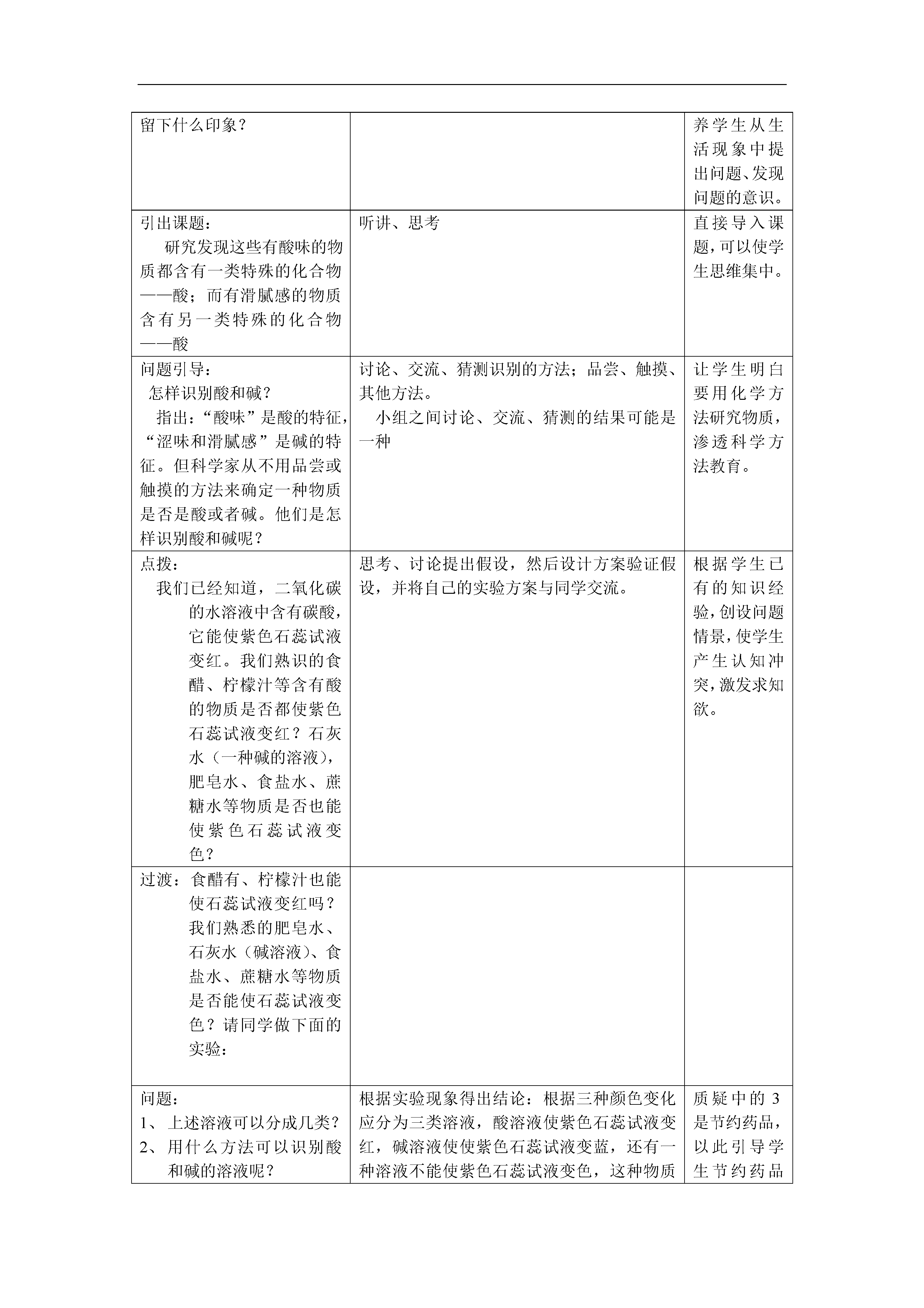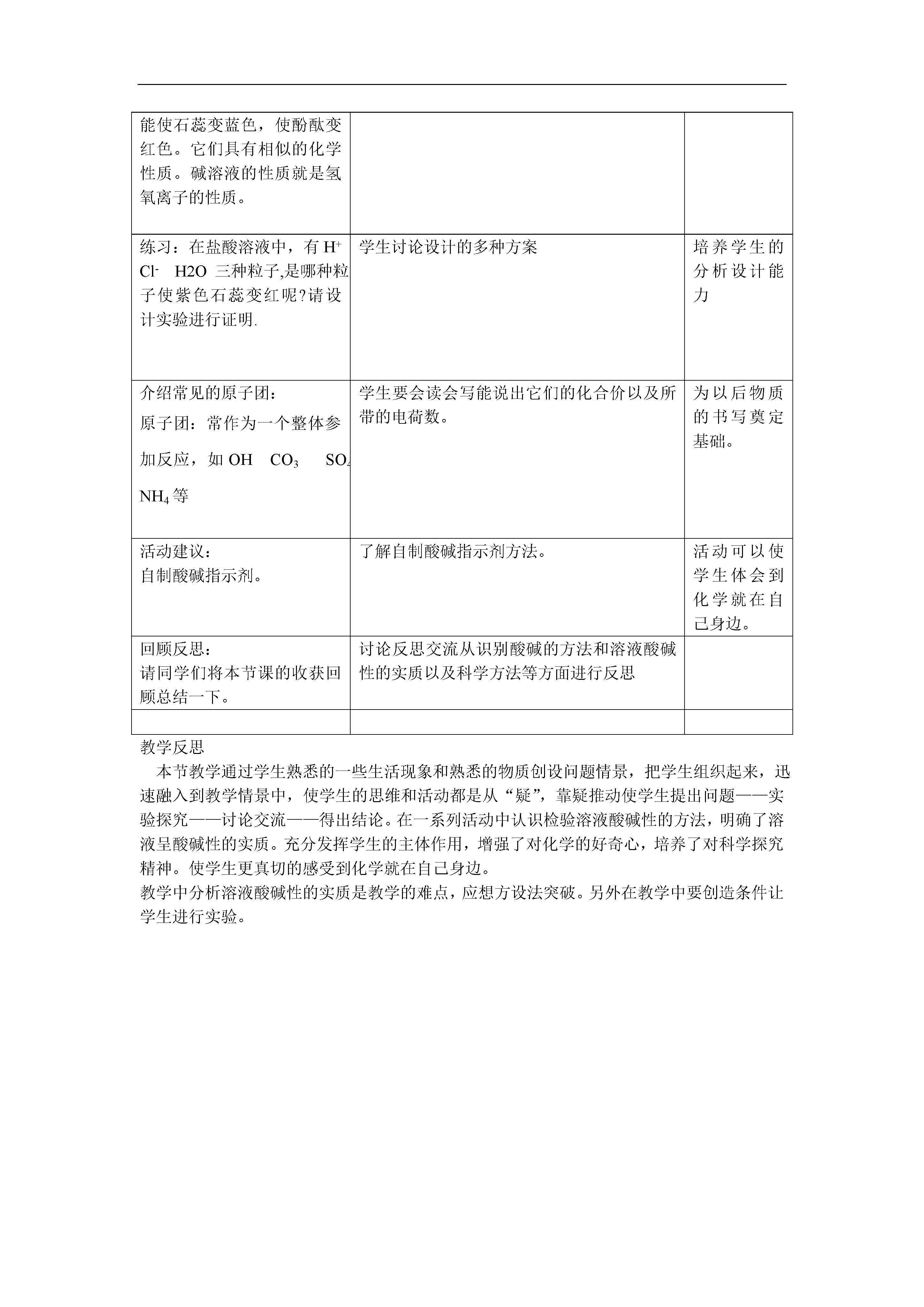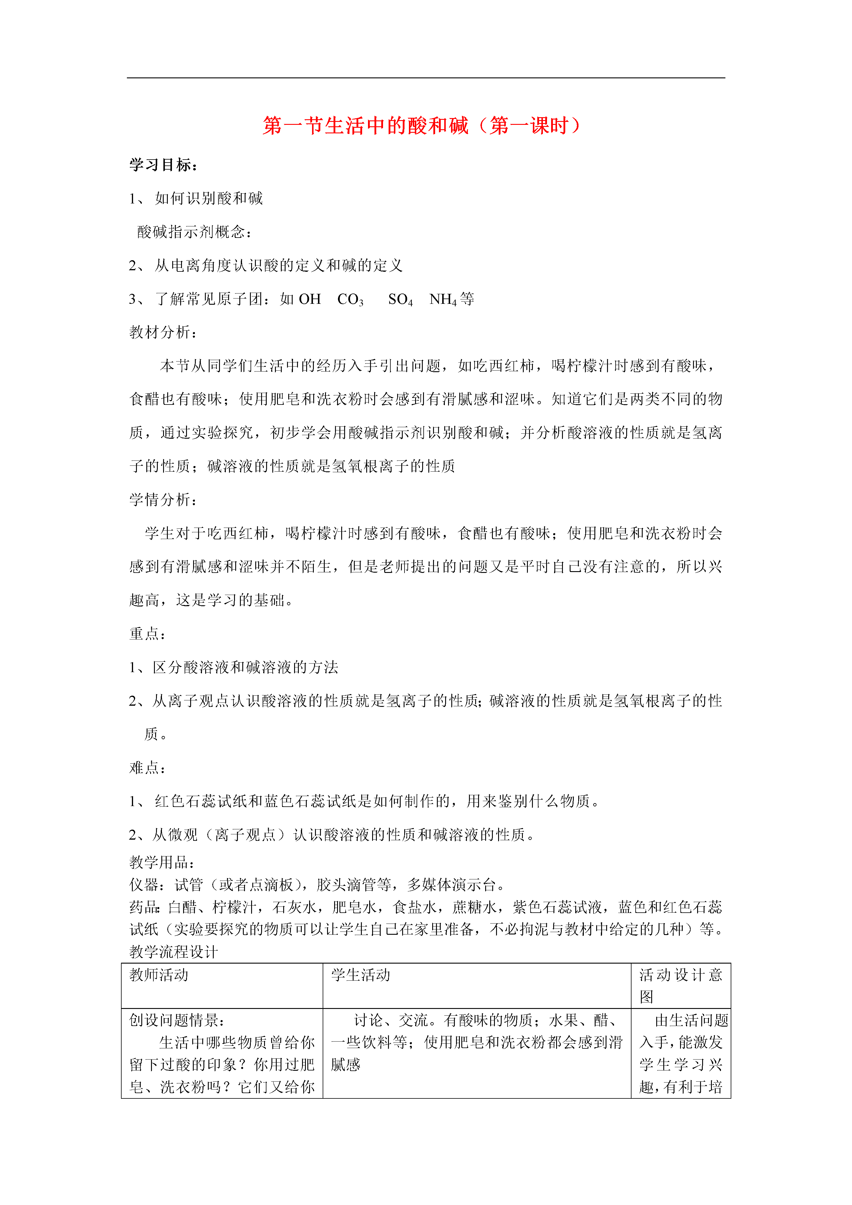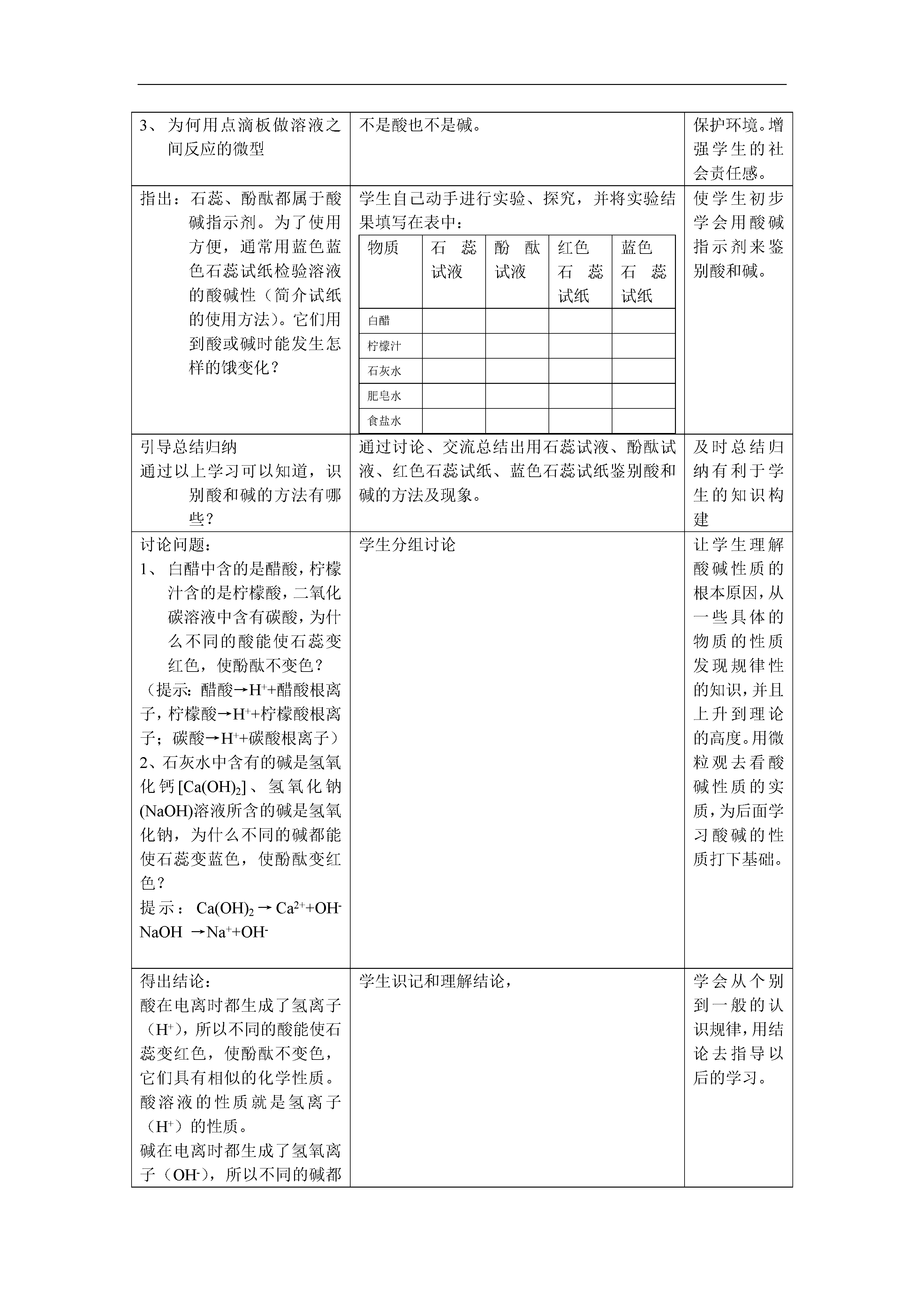 第一节生活中的酸和碱(第一课时)学习目标:如何识别酸和碱酸碱指示剂概念:从电离角度认识酸的定义和碱的定义了解常见原子团:如OHCO3SO4NH4等教材分析:本节从同学们生活中的经历入手引出问题,如吃西红柿,喝柠檬汁时感到有酸味,食醋也有酸味;使用肥皂和洗衣粉时会感到有滑腻感和涩味。知道它们是两类不同的物质,通过实验探究,初步学会用酸碱指示剂识别酸和碱;并分析酸溶液的性质就是氢离子的性质;碱溶液的性质就是氢氧根离子的性质学情分析:学生对于吃西红柿,喝柠檬汁时感到有酸味,食醋也有酸味;使用肥皂和洗衣粉时会感到有滑腻感和涩味并不陌生,但是老师提出的问题又是平时自己没有注意的,所以兴趣高,这是学习的基础。重点:1、区分酸溶液和碱溶液的方法2、从离子观点认识酸溶液的性质就是氢离子的性质;碱溶液的性质就是氢氧根离子的性质。难点:红色石蕊试纸和蓝色石蕊试纸是如何制作的,用来鉴别什么物质。2、从微观(离子观点)认识酸溶液的性质和碱溶液的性质。教学用品:仪器:试管(或者点滴板),胶头滴管等,多媒体演示台。药品:白醋、柠檬汁,石灰水,肥皂水,食盐水,蔗糖水,紫色石蕊试液,蓝色和红色石蕊试纸(实验要探究的物质可以让学生自己在家里准备,不必拘泥与教材中给定的几种)等。教学流程设计教师活动学生活动活动设计意图创设问题情景:生活中哪些物质曾给你留下过酸的印象?你用过肥皂、洗衣粉吗?它们又给你留下什么印象?讨论、交流。有酸味的物质;水果、醋、一些饮料等;使用肥皂和洗衣粉都会感到滑腻感由生活问题入手,能激发学生学习兴趣,有利于培养学生从生活现象中提出问题、发现问题的意识。引出课题:研究发现这些有酸味的物质都含有一类特殊的化合物——酸;而有滑腻感的物质含有另一类特殊的化合物——酸听讲、思考直接导入课题,可以使学生思维集中。问题引导:怎样识别酸和碱?指出:“酸味”是酸的特征,“涩味和滑腻感”是碱的特征。但科学家从不用品尝或触摸的方法来确定一种物质是否是酸或者碱。他们是怎样识别酸和碱呢?讨论、交流、猜测识别的方法;品尝、触摸、其他方法。小组之间讨论、交流、猜测的结果可能是一种让学生明白要用化学方法研究物质,渗透科学方法教育。点拨:我们已经知道,二氧化碳的水溶液中含有碳酸,它能使紫色石蕊试液变红。我们熟识的食醋、柠檬汁等含有酸的物质是否都使紫色石蕊试液变红?石灰水(一种碱的溶液),肥皂水、食盐水、蔗糖水等物质是否也能使紫色石蕊试液变色?思考、讨论提出假设,然后设计方案验证假设,并将自己的实验方案与同学交流。根据学生已有的知识经验,创设问题情景,使学生产生认知冲突,激发求知欲。过渡:食醋有、柠檬汁也能使石蕊试液变红吗?我们熟悉的肥皂水、石灰水(碱溶液)、食盐水、蔗糖水等物质是否能使石蕊试液变色?请同学做下面的实验:问题:上述溶液可以分成几类?用什么方法可以识别酸和碱的溶液呢?为何用点滴板做溶液之间反应的微型根据实验现象得出结论:根据三种颜色变化应分为三类溶液,酸溶液使紫色石蕊试液变红,碱溶液使使紫色石蕊试液变蓝,还有一种溶液不能使紫色石蕊试液变色,这种物质不是酸也不是碱。质疑中的3是节约药品,以此引导学生节约药品保护环境。增强学生的社会责任感。指出:石蕊、酚酞都属于酸碱指示剂。为了使用方便,通常用蓝色蓝色石蕊试纸检验溶液的酸碱性(简介试纸的使用方法)。它们用到酸或碱时能发生怎样的饿变化?学生自己动手进行实验、探究,并将实验结果填写在表中:物质石蕊试液酚酞试液红色石蕊试纸蓝色石蕊试纸白醋柠檬汁石灰水肥皂水食盐水使学生初步学会用酸碱指示剂来鉴别酸和碱。引导总结归纳通过以上学习可以知道,识别酸和碱的方法有哪些?通过讨论、交流总结出用石蕊试液、酚酞试液、红色石蕊试纸、蓝色石蕊试纸鉴别酸和碱的方法及现象。及时总结归纳有利于学生的知识构建讨论问题:白醋中含的是醋酸,柠檬汁含的是柠檬酸,二氧化碳溶液中含有碳酸,为什么不同的酸能使石蕊变红色,使酚酞不变色?(提示:醋酸→H++醋酸根离子,柠檬酸→H++柠檬酸根离子;碳酸→H++碳酸根离子)2、石灰水中含有的碱是氢氧化钙[Ca(OH)2]、氢氧化钠(NaOH)溶液所含的碱是氢氧化钠,为什么不同的碱都能使石蕊变蓝色,使酚酞变红色?提示:Ca(OH)2→Ca2++OH-NaOH→Na++OH-学生分组讨论让学生理解酸碱性质的根本原因,从一些具体的物质的性质发现规律性的知识,并且上升到理论的高度。用微粒观去看酸碱性质的实质,为后面学习酸碱的性质打下基础。得出结论:酸在电离时都生成了氢离子(H+),所以不同的酸能使石蕊变红色,使酚酞不变色,它们具有相似的化学性质。酸溶液的性质就是氢离子(H+)的性质。碱在电离时都生成了氢氧离子(OH-),所以不同的碱