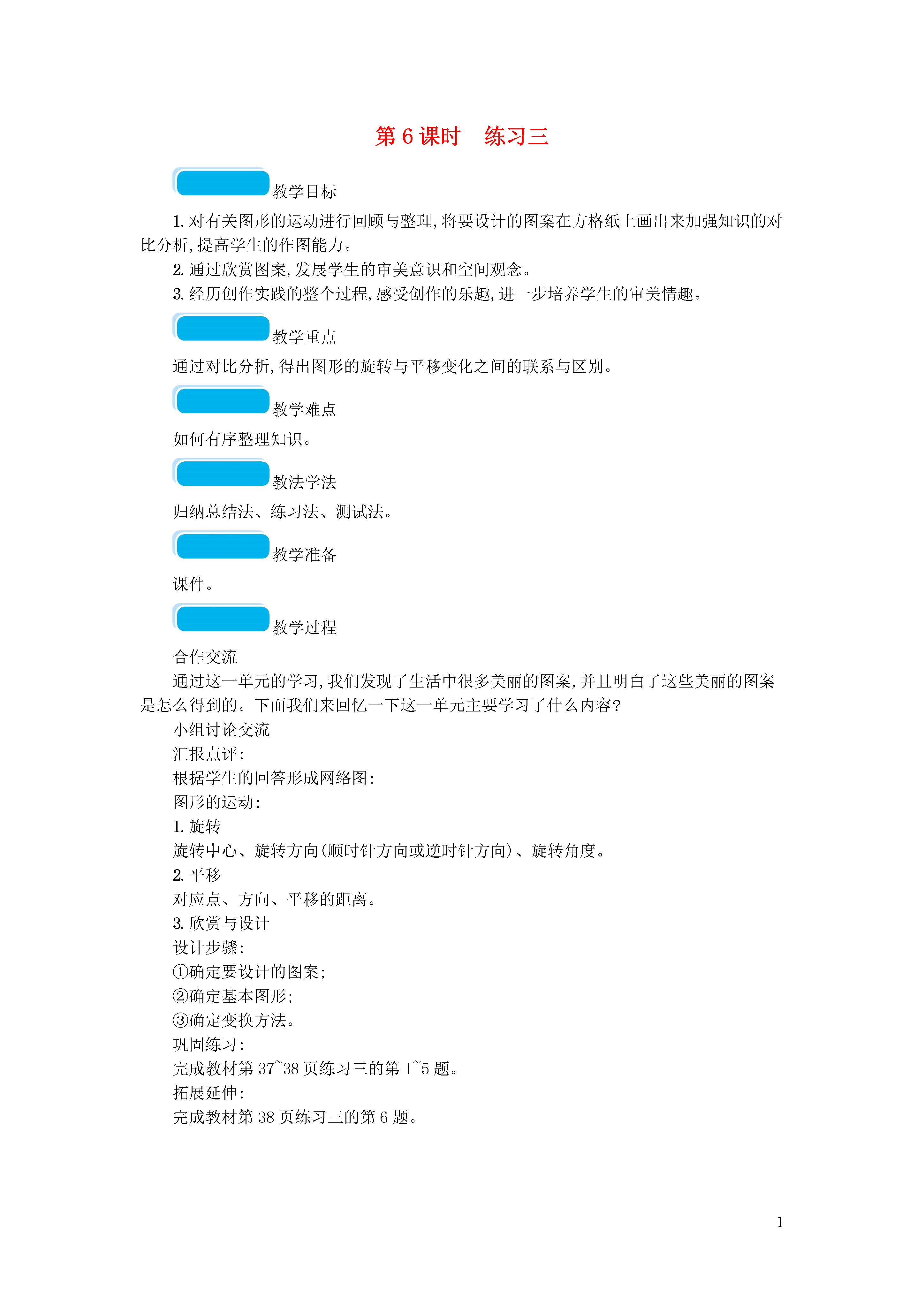 1第6课时练习三教学目标1.对有关图形的运动进行回顾与整理,将要设计的图案在方格纸上画出来加强知识的对比分析,提高学生的作图能力。2.通过欣赏图案,发展学生的审美意识和空间观念。3.经历创作实践的整个过程,感受创作的乐趣,进一步培养学生的审美情趣。教学重点通过对比分析,得出图形的旋转与平移变化之间的联系与区别。教学难点如何有序整理知识。教法学法归纳总结法、练习法、测试法。教学准备课件。教学过程合作交流通过这一单元的学习,我们发现了生活中很多美丽的图案,并且明白了这些美丽的图案是怎么得到的。下面我们来回忆一下这一单元主要学习了什么内容?小组讨论交流汇报点评:根据学生的回答形成网络图:图形的运动:1.旋转旋转中心、旋转方向(顺时针方向或逆时针方向)、旋转角度。2.平移对应点、方向、平移的距离。3.欣赏与设计设计步骤:①确定要设计的图案;②确定基本图形;③确定变换方法。巩固练习:完成教材第37~38页练习三的第1~5题。拓展延伸:完成教材练习三的第6题。