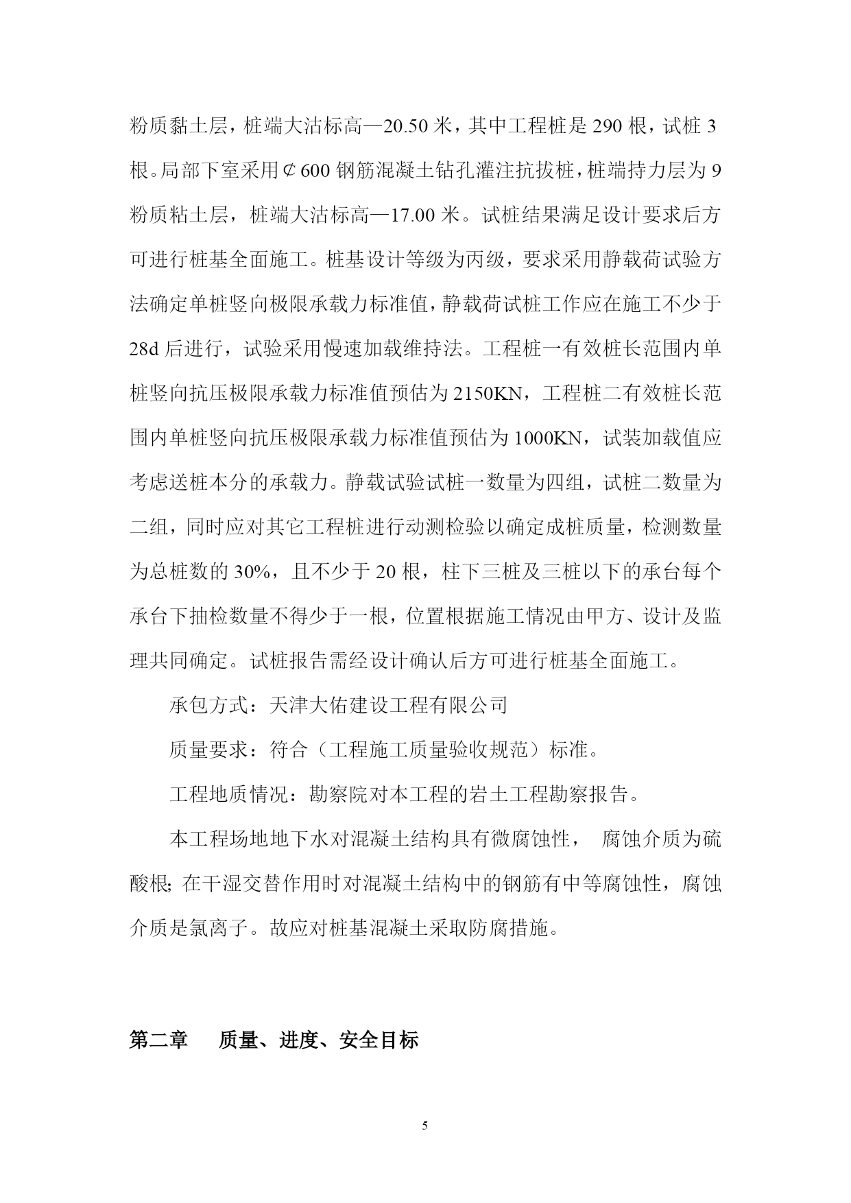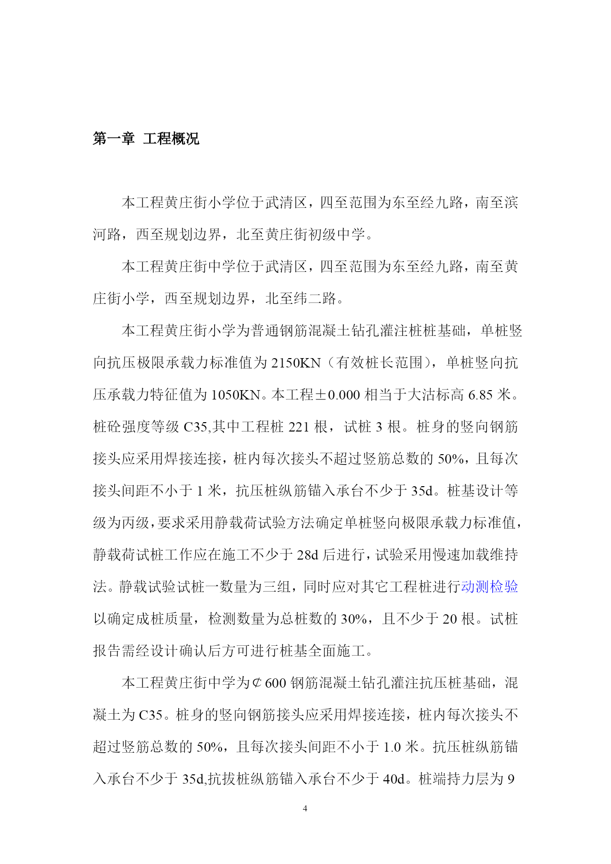 桩基施工组织设计方案天津市武清区建筑工程总公司编制依据1、按照《建筑桩基技术规范JGJ98—2008》、《建筑地基基础设计规范GBJ50007—2002》、《建筑地基基础工程施工质量验收规范GB50202-2002》等有关国家的法律法规及规范,进行编制。2、本工程的招标文件、施工图纸、地质资料。3、参照了国际标准ISO9001中有关的程序文件、质量手册、技术标准等。4、现场踏勘、工程周边环境的了解。5、公司类似工程经验。目录第一章工程概况第二章质量、进度、安全目标施工部署主要工艺技术措施第五章施工工期保证措施工程质量保证措施第七章安全生产、文明施工管理措施第一章工程概况本工程黄庄街小学位于武清区,四至范围为东至经九路,南至滨河路,西至规划边界,北至黄庄街初级中学。本工程黄庄街中学位于武清区,四至范围为东至经九路,南至黄庄街小学,西至规划边界,北至纬二路。本工程黄庄街小学为普通钢筋混凝土钻孔灌注桩桩基础,单桩竖向抗压极限承载力标准值为2150KN(有效桩长范围),单桩竖向抗压承载力特征值为1050KN。本工程±0.000相当于大沽标高6.85米。桩砼强度等级C35,其中工程桩221根,试桩3根。桩身的竖向钢筋接头应采用焊接连接,桩内每次接头不超过竖筋总数的50%,且每次接头间距不小于1米,抗压桩纵筋锚入承台不少于35d。桩基设计等级为丙级,要求采用静载荷试验方法确定单桩竖向极限承载力标准值,静载荷试桩工作应在施工不少于28d后进行,试验采用慢速加载维持法。静载试验试桩一数量为三组,同时应对其它工程桩进行动测检验以确定成桩质量,检测数量为总桩数的30%,且不少于20根。试桩报告需经设计确认后方可进行桩基全面施工。本工程黄庄街中学为¢600钢筋混凝土钻孔灌注抗压桩基础,混凝土为C35。桩身的竖向钢筋接头应采用焊接连接,桩内每次接头不超过竖筋总数的50%,且每次接头间距不小于1.0米。抗压桩纵筋锚入承台不少于35d,抗拔桩纵筋锚入承台不少于40d。桩端持力层为9粉质黏土层,桩端大沽标高—20.50米,其中工程桩是290根,试桩3根。局部下室采用¢600钢筋混凝土钻孔灌注抗拔桩,桩端持力层为9粉质粘土层,桩端大沽标高—17.00米。试桩结果满足设计要求后方可进行桩基全面施工。桩基设计等级为丙级,要求采用静载荷试验方法确定单桩竖向极限承载力标准值,静载荷试桩工作应在施工不少于28d后进行,试验采用慢速加载维持法。工程桩一有效桩长范围内单桩竖向抗压极限承载力标准值预估为2150KN,工程桩二有效桩长范围内单桩竖向抗压极限承载力标准值预估为1000KN,试装加载值应考虑送桩本分的承载力。静载试验试桩一数量为四组,试桩二数量为二组,同时应对其它工程桩进行动测检验以确定成桩质量,检测数量为总桩数的30%,且不少于20根,柱下三桩及三桩以下的承台每个承台下抽检数量不得少于一根,位置根据施工情况由甲方、设计及监理共同确定。试桩报告需经设计确认后方可进行桩基全面施工。承包方式:天津大佑建设工程有限公司质量要求:符合(工程施工质量验收规范)标准。工程地质情况:勘察院对本工程的岩土工程勘察报告。本工程场地地下水对混凝土结构具有微腐蚀性,腐蚀介质为硫酸根;在干湿交替作用时对混凝土结构中的钢筋有中等腐蚀性,腐蚀介质是氯离子。故应对桩基混凝土采取防腐措施。第二章质量、进度、安全目标根据招标文件要求,我公司将工程质量、进度、安全目标确定如下:质量目标:工程施工质量和管理质量目标达到(工程施工质量验收规范)的合格标准。进度目标:自甲方签字确认的开工日期后15天内完成投标范围内工作。(不包括不可抗力停待时间)。(具体以开工报告为准)。安全文明施工目标:确保施工期内安全零事故;争创杭州安全、文明施工标化工地。第三章施工部署第一节施工策划和施工准备施工策划根据本工程地质条件,结合我公司的技术水平,机械装备和施工经验,使工期尽可能提前,实行桩基施工和保护周围环境二位一体的原则。同时考虑现场实际情况及配备的用水、用电情况,我公司拟投入3台钻机。针对本工程特定的地质条件,届时将针对实际情况采用改进钻头等措施,抽调精兵强将,科学合理安排各道工序,采用平行作业,交叉作业相结合的施工方法,精心组织,精心施工,确保质量;按期完成任务。二、施工顺序及施工区段的划分根据施工要求工程桩开工前应先进行试打桩,试打桩结束后,我们将根据试打桩的参数、工程工期及现场实际情况,开动所有钻机进行工程施工;为了确保工期,对施工场区进行划分;每台钻机都划分好界限范围,避免出现撞车的发生。施工准备我们将在接到甲方中标通知后三天内做好以下生产和技术准备。1、生产准备①办理夜间施工许可证及有关手续;②组织人员、设备进场,平整场地,搭建临设,树立安全牌,布设防火设施。③挖好泥浆循环池及废浆池;④平