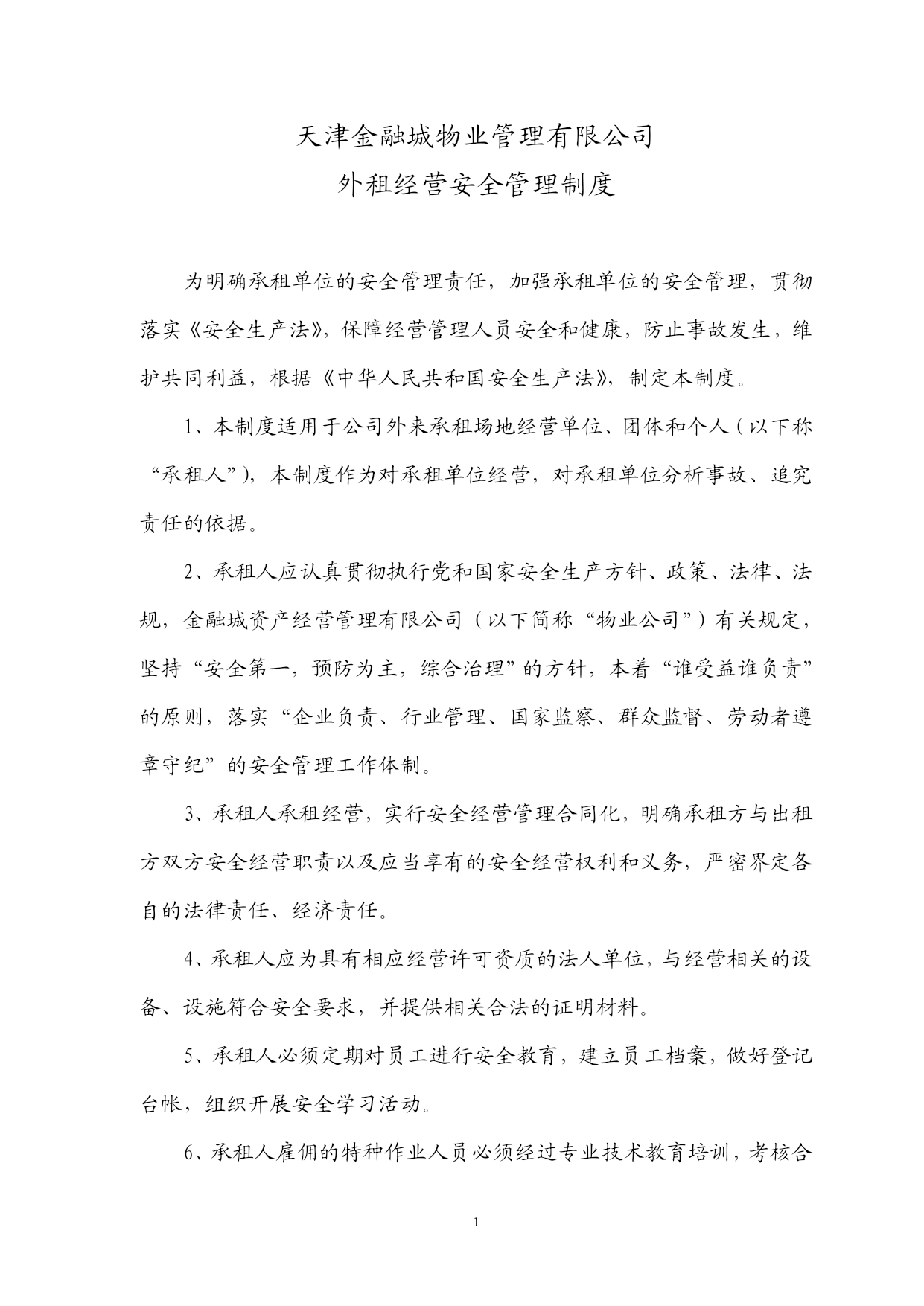 天津金融城物业管理有限公司外租经营安全管理制度为明确承租单位的安全管理责任,加强承租单位的安全管理,贯彻落实《安全生产法》,保障经营管理人员安全和健康,防止事故发生,维护共同利益,根据《中华人民共和国安全生产法》,制定本制度。1、本制度适用于公司外来承租场地经营单位、团体和个人(以下称“承租人”),本制度作为对承租单位经营,对承租单位分析事故、追究责任的依据。2、承租人应认真贯彻执行党和国家安全生产方针、政策、法律、法规,金融城资产经营管理有限公司(以下简称“物业公司”)有关规定,坚持“安全第一,预防为主,综合治理”的方针,本着“谁受益谁负责”的原则,落实“企业负责、行业管理、国家监察、群众监督、劳动者遵章守纪”的安全管理工作体制。3、承租人承租经营,实行安全经营管理合同化,明确承租方与出租方双方安全经营职责以及应当享有的安全经营权利和义务,严密界定各自的法律责任、经济责任。4、承租人应为具有相应经营许可资质的法人单位,与经营相关的设备、设施符合安全要求,并提供相关合法的证明材料。5、承租人必须定期对员工进行安全教育,建立员工档案,做好登记台帐,组织开展安全学习活动。6、承租人雇佣的特种作业人员必须经过专业技术教育培训,考核合格,取得操作资格证书,方可上岗操作。7、承租人法定代表人或委托代理人、驻地代表人依法对承包经营范围内的安全管理工作全面负责。同时建立健全安全生产责任制和安全生产教育培训制度,保证安全经营所需资金的投入,配备安全管理人员,并定期或不定期进行安全检查,同时做好安全检查记录。8、承租人专(兼)职安全管理人员负责承租区域的安全检查。发现安全隐患,应当及时进行整改。对违章操作,违章指挥的,必须立即制止。9、承租人必须严格遵守《安全协议》要求,落实责任和安全措施,接受物业公司安全检查人员的监督、检查,对查出的问题及时进行整改。对涉及重大安全隐患或可能危及整体安全的隐患,物业公司有权令其停止营业或作业,直至整改验收合格方能进行营业。10、承租人安全管理不到位,或其员工严重违章,造成各种事故,给出租人造成经济损失的,按合同规定原价赔偿。11、承租人员工故意破坏公共设施、安全设施、通讯设施,按原价赔偿,若数额巨大,触犯法律的,移交司法机关处理。12、承租人法人应当履行的安全管理职责:(1)对承租经营范围内的安全管理负总责,保证员工的安全权利;(2)服从出租单位的安全管理与协调,执行各种安全指令。依据安全生产法律法规、出租单位的安全管理制度,对所用员工实施安全管理;(3)对经营管理中应当具备的安全条件负责,保证资金投入,及时整改隐患;(4)组织所用员工实施的全员安全教育培训、取证,保证所用员工持有三级安全教育合格证或特殊工种操作证;(5)对员工实行日常安全教育。13、承租人不得经营国家明令禁止的危险化学品和剧毒化学品。14、物业公司应与承租人签订《房屋租赁安全协议书》,明确各自的安全管理职责和应当采取的安全措施,并认真执行协议内容。天津金融城物业管理有限公司二〇〇九年十月个人工作业务总结本人于2009年7月进入新疆中正鑫磊地矿技术服务有限公司(前身为“西安中正矿业信息咨询有限公司”),主要从事测量技术工作,至今已有三年。在这宝贵的三年时间里,我边工作、边学习测绘相专业书籍,遇到不懂得问题积极的请教工程师们,在他们耐心的教授和指导下,我的专业知识水平得到了很到的提高,并在实地测量工作中加以运用、总结,不断的提高自己的专业技术水平。同时积极的参与技术培训学习,加速自身知识的不断更新和自身素质的提高。努力使自己成为一名合格的测绘技术人员。在这三年中,在公司各领导及同事的帮助带领下,按照岗位职责要求和行为规范,努力做好本职工作,认真完成了领导所交给的各项工作,在思想觉悟及工作能力方面有了很大的提高。在思想上积极向上,能够认真贯彻党的基本方针政策,积极学习政治理论,坚持四项基本原则,遵纪守法,爱岗敬业,具有强烈的责任感和事业心。积极主动学习专业知识,工作态度端正,认真负责,具有良好的思想政治素质、思想品质和职业道德。在工作态度方面,勤奋敬业,热爱本职工作,能够正确认真的对待每一项工作,能够主动寻找自己的不足并及时学习补充,始终保持严谨认真的工作态度和一丝不苟的工作作风。在公司领导的关怀以及同事们的支持和帮助下,我迅速的完成了职业角色的转变。一、回顾这四年来的职业生涯,我主要做了以下工作:1、参与了新疆库车县新疆库车县胡同布拉克石灰岩矿的野外测绘和放线工作、点之记的编写工作、1:2000地形地质图修测、1:1000勘探剖面测量、测绘内业资料的编写工作,提交成果《新疆库车县胡同布拉克石灰岩矿普查报告》已通过评审。2、参与了库车县城北水厂建设项目用地压覆矿产资源评估项目的室内地质资料编写工作,提交成果为《库车县城北水厂建设项