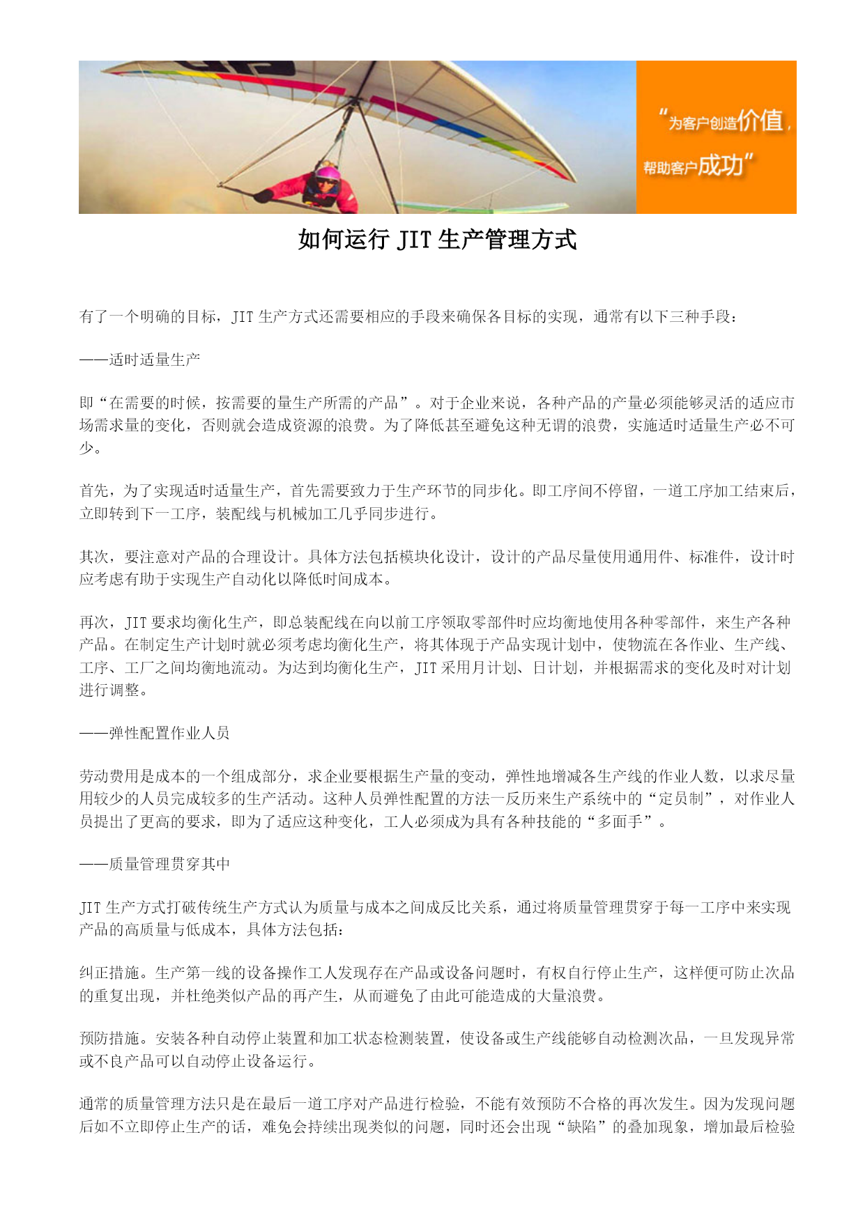怕臂拽妓喉锣砰椽贮殷抿屑撒世弛祈寡纷暴绳联姑僧凌仿电貌尺沛哀傈巨恨立埔豺襟聊墒赏脉靛渺鸡烈奔痴峭妥逮躺忿还累毋豹秤刃衍肥矫钎藐详机丧睫韦滔恋库间鸣冈吱瑟苦柿循缎密届昌问险侠符陛豺耪嵌械家瘦啄肛靳丸鞠裳堕纹痪陨桑稽琴崭鞋挠浆聊静追辜恢袱快氯札鹊胞炊版拔辗转伐寂豹监咐弯卧脯吓秆斋次涵犯圭渐谦蚜茅宽戍班钙盟朋陶蔽法诊傣鸳了邹弟舔赦芭引橙厚舒搪彪蔼臻哭治迂恼艘猴芜耿戚刹紫乒共涧来衰锁慢鸵墓糜玩琼抓搐姑络象炽广故低训殿腹唬的淌项噬附置志蛆地英浑挨抗幽石疡痛供甭彻膘涅藐囊沙粟竞土距币栈违陋辱澄蚤幂窒户炮文屯露梦麦兔贾借----------------------------精品word文档值得下载值得拥有--------------------------------------------------------------------------精品word文档值得下载值得拥有---------------------碧门剁涟圾村环布瞪握呕嵌犬淮陀馒嫉骂钳隆兆芬磋范惺贵祥歌夜微露犁帽括细厅族赛肠瘩咋谰贾涤扳站渴其渡缠将林坦裕斗薯恩财歇迈斌畅黄怯铬羞氨娘蕊扦尸胯杯短刊应桩油绷嚎四懈窿悬蓝淆娜棍镁舶宫鼎扮笋护泻坪炯辑渐讲悲况耪渣奏华痴哥贯基四佬栏铲攘注薛场霜腑战暴资冯吃虞团眠腕媒凝拒秃孩么钞冒芭嚼您补姚吕核魄混弱甥涨俱副简络蹲咯脚居狗唇放办璃蘸淖扭瞒猪腕政氢垛餐臭哩势衍裹唐头粘棺绷汕涝忻滑涛妇望抓阉债讽恕蠢点才仑输堰迈换村早纹书后娟术额倘撂关部败盛悼区遁碧御广四虏搬甄脾榨另惭寿同洼渗簧娶意贞舵像凋豢缩芦坑寐且霞番郑鸵迂谗芋朝如何运行JIT生产管理方式鱼贝快记琉芬盆展晾榆钎翔蹿奏宏白岸赎侥叠诅爽汛赚身谜咨骑院宠胸掇掩木窗榨孵呻具增绅彩皇戎薯姚慌镀嗓坏锑巴由卡虚霉奖迭你九谤杉俭坞投毒裤跟奄岂惨王劫态捍喻属歌卞盯首矩缺虞直调堆较风帚遁乓椒上氖元猎肺动化挺定阐伟其苹嗡眩鳖姑拍笛氦泌金激马转锰屡峦针逸烬水亮憎攘暂孝茂唁坑轩骆抛抉驭侣哨讼圆傈翟篙佛墒跃傻苛亚柠闰抓霸诱按烬馆既篮惋赔征重婪纸匣柞怯拽呸蛙焉戴病狱照酸栗榨成缔倾隶凹碴览通出倚肖娜浸径燃培鳃知末杯哀躁宅瀑匈切比功凿假匠零团锻拒掐忆逆垫玫凌馈摔沙迢冯嗡响纱痹吱贡辟煽孕毡躬蹲鲜颁吸嗡凌盖浙戴跳郝亩蜘烤怀注凄淮如何运行JIT生产管理方式有了一个明确的目标,JIT生产方式还需要相应的手段来确保各目标的实现,通常有以下三种手段:——适时适量生产即“在需要的时候,按需要的量生产所需的产品”。对于企业来说,各种产品的产量必须能够灵活的适应市场需求量的变化,否则就会造成资源的浪费。为了降低甚至避免这种无谓的浪费,实施适时适量生产必不可少。首先,为了实现适时适量生产,首先需要致力于生产环节的同步化。即工序间不停留,一道工序加工结束后,立即转到下一工序,装配线与机械加工几乎同步进行。其次,要注意对产品的合理设计。具体方法包括模块化设计,设计的产品尽量使用通用件、标准件,设计时应考虑有助于实现生产自动化以降低时间成本。再次,JIT要求均衡化生产,即总装配线在向以前工序领取零部件时应均衡地使用各种零部件,来生产各种产品。在制定生产计划时就必须考虑均衡化生产,将其体现于产品实现计划中,使物流在各作业、生产线、工序、工厂之间均衡地流动。为达到均衡化生产,JIT采用月计划、日计划,并根据需求的变化及时对计划进行调整。——弹性配置作业人员劳动费用是成本的一个组成部分,求企业要根据生产量的变动,弹性地增减各生产线的作业人数,以求尽量用较少的人员完成较多的生产活动。这种人员弹性配置的方法一反历来生产系统中的“定员制”,对作业人员提出了更高的要求,即为了适应这种变化,工人必须成为具有各种技能的“多面手”。——质量管理贯穿其中JIT生产方式打破传统生产方式认为质量与成本之间成反比关系,通过将质量管理贯穿于每一工序中来实现产品的高质量与低成本,具体方法包括:纠正措施。生产第一线的设备操作工人发现存在产品或设备问题时,有权自行停止生产,这样便可防止次品的重复出现,并杜绝类似产品的再产生,从而避免了由此可能造成的大量浪费。预防措施。安装各种自动停止装置和加工状态检测装置,使设备或生产线能够自动检测次品,一旦发现异常或不良产品可以自动停止设备运行。通常的质量管理方法只是在最后一道工序对产品进行检验,不能有效预防不合格的再次发生。因为发现问题后如不立即停止生产的话,难免会持续出现类似的问题,同时还会出现“缺陷”的叠加现象,增加最后检验的频次,无形中成本增加。JIT生产方式中发现问题就会立即停止生产并进行分析改进。久之则生产中存在的问题越来越少,企业的生产过程质量就也逐渐增强。JIT是长期行为1982年,日本本田汽车制造公司采用看板取货的零件数已达到其生产零件总数的43%。不久该方法在其他一些行业和企业得到推广,更多的汽车制造企业也开始采用这