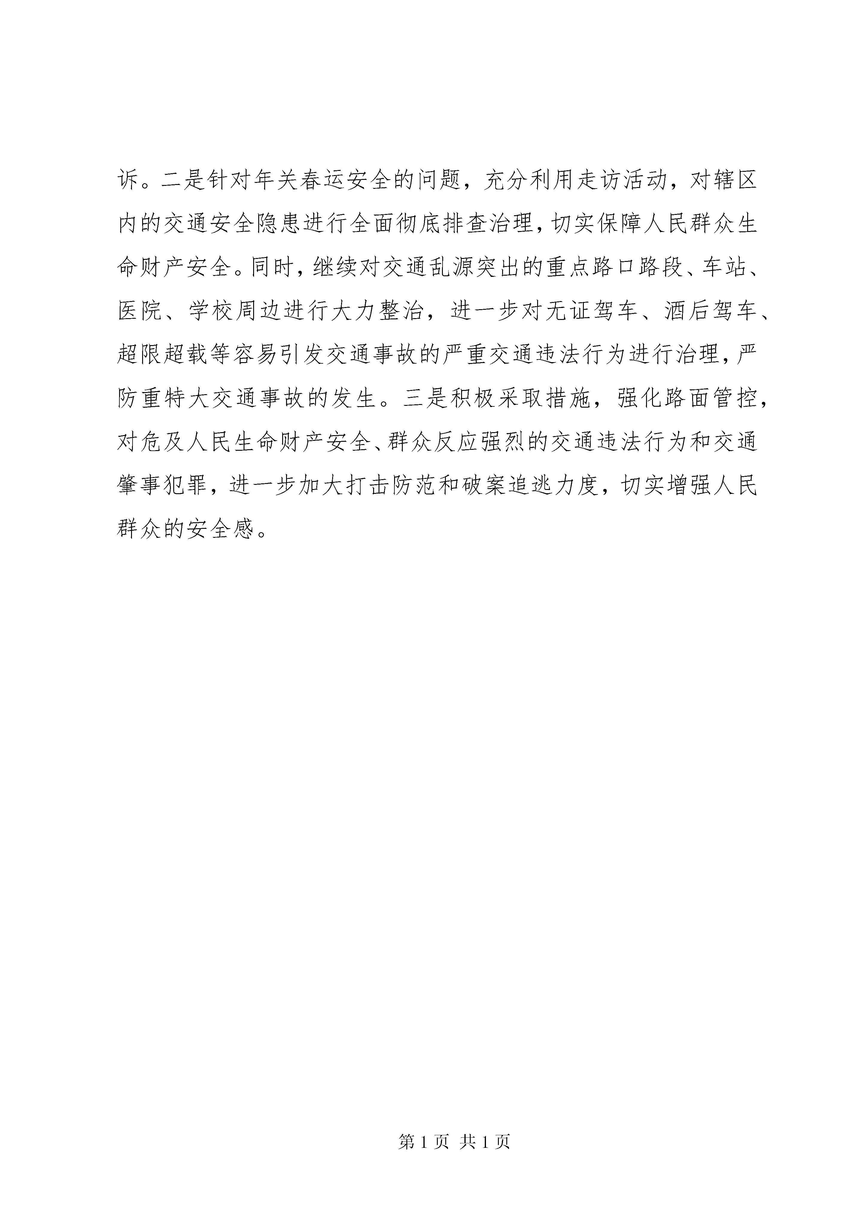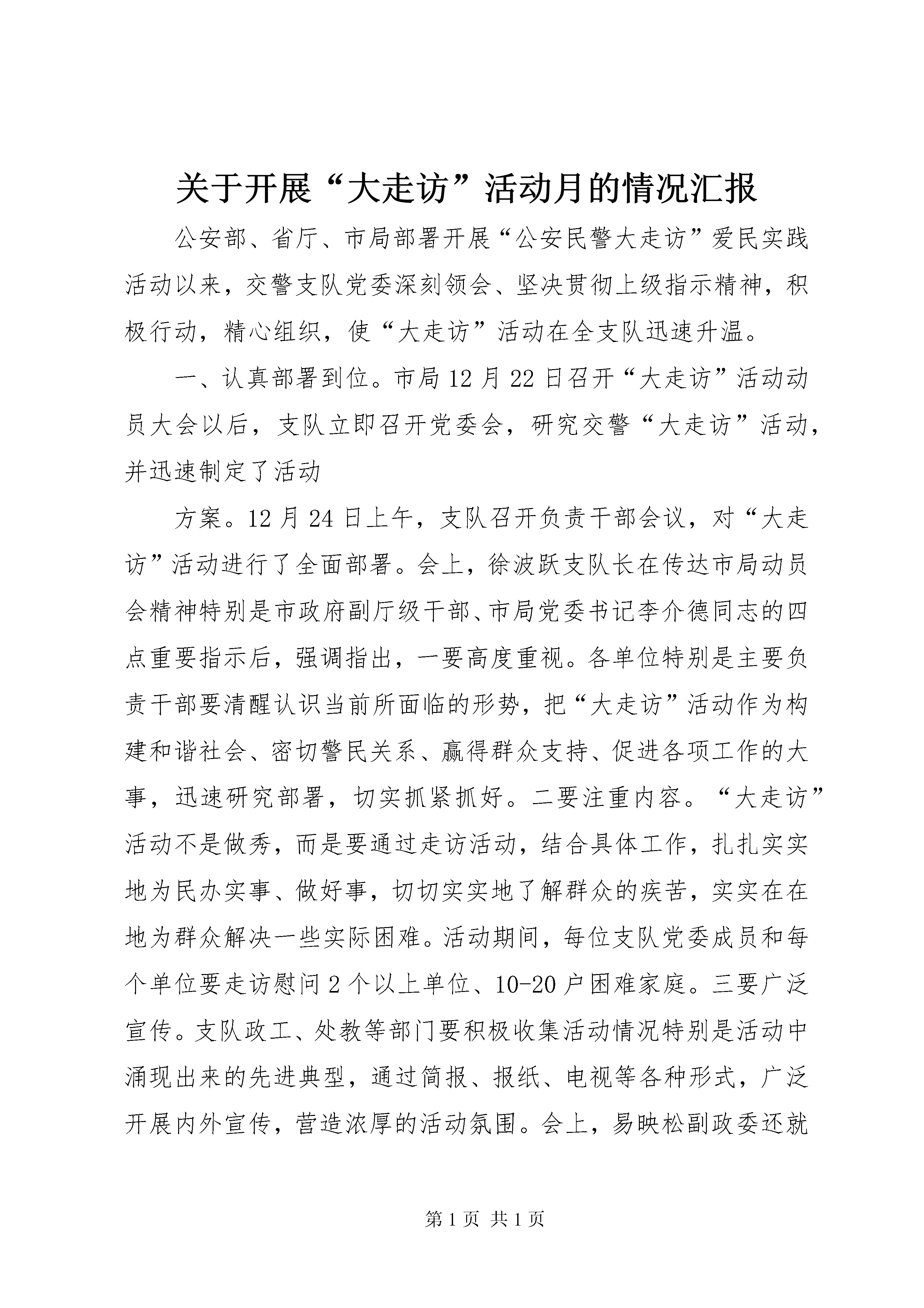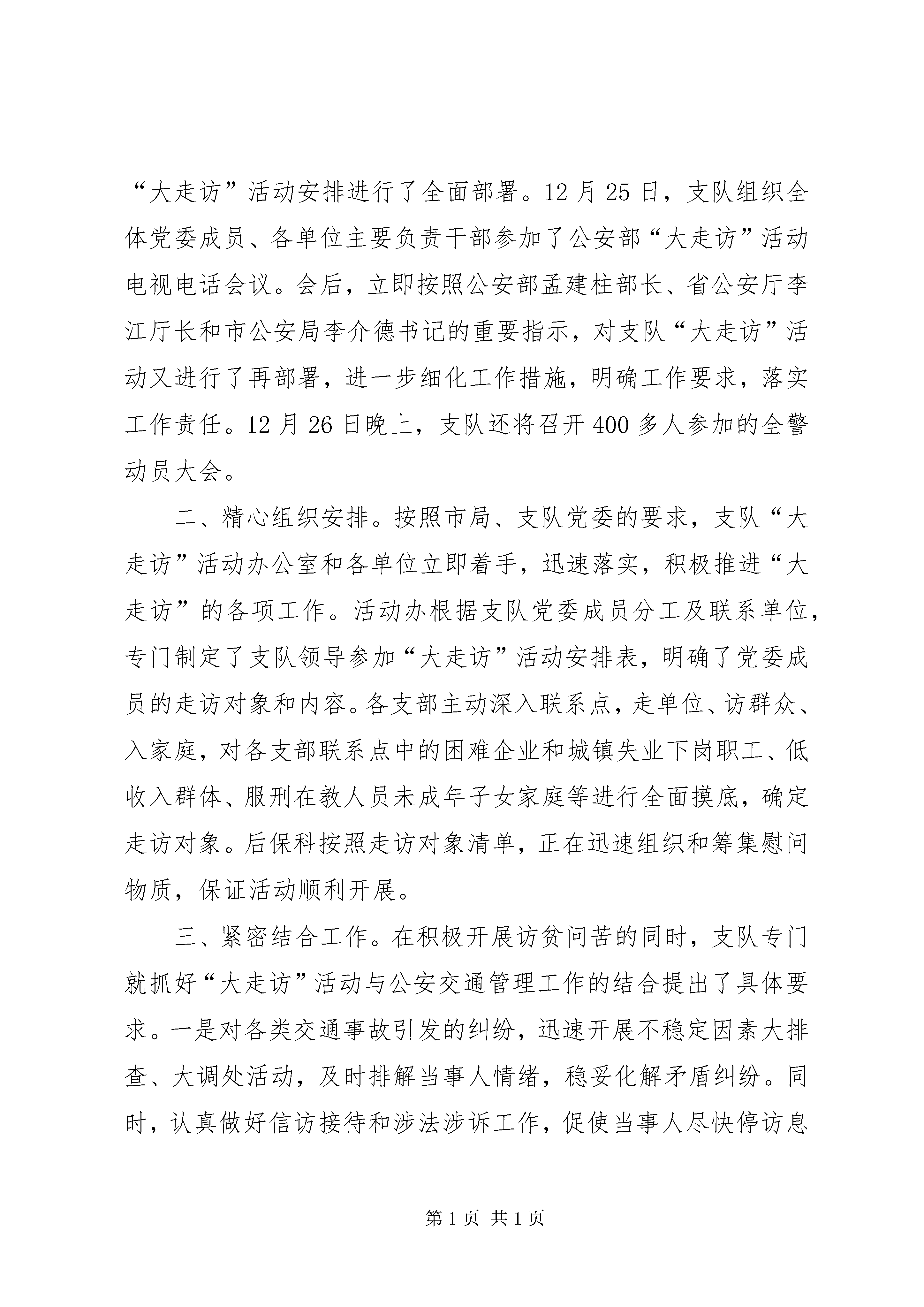 关于开展“大走访”活动月的情况汇报公安部、省厅、市局部署开展“公安民警大走访”爱民实践活动以来,交警支队党委深刻领会、坚决贯彻上级指示精神,积极行动,精心组织,使“大走访”活动在全支队迅速升温。一、认真部署到位。市局12月22日召开“大走访”活动动员大会以后,支队立即召开党委会,研究交警“大走访”活动,并迅速制定了活动方案。12月24日上午,支队召开负责干部会议,对“大走访”活动进行了全面部署。会上,徐波跃支队长在传达市局动员会精神特别是市政府副厅级干部、市局党委书记李介德同志的四点重要指示后,强调指出,一要高度重视。各单位特别是主要负责干部要清醒认识当前所面临的形势,把“大走访”活动作为构建和谐社会、密切警民关系、赢得群众支持、促进各项工作的大事,迅速研究部署,切实抓紧抓好。二要注重内容。“大走访”活动不是做秀,而是要通过走访活动,结合具体工作,扎扎实实地为民办实事、做好事,切切实实地了解群众的疾苦,实实在在地为群众解决一些实际困难。活动期间,每位支队党委成员和每个单位要走访慰问2个以上单位、10-20户困难家庭。三要广泛宣传。支队政工、处教等部门要积极收集活动情况特别是活动中涌现出来的先进典型,通过简报、报纸、电视等各种形式,广泛开展内外宣传,营造浓厚的活动氛围。会上,易映松副政委还就“大走访”活动安排进行了全面部署。12月25日,支队组织全体党委成员、各单位主要负责干部参加了公安部“大走访”活动电视电话会议。会后,立即按照公安部孟建柱部长、省公安厅李江厅长和市公安局李介德书记的重要指示,对支队“大走访”活动又进行了再部署,进一步细化工作措施,明确工作要求,落实工作责任。12月26日晚上,支队还将召开400多人参加的全警动员大会。二、精心组织安排。按照市局、支队党委的要求,支队“大走访”活动办公室和各单位立即着手,迅速落实,积极推进“大走访”的各项工作。活动办根据支队党委成员分工及联系单位,专门制定了支队领导参加“大走访”活动安排表,明确了党委成员的走访对象和内容。各支部主动深入联系点,走单位、访群众、入家庭,对各支部联系点中的困难企业和城镇失业下岗职工、低收入群体、服刑在教人员未成年子女家庭等进行全面摸底,确定走访对象。后保科按照走访对象清单,正在迅速组织和筹集慰问物质,保证活动顺利开展。三、紧密结合工作。在积极开展访贫问苦的同时,支队专门就抓好“大走访”活动与公安交通管理工作的结合提出了具体要求。一是对各类交通事故引发的纠纷,迅速开展不稳定因素大排查、大调处活动,及时排解当事人情绪,稳妥化解矛盾纠纷。同时,认真做好信访接待和涉法涉诉工作,促使当事人尽快停访息诉。二是针对年关春运安全的问题,充分利用走访活动,对辖区内的交通安全隐患进行全面彻底排查治理,切实保障人民群众生命财产安全。同时,继续对交通乱源突出的重点路口路段、车站、医院、学校周边进行大力整治,进一步对无证驾车、酒后驾车、超限超载等容易引发交通事故的严重交通违法行为进行治理,严防重特大交通事故的发生。三是积极采取措施,强化路面管控,对危及人民生命财产安全、群众反应强烈的交通违法行为和交通肇事犯罪,进一步加大打击防范和破案追逃力度,切实增强人民群众的安全感。
