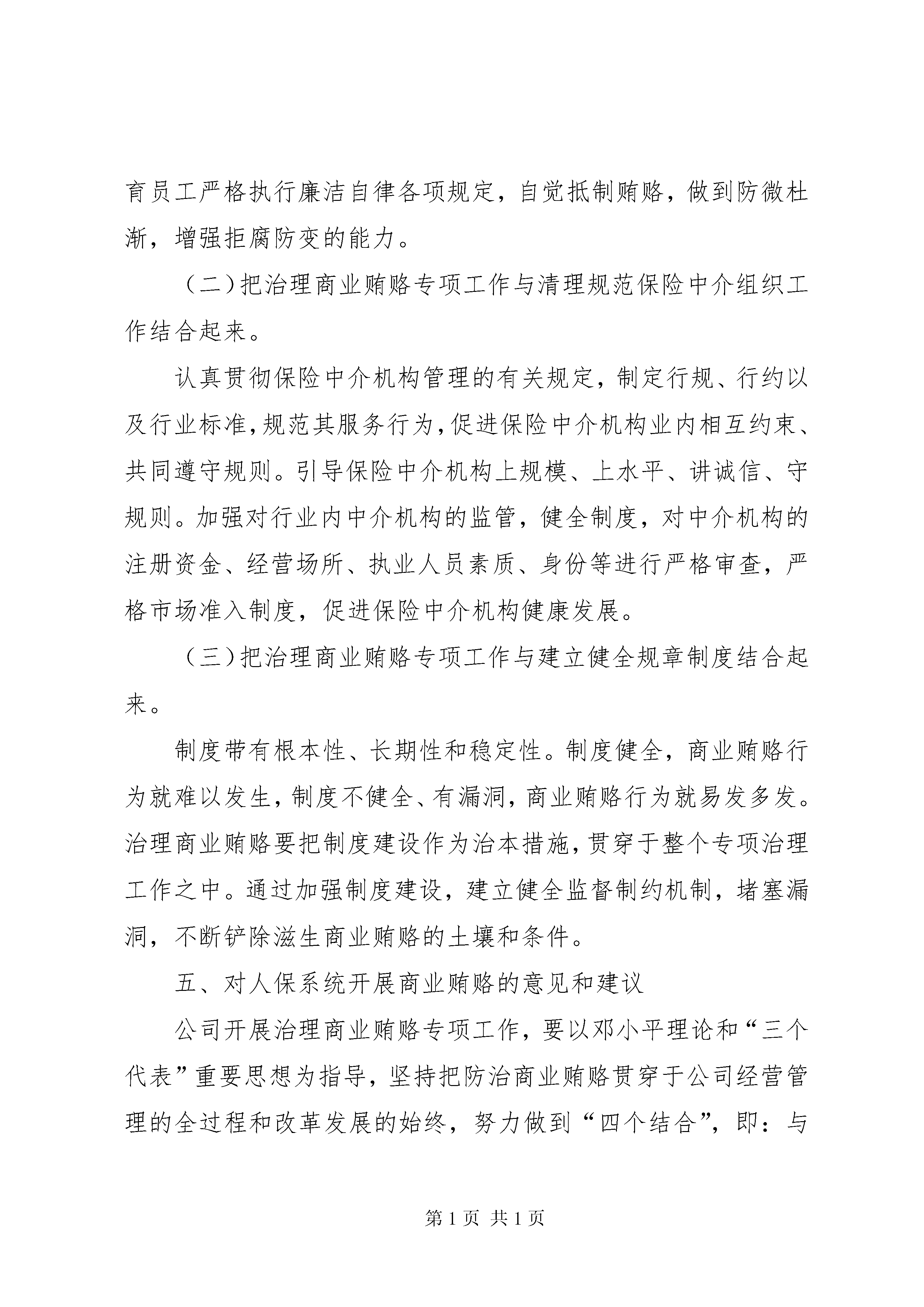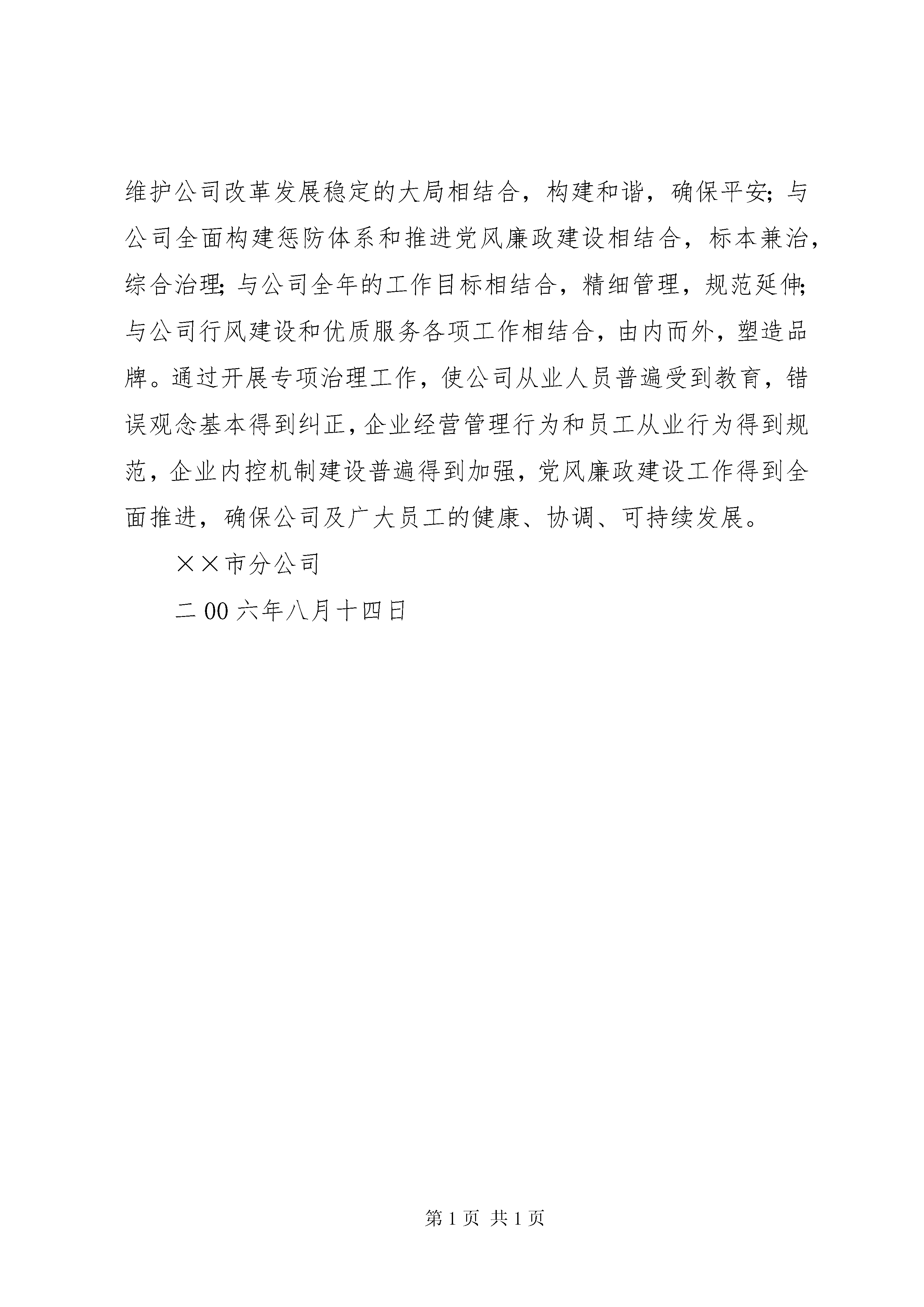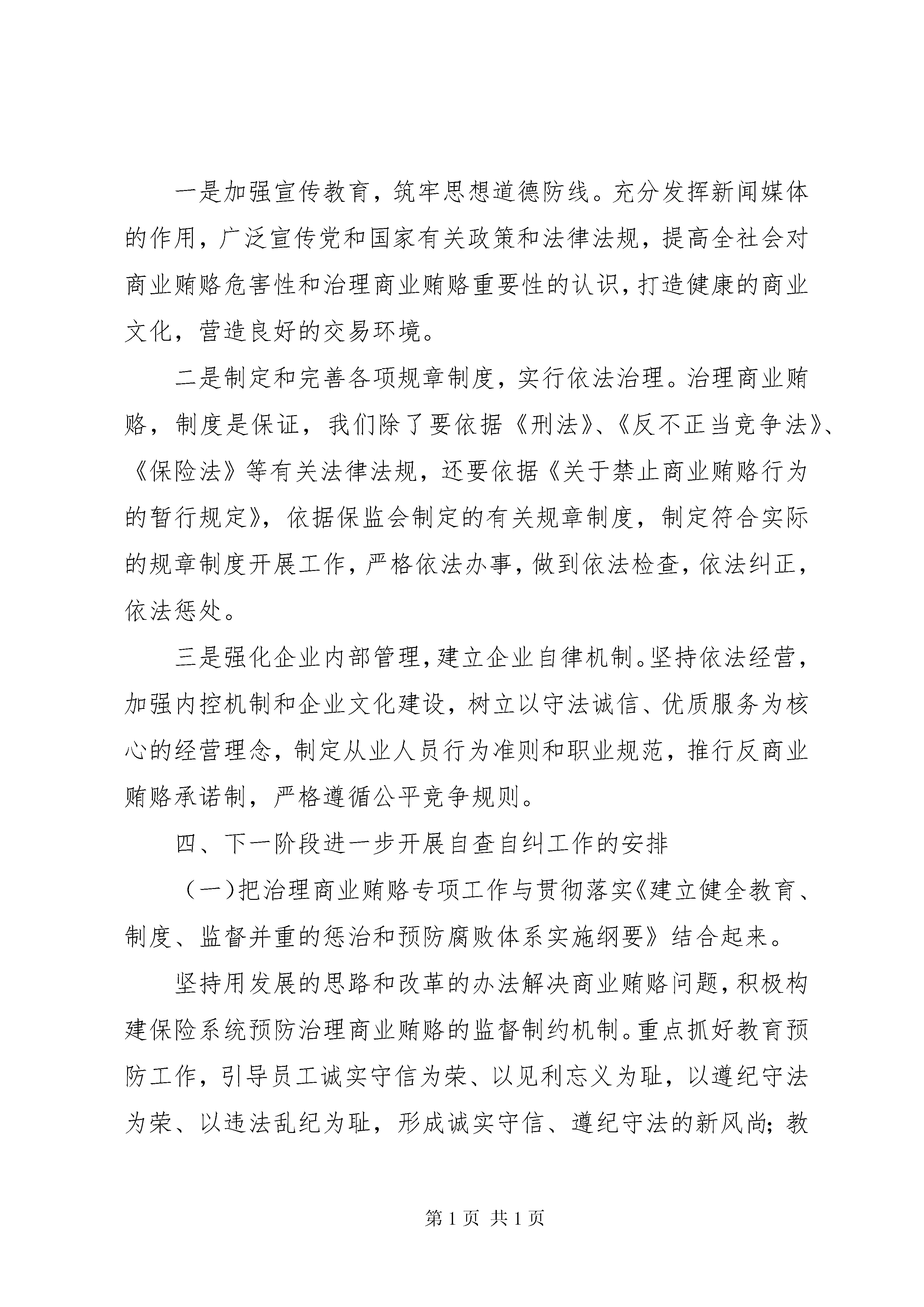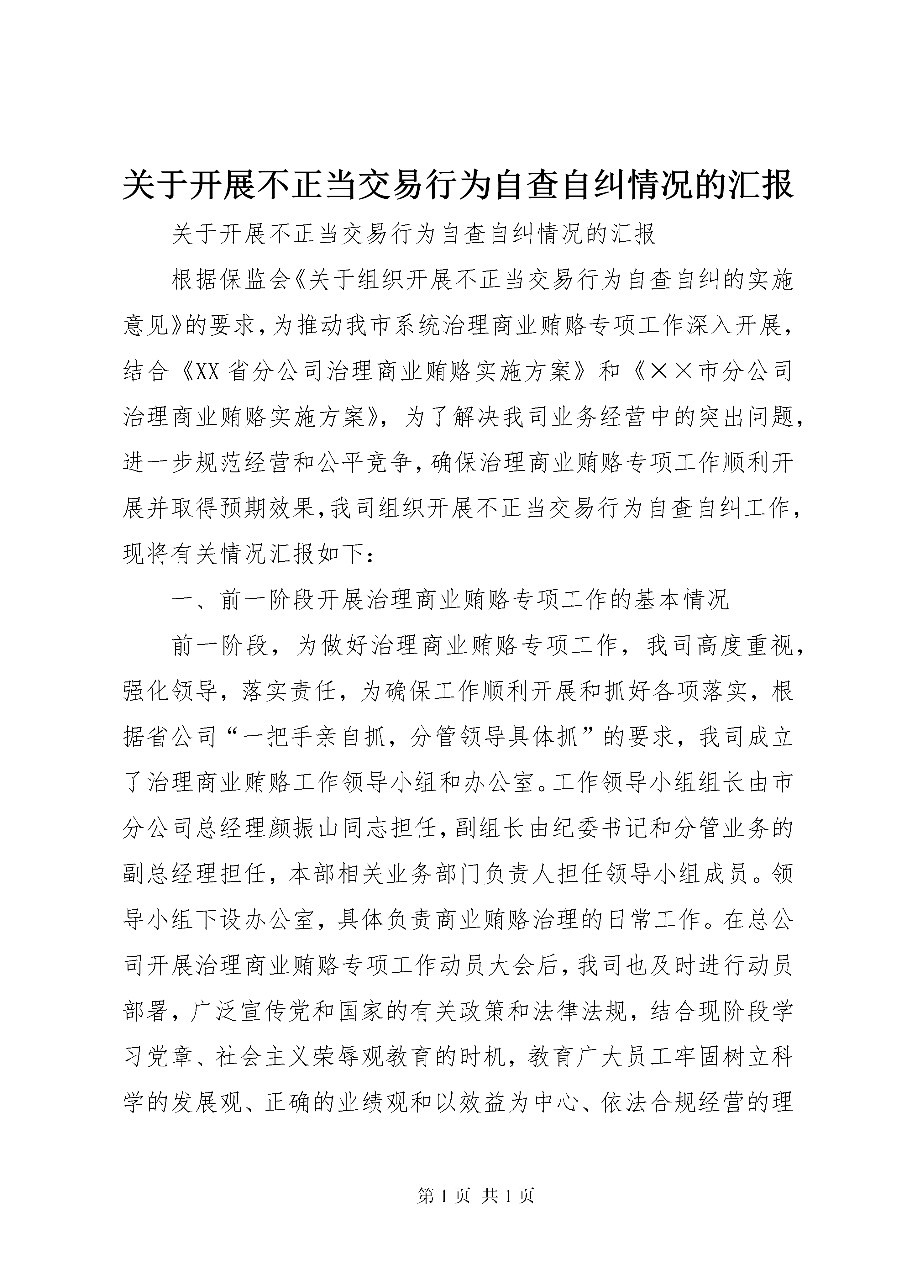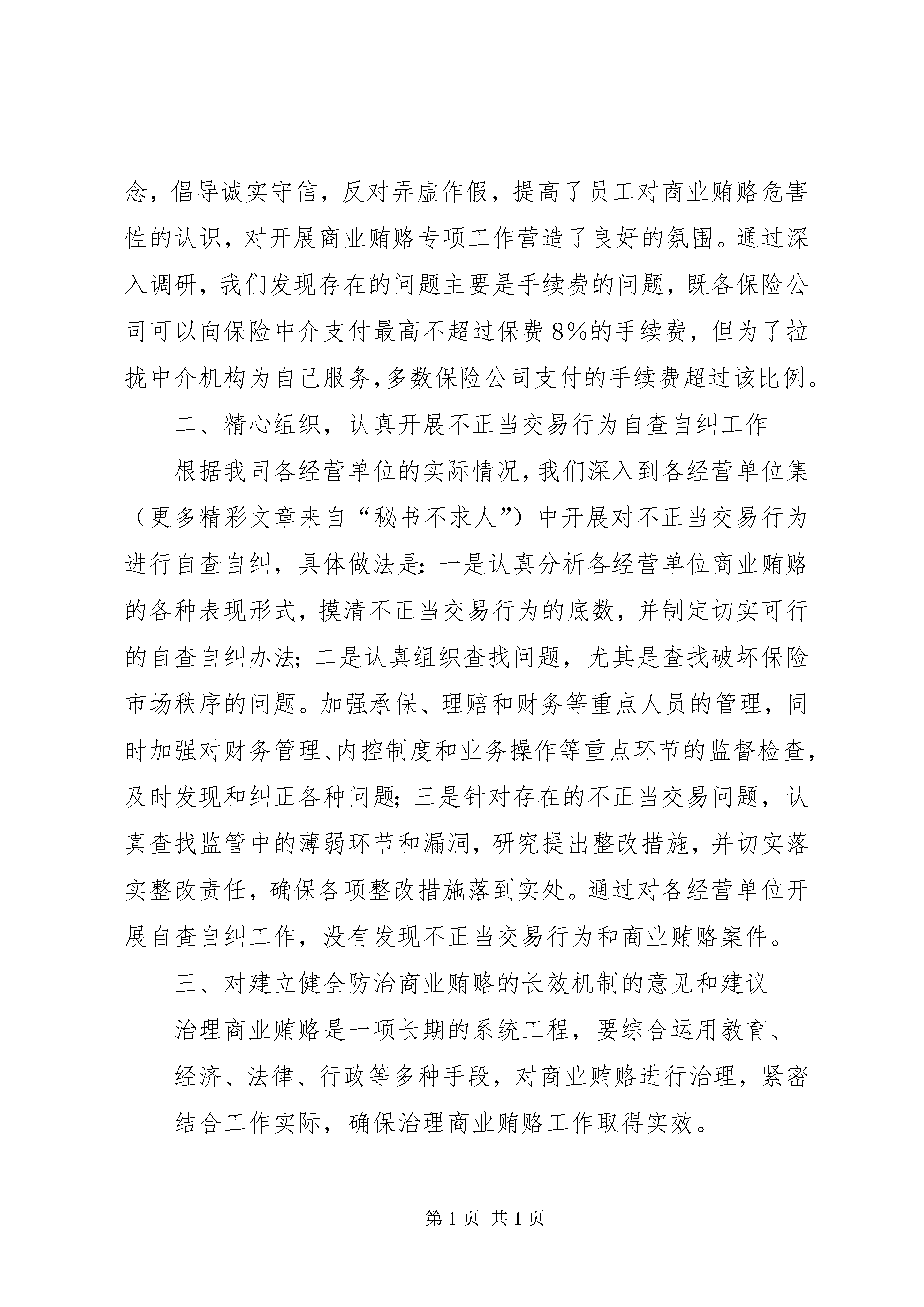 关于开展不正当交易行为自查自纠情况的汇报关于开展不正当交易行为自查自纠情况的汇报根据保监会《关于组织开展不正当交易行为自查自纠的实施意见》的要求,为推动我市系统治理商业贿赂专项工作深入开展,结合《XX省分公司治理商业贿赂实施方案》和《××市分公司治理商业贿赂实施方案》,为了解决我司业务经营中的突出问题,进一步规范经营和公平竞争,确保治理商业贿赂专项工作顺利开展并取得预期效果,我司组织开展不正当交易行为自查自纠工作,现将有关情况汇报如下:一、前一阶段开展治理商业贿赂专项工作的基本情况前一阶段,为做好治理商业贿赂专项工作,我司高度重视,强化领导,落实责任,为确保工作顺利开展和抓好各项落实,根据省公司“一把手亲自抓,分管领导具体抓”的要求,我司成立了治理商业贿赂工作领导小组和办公室。工作领导小组组长由市分公司总经理颜振山同志担任,副组长由纪委书记和分管业务的副总经理担任,本部相关业务部门负责人担任领导小组成员。领导小组下设办公室,具体负责商业贿赂治理的日常工作。在总公司开展治理商业贿赂专项工作动员大会后,我司也及时进行动员部署,广泛宣传党和国家的有关政策和法律法规,结合现阶段学习党章、社会主义荣辱观教育的时机,教育广大员工牢固树立科学的发展观、正确的业绩观和以效益为中心、依法合规经营的理念,倡导诚实守信,反对弄虚作假,提高了员工对商业贿赂危害性的认识,对开展商业贿赂专项工作营造了良好的氛围。通过深入调研,我们发现存在的问题主要是手续费的问题,既各保险公司可以向保险中介支付最高不超过保费8%的手续费,但为了拉拢中介机构为自己服务,多数保险公司支付的手续费超过该比例。二、精心组织,认真开展不正当交易行为自查自纠工作根据我司各经营单位的实际情况,我们深入到各经营单位集(更多精彩文章来自“秘书不求人”)中开展对不正当交易行为进行自查自纠,具体做法是:一是认真分析各经营单位商业贿赂的各种表现形式,摸清不正当交易行为的底数,并制定切实可行的自查自纠办法;二是认真组织查找问题,尤其是查找破坏保险市场秩序的问题。加强承保、理赔和财务等重点人员的管理,同时加强对财务管理、内控制度和业务操作等重点环节的监督检查,及时发现和纠正各种问题;三是针对存在的不正当交易问题,认真查找监管中的薄弱环节和漏洞,研究提出整改措施,并切实落实整改责任,确保各项整改措施落到实处。通过对各经营单位开展自查自纠工作,没有发现不正当交易行为和商业贿赂案件。三、对建立健全防治商业贿赂的长效机制的意见和建议治理商业贿赂是一项长期的系统工程,要综合运用教育、经济、法律、行政等多种手段,对商业贿赂进行治理,紧密结合工作实际,确保治理商业贿赂工作取得实效。一是加强宣传教育,筑牢思想道德防线。充分发挥新闻媒体的作用,广泛宣传党和国家有关政策和法律法规,提高全社会对商业贿赂危害性和治理商业贿赂重要性的认识,打造健康的商业文化,营造良好的交易环境。二是制定和完善各项规章制度,实行依法治理。治理商业贿赂,制度是保证,我们除了要依据《刑法》、《反不正当竞争法》、《保险法》等有关法律法规,还要依据《关于禁止商业贿赂行为的暂行规定》,依据保监会制定的有关规章制度,制定符合实际的规章制度开展工作,严格依法办事,做到依法检查,依法纠正,依法惩处。三是强化企业内部管理,建立企业自律机制。坚持依法经营,加强内控机制和企业文化建设,树立以守法诚信、优质服务为核心的经营理念,制定从业人员行为准则和职业规范,推行反商业贿赂承诺制,严格遵循公平竞争规则。四、下一阶段进一步开展自查自纠工作的安排(一)把治理商业贿赂专项工作与贯彻落实《建立健全教育、制度、监督并重的惩治和预防腐败体系实施纲要》结合起来。坚持用发展的思路和改革的办法解决商业贿赂问题,积极构建保险系统预防治理商业贿赂的监督制约机制。重点抓好教育预防工作,引导员工诚实守信为荣、以见利忘义为耻,以遵纪守法为荣、以违法乱纪为耻,形成诚实守信、遵纪守法的新风尚;教育员工严格执行廉洁自律各项规定,自觉抵制贿赂,做到防微杜渐,增强拒腐防变的能力。(二)把治理商业贿赂专项工作与清理规范保险中介组织工作结合起来。认真贯彻保险中介机构管理的有关规定,制定行规、行约以及行业标准,规范其服务行为,促进保险中介机构业内相互约束、共同遵守规则。引导保险中介机构上规模、上水平、讲诚信、守规则。加强对行业内中介机构的监管,健全制度,对中介机构的注册资金、经营场所、执业人员素质、身份等进行严格审查,严格市场准入制度,促进保险中介机构健康发展。(三)把治理商业贿赂专项工作与建立健全规章制度结合起来。制度带有根本性、长期性和稳定性。制度健全,商业贿赂行为就难以发生,制度不健全、有漏洞,商业贿赂行为就易发多发。治理商业贿赂要把制度建设作为治本措施,贯穿于整个专项治理工作