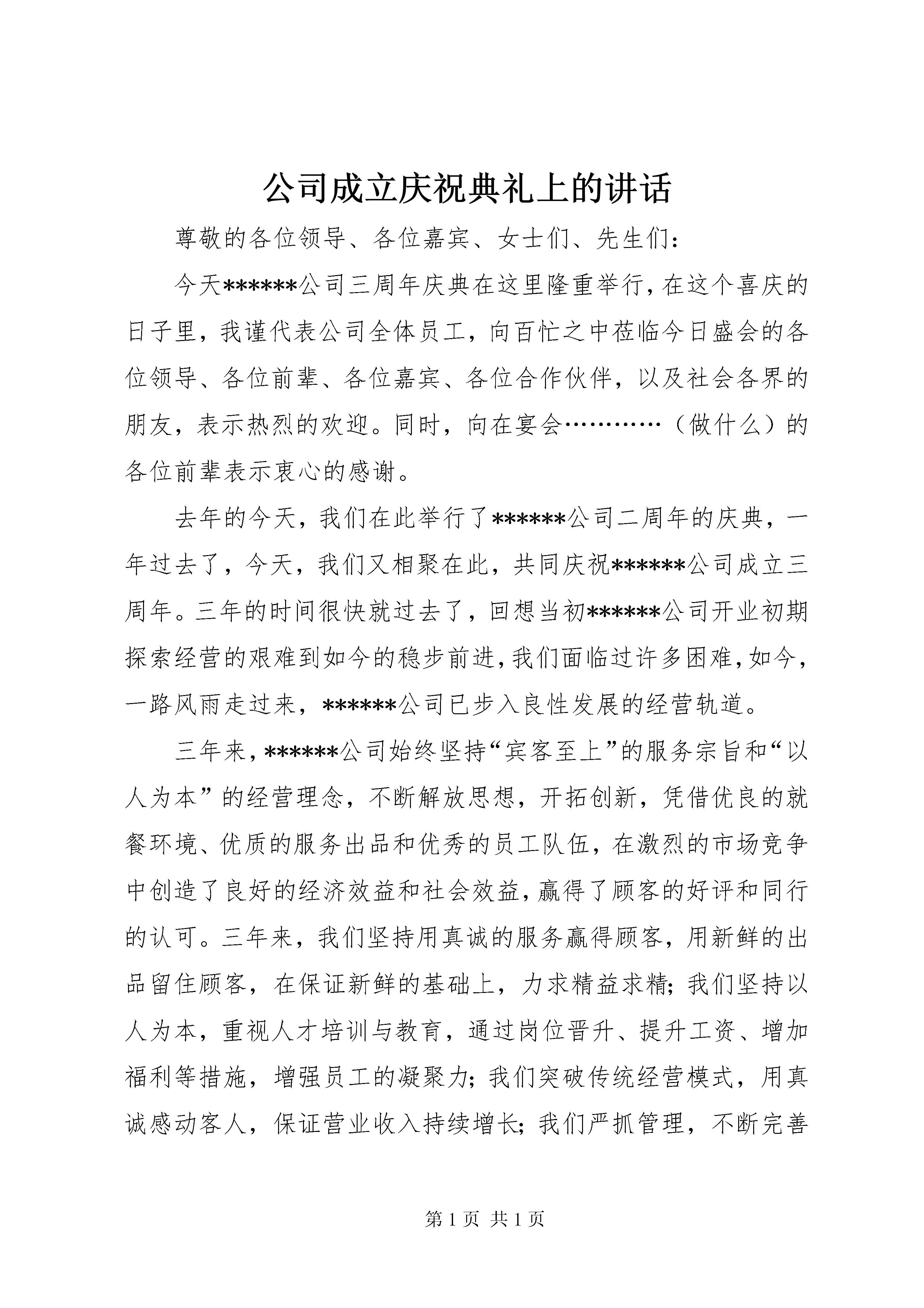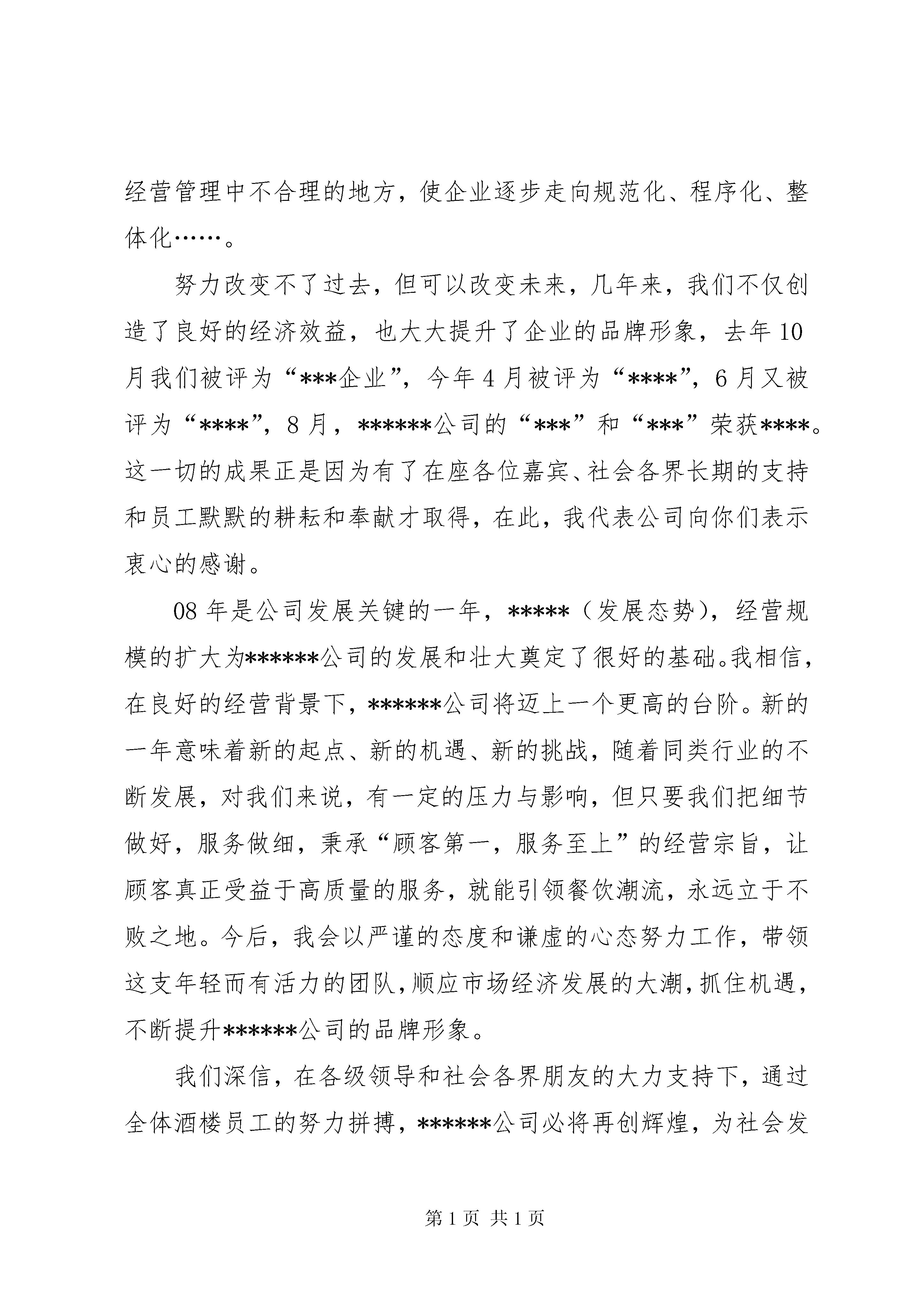 公司成立庆祝典礼上的讲话尊敬的各位领导、各位嘉宾、女士们、先生们:今天******公司三周年庆典在这里隆重举行,在这个喜庆的日子里,我谨代表公司全体员工,向百忙之中莅临今日盛会的各位领导、各位前辈、各位嘉宾、各位合作伙伴,以及社会各界的朋友,表示热烈的欢迎。同时,向在宴会…………(做什么)的各位前辈表示衷心的感谢。去年的今天,我们在此举行了******公司二周年的庆典,一年过去了,今天,我们又相聚在此,共同庆祝******公司成立三周年。三年的时间很快就过去了,回想当初******公司开业初期探索经营的艰难到如今的稳步前进,我们面临过许多困难,如今,一路风雨走过来,******公司已步入良性发展的经营轨道。三年来,******公司始终坚持“宾客至上”的服务宗旨和“以人为本”的经营理念,不断解放思想,开拓创新,凭借优良的就餐环境、优质的服务出品和优秀的员工队伍,在激烈的市场竞争中创造了良好的经济效益和社会效益,赢得了顾客的好评和同行的认可。三年来,我们坚持用真诚的服务赢得顾客,用新鲜的出品留住顾客,在保证新鲜的基础上,力求精益求精;我们坚持以人为本,重视人才培训与教育,通过岗位晋升、提升工资、增加福利等措施,增强员工的凝聚力;我们突破传统经营模式,用真诚感动客人,保证营业收入持续增长;我们严抓管理,不断完善经营管理中不合理的地方,使企业逐步走向规范化、程序化、整体化……。努力改变不了过去,但可以改变未来,几年来,我们不仅创造了良好的经济效益,也大大提升了企业的品牌形象,去年10月我们被评为“***企业”,今年4月被评为“****”,6月又被评为“****”,8月,******公司的“***”和“***”荣获****。这一切的成果正是因为有了在座各位嘉宾、社会各界长期的支持和员工默默的耕耘和奉献才取得,在此,我代表公司向你们表示衷心的感谢。08年是公司发展关键的一年,*****(发展态势),经营规模的扩大为******公司的发展和壮大奠定了很好的基础。我相信,在良好的经营背景下,******公司将迈上一个更高的台阶。新的一年意味着新的起点、新的机遇、新的挑战,随着同类行业的不断发展,对我们来说,有一定的压力与影响,但只要我们把细节做好,服务做细,秉承“顾客第一,服务至上”的经营宗旨,让顾客真正受益于高质量的服务,就能引领餐饮潮流,永远立于不败之地。今后,我会以严谨的态度和谦虚的心态努力工作,带领这支年轻而有活力的团队,顺应市场经济发展的大潮,抓住机遇,不断提升******公司的品牌形象。我们深信,在各级领导和社会各界朋友的大力支持下,通过全体酒楼员工的努力拼搏,******公司必将再创辉煌,为社会发展做出更大的贡献。最后祝大家身体健康、工作顺利、万事如意。合家幸福。谢谢大家。