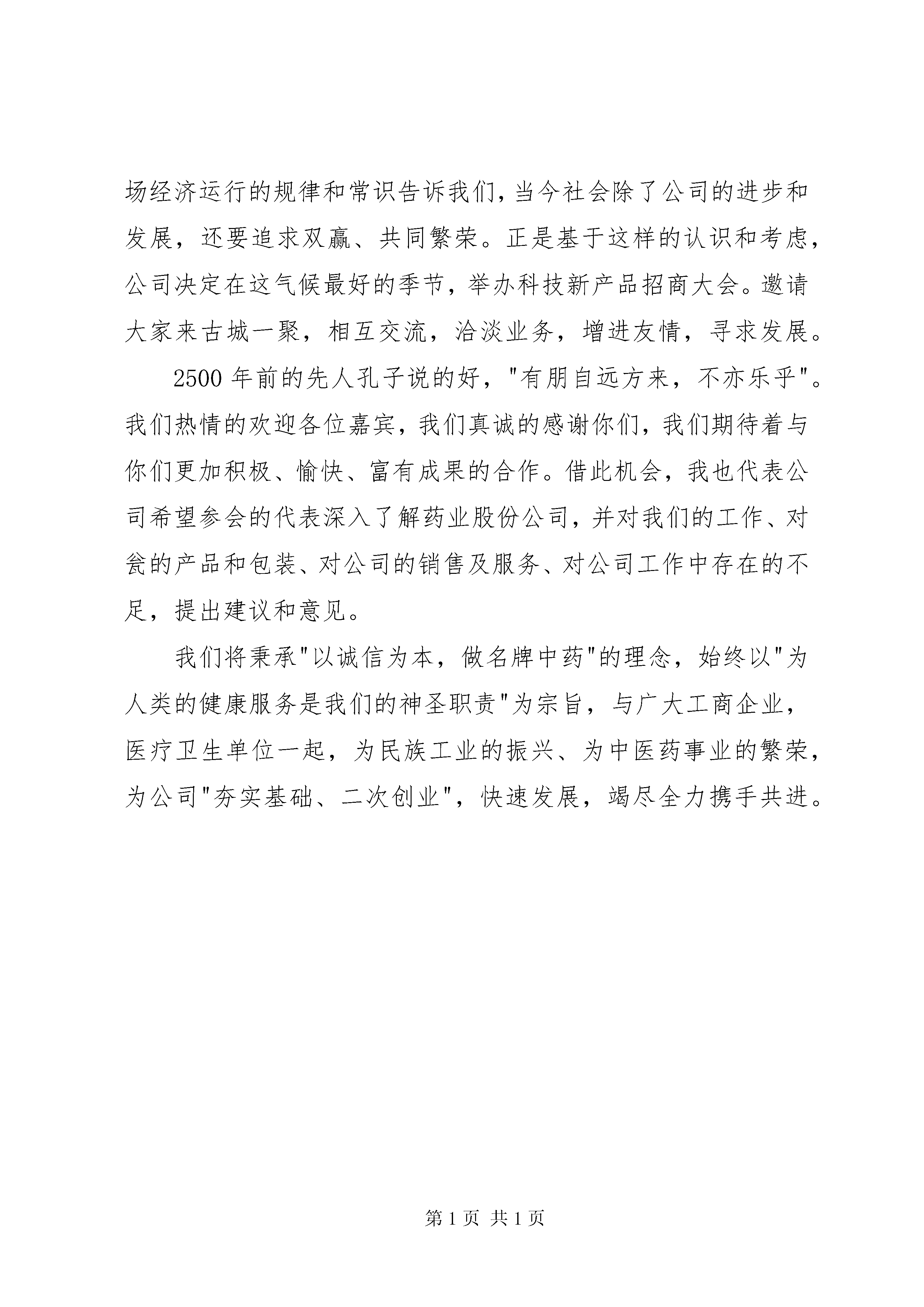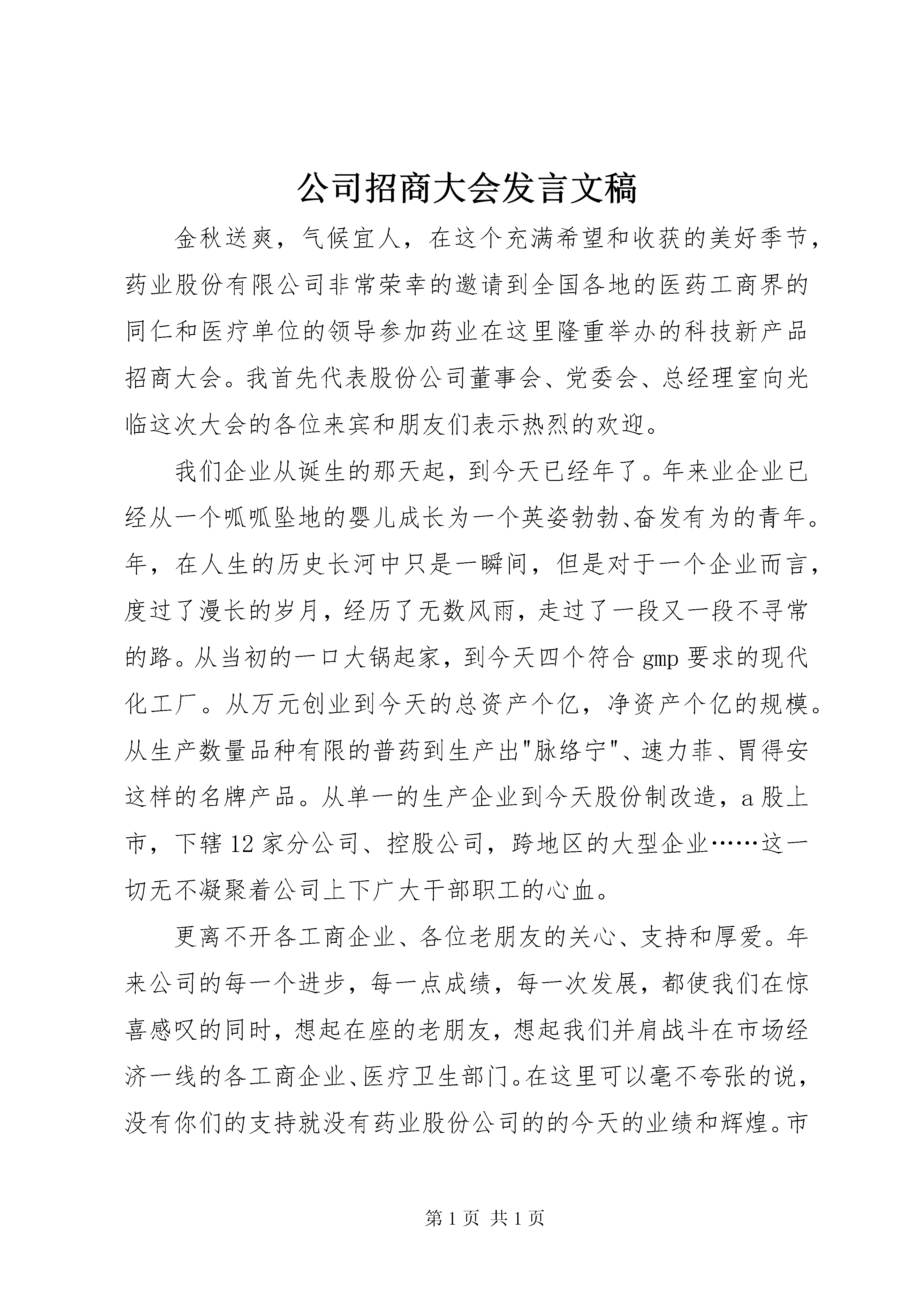 公司招商大会发言文稿金秋送爽,气候宜人,在这个充满希望和收获的美好季节,药业股份有限公司非常荣幸的邀请到全国各地的医药工商界的同仁和医疗单位的领导参加药业在这里隆重举办的科技新产品招商大会。我首先代表股份公司董事会、党委会、总经理室向光临这次大会的各位来宾和朋友们表示热烈的欢迎。我们企业从诞生的那天起,到今天已经年了。年来业企业已经从一个呱呱坠地的婴儿成长为一个英姿勃勃、奋发有为的青年。年,在人生的历史长河中只是一瞬间,但是对于一个企业而言,度过了漫长的岁月,经历了无数风雨,走过了一段又一段不寻常的路。从当初的一口大锅起家,到今天四个符合gmp要求的现代化工厂。从万元创业到今天的总资产个亿,净资产个亿的规模。从生产数量品种有限的普药到生产出"脉络宁"、速力菲、胃得安这样的名牌产品。从单一的生产企业到今天股份制改造,a股上市,下辖12家分公司、控股公司,跨地区的大型企业……这一切无不凝聚着公司上下广大干部职工的心血。更离不开各工商企业、各位老朋友的关心、支持和厚爱。年来公司的每一个进步,每一点成绩,每一次发展,都使我们在惊喜感叹的同时,想起在座的老朋友,想起我们并肩战斗在市场经济一线的各工商企业、医疗卫生部门。在这里可以毫不夸张的说,没有你们的支持就没有药业股份公司的的今天的业绩和辉煌。市场经济运行的规律和常识告诉我们,当今社会除了公司的进步和发展,还要追求双赢、共同繁荣。正是基于这样的认识和考虑,公司决定在这气候最好的季节,举办科技新产品招商大会。邀请大家来古城一聚,相互交流,洽淡业务,增进友情,寻求发展。2500年前的先人孔子说的好,"有朋自远方来,不亦乐乎"。我们热情的欢迎各位嘉宾,我们真诚的感谢你们,我们期待着与你们更加积极、愉快、富有成果的合作。借此机会,我也代表公司希望参会的代表深入了解药业股份公司,并对我们的工作、对瓮的产品和包装、对公司的销售及服务、对公司工作中存在的不足,提出建议和意见。我们将秉承"以诚信为本,做名牌中药"的理念,始终以"为人类的健康服务是我们的神圣职责"为宗旨,与广大工商企业,医疗卫生单位一起,为民族工业的振兴、为中医药事业的繁荣,为公司"夯实基础、二次创业",快速发展,竭尽全力携手共进。