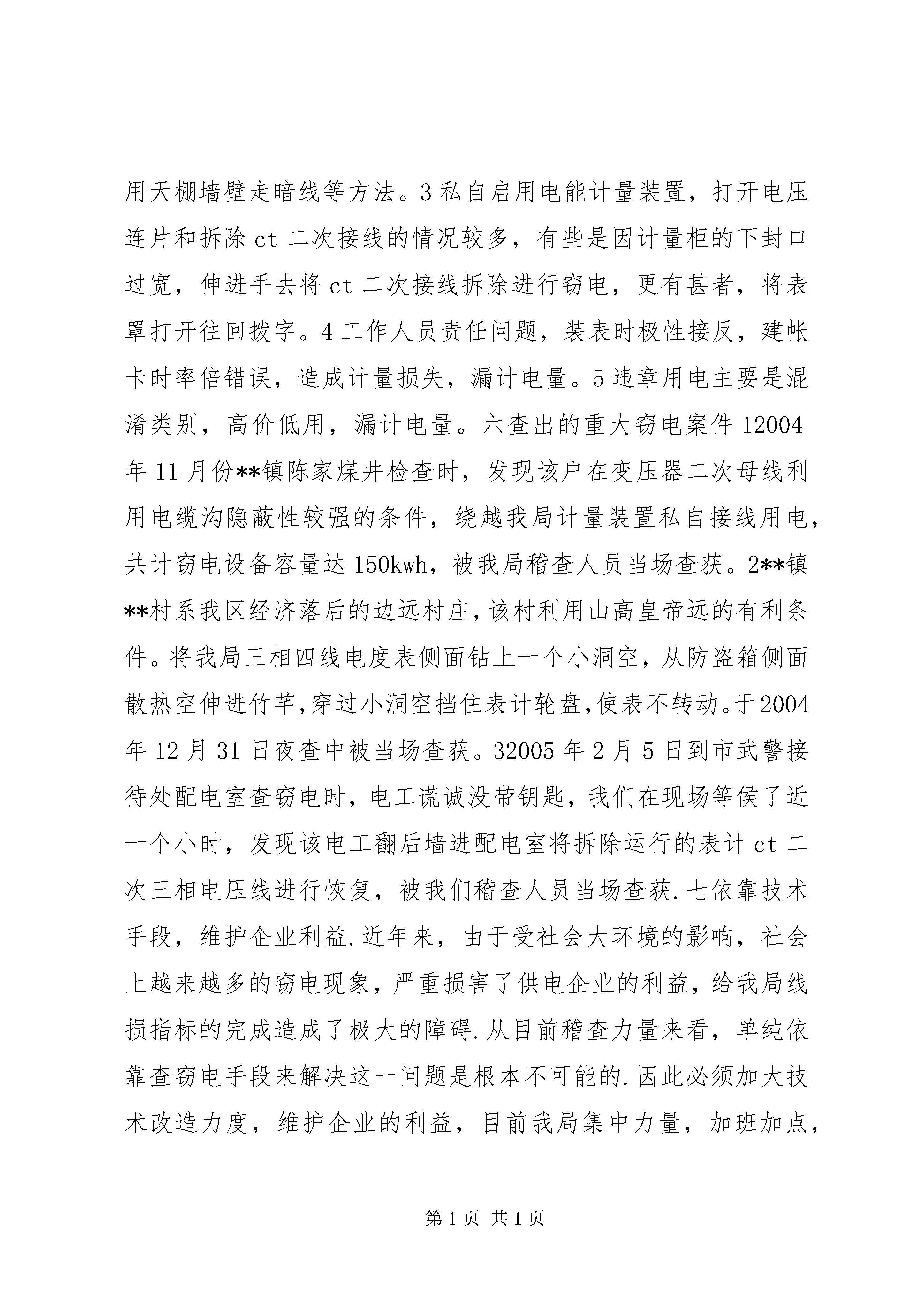 关于开展反窃电工作情况的汇报为了保证降损工程顺利进行,****召开了专门会议进行部署,所有的项目确定了专责人,制定出详细的工程计划,进一步细化了分线、分台区的管理,加大了查禁窃电的力度。因此,今年第一季度局线损比去年同期有了较大的下降,使窃电现象明显得到控制,取得了很好的效果。现将工作情况汇报如下:一首先成立营业普查领导小组和工作小组,对营到了局长亲自抓,分管局长靠上抓,用电办主任带头查,把依法查处违章窃电,和严厉打击窃电行为纳入了月度计划和经济责任制的考核,形成了一个有组织、有计划、有落实、有监督、有纪律的全局统一行动。二为了加大普查力度,达到降损增效的目的,我们成立稽查队,聘请了有经验,有能力,责任心强,思想素质高的退休人员,作为稽查队负责人,制定了严格的稽查制度和详细的营业普查计划。营业普查的目的是为了规范用电市场,防止跑、冒、滴、漏,降损节能和增加企业效益。为此我们成立了团员、青年降损公关小组,配合营业普查工作,实施降损措施。包括线路班也要承包线损指标,真正的把营业普查和降损节能工作分担到了每一为职工身上,规定各班组,办公室结合各自的工作范围,有重点的进行普查,并且进行互查和各个班组协同检查,打破原由的普查方式,只查窃电和违章用电,我们加强了对计量装置的检测,利用秒表加钳型电流表测负荷的办法,对企业7000多用电客户进行了全方位的普查。自去年下半年以来,用电工作人员和降损攻关小组成员牺牲了所有的节假日,由局长亲自带队,以降损增效为目标,以营业普查和堵漏洞为重点,分组分片进行地毯试普查,对XX县区的商业用电进行了多次检查,对承包企业进行重点检查,对有窃电嫌疑得用户进行蹲点检查和夜查,对所有的表计进行秒表测算和利用检测仪测试,形成了一套完整有效的营业普查办法和措施。三我局明确了局长是营业普查的总指挥,管局长具体组织,用电办主任列出各普查小组第二天的普查工作计划,各组将普查情况当天汇报到用电办公室,对查出的问题及时给出处理意见,填写工作单,经营业普查领导小组研究后执行。对查处问题,明确态度,对内部职工,任何人不得讲情说理,否则视为和谋窃电,严格的控制住人情电,关系电。四我们积极的于当地公安部门配合处理,取得了丰硕的成果,查处了两处电炉窃电大户,窃电荣量达到600kw,共查处高供高计计量误差3户,追补漏计电量880kwh,同时不定期的对重点客户进行夜查,起到了敲山震虎,事半功倍的作用。自检查以来,对张供所辖7307户用电客户,进行了多次全面的普查,普查达到了100%,通过普查,共查出窃电户28户计量故障漏计电量户58户,共追补电量3363万kwh,追补电费1200万元左右,没收冰柜5台。五目前常见的违法行为,归纳起来主要有如下几种:1在供电企业的供电线路上私自接线用电。2绕越我局用电计量装置用电,隐蔽性较强,利用天棚墙壁走暗线等方法。3私自启用电能计量装置,打开电压连片和拆除ct二次接线的情况较多,有些是因计量柜的下封口过宽,伸进手去将ct二次接线拆除进行窃电,更有甚者,将表罩打开往回拨字。4工作人员责任问题,装表时极性接反,建帐卡时率倍错误,造成计量损失,漏计电量。5违章用电主要是混淆类别,高价低用,漏计电量。六查出的重大窃电案件12004年11月份**镇陈家煤井检查时,发现该户在变压器二次母线利用电缆沟隐蔽性较强的条件,绕越我局计量装置私自接线用电,共计窃电设备容量达150kwh,被我局稽查人员当场查获。2**镇**村系我区经济落后的边远村庄,该村利用山高皇帝远的有利条件。将我局三相四线电度表侧面钻上一个小洞空,从防盗箱侧面散热空伸进竹芊,穿过小洞空挡住表计轮盘,使表不转动。于2004年12月31日夜查中被当场查获。32005年2月5日到市武警接待处配电室查窃电时,电工谎诚没带钥匙,我们在现场等侯了近一个小时,发现该电工翻后墙进配电室将拆除运行的表计ct二次三相电压线进行恢复,被我们稽查人员当场查获.七依靠技术手段,维护企业利益.近年来,由于受社会大环境的影响,社会上越来越多的窃电现象,严重损害了供电企业的利益,给我局线损指标的完成造成了极大的障碍.从目前稽查力量来看,单纯依靠查窃电手段来解决这一问题是根本不可能的.因此必须加大技术改造力度,维护企业的利益,目前我局集中力量,加班加点,加快降损节能工程的实施步伐,坚持做好如下几项降损工程1在35kv用户变电站使用较大线径的二次电缆敷设专用的计量回路,将表计pt二次保险,失压断流仪表设备安装在封闭的计量箱内.nbs