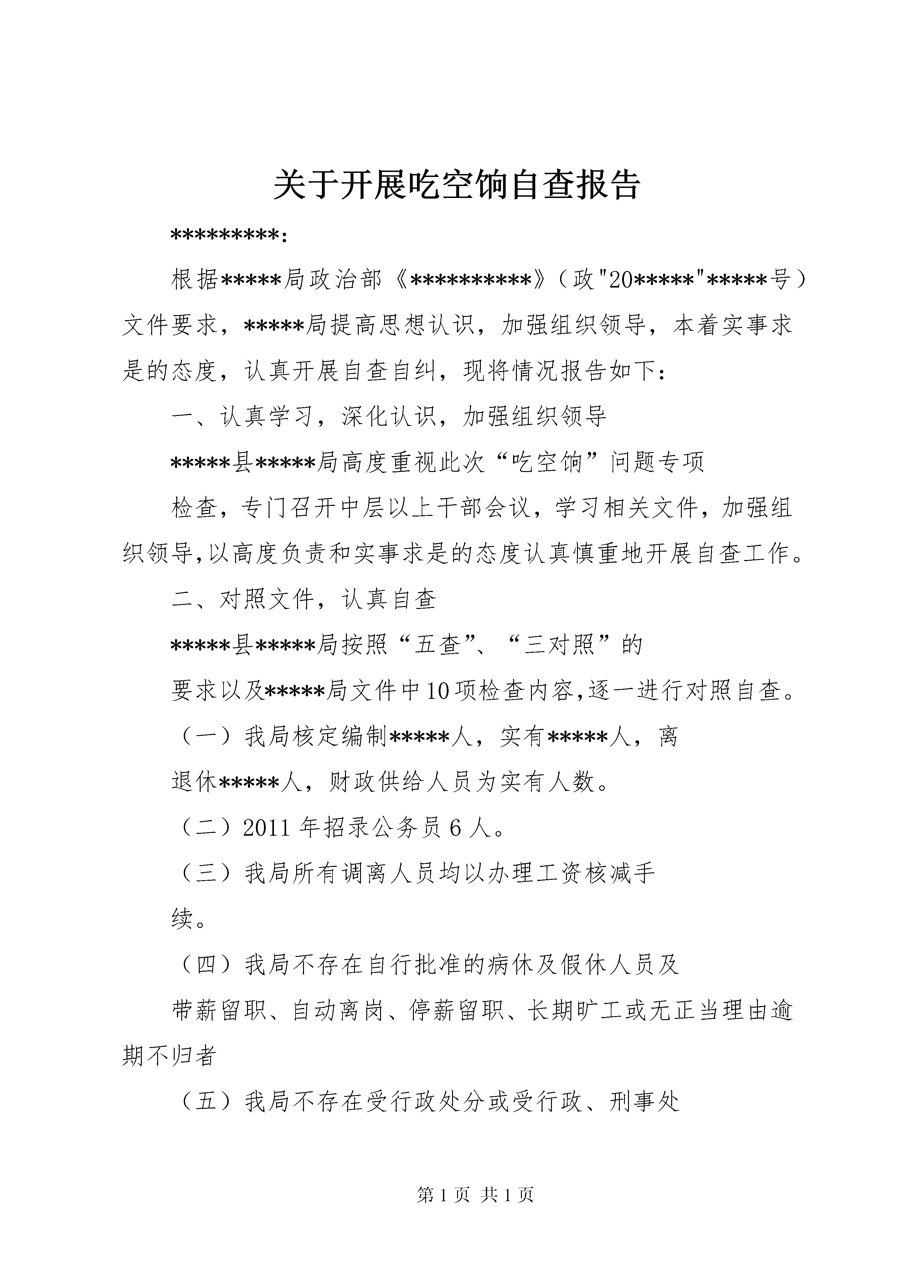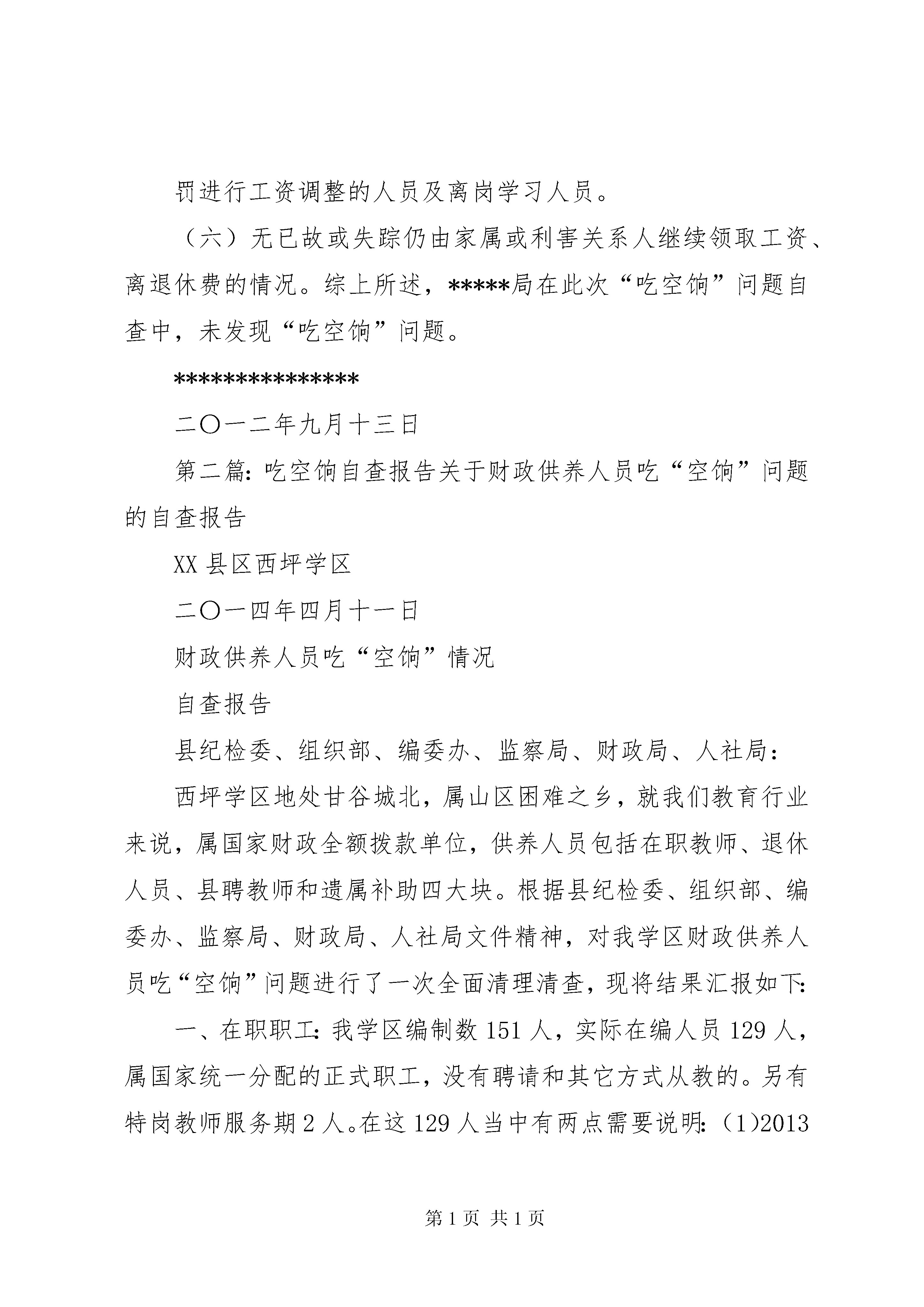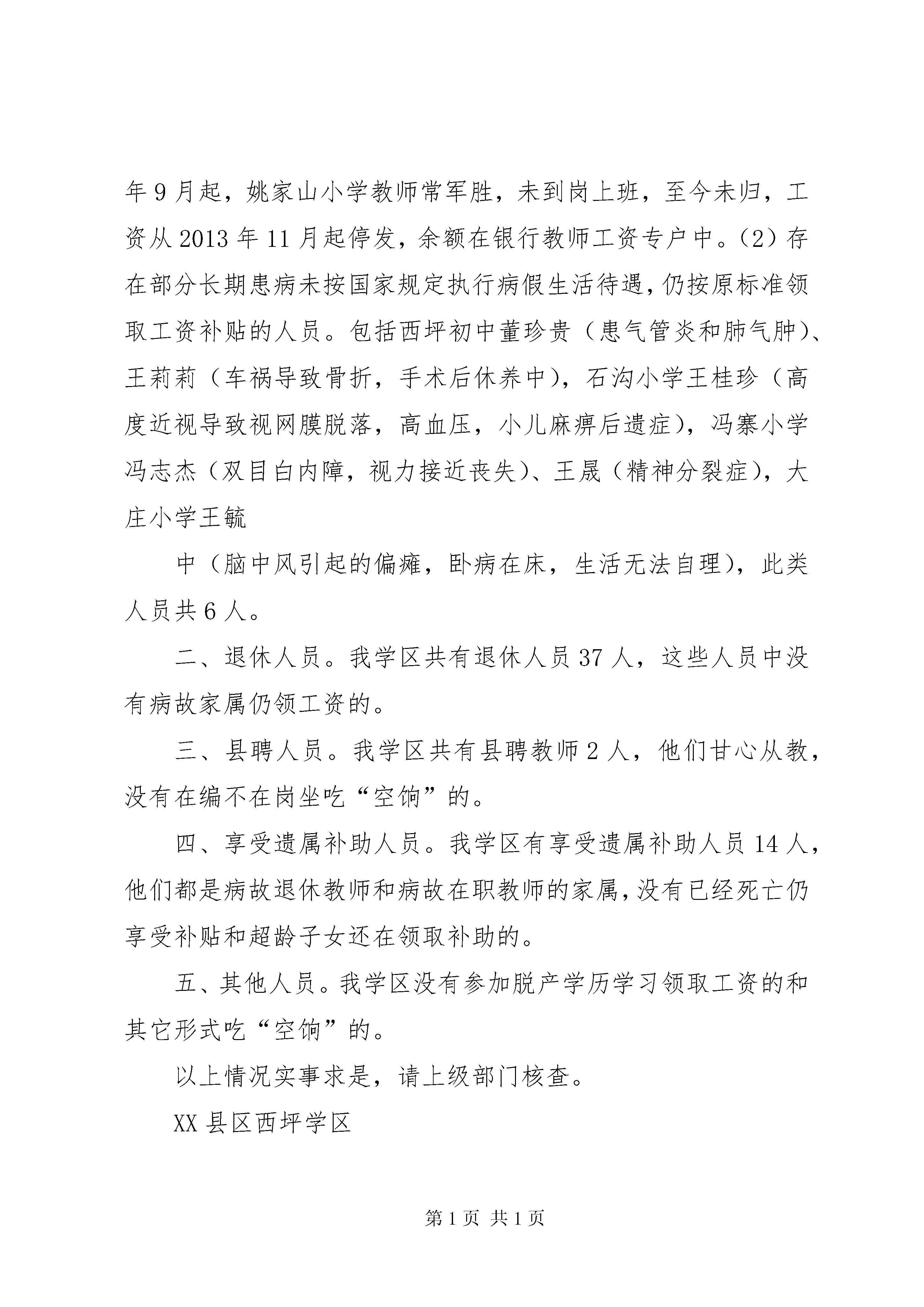 关于开展吃空饷自查报告*********:根据*****局政治部《**********》(政"20*****"*****号)文件要求,*****局提高思想认识,加强组织领导,本着实事求是的态度,认真开展自查自纠,现将情况报告如下:一、认真学习,深化认识,加强组织领导*****县*****局高度重视此次“吃空饷”问题专项检查,专门召开中层以上干部会议,学习相关文件,加强组织领导,以高度负责和实事求是的态度认真慎重地开展自查工作。二、对照文件,认真自查*****县*****局按照“五查”、“三对照”的要求以及*****局文件中10项检查内容,逐一进行对照自查。(一)我局核定编制*****人,实有*****人,离退休*****人,财政供给人员为实有人数。(二)2011年招录公务员6人。(三)我局所有调离人员均以办理工资核减手续。(四)我局不存在自行批准的病休及假休人员及带薪留职、自动离岗、停薪留职、长期旷工或无正当理由逾期不归者(五)我局不存在受行政处分或受行政、刑事处罚进行工资调整的人员及离岗学习人员。(六)无已故或失踪仍由家属或利害关系人继续领取工资、离退休费的情况。综上所述,*****局在此次“吃空饷”问题自查中,未发现“吃空饷”问题。***************二〇一二年九月十三日第二篇:吃空饷自查报告关于财政供养人员吃“空饷”问题的自查报告XX县区西坪学区二〇一四年四月十一日财政供养人员吃“空饷”情况自查报告县纪检委、组织部、编委办、监察局、财政局、人社局:西坪学区地处甘谷城北,属山区困难之乡,就我们教育行业来说,属国家财政全额拨款单位,供养人员包括在职教师、退休人员、县聘教师和遗属补助四大块。根据县纪检委、组织部、编委办、监察局、财政局、人社局文件精神,对我学区财政供养人员吃“空饷”问题进行了一次全面清理清查,现将结果汇报如下:一、在职职工:我学区编制数151人,实际在编人员129人,属国家统一分配的正式职工,没有聘请和其它方式从教的。另有特岗教师服务期2人。在这129人当中有两点需要说明:(1)2013年9月起,姚家山小学教师常军胜,未到岗上班,至今未归,工资从2013年11月起停发,余额在银行教师工资专户中。(2)存在部分长期患病未按国家规定执行病假生活待遇,仍按原标准领取工资补贴的人员。包括西坪初中董珍贵(患气管炎和肺气肿)、王莉莉(车祸导致骨折,手术后休养中),石沟小学王桂珍(高度近视导致视网膜脱落,高血压,小儿麻痹后遗症),冯寨小学冯志杰(双目白内障,视力接近丧失)、王晟(精神分裂症),大庄小学王毓中(脑中风引起的偏瘫,卧病在床,生活无法自理),此类人员共6人。二、退休人员。我学区共有退休人员37人,这些人员中没有病故家属仍领工资的。三、县聘人员。我学区共有县聘教师2人,他们甘心从教,没有在编不在岗坐吃“空饷”的。四、享受遗属补助人员。我学区有享受遗属补助人员14人,他们都是病故退休教师和病故在职教师的家属,没有已经死亡仍享受补贴和超龄子女还在领取补助的。五、其他人员。我学区没有参加脱产学历学习领取工资的和其它形式吃“空饷”的。以上情况实事求是,请上级部门核查。XX县区西坪学区二〇一四年四月十一日第三篇:吃空饷自查报告清面小学清理整治“吃空饷”问题自查自纠情况报告根据平桂管理区教育局关于转发《平桂管理区纪工委、监察局、财政局、编委局、人社局、审计局联合印发关于〈平桂管理区财政供养人员“吃空响”问题专项清理检查工作方案〉的通知》通知(贺平财〔2013〕27号)文件精神和要求,我校对“吃空饷”问题进行了认真自查,现将自查情况汇报如下:一、清面小学高度重视“吃空饷”问题清理整治自查自纠工作,成立了由学校长陈昌栋同志为组长,报账员朱芳珍同志为副组长,张益结、朱新娣、李日珍、聂荣海为成员的清理整治“吃空饷”问题的自查自纠工作领导小组,负责学校清理整治“吃空饷”问题的自查自纠工作的领导和指导。二、认真学习了《平桂管理区纪工委、监察局、财政局、编委局、人社局、审计局联合印发关于〈平桂管理区财政供养人员“吃空响”问题专项清理检查工作方案〉的通知》,并安排本学校报账员朱芳珍具体负责,各成员协助,对学校在编在岗人员、退休人员和遗属进行了逐一摸排,现有在编在岗人员22人,其中从黄田镇清面小学借调到我校人员1人(蒋志红)其工资编制不在清面,在清面上班。,退休教师20人,遗属2人,安全协管员1名。经过认真自查,我校不存在长期在编不在岗、伪造人员编制及长期在册不在岗骗取财政资金、退休和死亡不注销及其他形式的“吃空饷”问题。清面小学2013.12.13第四篇:吃空饷自查报告XX县区清理机关事业单位“吃空饷”人员各位领导:按照市纪委、市委组织部、市编办、市财政局、市人社局《关于清理机关事业单位“吃空饷”人员的通知》