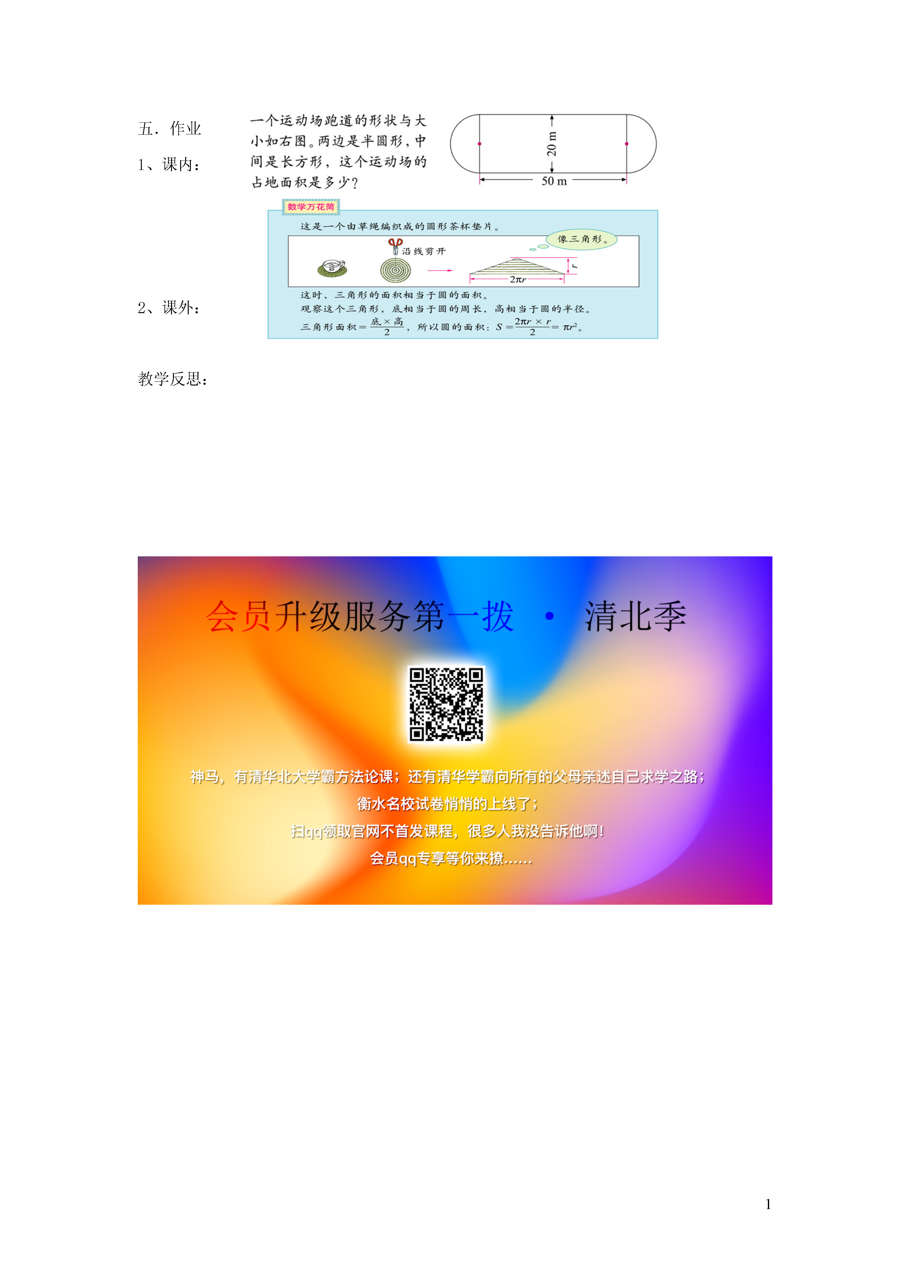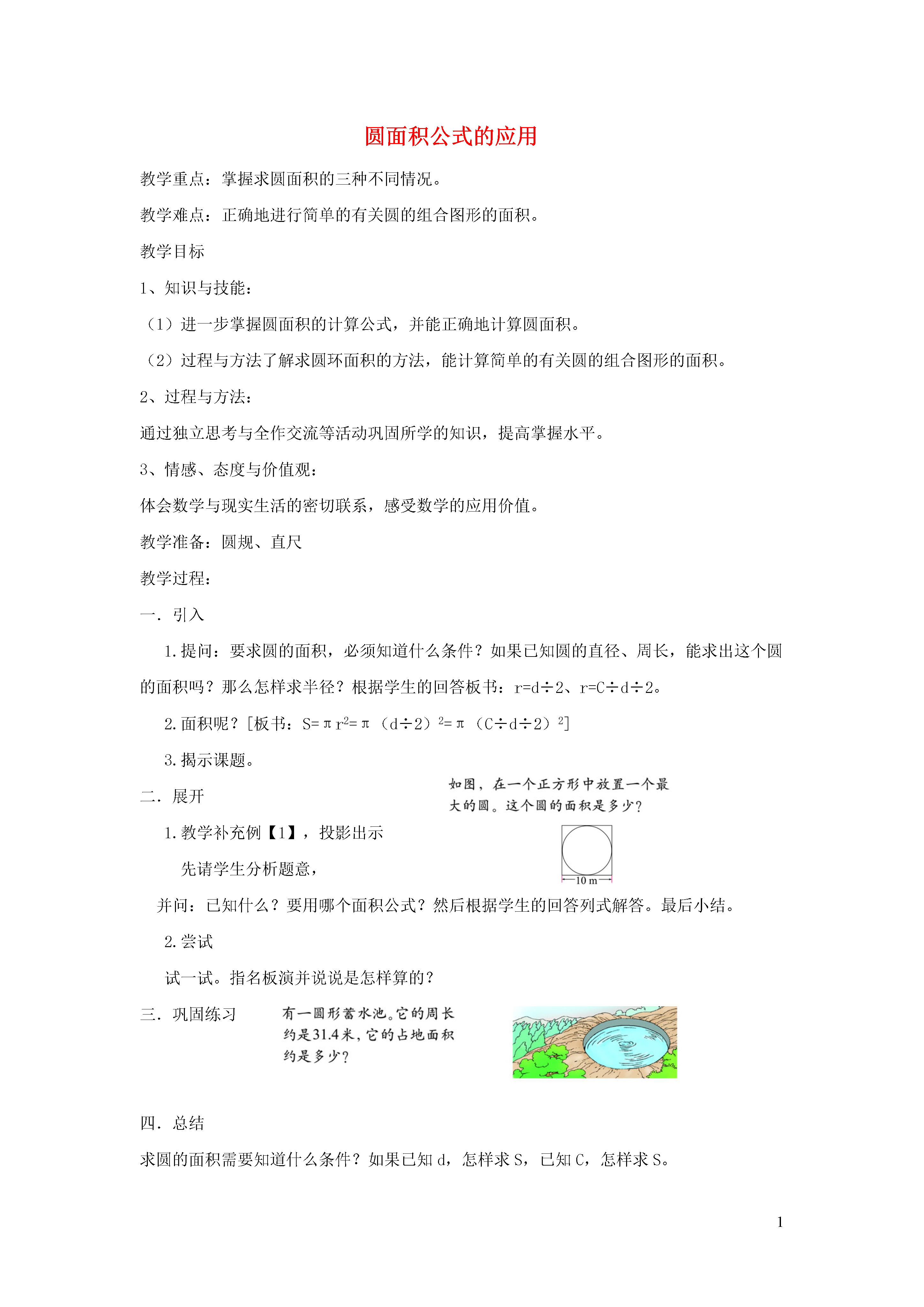 1圆面积公式的应用教学重点:掌握求圆面积的三种不同情况。教学难点:正确地进行简单的有关圆的组合图形的面积。教学目标1、知识与技能:(1)进一步掌握圆面积的计算公式,并能正确地计算圆面积。(2)过程与方法了解求圆环面积的方法,能计算简单的有关圆的组合图形的面积。2、过程与方法:通过独立思考与全作交流等活动巩固所学的知识,提高掌握水平。3、情感、态度与价值观:体会数学与现实生活的密切联系,感受数学的应用价值。教学准备:圆规、直尺教学过程:一.引入1.提问:要求圆的面积,必须知道什么条件?如果已知圆的直径、周长,能求出这个圆的面积吗?那么怎样求半径?根据学生的回答板书:r=d÷2、r=C÷d÷2。2.面积呢?[板书:S=πr2=π(d÷2)2=π(C÷d÷2)2]3.揭示课题。二.展开1.教学补充例【1】,投影出示先请学生分析题意,并问:已知什么?要用哪个面积公式?然后根据学生的回答列式解答。最后小结。2.尝试试一试。指名板演并说说是怎样算的?三.巩固练习四.总结求圆的面积需要知道什么条件?如果已知d,怎样求S,已知C,怎样求S。五.作业1、课内:2、课外:教学反思: