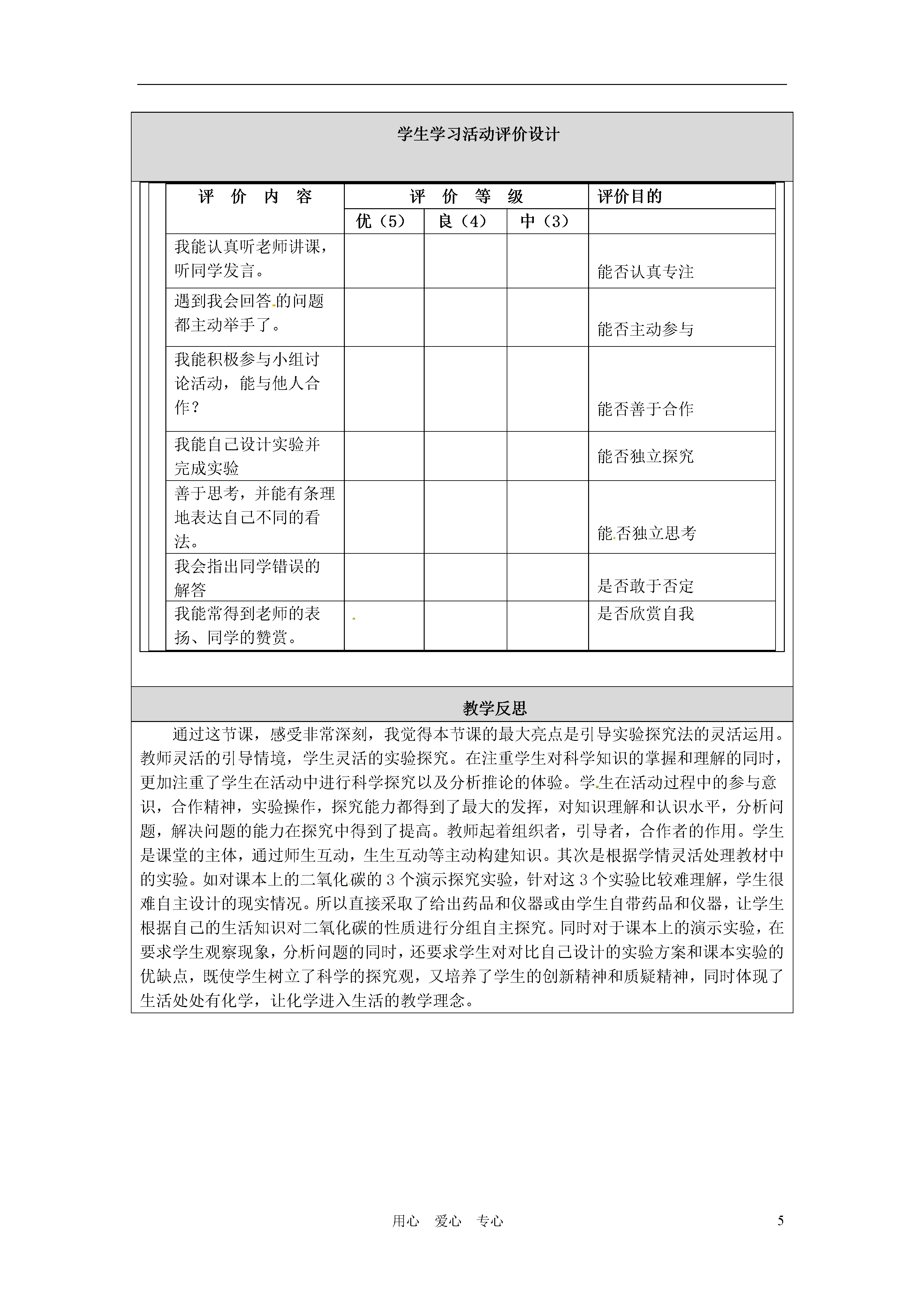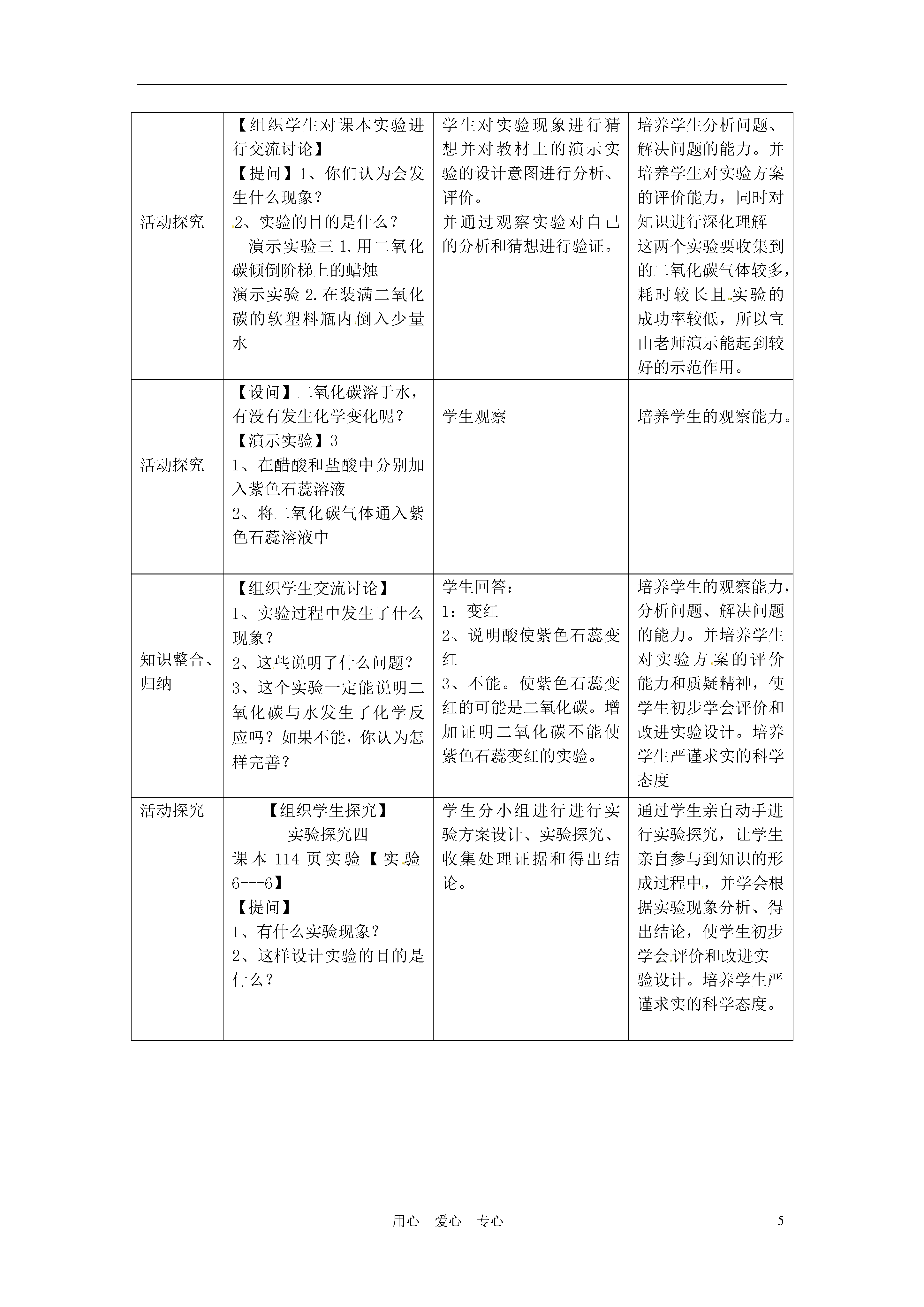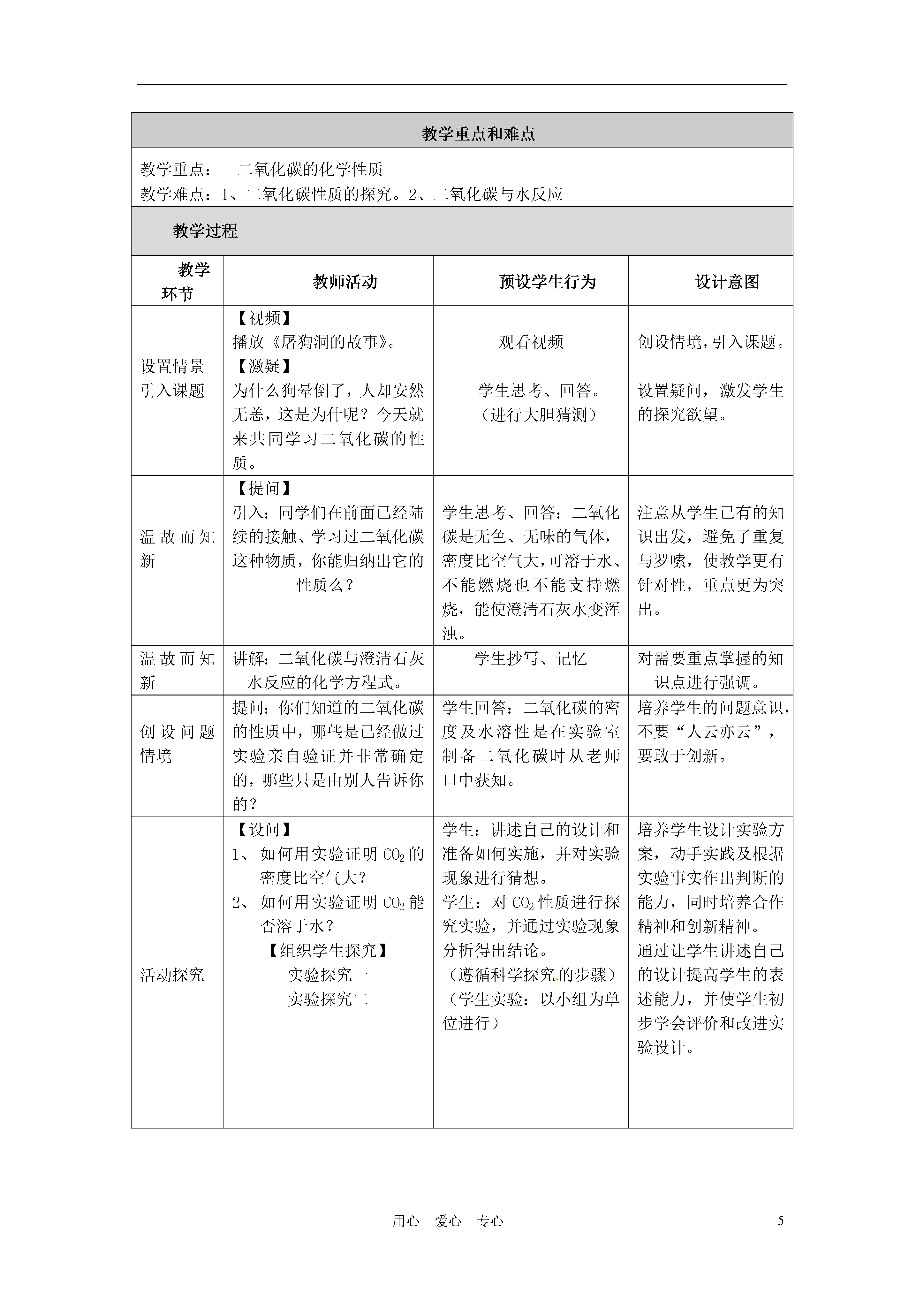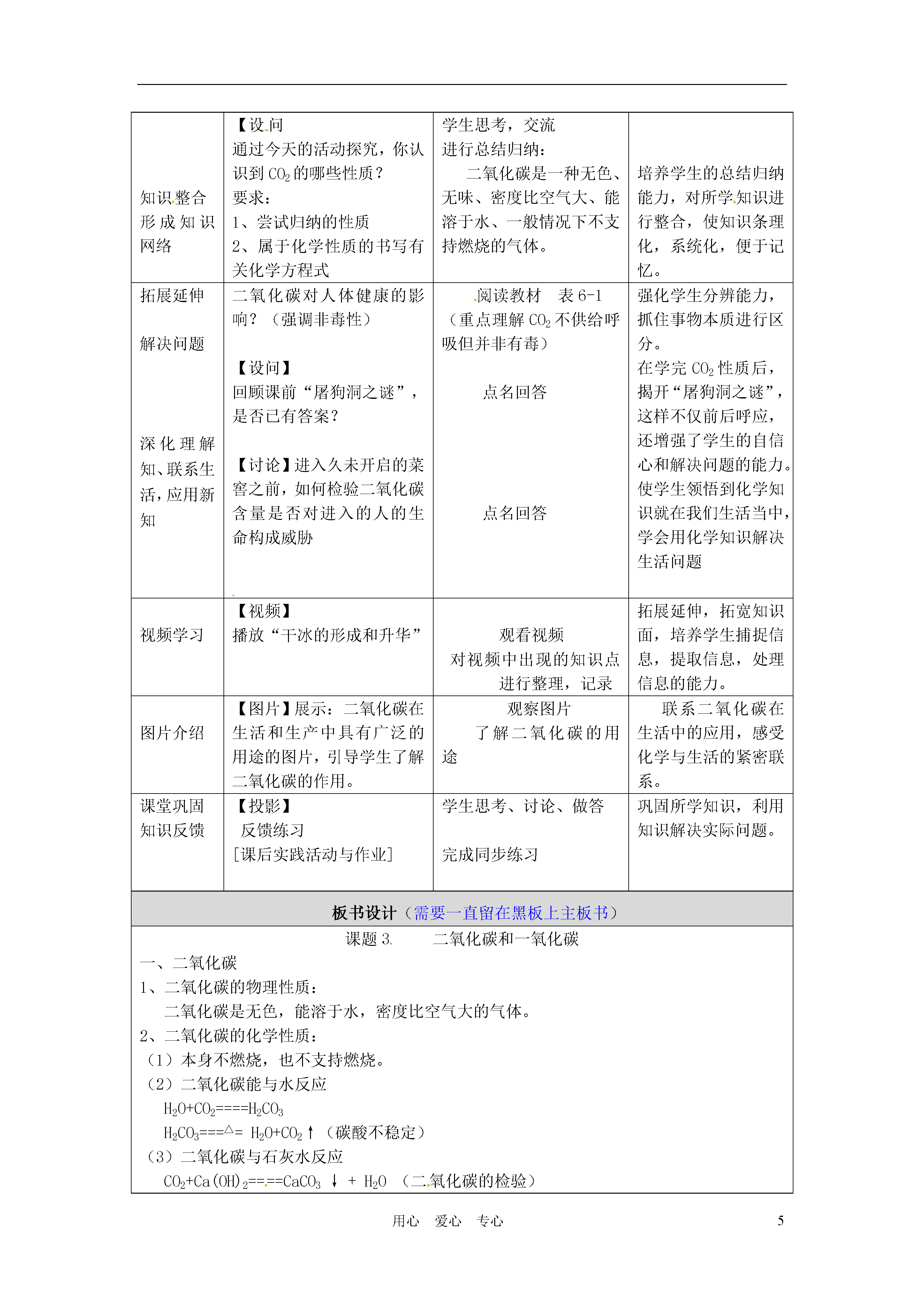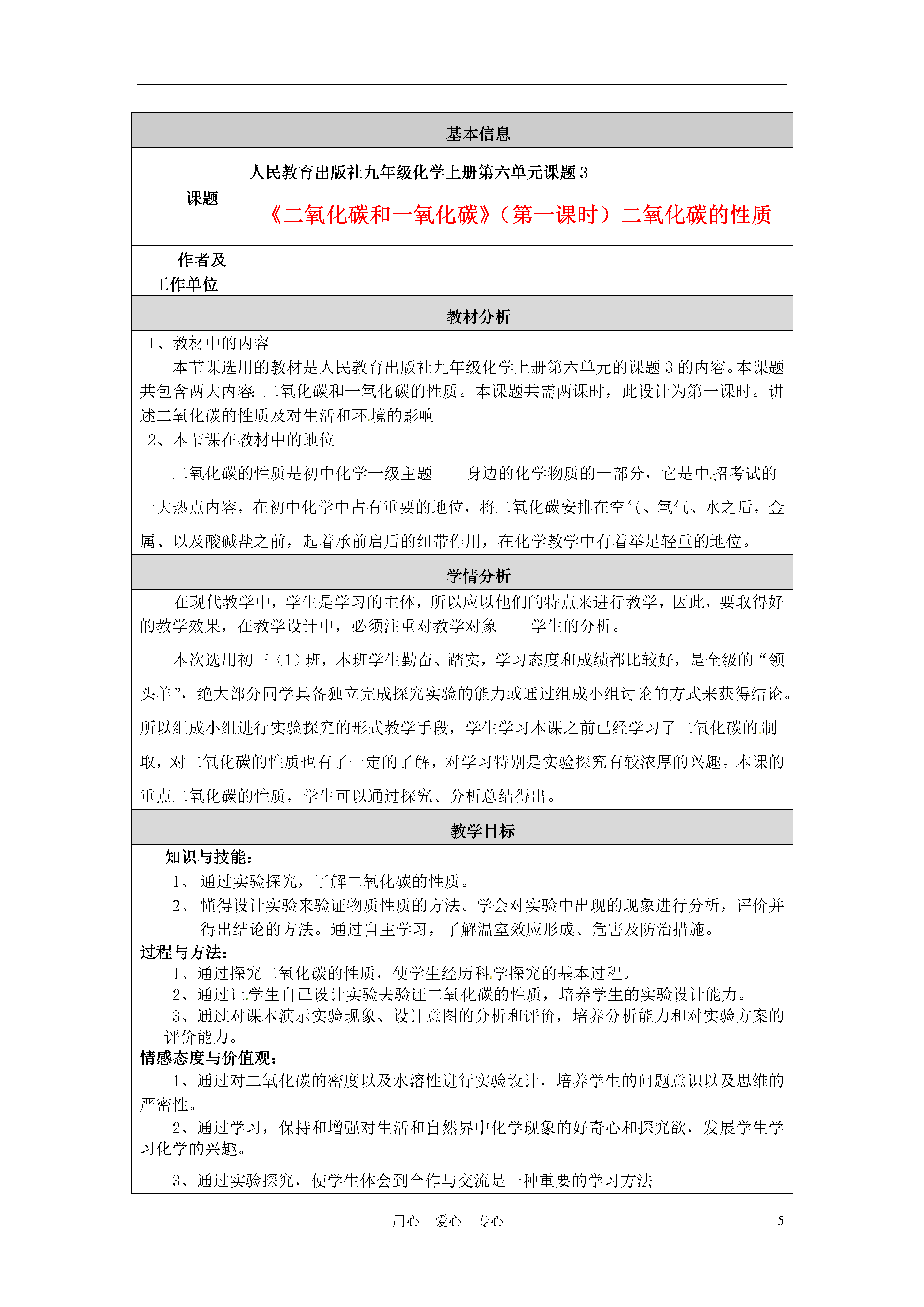 5用心爱心专心基本信息课题人民教育出版社九年级化学上册第六单元课题3《二氧化碳和一氧化碳》(第一课时)二氧化碳的性质作者及工作单位教材分析1、教材中的内容本节课选用的教材是人民教育出版社九年级化学上册第六单元的课题3的内容。本课题共包含两大内容:二氧化碳和一氧化碳的性质。本课题共需两课时,此设计为第一课时。讲述二氧化碳的性质及对生活和环境的影响2、本节课在教材中的地位二氧化碳的性质是初中化学一级主题----身边的化学物质的一部分,它是中招考试的一大热点内容,在初中化学中占有重要的地位,将二氧化碳安排在空气、氧气、水之后,金属、以及酸碱盐之前,起着承前启后的纽带作用,在化学教学中有着举足轻重的地位。学情分析在现代教学中,学生是学习的主体,所以应以他们的特点来进行教学,因此,要取得好的教学效果,在教学设计中,必须注重对教学对象——学生的分析。本次选用初三(1)班,本班学生勤奋、踏实,学习态度和成绩都比较好,是全级的“领头羊”,绝大部分同学具备独立完成探究实验的能力或通过组成小组讨论的方式来获得结论。所以组成小组进行实验探究的形式教学手段,学生学习本课之前已经学习了二氧化碳的制取,对二氧化碳的性质也有了一定的了解,对学习特别是实验探究有较浓厚的兴趣。本课的重点二氧化碳的性质,学生可以通过探究、分析总结得出。教学目标知识与技能:通过实验探究,了解二氧化碳的性质。懂得设计实验来验证物质性质的方法。学会对实验中出现的现象进行分析,评价并得出结论的方法。通过自主学习,了解温室效应形成、危害及防治措施。过程与方法:1、通过探究二氧化碳的性质,使学生经历科学探究的基本过程。2、通过让学生自己设计实验去验证二氧化碳的性质,培养学生的实验设计能力。3、通过对课本演示实验现象、设计意图的分析和评价,培养分析能力和对实验方案的评价能力。情感态度与价值观:1、通过对二氧化碳的密度以及水溶性进行实验设计,培养学生的问题意识以及思维的严密性。2、通过学习,保持和增强对生活和自然界中化学现象的好奇心和探究欲,发展学生学习化学的兴趣。3、通过实验探究,使学生体会到合作与交流是一种重要的学习方法教学重点和难点教学重点:二氧化碳的化学性质教学难点:1、二氧化碳性质的探究。2、二氧化碳与水反应教学过程教学环节教师活动预设学生行为设计意图设置情景引入课题【视频】播放《屠狗洞的故事》。【激疑】为什么狗晕倒了,人却安然无恙,这是为什呢?今天就来共同学习二氧化碳的性质。观看视频学生思考、回答。(进行大胆猜测)创设情境,引入课题。设置疑问,激发学生的探究欲望。温故而知新【提问】引入:同学们在前面已经陆续的接触、学习过二氧化碳这种物质,你能归纳出它的性质么?学生思考、回答:二氧化碳是无色、无味的气体,密度比空气大,可溶于水、不能燃烧也不能支持燃烧,能使澄清石灰水变浑浊。注意从学生已有的知识出发,避免了重复与罗嗦,使教学更有针对性,重点更为突出。温故而知新讲解:二氧化碳与澄清石灰水反应的化学方程式。学生抄写、记忆对需要重点掌握的知识点进行强调。创设问题情境提问:你们知道的二氧化碳的性质中,哪些是已经做过实验亲自验证并非常确定的,哪些只是由别人告诉你的?学生回答:二氧化碳的密度及水溶性是在实验室制备二氧化碳时从老师口中获知。培养学生的问题意识,不要“人云亦云”,要敢于创新。活动探究【设问】如何用实验证明CO2的密度比空气大?如何用实验证明CO2能否溶于水?【组织学生探究】实验探究一实验探究二学生:讲述自己的设计和准备如何实施,并对实验现象进行猜想。学生:对CO2性质进行探究实验,并通过实验现象分析得出结论。(遵循科学探究的步骤)(学生实验:以小组为单位进行)培养学生设计实验方案,动手实践及根据实验事实作出判断的能力,同时培养合作精神和创新精神。通过让学生讲述自己的设计提高学生的表述能力,并使学生初步学会评价和改进实验设计。活动探究【组织学生对课本实验进行交流讨论】【提问】1、你们认为会发生什么现象?2、实验的目的是什么?演示实验三1.用二氧化碳倾倒阶梯上的蜡烛演示实验2.在装满二氧化碳的软塑料瓶内倒入少量水学生对实验现象进行猜想并对教材上的演示实验的设计意图进行分析、评价。并通过观察实验对自己的分析和猜想进行验证。培养学生分析问题、解决问题的能力。并培养学生对实验方案的评价能力,同时对知识进行深化理解这两个实验要收集到的二氧化碳气体较多,耗时较长且实验的成功率较低,所以宜由老师演示能起到较好的示范作用。活动探究【设问】二氧化碳溶于水,有没有发生化学变化呢?【演示实验】31、在醋酸和盐酸中分别加入紫色石蕊溶液2、将二氧化碳气体