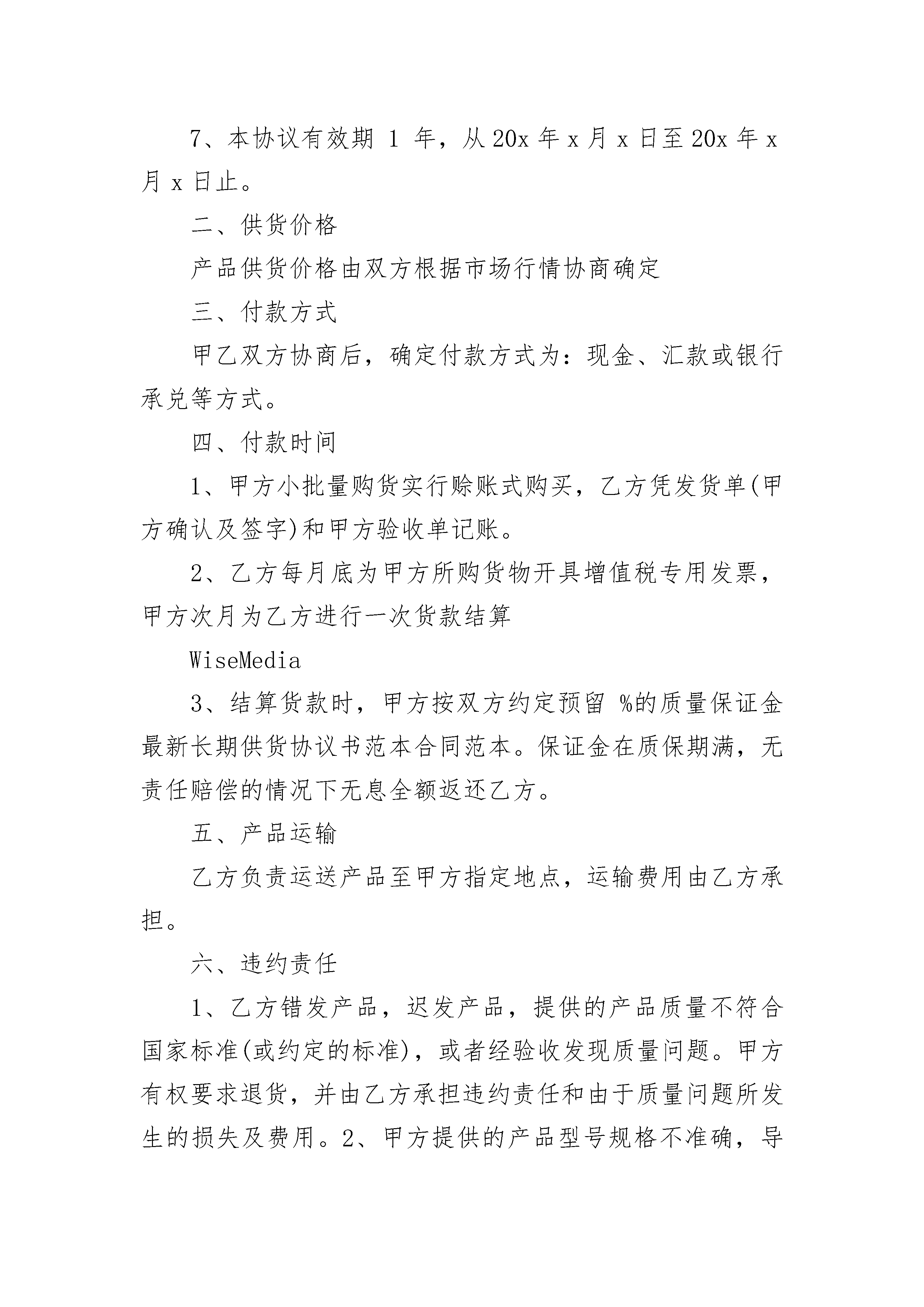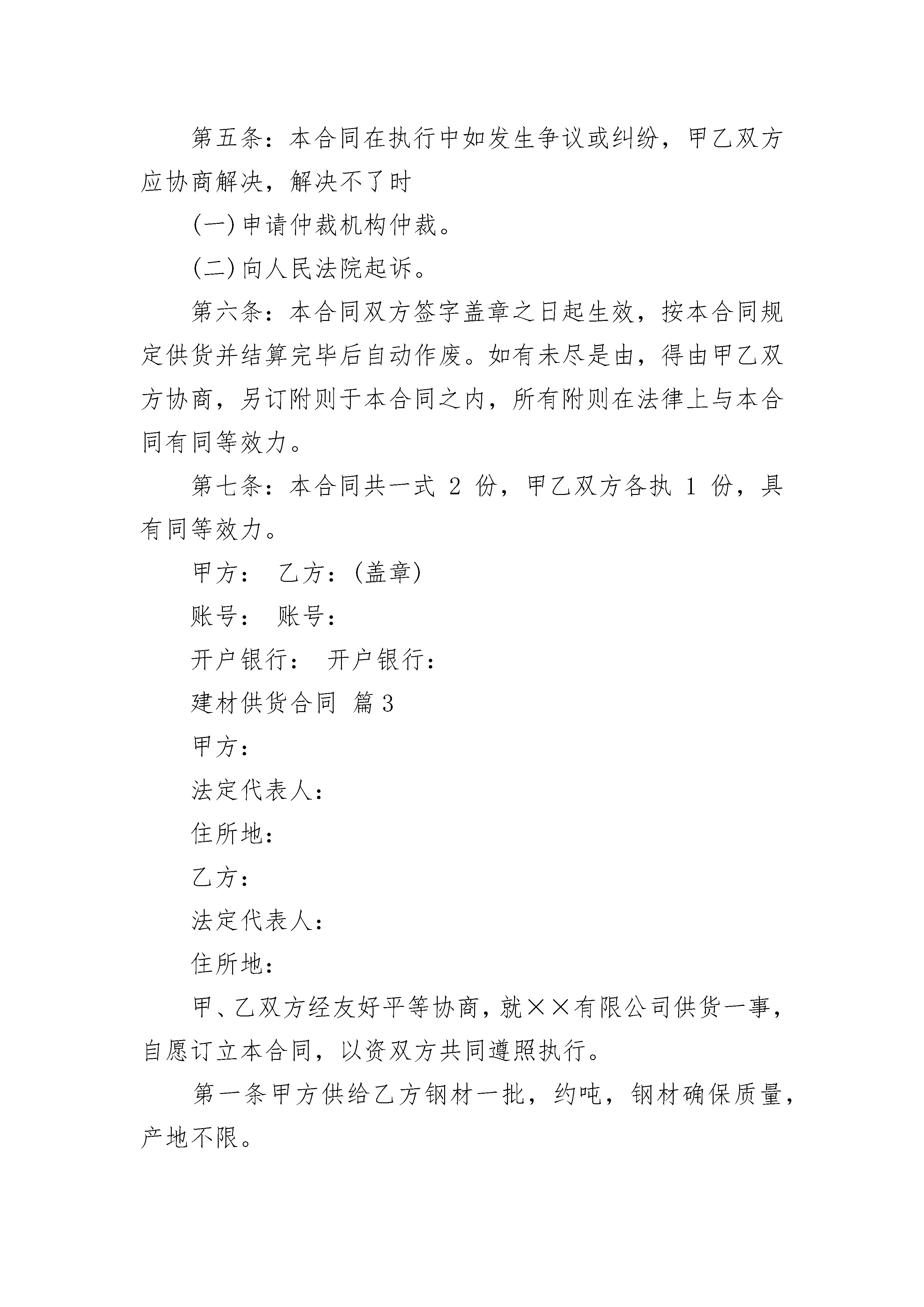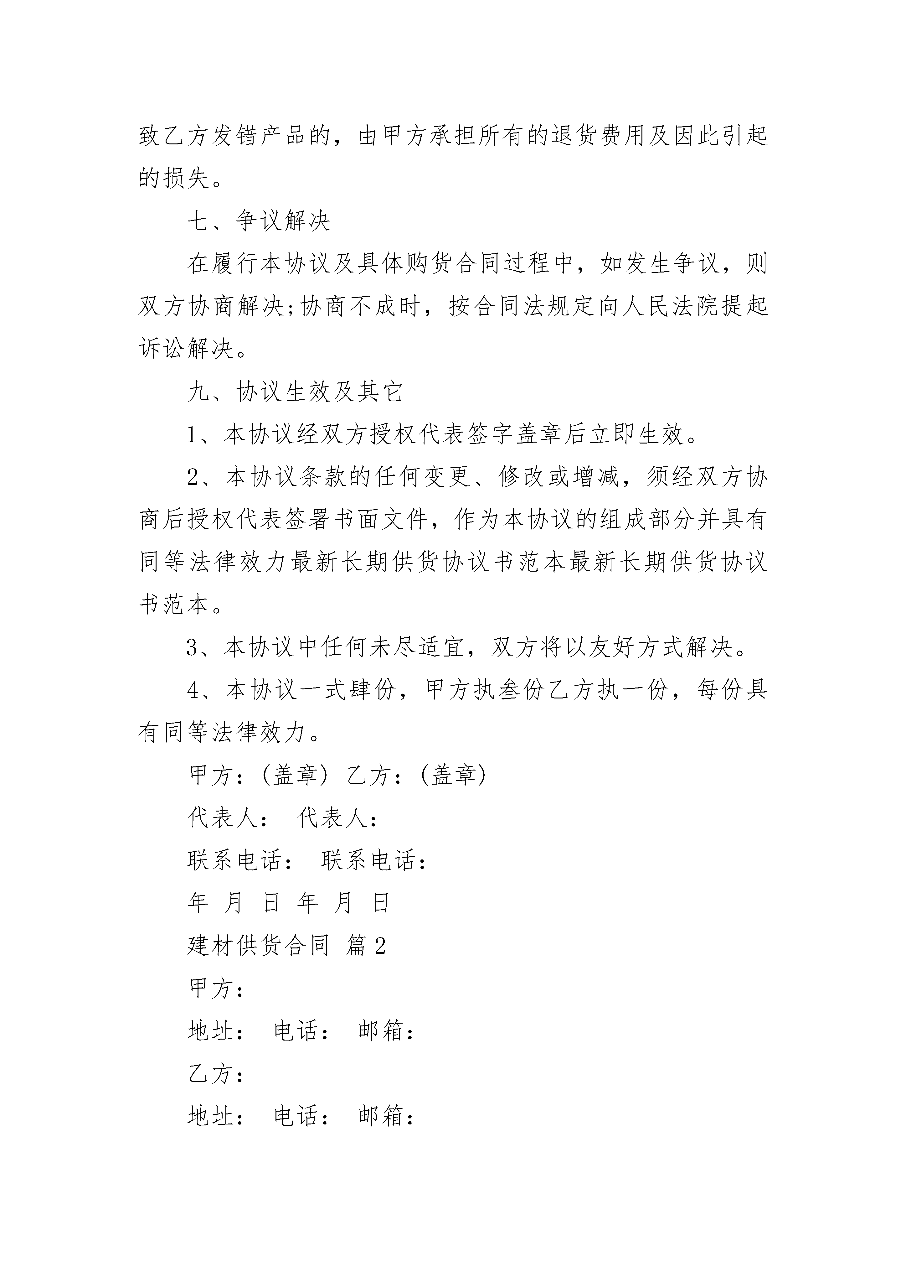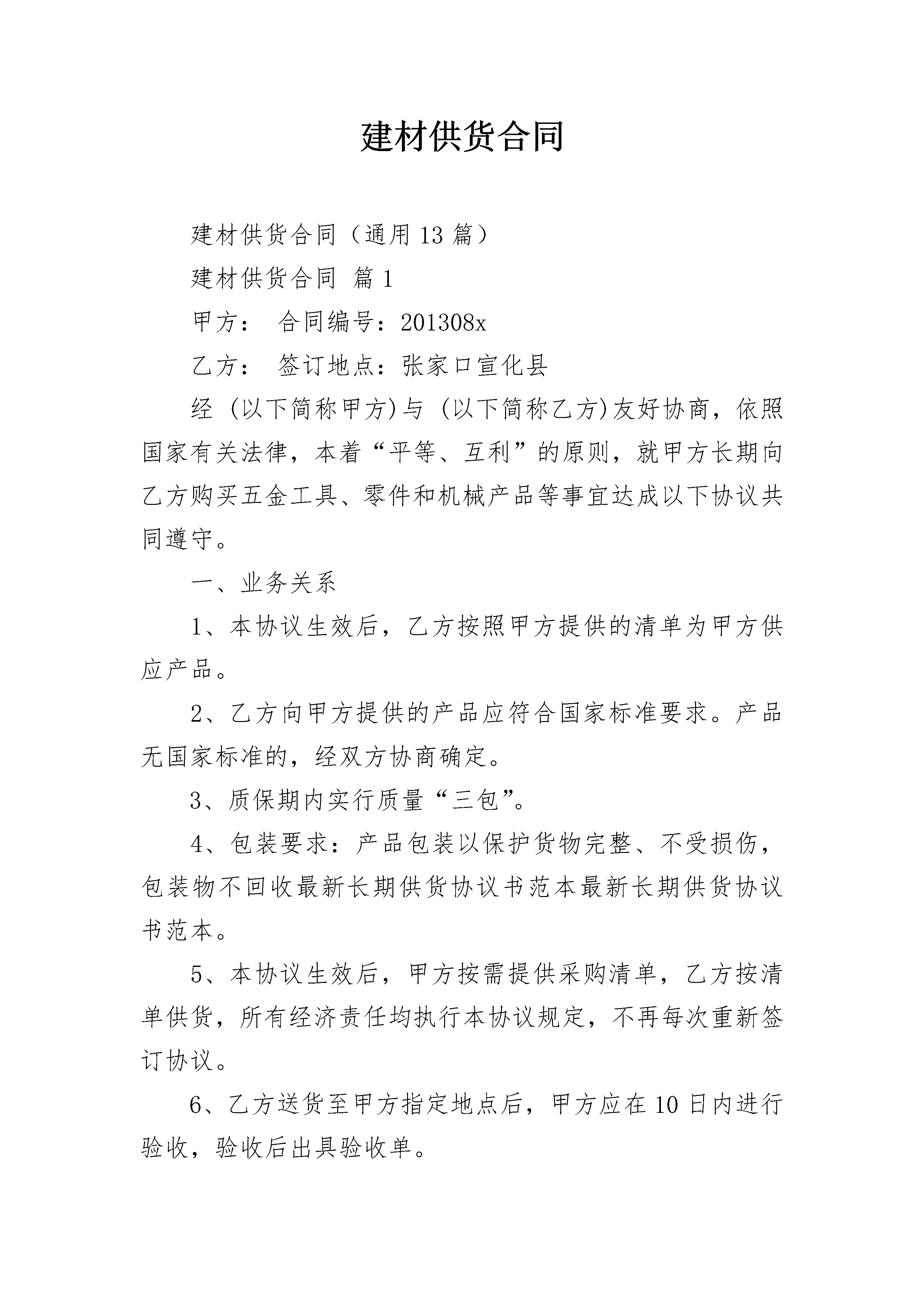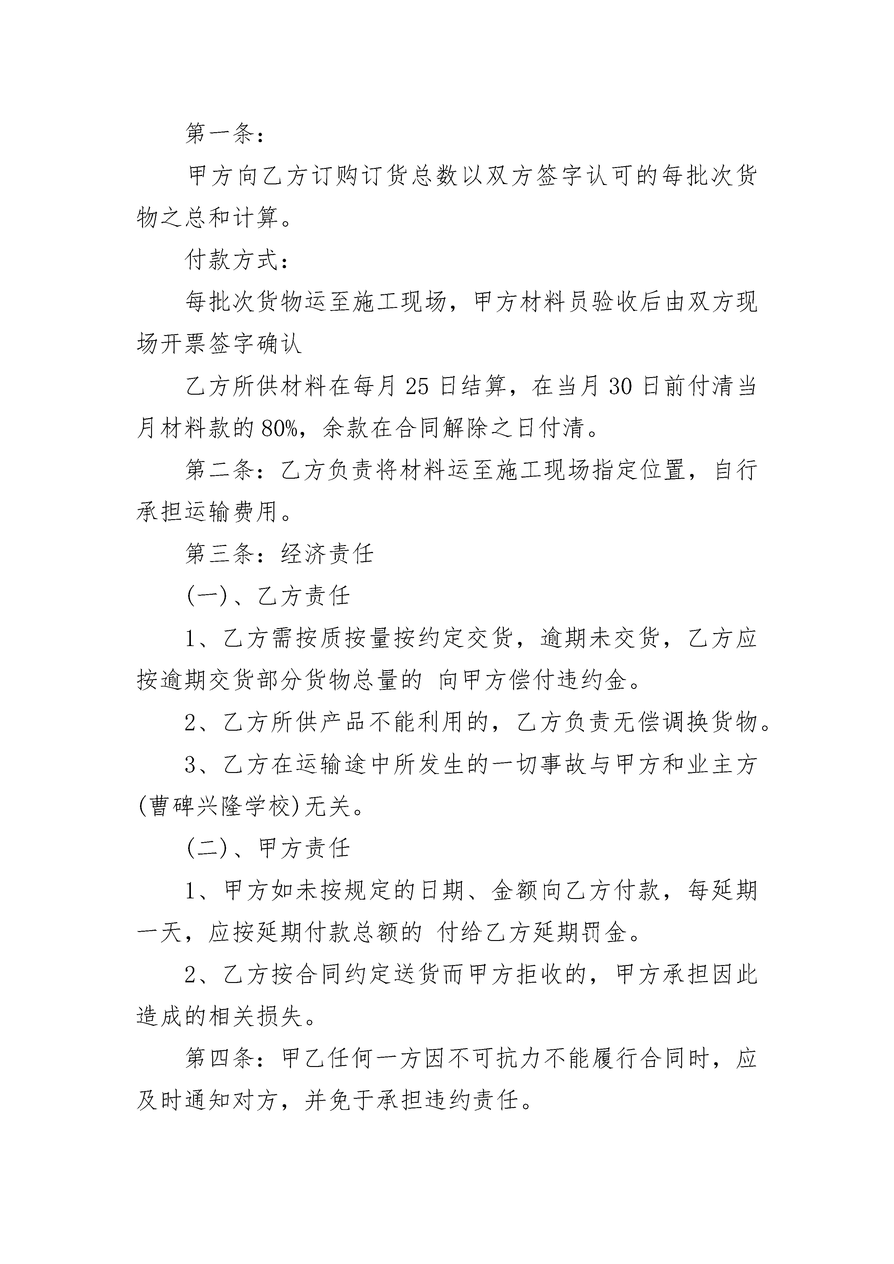 建材供货合同建材供货合同(通用13篇)建材供货合同篇1甲方:合同编号:201308x乙方:签订地点:张家口宣化县经(以下简称甲方)与(以下简称乙方)友好协商,依照国家有关法律,本着“平等、互利”的原则,就甲方长期向乙方购买五金工具、零件和机械产品等事宜达成以下协议共同遵守。一、业务关系1、本协议生效后,乙方按照甲方提供的清单为甲方供应产品。2、乙方向甲方提供的产品应符合国家标准要求。产品无国家标准的,经双方协商确定。3、质保期内实行质量“三包”。4、包装要求:产品包装以保护货物完整、不受损伤,包装物不回收最新长期供货协议书范本最新长期供货协议书范本。5、本协议生效后,甲方按需提供采购清单,乙方按清单供货,所有经济责任均执行本协议规定,不再每次重新签订协议。6、乙方送货至甲方指定地点后,甲方应在10日内进行验收,验收后出具验收单。7、本协议有效期1年,从20x年x月x日至20x年x月x日止。二、供货价格产品供货价格由双方根据市场行情协商确定三、付款方式甲乙双方协商后,确定付款方式为:现金、汇款或银行承兑等方式。四、付款时间1、甲方小批量购货实行赊账式购买,乙方凭发货单(甲方确认及签字)和甲方验收单记账。2、乙方每月底为甲方所购货物开具增值税专用发票,甲方次月为乙方进行一次货款结算WiseMedia3、结算货款时,甲方按双方约定预留%的质量保证金最新长期供货协议书范本合同范本。保证金在质保期满,无责任赔偿的情况下无息全额返还乙方。五、产品运输乙方负责运送产品至甲方指定地点,运输费用由乙方承担。六、违约责任1、乙方错发产品,迟发产品,提供的产品质量不符合国家标准(或约定的标准),或者经验收发现质量问题。甲方有权要求退货,并由乙方承担违约责任和由于质量问题所发生的损失及费用。2、甲方提供的产品型号规格不准确,导致乙方发错产品的,由甲方承担所有的退货费用及因此引起的损失。七、争议解决在履行本协议及具体购货合同过程中,如发生争议,则双方协商解决;协商不成时,按合同法规定向人民法院提起诉讼解决。九、协议生效及其它1、本协议经双方授权代表签字盖章后立即生效。2、本协议条款的任何变更、修改或增减,须经双方协商后授权代表签署书面文件,作为本协议的组成部分并具有同等法律效力最新长期供货协议书范本最新长期供货协议书范本。3、本协议中任何未尽适宜,双方将以友好方式解决。4、本协议一式肆份,甲方执叁份乙方执一份,每份具有同等法律效力。甲方:(盖章)乙方:(盖章)代表人:代表人:联系电话:联系电话:年月日年月日建材供货合同篇2甲方:地址:电话:邮箱:乙方:地址:电话:邮箱:第一条:甲方向乙方订购订货总数以双方签字认可的每批次货物之总和计算。付款方式:每批次货物运至施工现场,甲方材料员验收后由双方现场开票签字确认乙方所供材料在每月25日结算,在当月30日前付清当月材料款的80%,余款在合同解除之日付清。第二条:乙方负责将材料运至施工现场指定位置,自行承担运输费用。第三条:经济责任(一)、乙方责任1、乙方需按质按量按约定交货,逾期未交货,乙方应按逾期交货部分货物总量的向甲方偿付违约金。2、乙方所供产品不能利用的,乙方负责无偿调换货物。3、乙方在运输途中所发生的一切事故与甲方和业主方(曹碑兴隆学校)无关。(二)、甲方责任1、甲方如未按规定的日期、金额向乙方付款,每延期一天,应按延期付款总额的付给乙方延期罚金。2、乙方按合同约定送货而甲方拒收的,甲方承担因此造成的相关损失。第四条:甲乙任何一方因不可抗力不能履行合同时,应及时通知对方,并免于承担违约责任。第五条:本合同在执行中如发生争议或纠纷,甲乙双方应协商解决,解决不了时(一)申请仲裁机构仲裁。(二)向人民法院起诉。第六条:本合同双方签字盖章之日起生效,按本合同规定供货并结算完毕后自动作废。如有未尽是由,得由甲乙双方协商,另订附则于本合同之内,所有附则在法律上与本合同有同等效力。第七条:本合同共一式2份,甲乙双方各执1份,具有同等效力。甲方:乙方:(盖章)账号:账号:开户银行:开户银行:建材供货合同篇3甲方:法定代表人:住所地:乙方:法定代表人:住所地:甲、乙双方经友好平等协商,就××有限公司供货一事,自愿订立本合同,以资双方共同遵照执行。第一条甲方供给乙方钢材一批,约吨,钢材确保质量,产地不限。单价按现行市场价:一级钢单价元吨二级钢单价元吨三级钢单价元吨按上列单价结算付清货款。第二条甲方供给乙方水泥一批,约吨,水泥产地。甲方确保此批水泥质量,并提供厂方化验报告,水泥单价现价按××元吨结算付清货款。第三条我公司所供物资(钢材,水泥)价格随行就市。第四条乙方在我公司所供钢材入场后,乙方必须先检验合格后,方能加工使用,否则,乙方提出的一切质量问题及其经济损失由乙方自行负责(若乙方检验后,钢材不合格,乙方必须通知甲