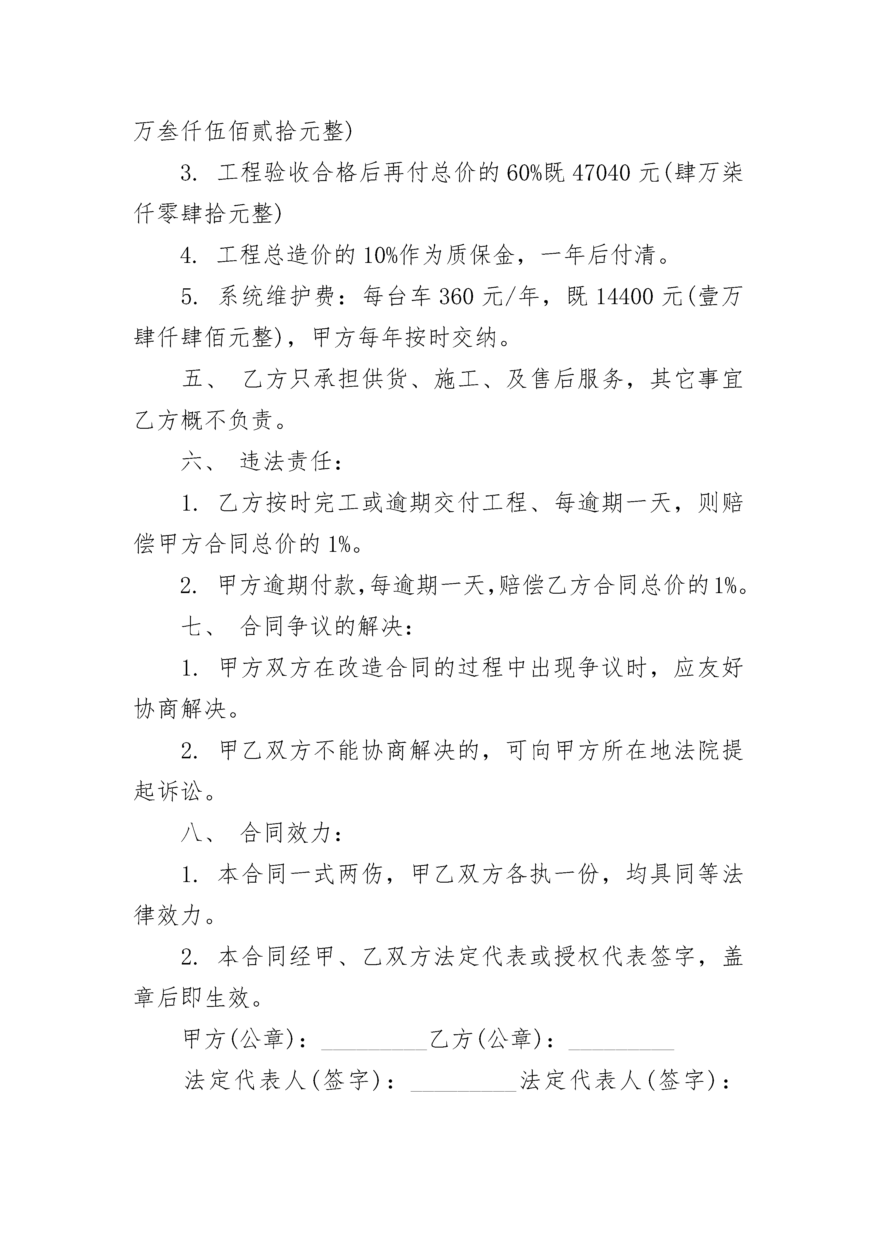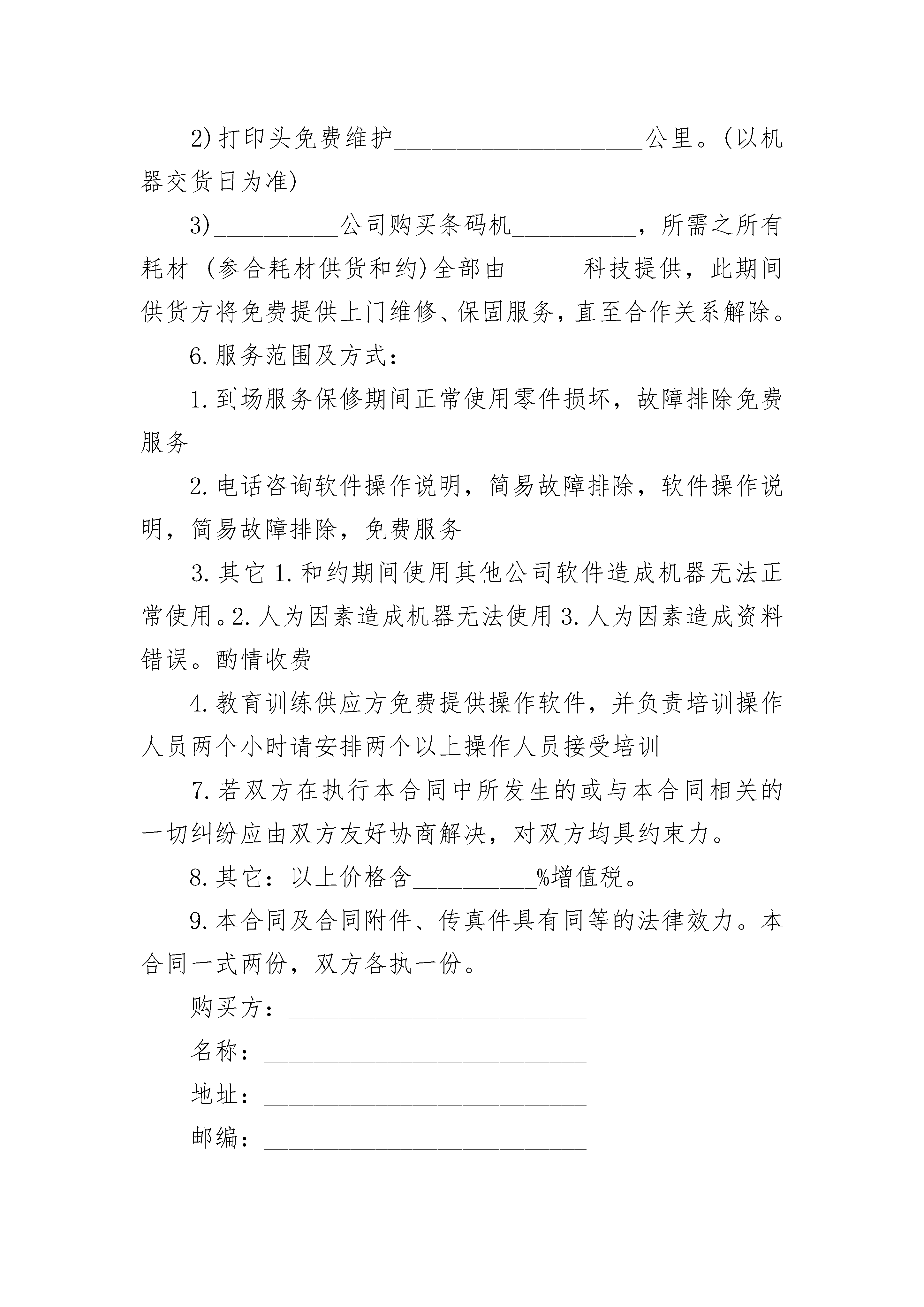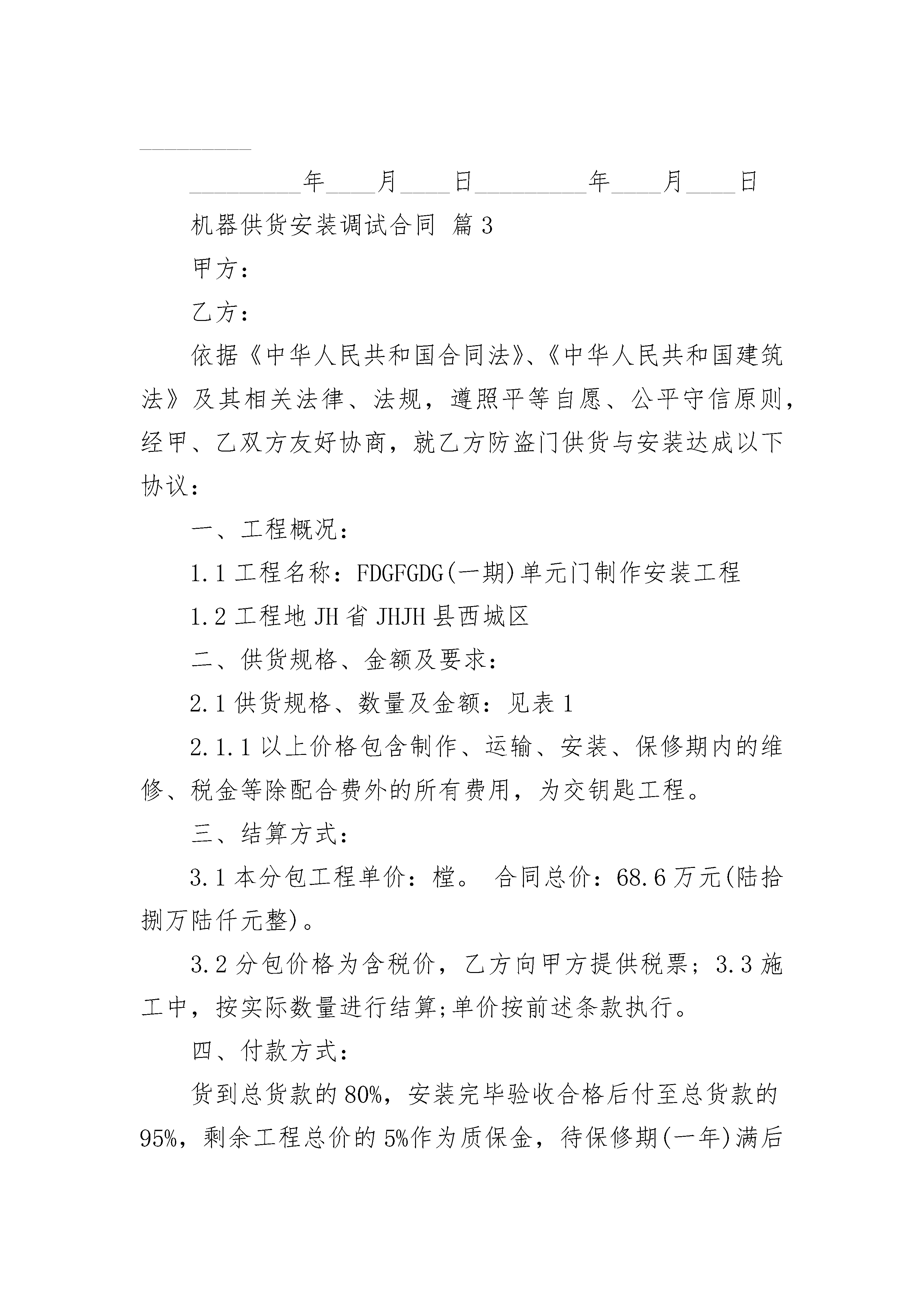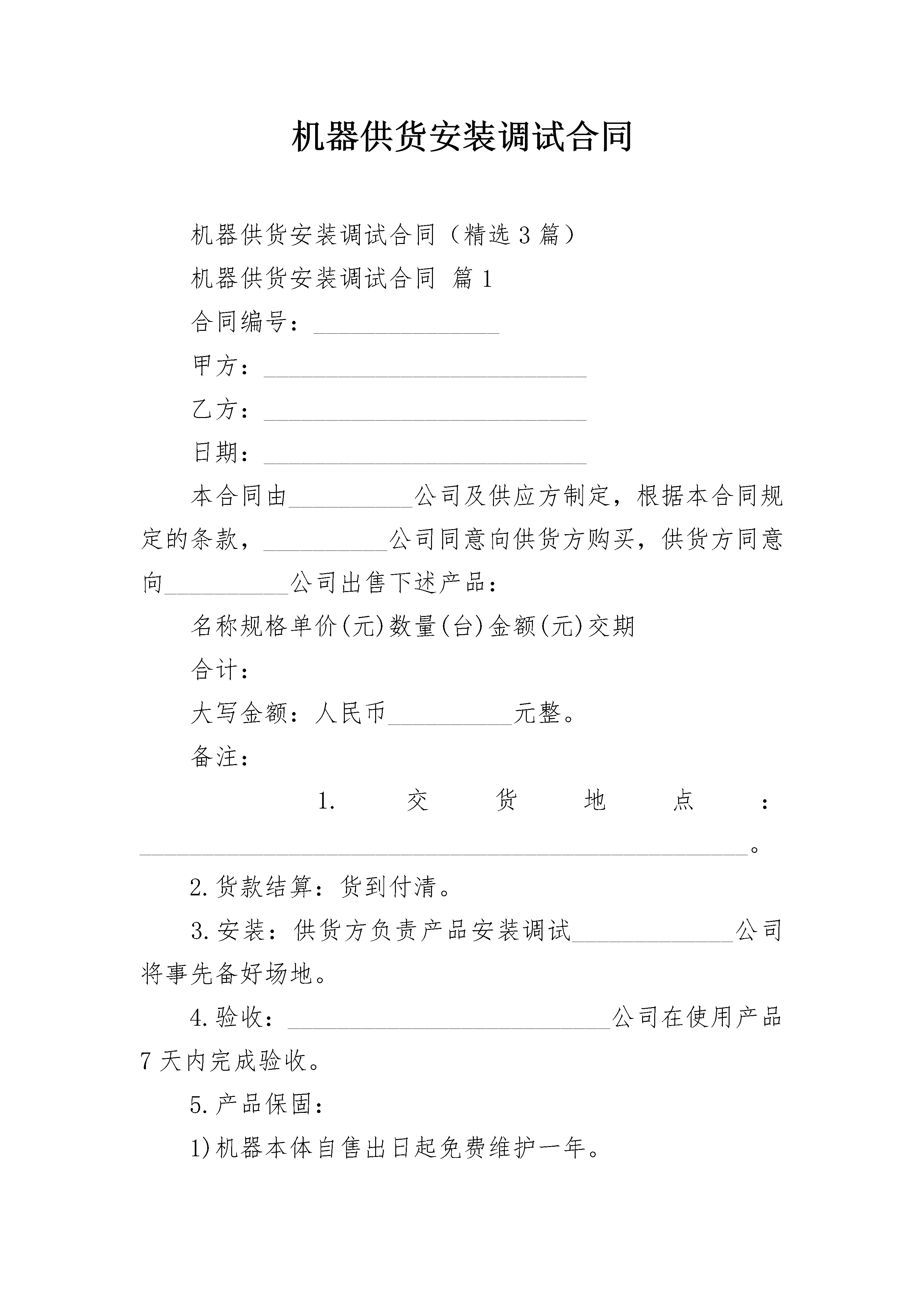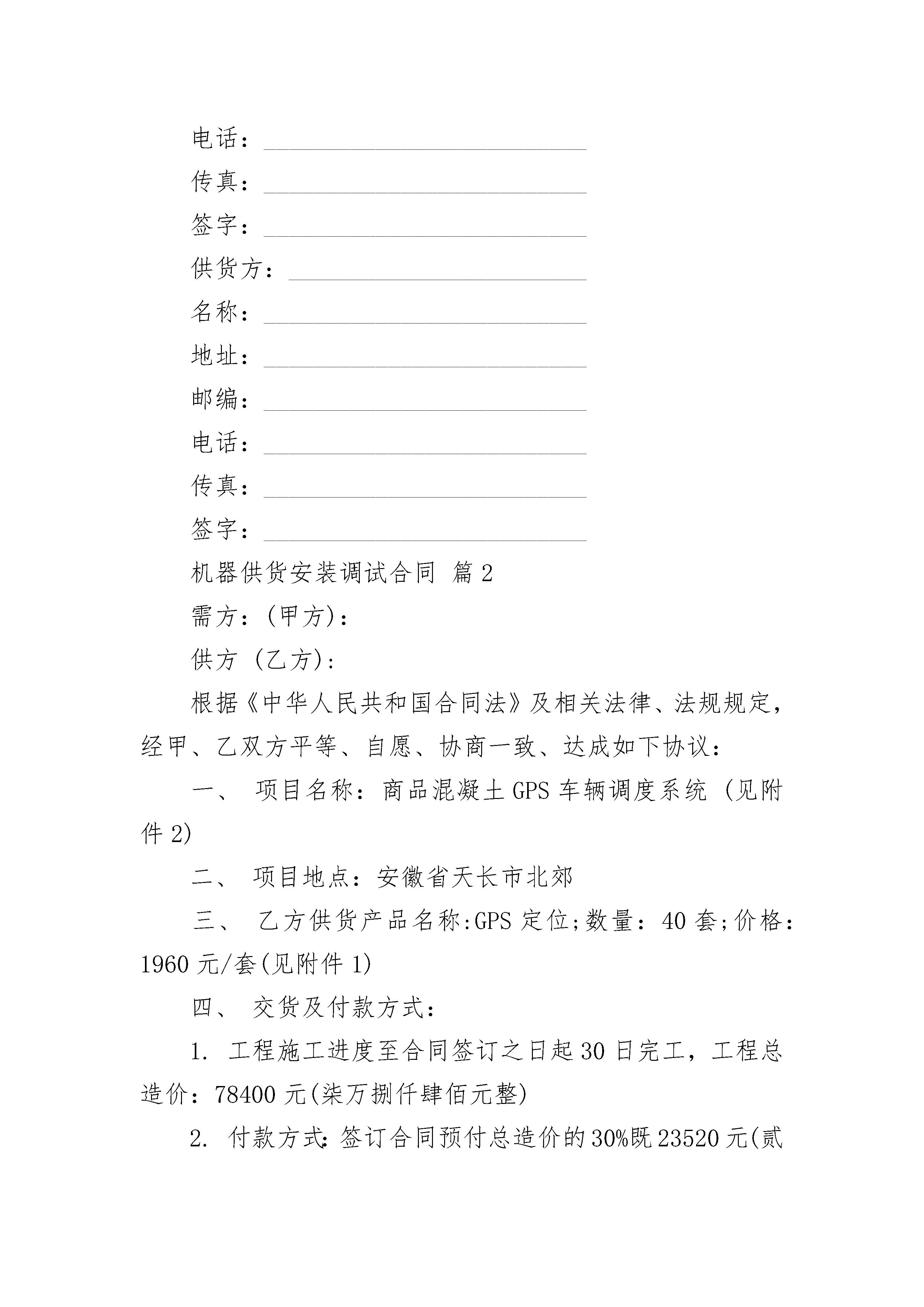 机器供货安装调试合同机器供货安装调试合同(精选3篇)机器供货安装调试合同篇1合同编号:_______________甲方:__________________________乙方:__________________________日期:__________________________本合同由__________公司及供应方制定,根据本合同规定的条款,__________公司同意向供货方购买,供货方同意向__________公司出售下述产品:名称规格单价(元)数量(台)金额(元)交期合计:大写金额:人民币__________元整。备注:1.交货地点:_________________________________________________。2.货款结算:货到付清。3.安装:供货方负责产品安装调试_____________公司将事先备好场地。4.验收:__________________________公司在使用产品7天内完成验收。5.产品保固:1)机器本体自售出日起免费维护一年。2)打印头免费维护____________________公里。(以机器交货日为准)3)__________公司购买条码机__________,所需之所有耗材(参合耗材供货和约)全部由______科技提供,此期间供货方将免费提供上门维修、保固服务,直至合作关系解除。6.服务范围及方式:1.到场服务保修期间正常使用零件损坏,故障排除免费服务2.电话咨询软件操作说明,简易故障排除,软件操作说明,简易故障排除,免费服务3.其它1.和约期间使用其他公司软件造成机器无法正常使用。2.人为因素造成机器无法使用3.人为因素造成资料错误。酌情收费4.教育训练供应方免费提供操作软件,并负责培训操作人员两个小时请安排两个以上操作人员接受培训7.若双方在执行本合同中所发生的或与本合同相关的一切纠纷应由双方友好协商解决,对双方均具约束力。8.其它:以上价格含__________%增值税。9.本合同及合同附件、传真件具有同等的法律效力。本合同一式两份,双方各执一份。购买方:________________________名称:__________________________地址:__________________________邮编:__________________________电话:__________________________传真:__________________________签字:__________________________供货方:________________________名称:__________________________地址:__________________________邮编:__________________________电话:__________________________传真:__________________________签字:__________________________机器供货安装调试合同篇2需方:(甲方):供方(乙方):根据《中华人民共和国合同法》及相关法律、法规规定,经甲、乙双方平等、自愿、协商一致、达成如下协议:一、项目名称:商品混凝土GPS车辆调度系统(见附件2)二、项目地点:安徽省天长市北郊三、乙方供货产品名称:GPS定位;数量:40套;价格:1960元/套(见附件1)四、交货及付款方式:1.工程施工进度至合同签订之日起30日完工,工程总造价:78400元(柒万捌仟肆佰元整)2.付款方式:签订合同预付总造价的30%既23520元(贰万叁仟伍佰贰拾元整)3.工程验收合格后再付总价的60%既47040元(肆万柒仟零肆拾元整)4.工程总造价的10%作为质保金,一年后付清。5.系统维护费:每台车360元/年,既14400元(壹万肆仟肆佰元整),甲方每年按时交纳。五、乙方只承担供货、施工、及售后服务,其它事宜乙方概不负责。六、违法责任:1.乙方按时完工或逾期交付工程、每逾期一天,则赔偿甲方合同总价的1%。2.甲方逾期付款,每逾期一天,赔偿乙方合同总价的1%。七、合同争议的解决:1.甲方双方在改造合同的过程中出现争议时,应友好协商解决。2.甲乙双方不能协商解决的,可向甲方所在地法院提起诉讼。八、合同效力:1.本合同一式两伤,甲乙双方各执一份,均具同等法律效力。2.本合同经甲、乙双方法定代表或授权代表签字,盖章后即生效。甲方(公章):_________乙方(公章):_________法定代表人(签字):_________法定代表人(签字):__________________年____月____日_________年____月____日机器供货安装调试合同篇3甲方:乙方:依据《