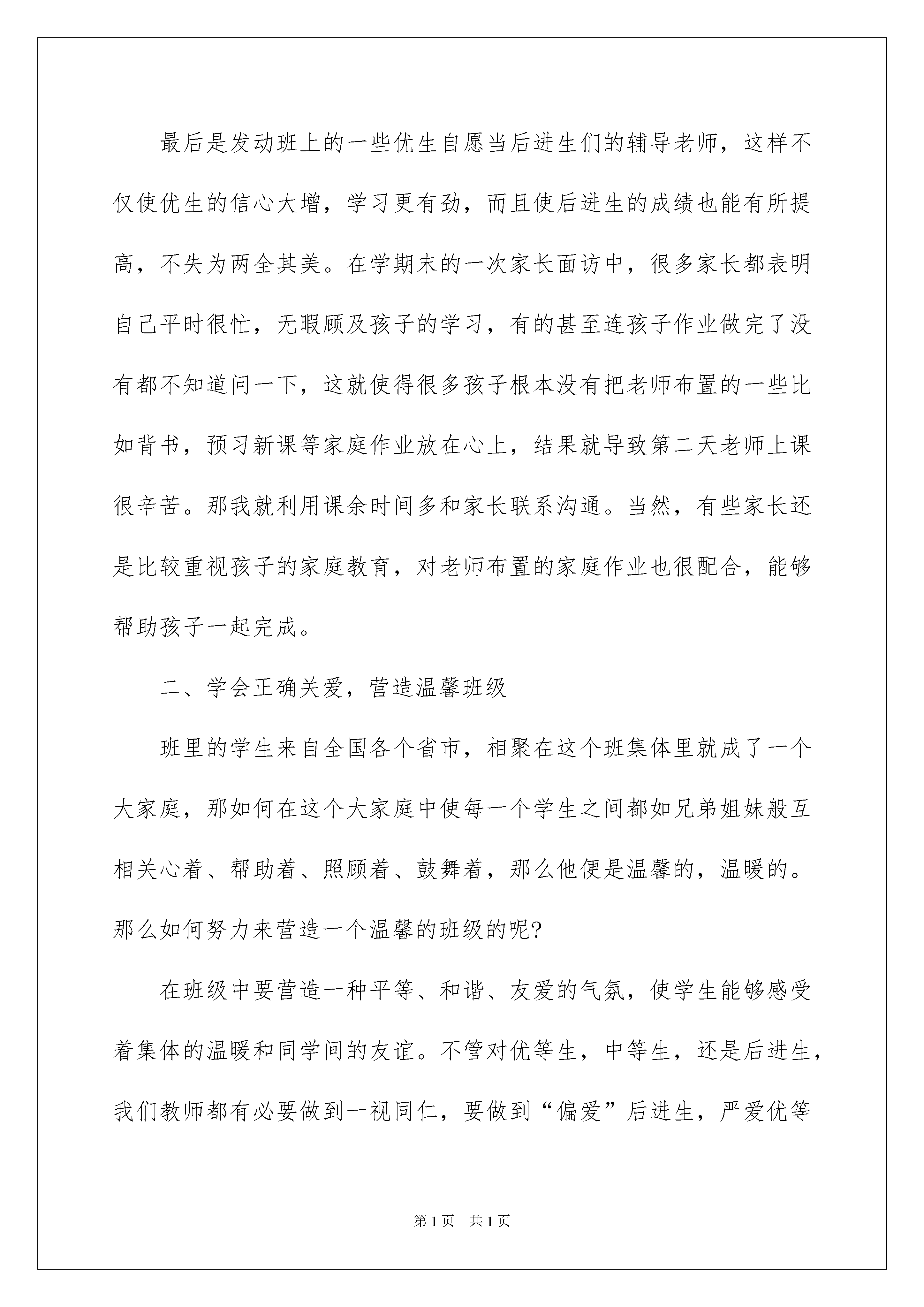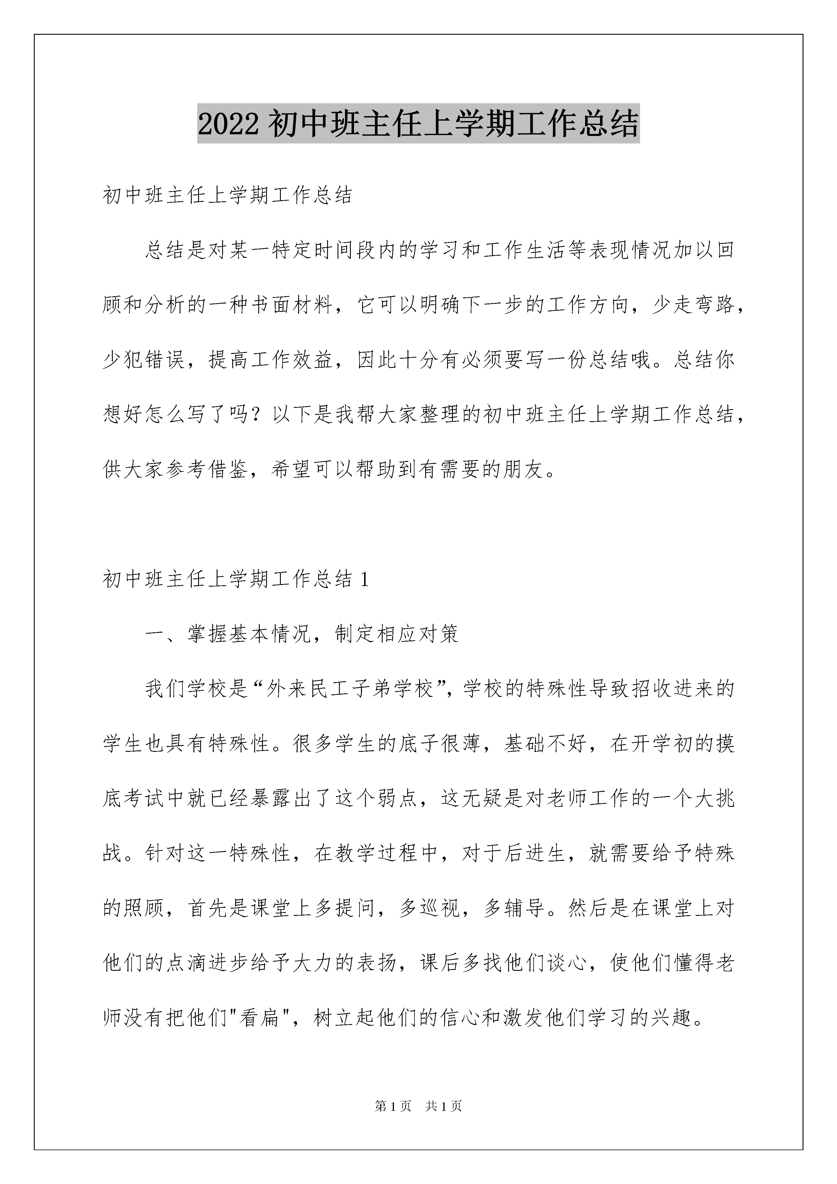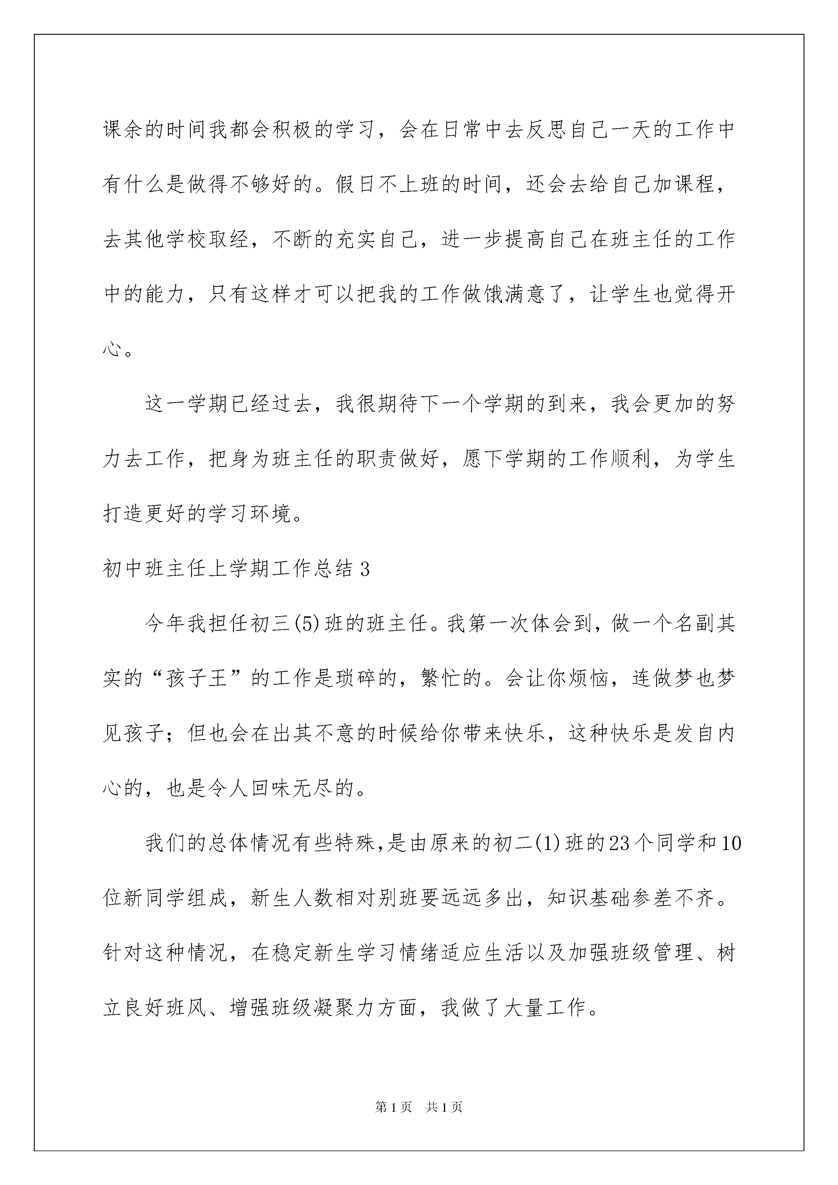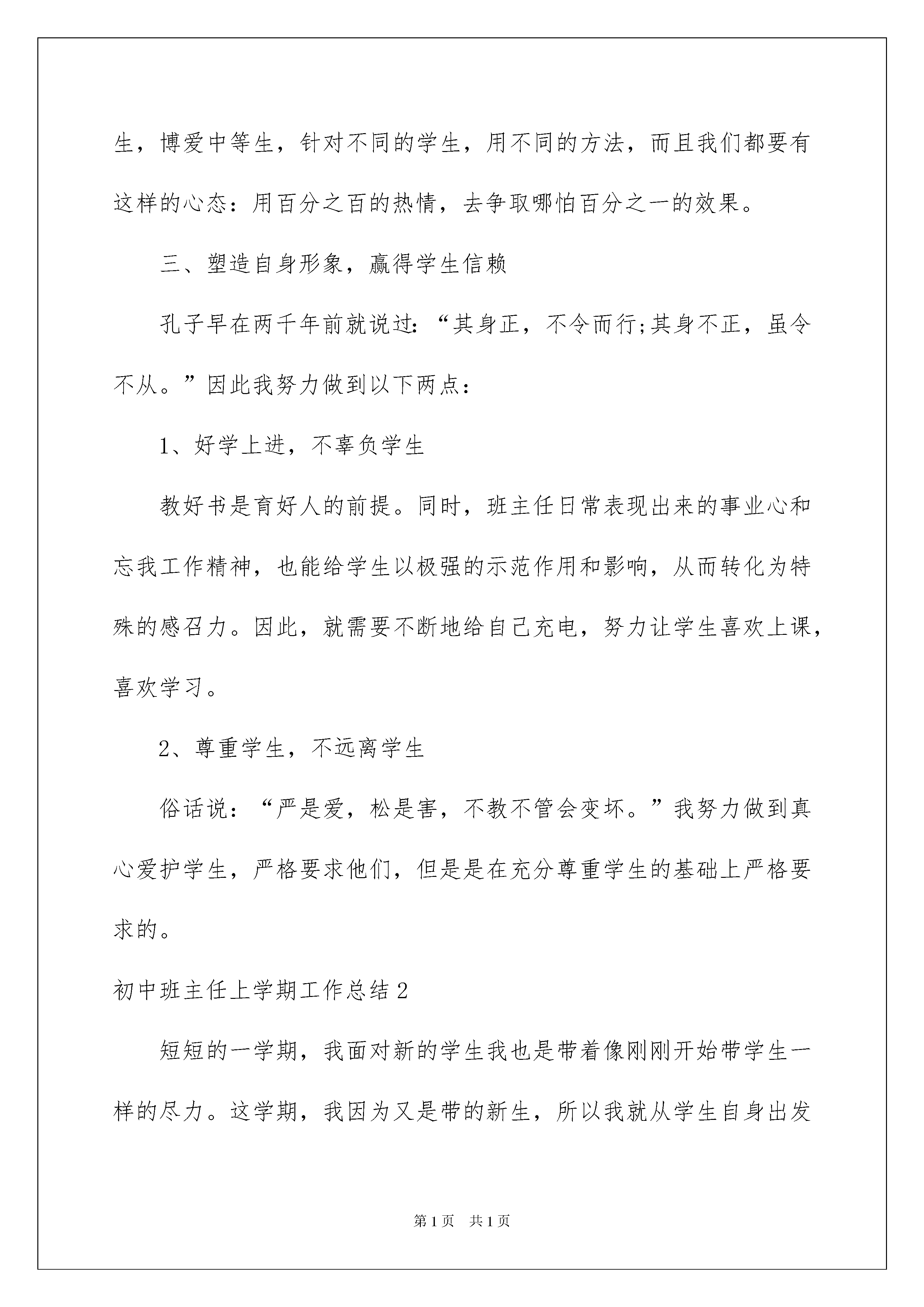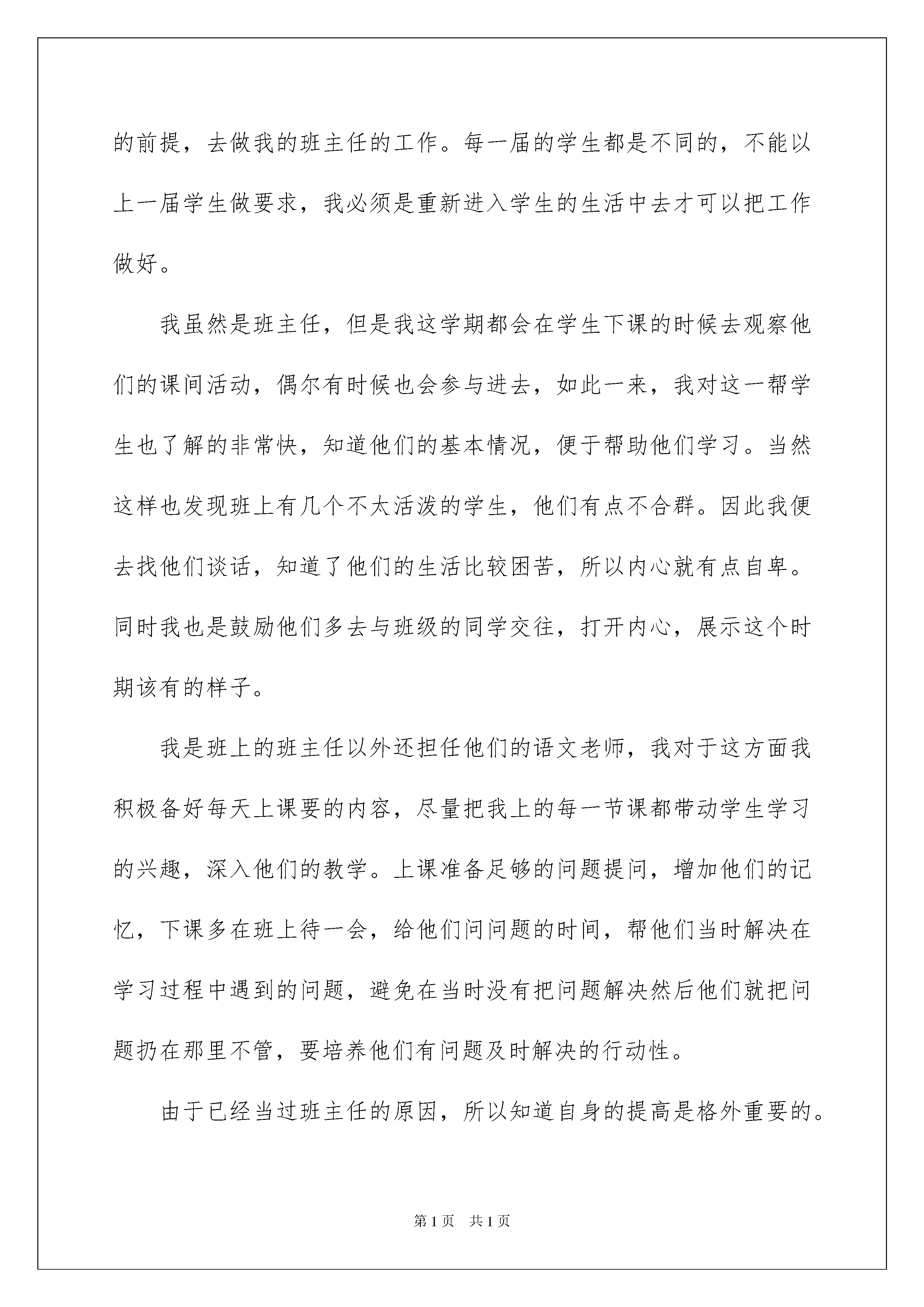 2022初中班主任上学期工作总结初中班主任上学期工作总结总结是对某一特定时间段内的学习和工作生活等表现情况加以回顾和分析的一种书面材料,它可以明确下一步的工作方向,少走弯路,少犯错误,提高工作效益,因此十分有必须要写一份总结哦。总结你想好怎么写了吗?以下是我帮大家整理的初中班主任上学期工作总结,供大家参考借鉴,希望可以帮助到有需要的朋友。初中班主任上学期工作总结1一、掌握基本情况,制定相应对策我们学校是“外来民工子弟学校”,学校的特殊性导致招收进来的学生也具有特殊性。很多学生的底子很薄,基础不好,在开学初的摸底考试中就已经暴露出了这个弱点,这无疑是对老师工作的一个大挑战。针对这一特殊性,在教学过程中,对于后进生,就需要给予特殊的照顾,首先是课堂上多提问,多巡视,多辅导。然后是在课堂上对他们的点滴进步给予大力的表扬,课后多找他们谈心,使他们懂得老师没有把他们"看扁",树立起他们的信心和激发他们学习的兴趣。最后是发动班上的一些优生自愿当后进生们的辅导老师,这样不仅使优生的信心大增,学习更有劲,而且使后进生的成绩也能有所提高,不失为两全其美。在学期末的一次家长面访中,很多家长都表明自己平时很忙,无暇顾及孩子的学习,有的甚至连孩子作业做完了没有都不知道问一下,这就使得很多孩子根本没有把老师布置的一些比如背书,预习新课等家庭作业放在心上,结果就导致第二天老师上课很辛苦。那我就利用课余时间多和家长联系沟通。当然,有些家长还是比较重视孩子的家庭教育,对老师布置的家庭作业也很配合,能够帮助孩子一起完成。二、学会正确关爱,营造温馨班级班里的学生来自全国各个省市,相聚在这个班集体里就成了一个大家庭,那如何在这个大家庭中使每一个学生之间都如兄弟姐妹般互相关心着、帮助着、照顾着、鼓舞着,那么他便是温馨的,温暖的。那么如何努力来营造一个温馨的班级的呢?在班级中要营造一种平等、和谐、友爱的气氛,使学生能够感受着集体的温暖和同学间的友谊。不管对优等生,中等生,还是后进生,我们教师都有必要做到一视同仁,要做到“偏爱”后进生,严爱优等生,博爱中等生,针对不同的学生,用不同的方法,而且我们都要有这样的心态:用百分之百的热情,去争取哪怕百分之一的效果。三、塑造自身形象,赢得学生信赖孔子早在两千年前就说过:“其身正,不令而行;其身不正,虽令不从。”因此我努力做到以下两点:1、好学上进,不辜负学生教好书是育好人的前提。同时,班主任日常表现出来的事业心和忘我工作精神,也能给学生以极强的示范作用和影响,从而转化为特殊的感召力。因此,就需要不断地给自己充电,努力让学生喜欢上课,喜欢学习。2、尊重学生,不远离学生俗话说:“严是爱,松是害,不教不管会变坏。”我努力做到真心爱护学生,严格要求他们,但是是在充分尊重学生的基础上严格要求的。初中班主任上学期工作总结2短短的一学期,我面对新的学生我也是带着像刚刚开始带学生一样的尽力。这学期,我因为又是带的新生,所以我就从学生自身出发的前提,去做我的班主任的工作。每一届的学生都是不同的,不能以上一届学生做要求,我必须是重新进入学生的生活中去才可以把工作做好。我虽然是班主任,但是我这学期都会在学生下课的时候去观察他们的课间活动,偶尔有时候也会参与进去,如此一来,我对这一帮学生也了解的非常快,知道他们的基本情况,便于帮助他们学习。当然这样也发现班上有几个不太活泼的学生,他们有点不合群。因此我便去找他们谈话,知道了他们的生活比较困苦,所以内心就有点自卑。同时我也是鼓励他们多去与班级的同学交往,打开内心,展示这个时期该有的样子。我是班上的班主任以外还担任他们的语文老师,我对于这方面我积极备好每天上课要的内容,尽量把我上的每一节课都带动学生学习的兴趣,深入他们的教学。上课准备足够的问题提问,增加他们的记忆,下课多在班上待一会,给他们问问题的时间,帮他们当时解决在学习过程中遇到的问题,避免在当时没有把问题解决然后他们就把问题扔在那里不管,要培养他们有问题及时解决的行动性。由于已经当过班主任的原因,所以知道自身的提高是格外重要的。课余的时间我都会积极的学习,会在日常中去反思自己一天的工作中有什么是做得不够好的。假日不上班的时间,还会去给自己加课程,去其他学校取经,不断的充实自己,进一步提高自己在班主任的工作中的能力,只有这样才可以把我的工作做饿满意了,让学生也觉得开心。这一学期已经过去,我很期待下一个学期的到来,我会更加的努力去工作,把身为班主任的职责做好,愿下学期的工作顺利,为学生打造更好的学习环境。初中班主任上学期工作总结3今年我担任初三(5)班的班主任。我第一次体会到,做一个名副其实的“孩子