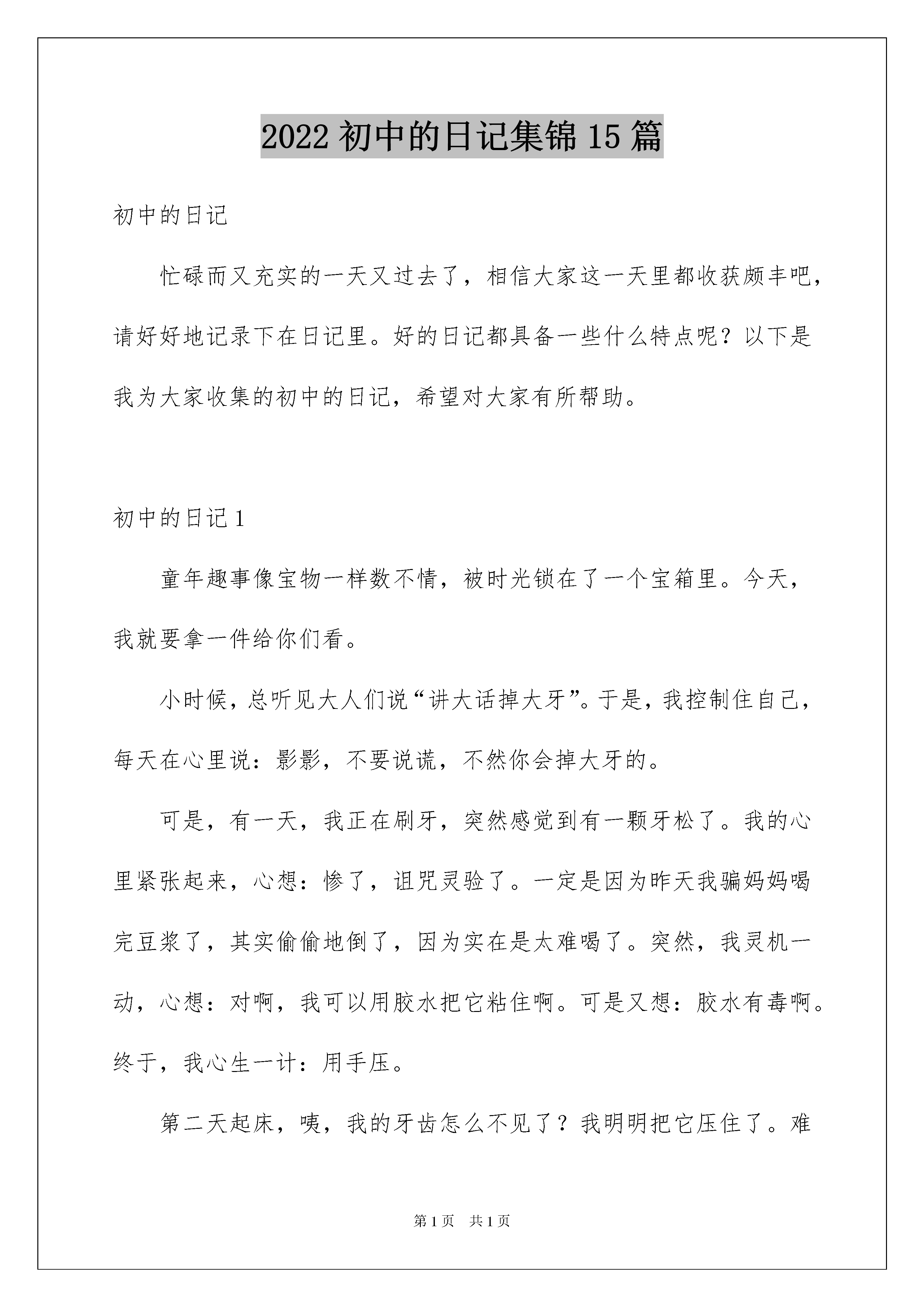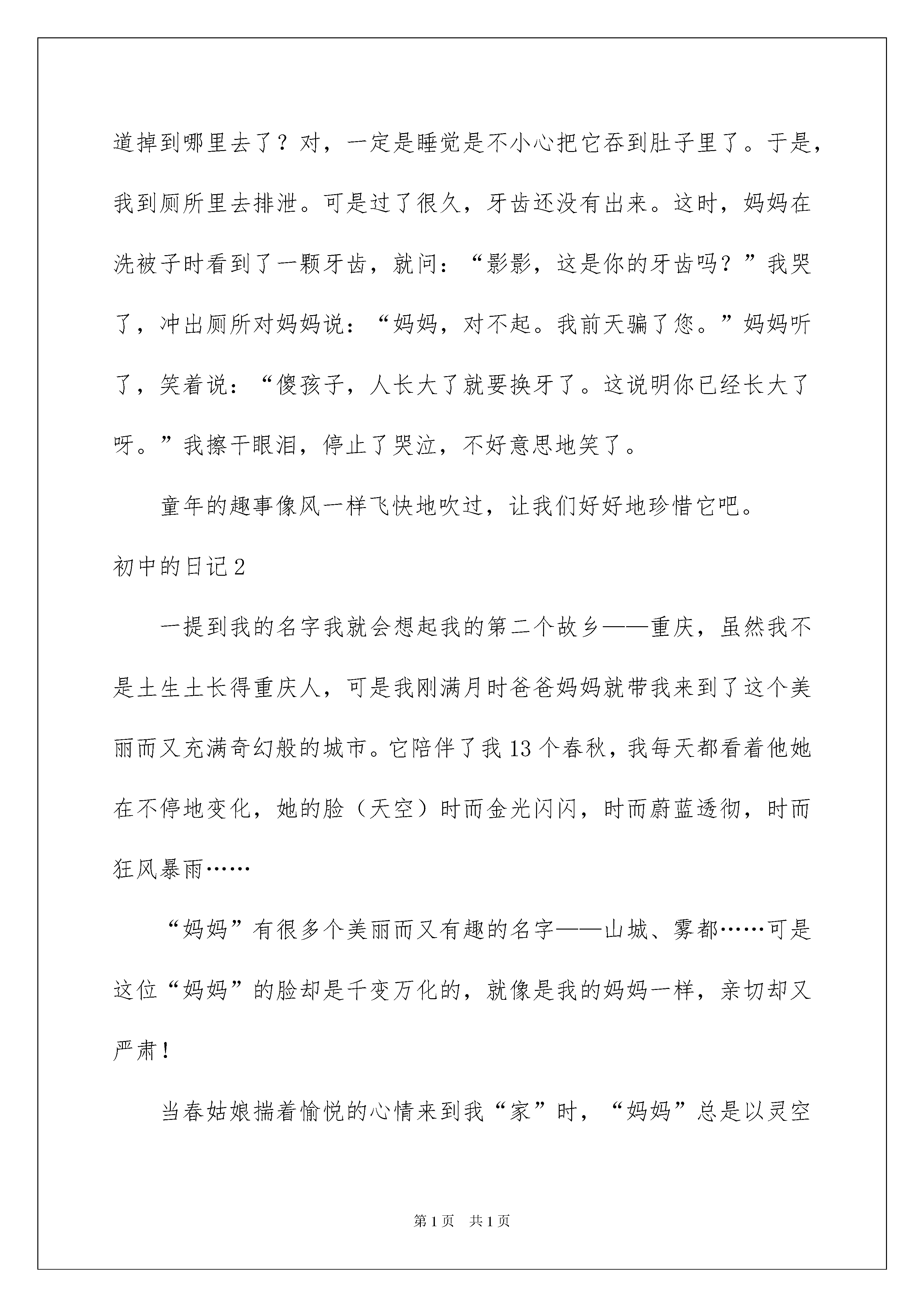 2022初中的日记集锦15篇初中的日记忙碌而又充实的一天又过去了,相信大家这一天里都收获颇丰吧,请好好地记录下在日记里。好的日记都具备一些什么特点呢?以下是我为大家收集的初中的日记,希望对大家有所帮助。初中的日记1童年趣事像宝物一样数不情,被时光锁在了一个宝箱里。今天,我就要拿一件给你们看。小时候,总听见大人们说“讲大话掉大牙”。于是,我控制住自己,每天在心里说:影影,不要说谎,不然你会掉大牙的。可是,有一天,我正在刷牙,突然感觉到有一颗牙松了。我的心里紧张起来,心想:惨了,诅咒灵验了。一定是因为昨天我骗妈妈喝完豆浆了,其实偷偷地倒了,因为实在是太难喝了。突然,我灵机一动,心想:对啊,我可以用胶水把它粘住啊。可是又想:胶水有毒啊。终于,我心生一计:用手压。第二天起床,咦,我的牙齿怎么不见了?我明明把它压住了。难道掉到哪里去了?对,一定是睡觉是不小心把它吞到肚子里了。于是,我到厕所里去排泄。可是过了很久,牙齿还没有出来。这时,妈妈在洗被子时看到了一颗牙齿,就问:“影影,这是你的牙齿吗?”我哭了,冲出厕所对妈妈说:“妈妈,对不起。我前天骗了您。”妈妈听了,笑着说:“傻孩子,人长大了就要换牙了。这说明你已经长大了呀。”我擦干眼泪,停止了哭泣,不好意思地笑了。童年的趣事像风一样飞快地吹过,让我们好好地珍惜它吧。初中的日记2一提到我的名字我就会想起我的第二个故乡——重庆,虽然我不是土生土长得重庆人,可是我刚满月时爸爸妈妈就带我来到了这个美丽而又充满奇幻般的城市。它陪伴了我13个春秋,我每天都看着他她在不停地变化,她的脸(天空)时而金光闪闪,时而蔚蓝透彻,时而狂风暴雨……“妈妈”有很多个美丽而又有趣的名字——山城、雾都……可是这位“妈妈”的脸却是千变万化的,就像是我的妈妈一样,亲切却又严肃!当春姑娘揣着愉悦的心情来到我“家”时,“妈妈”总是以灵空而不可捉摸的蔚蓝笑脸来迎接她。“妈妈”有时给他做五彩的棉花糖,有时给她轻轻的扇风,有时给她喝甜甜的野露。那是我总会有些不乐意,我就问他:“‘妈妈’,你为什么不给我们吃甜甜的野露呢?我们都好想尝尝呢?”这时啊,“妈妈”总会及时的给我们送来一些甜甜的野露给我们解解馋,当然春姑娘也不是无备而来的,她给“妈妈”披上了时髦的蓝衬衫,可是——绿宝宝们却又将“妈妈”蓝蓝的衣服染成了绿绿的披肩……初中的日记3今天是大年三十,俗称“除夕”。家家户户都贴上了火红的对联和一个大大的“福”字。还准备好了在吃团圆饭和除夕夜十二点整时放的鞭炮。大家都到齐了,“倒茶”这个光荣的而艰巨的任务交给了我。我忙得团团转,刚才还为接受这个任务高兴的我现在却有点想打退堂鼓了。看见大人们有的打牌,有的打麻将,还有的在看电视的样子,我心里就像有无数双小手在我的心上挠痒痒似的,难受极了。要吃团圆饭了,桌子上丰盛的美味忍不住让我馋涎三尺。我准备用手去偷一块尝尝,可是我犹豫了,生怕弄坏了大家对我新一年的印象。“啪,啪——”爸爸在放炮竹,在放炮竹的传统中,还有一个简短的小故事呢!传说在时候,有一个大怪兽,大家把它叫做“年”。“年”每年的年底都会去老百姓家中吃东西、搞破坏。后来大家知道它怕巨大的响声,于是大家在年底放起了大红炮竹,赶走了讨厌的“年”,后来的人们为了纪念这一天,把这一天叫做“过年”。这也是“过年”的故事。吃完饭后,大家围在火边烤火,看“春节文艺晚会”。一些大人把年糕烤熟了给孩子吃,据说,这样可以使吃年糕的孩子年年高升。刚起完年糕,饺子又出锅了,白白的、胖胖的,象一个个大大的白金元宝。吃了又可以不使耳朵不会被冻坏,还又香又软,好吃极了!不知不觉就到了十二点,放完炮竹后,大人们把准备好的红包给了孩子,据说把钱压在枕头下面,这一年就会有好财运。过年真是又热闹又高兴呀!初中的日记4今天我向大家介绍介绍我的旧同桌——冯子健飞先生,人称“不可思议先生”。不可思议先生没创造过奇迹,怎么能叫不可思议呢?当然,我们班的可是创了三个奇迹哩!奇迹一——初选录用:星期一下午,郑大要公布初选录用的名单啦!一切皆有可能,想不到的事情还是会发生的。当快报完时,郑大突然响亮的报出了“冯子健飞”,这时全班都惊讶不已。我们怎么也不会想到冯子健飞会在名单内,包括冯子健飞自己。奇迹二——新听写100分:初选录用的名单公布后,接着又发了新听写的试卷。我想老冯一向只考七八十分,这次也不例外吧!不看不知道,一看吓一跳,“啊!100分”我大叫了一声。我惊讶地望着冯子健飞,我又看了看自己的试卷“哎!只考了94”我失望地说。奇迹三——英语听写100分:这次听写虽然不难,但是100分的只有五六个同学。我本以为100分里面一定会有我,可是