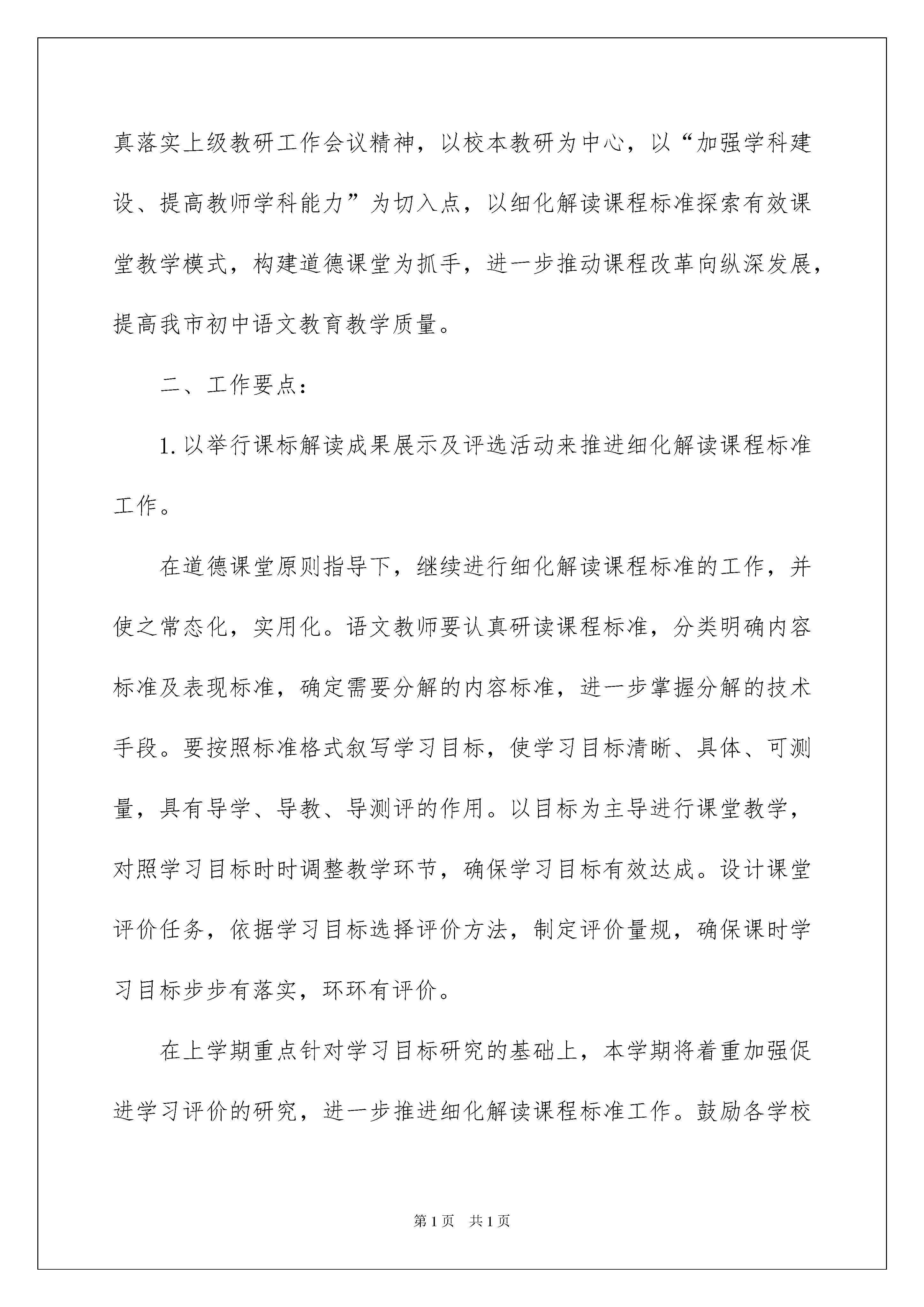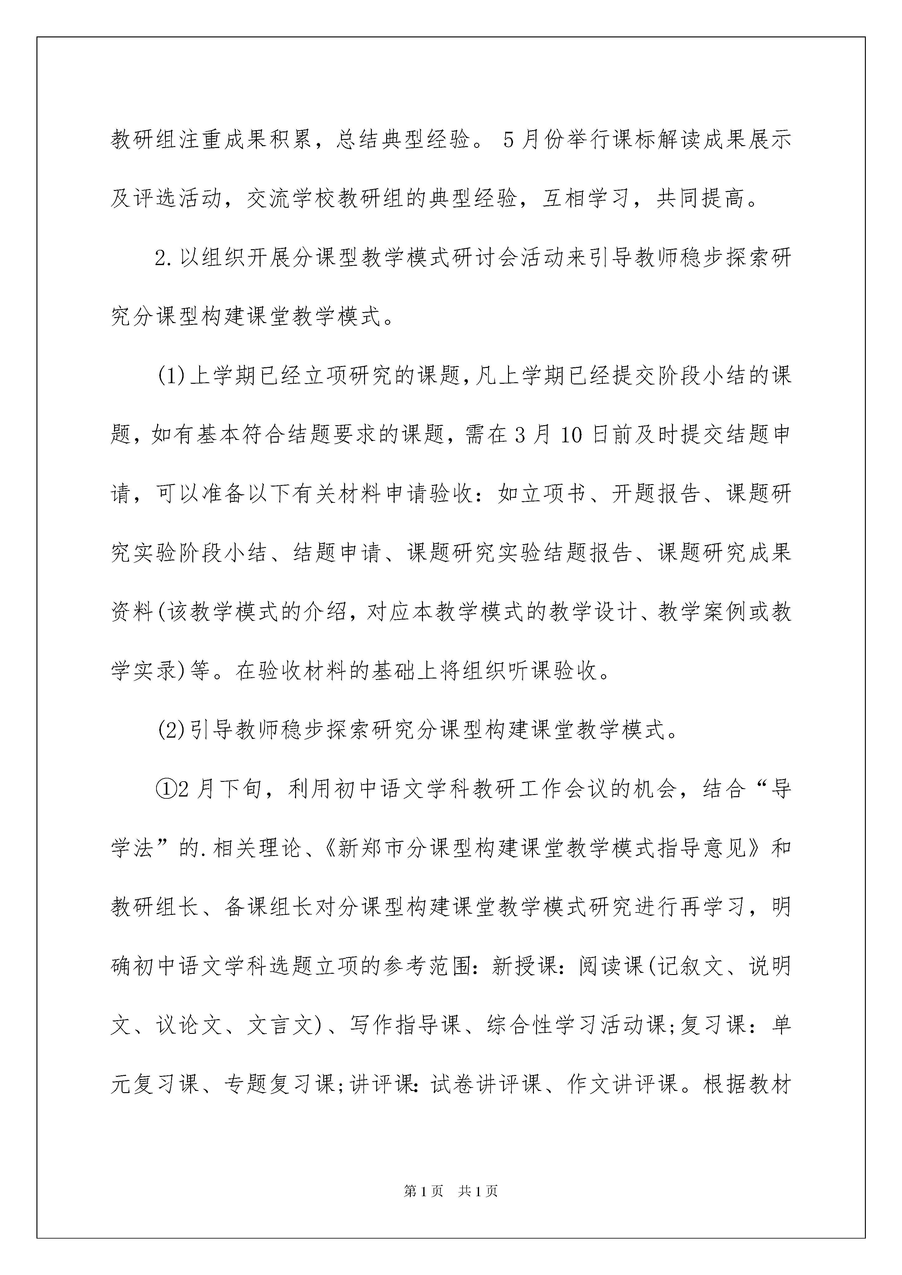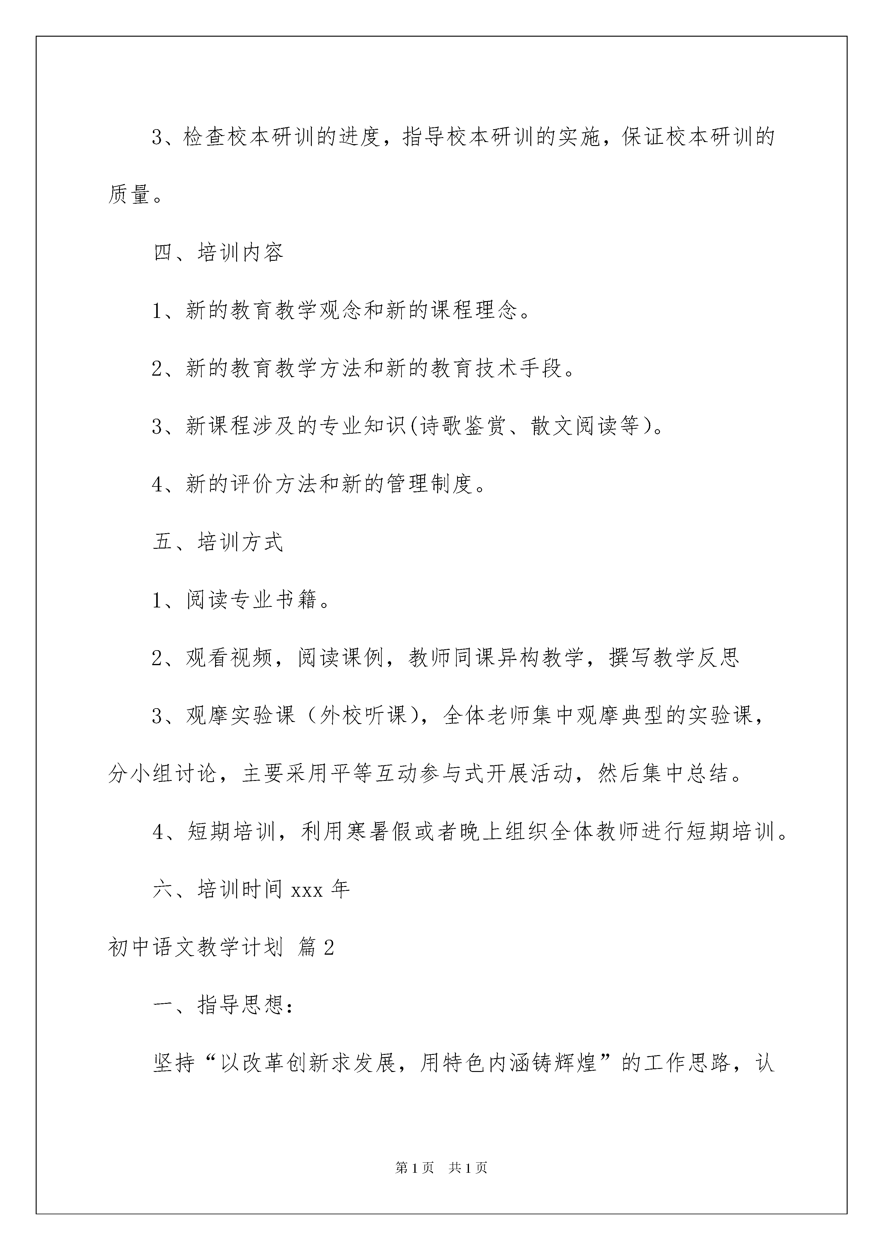 2022初中语文教学计划三篇初中语文教学计划三篇时间过得可真快,从来都不等人,我们的工作又将迎来新的进步,写好计划才不会让我们努力的时候迷失方向哦。可是到底什么样的计划才是适合自己的呢?以下是我帮大家整理的初中语文教学计划3篇,希望能够帮助到大家。初中语文教学计划篇1一、指导思想《课程方案(实验)》指出:“学校应建立以校为本的教学研究制度,鼓励教师针对教学实践中的问题开展教学研究,重视不同学科教师的交流与研讨,建设有利于引导教师创造性实施新课程的环境,使新课程的实施过程真正成为教师专业成长的过程。”我校将以普通初中新课程实施为契机,扎实有效地推行校本研训制度,把学校建构成学习型组织,促进教师专业化成长,走内涵式可持续发展的道路,建设新的校园文化。二、工作目标1、巩固教师爱岗敬业、热爱学生的高尚情操,形成良好的师德修养。2、养成严谨治学的工作作风,刻苦钻研业务,拓展专业知识、文化知识,形成合理的知识结构,适应普通初中新课程实施的需要。3、团结协作,在交流和分享中学习他人的长处,产生新的思想,达到新的认识,从而实现自我提高。4、牢固树立终身学习的理念,积极参加各级培训,不断更新教育理念,掌握新的教学、评价方法和新的教育技术手段。5、掌握普通初中新课程的课程体系,理解并掌握新课程标准,领会新课程的精神实质,增强实施新课程的自觉性和责任感。三、领导机构(一)校本研训领导小组组长:陈吴云副组长:林雪梅组员:姚兰、周文慧、吉志高、王有文、张少琼主要职责是:1、负责校本研训工作的组织、管理和实施。2、为校本研训提供课时、场所、设备、经费等条件;保障校本研训的正常开展。3、检查校本研训的进度,指导校本研训的实施,保证校本研训的质量。四、培训内容1、新的教育教学观念和新的课程理念。2、新的教育教学方法和新的教育技术手段。3、新课程涉及的专业知识(诗歌鉴赏、散文阅读等)。4、新的评价方法和新的管理制度。五、培训方式1、阅读专业书籍。2、观看视频,阅读课例,教师同课异构教学,撰写教学反思3、观摩实验课(外校听课),全体老师集中观摩典型的实验课,分小组讨论,主要采用平等互动参与式开展活动,然后集中总结。4、短期培训,利用寒暑假或者晚上组织全体教师进行短期培训。六、培训时间xxx年初中语文教学计划篇2一、指导思想:坚持“以改革创新求发展,用特色内涵铸辉煌”的工作思路,认真落实上级教研工作会议精神,以校本教研为中心,以“加强学科建设、提高教师学科能力”为切入点,以细化解读课程标准探索有效课堂教学模式,构建道德课堂为抓手,进一步推动课程改革向纵深发展,提高我市初中语文教育教学质量。二、工作要点:1.以举行课标解读成果展示及评选活动来推进细化解读课程标准工作。在道德课堂原则指导下,继续进行细化解读课程标准的工作,并使之常态化,实用化。语文教师要认真研读课程标准,分类明确内容标准及表现标准,确定需要分解的内容标准,进一步掌握分解的技术手段。要按照标准格式叙写学习目标,使学习目标清晰、具体、可测量,具有导学、导教、导测评的作用。以目标为主导进行课堂教学,对照学习目标时时调整教学环节,确保学习目标有效达成。设计课堂评价任务,依据学习目标选择评价方法,制定评价量规,确保课时学习目标步步有落实,环环有评价。在上学期重点针对学习目标研究的基础上,本学期将着重加强促进学习评价的研究,进一步推进细化解读课程标准工作。鼓励各学校教研组注重成果积累,总结典型经验。5月份举行课标解读成果展示及评选活动,交流学校教研组的典型经验,互相学习,共同提高。2.以组织开展分课型教学模式研讨会活动来引导教师稳步探索研究分课型构建课堂教学模式。(1)上学期已经立项研究的课题,凡上学期已经提交阶段小结的课题,如有基本符合结题要求的课题,需在3月10日前及时提交结题申请,可以准备以下有关材料申请验收:如立项书、开题报告、课题研究实验阶段小结、结题申请、课题研究实验结题报告、课题研究成果资料(该教学模式的介绍,对应本教学模式的教学设计、教学案例或教学实录)等。在验收材料的基础上将组织听课验收。(2)引导教师稳步探索研究分课型构建课堂教学模式。①2月下旬,利用初中语文学科教研工作会议的机会,结合“导学法”的.相关理论、《新郑市分课型构建课堂教学模式指导意见》和教研组长、备课组长对分课型构建课堂教学模式研究进行再学习,明确初中语文学科选题立项的参考范围:新授课:阅读课(记叙文、说明文、议论文、文言文)、写作指导课、综合性学习活动课;复习课:单元复习课、专题复习课;讲评课:试卷讲评课、作文讲评课。根据教材编排特点,记叙文阅读课可由七年级教师来重点研究