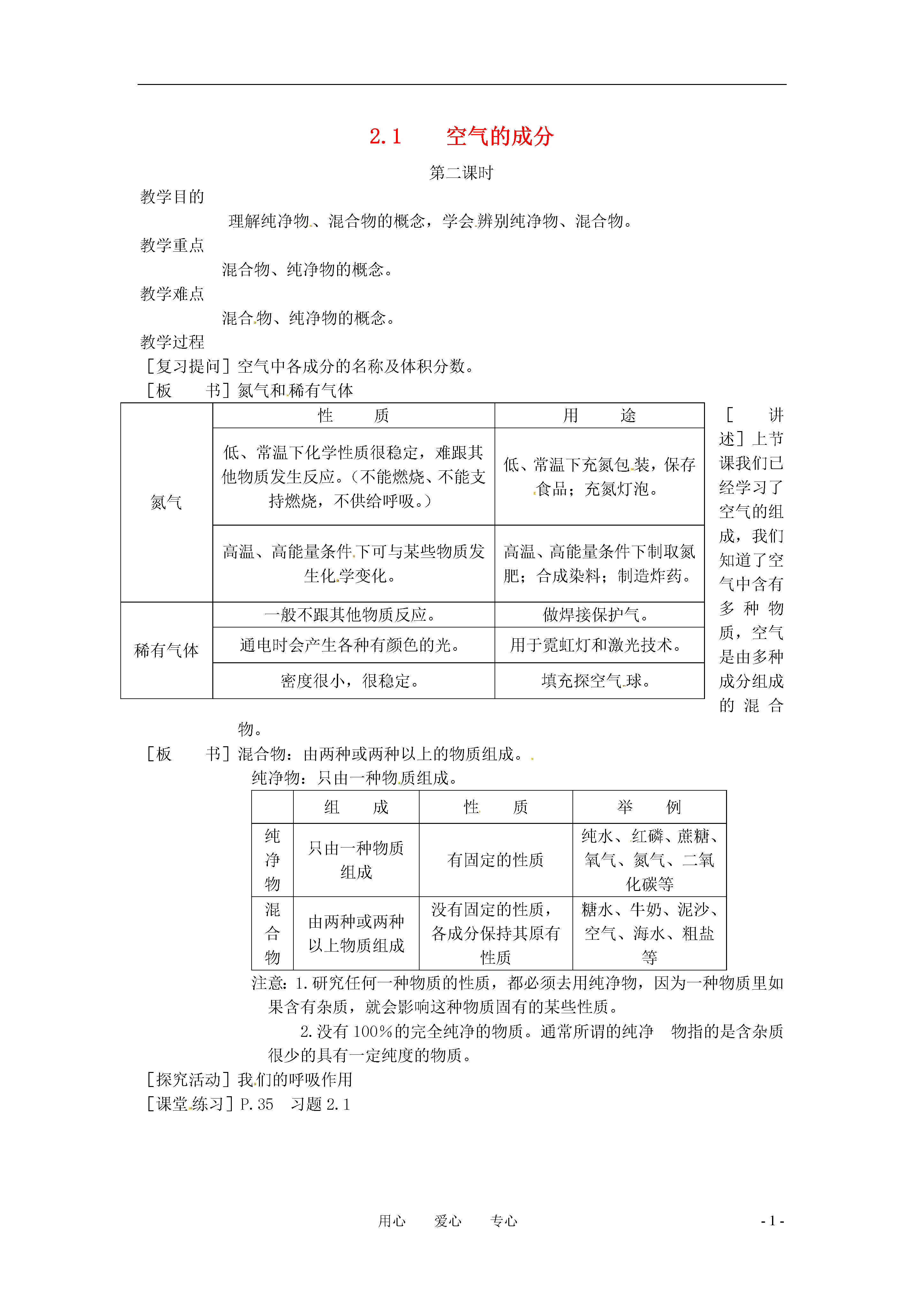 -1-用心爱心专心2.1空气的成分第二课时教学目的理解纯净物、混合物的概念,学会辨别纯净物、混合物。教学重点混合物、纯净物的概念。教学难点混合物、纯净物的概念。教学过程[复习提问]空气中各成分的名称及体积分数。[板书]氮气和稀有气体氮气性质用途低、常温下化学性质很稳定,难跟其他物质发生反应。(不能燃烧、不能支持燃烧,不供给呼吸。)低、常温下充氮包装,保存食品;充氮灯泡。高温、高能量条件下可与某些物质发生化学变化。高温、高能量条件下制取氮肥;合成染料;制造炸药。稀有气体一般不跟其他物质反应。做焊接保护气。通电时会产生各种有颜色的光。用于霓虹灯和激光技术。密度很小,很稳定。填充探空气球。[讲述]上节课我们已经学习了空气的组成,我们知道了空气中含有多种物质,空气是由多种成分组成的混合物。[板书]混合物:由两种或两种以上的物质组成。纯净物:只由一种物质组成。组成性质举例纯净物只由一种物质组成有固定的性质纯水、红磷、蔗糖、氧气、氮气、二氧化碳等混合物由两种或两种以上物质组成没有固定的性质,各成分保持其原有性质糖水、牛奶、泥沙、空气、海水、粗盐等注意:1.研究任何一种物质的性质,都必须去用纯净物,因为一种物质里如果含有杂质,就会影响这种物质固有的某些性质。2.没有100%的完全纯净的物质。通常所谓的纯净物指的是含杂质很少的具有一定纯度的物质。[探究活动]我们的呼吸作用[课堂练习]P.35习题2.1