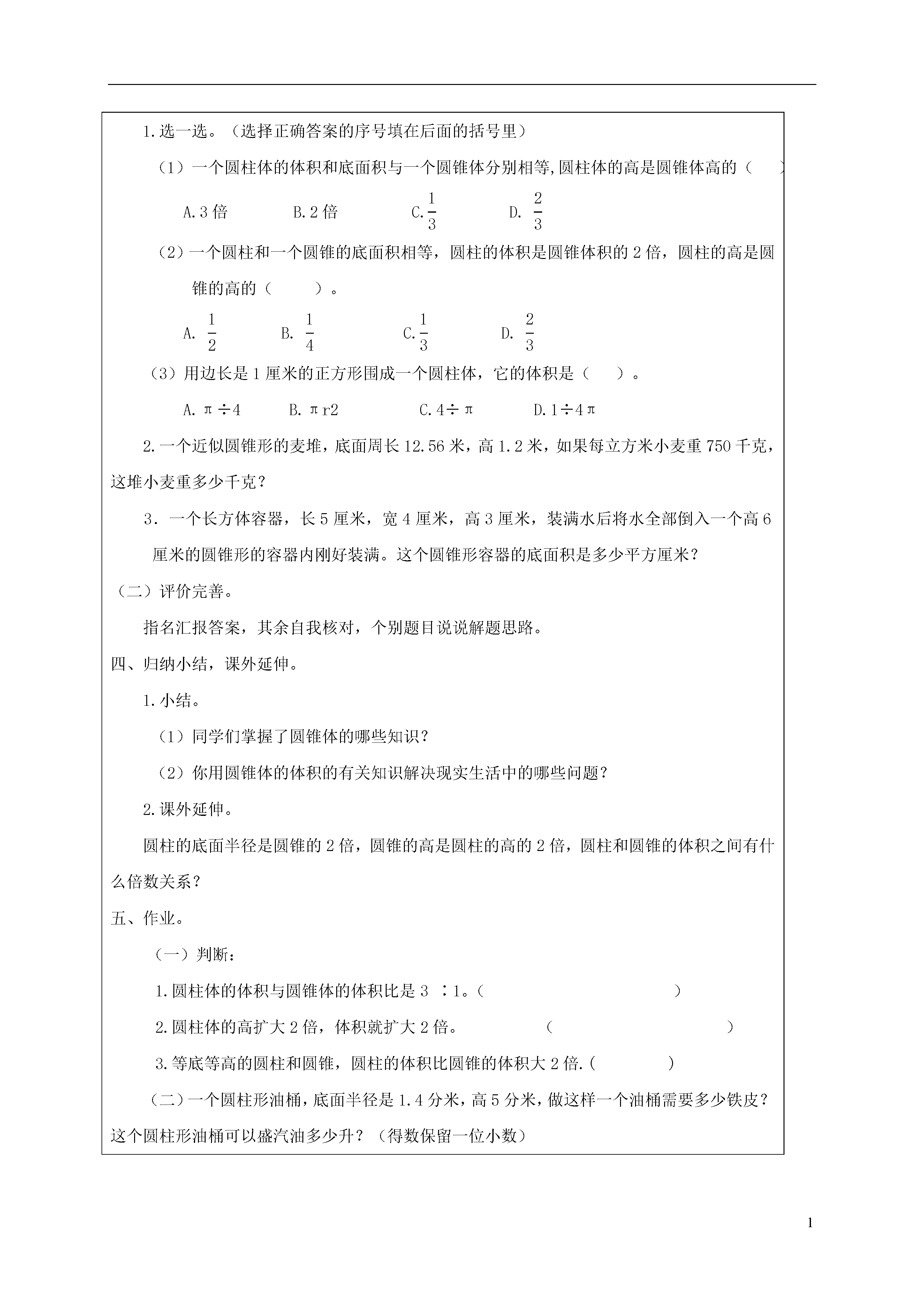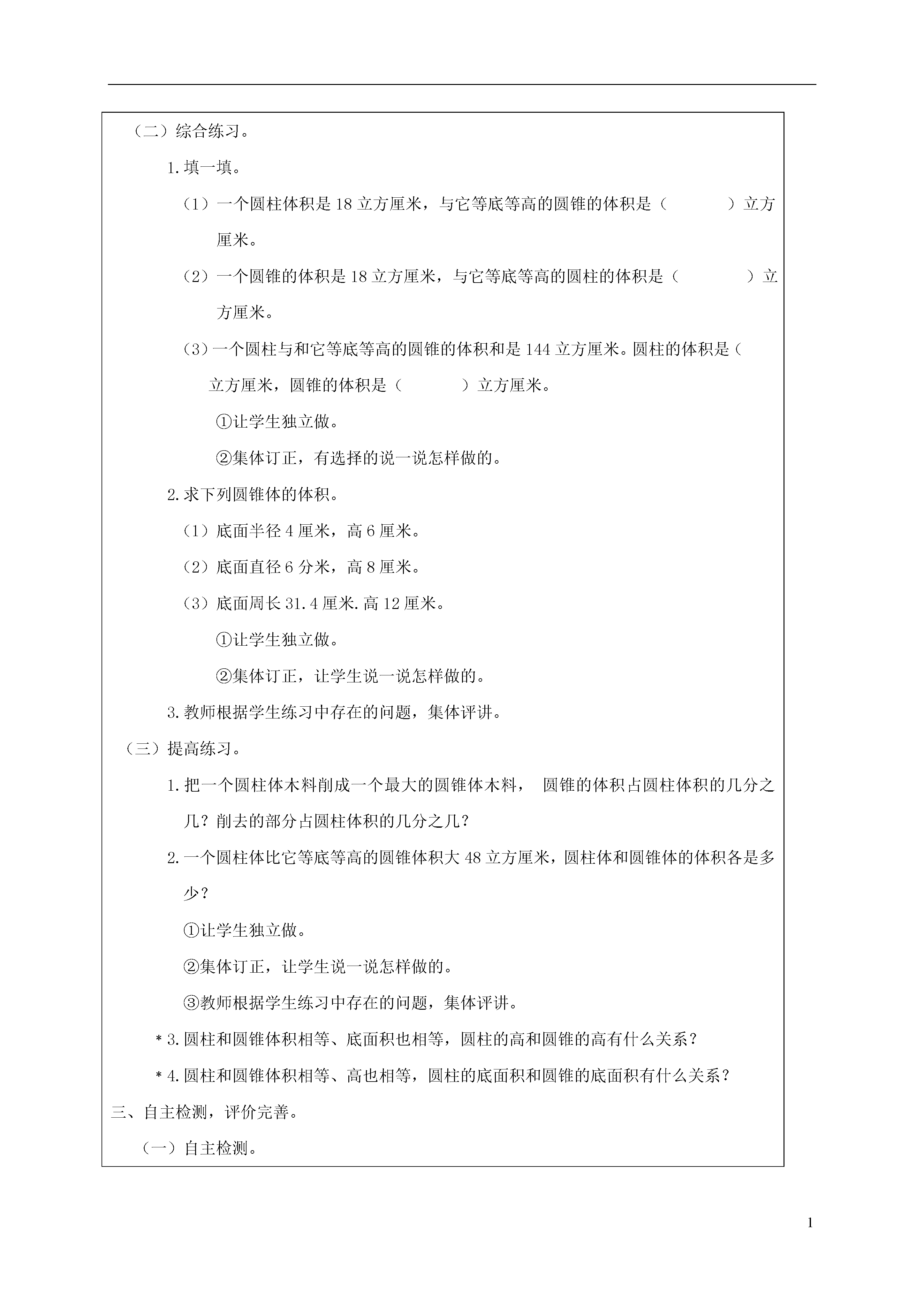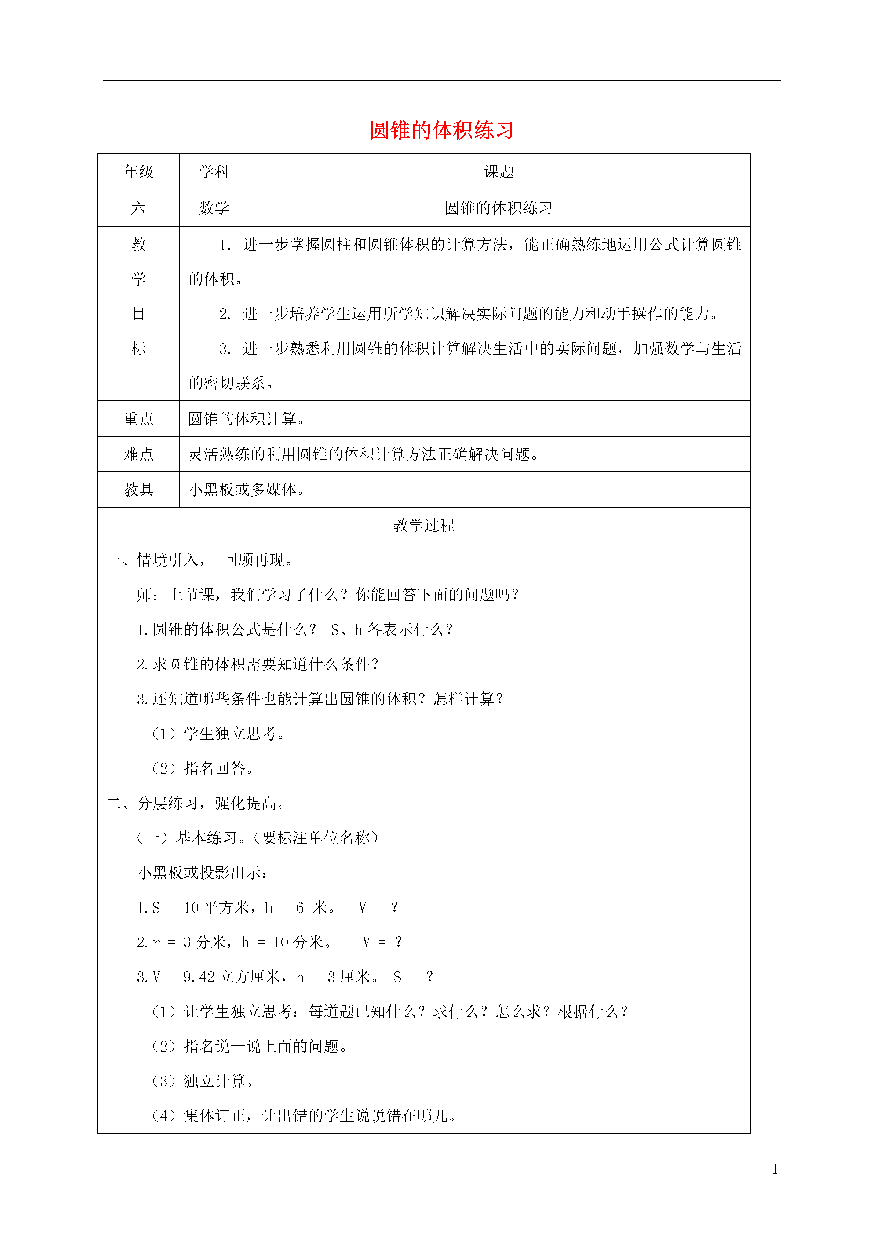 1圆锥的体积练习年级学科课题六数学圆锥的体积练习教学目标1.进一步掌握圆柱和圆锥体积的计算方法,能正确熟练地运用公式计算圆锥的体积。2.进一步培养学生运用所学知识解决实际问题的能力和动手操作的能力。3.进一步熟悉利用圆锥的体积计算解决生活中的实际问题,加强数学与生活的密切联系。重点圆锥的体积计算。难点灵活熟练的利用圆锥的体积计算方法正确解决问题。教具小黑板或多媒体。教学过程一、情境引入,回顾再现。师:上节课,我们学习了什么?你能回答下面的问题吗?1.圆锥的体积公式是什么?S、h各表示什么?2.求圆锥的体积需要知道什么条件?3.还知道哪些条件也能计算出圆锥的体积?怎样计算?(1)学生独立思考。(2)指名回答。二、分层练习,强化提高。(一)基本练习。(要标注单位名称)小黑板或投影出示:1.S=10平方米,h=6米。V=?2.r=3分米,h=10分米。V=?3.V=9.42立方厘米,h=3厘米。S=?(1)让学生独立思考:每道题已知什么?求什么?怎么求?根据什么?(2)指名说一说上面的问题。(3)独立计算。(4)集体订正,让出错的学生说说错在哪儿。(二)综合练习。1.填一填。(1)一个圆柱体积是18立方厘米,与它等底等高的圆锥的体积是()立方厘米。(2)一个圆锥的体积是18立方厘米,与它等底等高的圆柱的体积是()立方厘米。(3)一个圆柱与和它等底等高的圆锥的体积和是144立方厘米。圆柱的体积是()立方厘米,圆锥的体积是()立方厘米。①让学生独立做。②集体订正,有选择的说一说怎样做的。2.求下列圆锥体的体积。(1)底面半径4厘米,高6厘米。(2)底面直径6分米,高8厘米。(3)底面周长31.4厘米.高12厘米。①让学生独立做。②集体订正,让学生说一说怎样做的。3.教师根据学生练习中存在的问题,集体评讲。(三)提高练习。1.把一个圆柱体木料削成一个最大的圆锥体木料,圆锥的体积占圆柱体积的几分之几?削去的部分占圆柱体积的几分之几?2.一个圆柱体比它等底等高的圆锥体积大48立方厘米,圆柱体和圆锥体的体积各是多少?①让学生独立做。②集体订正,让学生说一说怎样做的。③教师根据学生练习中存在的问题,集体评讲。﹡3.圆柱和圆锥体积相等、底面积也相等,圆柱的高和圆锥的高有什么关系?﹡4.圆柱和圆锥体积相等、高也相等,圆柱的底面积和圆锥的底面积有什么关系?三、自主检测,评价完善。(一)自主检测。1.选一选。(选择正确答案的序号填在后面的括号里)(1)一个圆柱体的体积和底面积与一个圆锥体分别相等,圆柱体的高是圆锥体高的()A.3倍B.2倍C.EQ\F(1,3)D.EQ\F(2,3)(2)一个圆柱和一个圆锥的底面积相等,圆柱的体积是圆锥体积的2倍,圆柱的高是圆锥的高的()。A.EQ\F(1,2)B.EQ\F(1,4)C.EQ\F(1,3)D.EQ\F(2,3)(3)用边长是1厘米的正方形围成一个圆柱体,它的体积是()。A.π÷4B.πr2C.4÷πD.1÷4π2.一个近似圆锥形的麦堆,底面周长12.56米,高1.2米,如果每立方米小麦重750千克,这堆小麦重多少千克?3.一个长方体容器,长5厘米,宽4厘米,高3厘米,装满水后将水全部倒入一个高6厘米的圆锥形的容器内刚好装满。这个圆锥形容器的底面积是多少平方厘米?(二)评价完善。指名汇报答案,其余自我核对,个别题目说说解题思路。四、归纳小结,课外延伸。1.小结。(1)同学们掌握了圆锥体的哪些知识?(2)你用圆锥体的体积的有关知识解决现实生活中的哪些问题?2.课外延伸。圆柱的底面半径是圆锥的2倍,圆锥的高是圆柱的高的2倍,圆柱和圆锥的体积之间有什么倍数关系?五、作业。(一)判断:1.圆柱体的体积与圆锥体的体积比是3∶1。()2.圆柱体的高扩大2倍,体积就扩大2倍。()3.等底等高的圆柱和圆锥,圆柱的体积比圆锥的体积大2倍.()(二)一个圆柱形油桶,底面半径是1.4分米,高5分米,做这样一个油桶需要多少铁皮?这个圆柱形油桶可以盛汽油多少升?(得数保留一位小数)