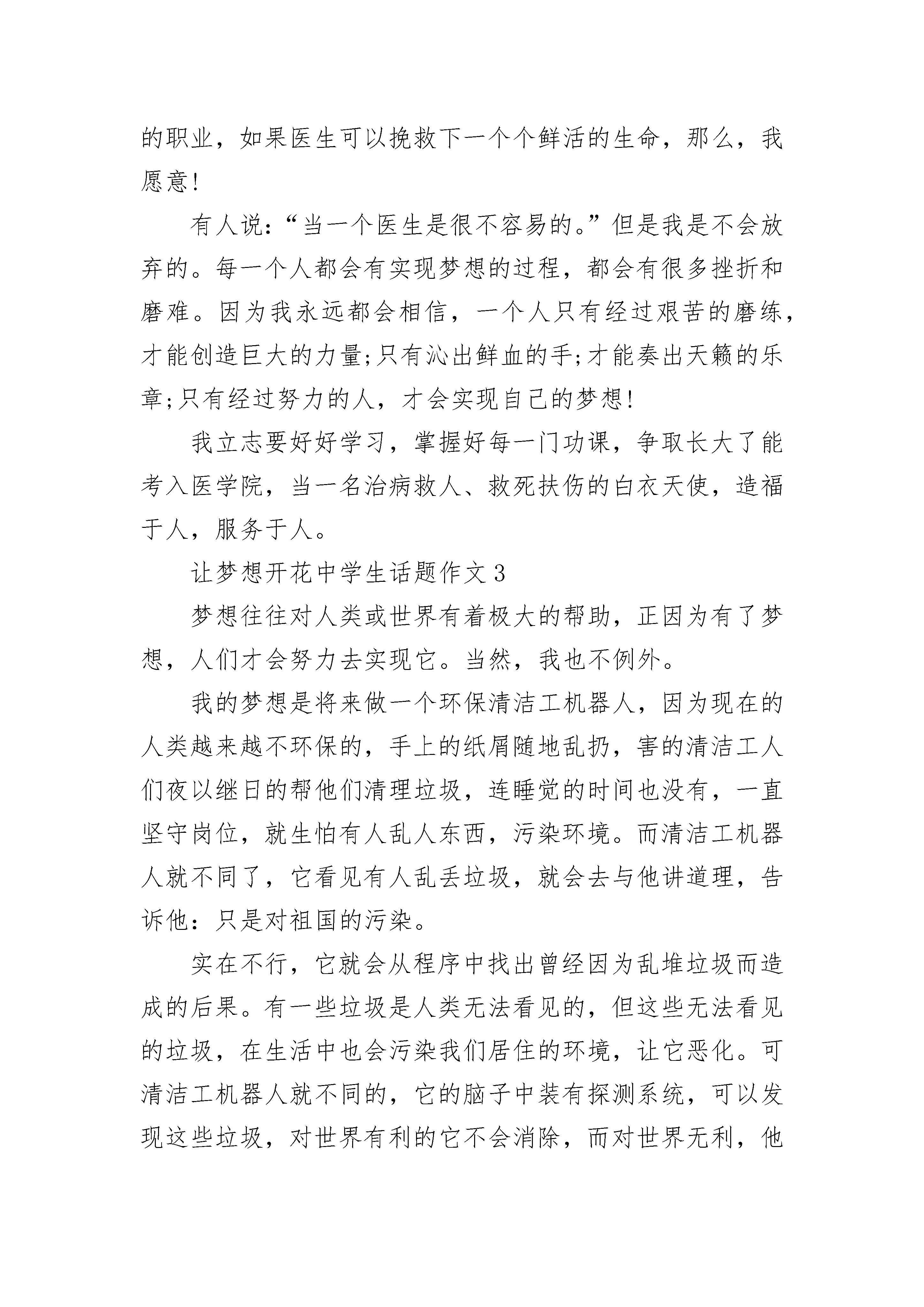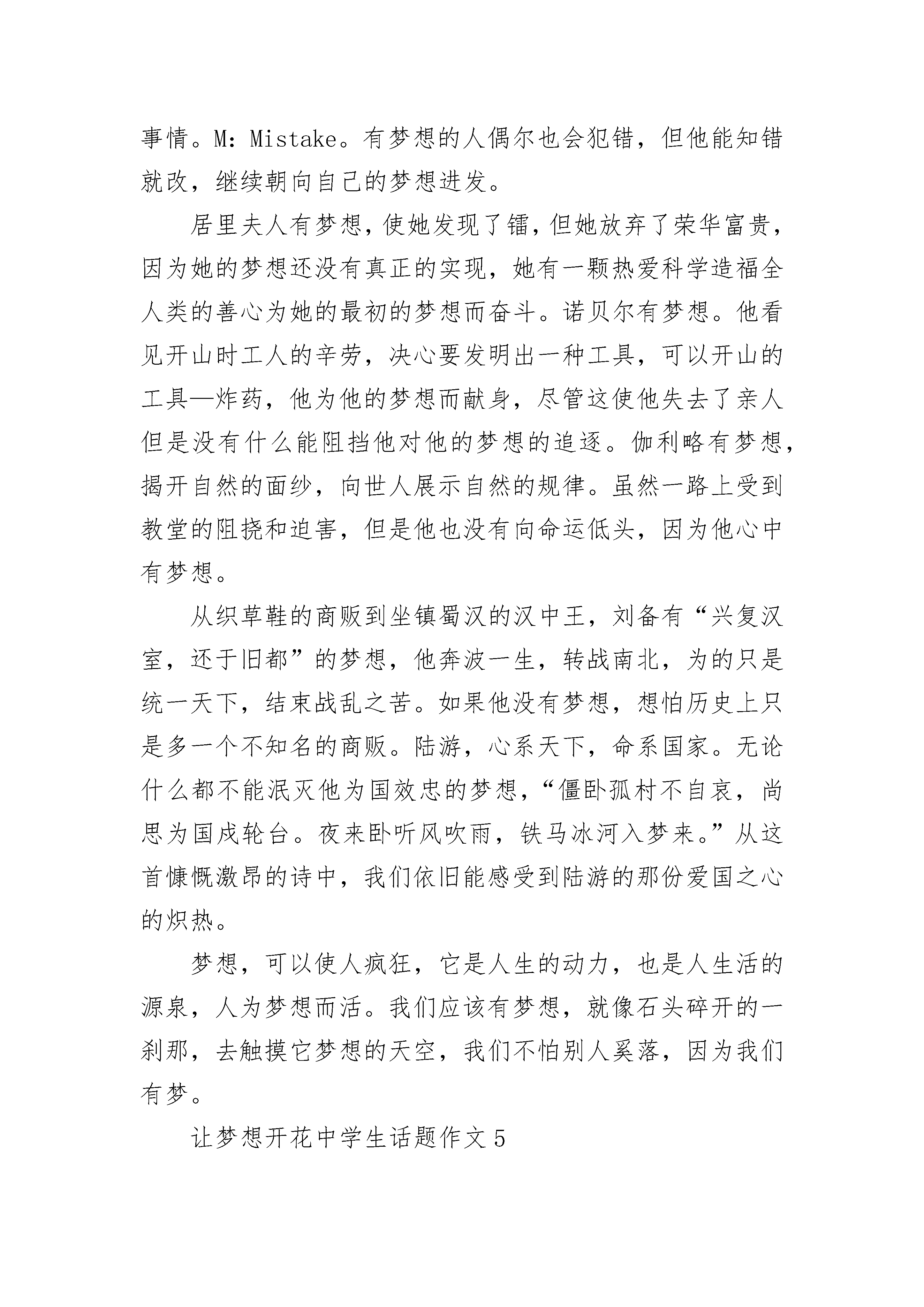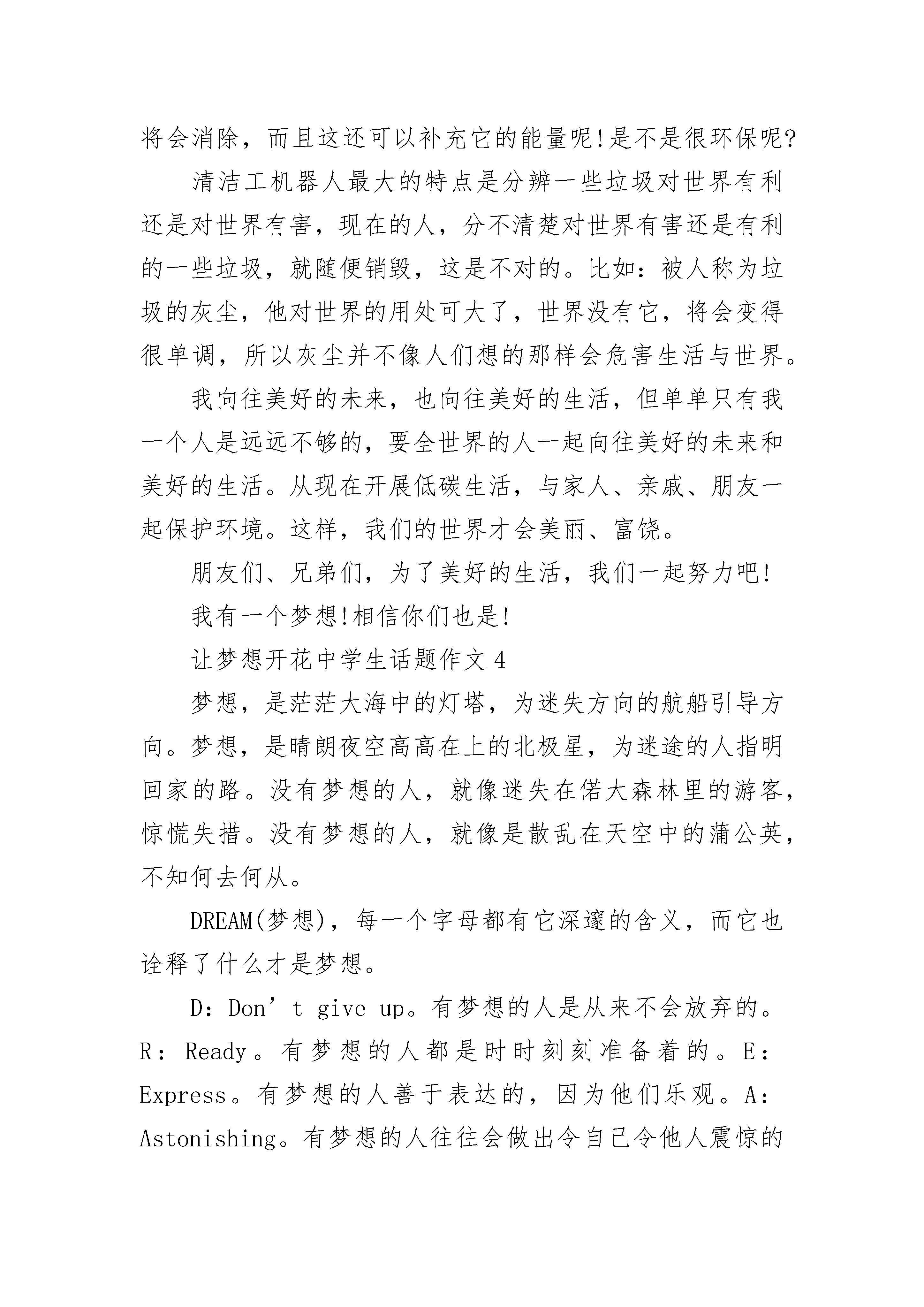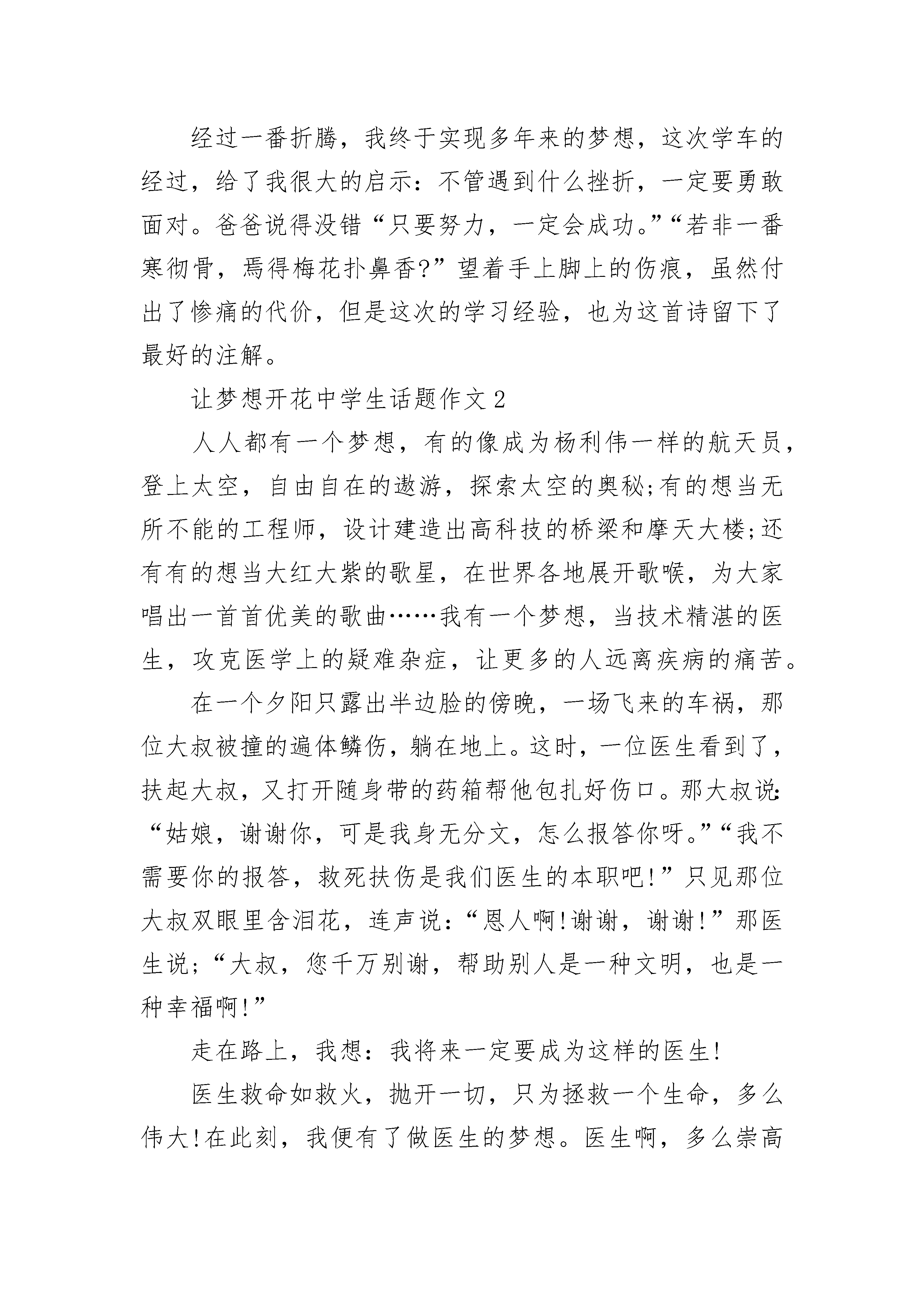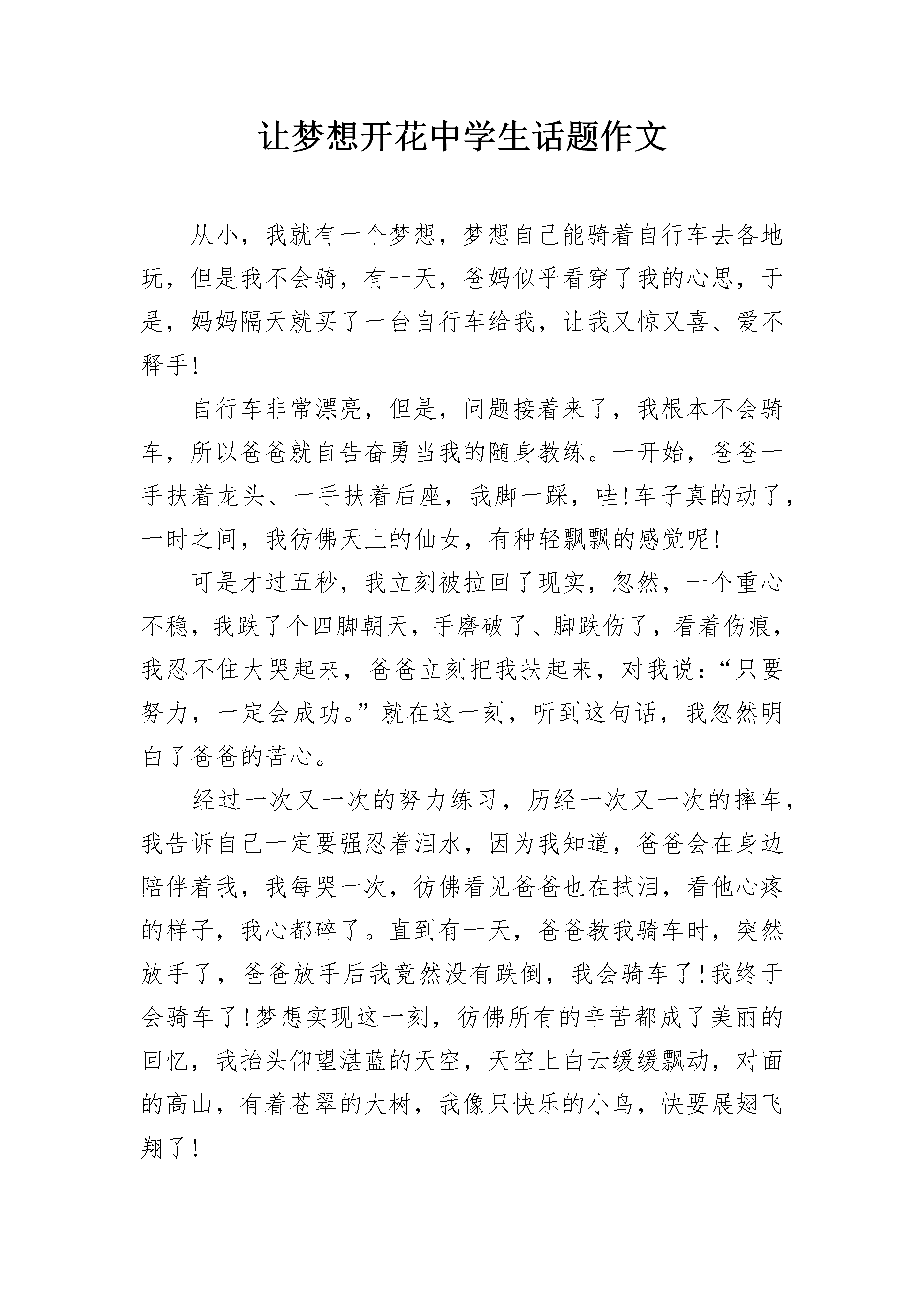 让梦想开花中学生话题作文从小,我就有一个梦想,梦想自己能骑着自行车去各地玩,但是我不会骑,有一天,爸妈似乎看穿了我的心思,于是,妈妈隔天就买了一台自行车给我,让我又惊又喜、爱不释手!自行车非常漂亮,但是,问题接着来了,我根本不会骑车,所以爸爸就自告奋勇当我的随身教练。一开始,爸爸一手扶着龙头、一手扶着后座,我脚一踩,哇!车子真的动了,一时之间,我彷佛天上的仙女,有种轻飘飘的感觉呢!可是才过五秒,我立刻被拉回了现实,忽然,一个重心不稳,我跌了个四脚朝天,手磨破了、脚跌伤了,看着伤痕,我忍不住大哭起来,爸爸立刻把我扶起来,对我说:“只要努力,一定会成功。”就在这一刻,听到这句话,我忽然明白了爸爸的苦心。经过一次又一次的努力练习,历经一次又一次的摔车,我告诉自己一定要强忍着泪水,因为我知道,爸爸会在身边陪伴着我,我每哭一次,彷佛看见爸爸也在拭泪,看他心疼的样子,我心都碎了。直到有一天,爸爸教我骑车时,突然放手了,爸爸放手后我竟然没有跌倒,我会骑车了!我终于会骑车了!梦想实现这一刻,彷佛所有的辛苦都成了美丽的回忆,我抬头仰望湛蓝的天空,天空上白云缓缓飘动,对面的高山,有着苍翠的大树,我像只快乐的小鸟,快要展翅飞翔了!经过一番折腾,我终于实现多年来的梦想,这次学车的经过,给了我很大的启示:不管遇到什么挫折,一定要勇敢面对。爸爸说得没错“只要努力,一定会成功。”“若非一番寒彻骨,焉得梅花扑鼻香?”望着手上脚上的伤痕,虽然付出了惨痛的代价,但是这次的学习经验,也为这首诗留下了最好的注解。让梦想开花中学生话题作文2人人都有一个梦想,有的像成为杨利伟一样的航天员,登上太空,自由自在的遨游,探索太空的奥秘;有的想当无所不能的工程师,设计建造出高科技的桥梁和摩天大楼;还有有的想当大红大紫的歌星,在世界各地展开歌喉,为大家唱出一首首优美的歌曲……我有一个梦想,当技术精湛的医生,攻克医学上的疑难杂症,让更多的人远离疾病的痛苦。在一个夕阳只露出半边脸的傍晚,一场飞来的车祸,那位大叔被撞的遍体鳞伤,躺在地上。这时,一位医生看到了,扶起大叔,又打开随身带的药箱帮他包扎好伤口。那大叔说:“姑娘,谢谢你,可是我身无分文,怎么报答你呀。”“我不需要你的报答,救死扶伤是我们医生的本职吧!”只见那位大叔双眼里含泪花,连声说:“恩人啊!谢谢,谢谢!”那医生说;“大叔,您千万别谢,帮助别人是一种文明,也是一种幸福啊!”走在路上,我想:我将来一定要成为这样的医生!医生救命如救火,抛开一切,只为拯救一个生命,多么伟大!在此刻,我便有了做医生的梦想。医生啊,多么崇高的职业,如果医生可以挽救下一个个鲜活的生命,那么,我愿意!有人说:“当一个医生是很不容易的。”但是我是不会放弃的。每一个人都会有实现梦想的过程,都会有很多挫折和磨难。因为我永远都会相信,一个人只有经过艰苦的磨练,才能创造巨大的力量;只有沁出鲜血的手;才能奏出天籁的乐章;只有经过努力的人,才会实现自己的梦想!我立志要好好学习,掌握好每一门功课,争取长大了能考入医学院,当一名治病救人、救死扶伤的白衣天使,造福于人,服务于人。让梦想开花中学生话题作文3梦想往往对人类或世界有着极大的帮助,正因为有了梦想,人们才会努力去实现它。当然,我也不例外。我的梦想是将来做一个环保清洁工机器人,因为现在的人类越来越不环保的,手上的纸屑随地乱扔,害的清洁工人们夜以继日的帮他们清理垃圾,连睡觉的时间也没有,一直坚守岗位,就生怕有人乱人东西,污染环境。而清洁工机器人就不同了,它看见有人乱丢垃圾,就会去与他讲道理,告诉他:只是对祖国的污染。实在不行,它就会从程序中找出曾经因为乱堆垃圾而造成的后果。有一些垃圾是人类无法看见的,但这些无法看见的垃圾,在生活中也会污染我们居住的环境,让它恶化。可清洁工机器人就不同的,它的脑子中装有探测系统,可以发现这些垃圾,对世界有利的它不会消除,而对世界无利,他将会消除,而且这还可以补充它的能量呢!是不是很环保呢?清洁工机器人最大的特点是分辨一些垃圾对世界有利还是对世界有害,现在的人,分不清楚对世界有害还是有利的一些垃圾,就随便销毁,这是不对的。比如:被人称为垃圾的灰尘,他对世界的用处可大了,世界没有它,将会变得很单调,所以灰尘并不像人们想的那样会危害生活与世界。我向往美好的未来,也向往美好的生活,但单单只有我一个人是远远不够的,要全世界的人一起向往美好的未来和美好的生活。从现在开展低碳生活,与家人、亲戚、朋友一起保护环境。这样,我们的世界才会美丽、富饶。朋友们、兄弟们,为了美好的生活,我们一起努力吧!我有一个梦想!相信你们也是!让梦想开花中学生话题作文4梦想,是茫茫大海中的灯塔,为迷失方向的航船引导方向。梦想,是晴朗夜空高高在上的北极星,为迷途的人指明回家的路。没有梦想的人,就像迷失在偌大森林里的游客,惊慌失措